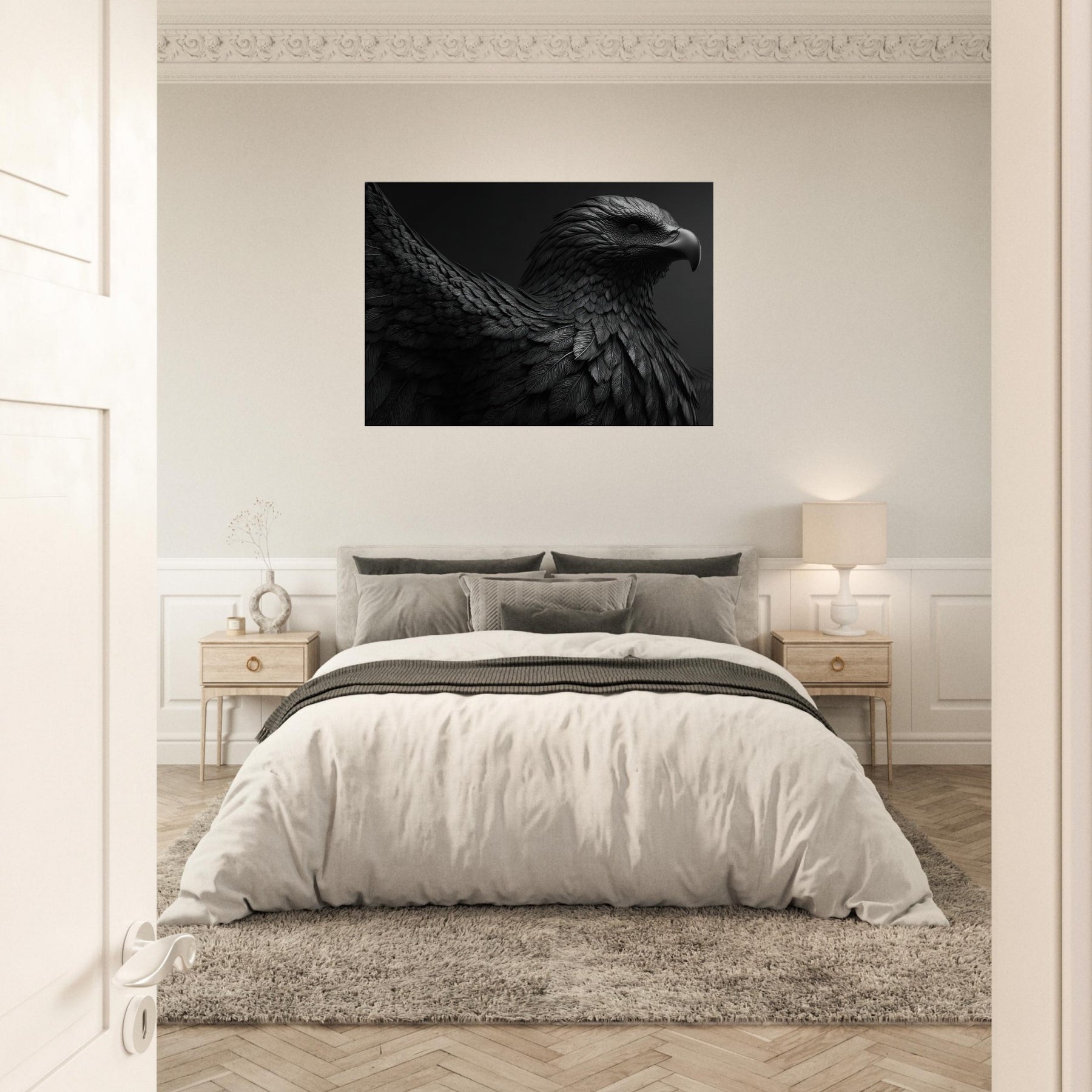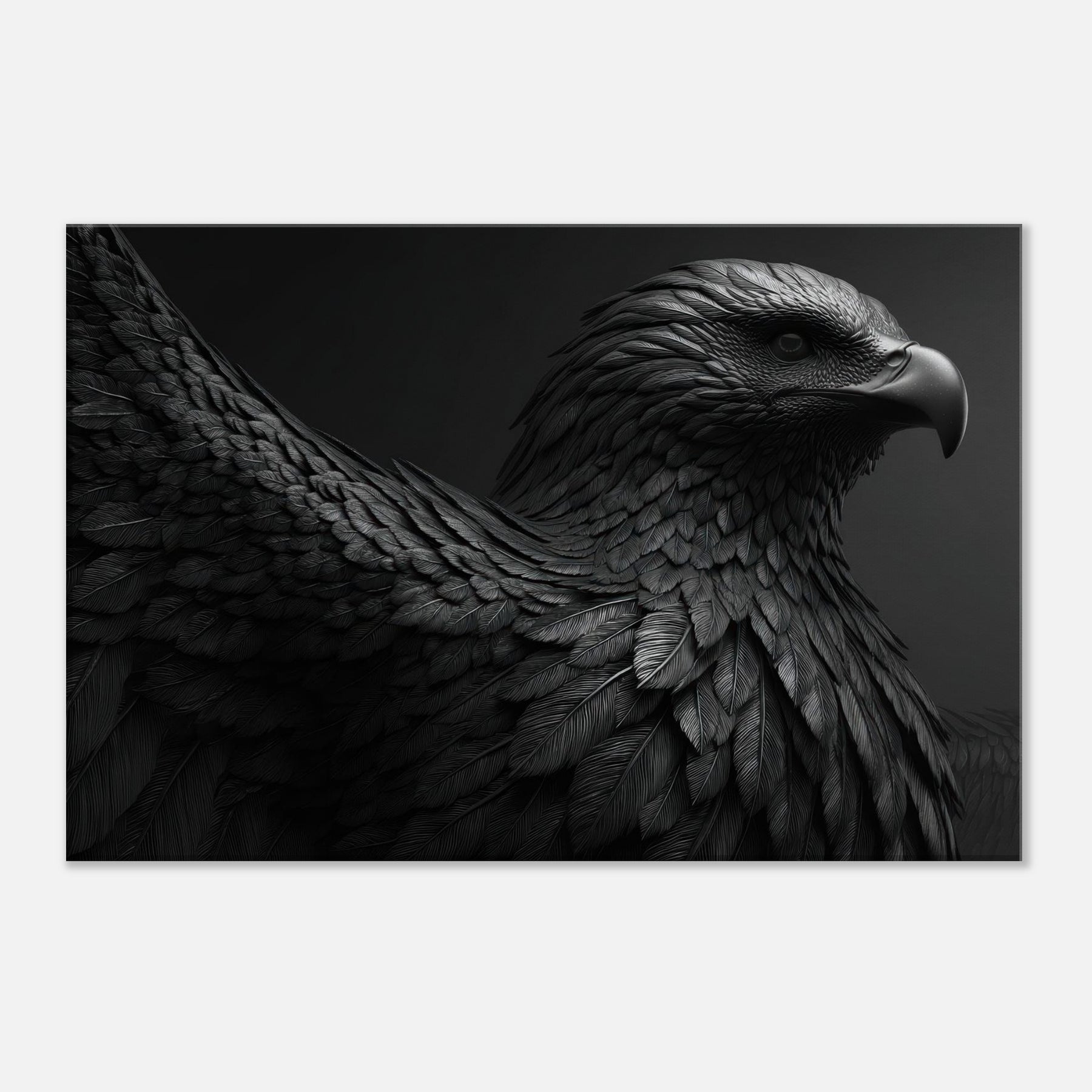 Enter a living room transformed by this sculpture in black and white. The sculpture like plumage unfolds in rich tonal gradients, each feather carved with quiet heat and movement.