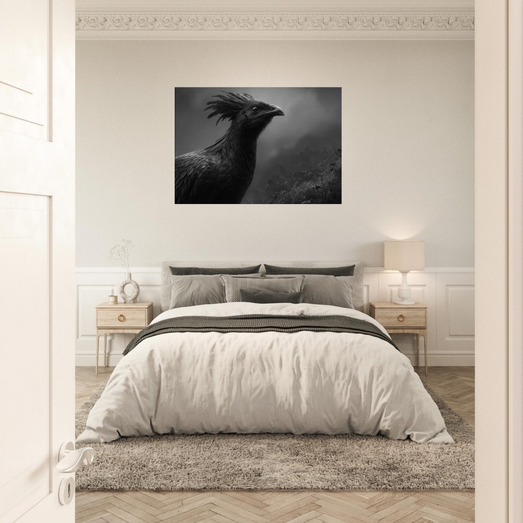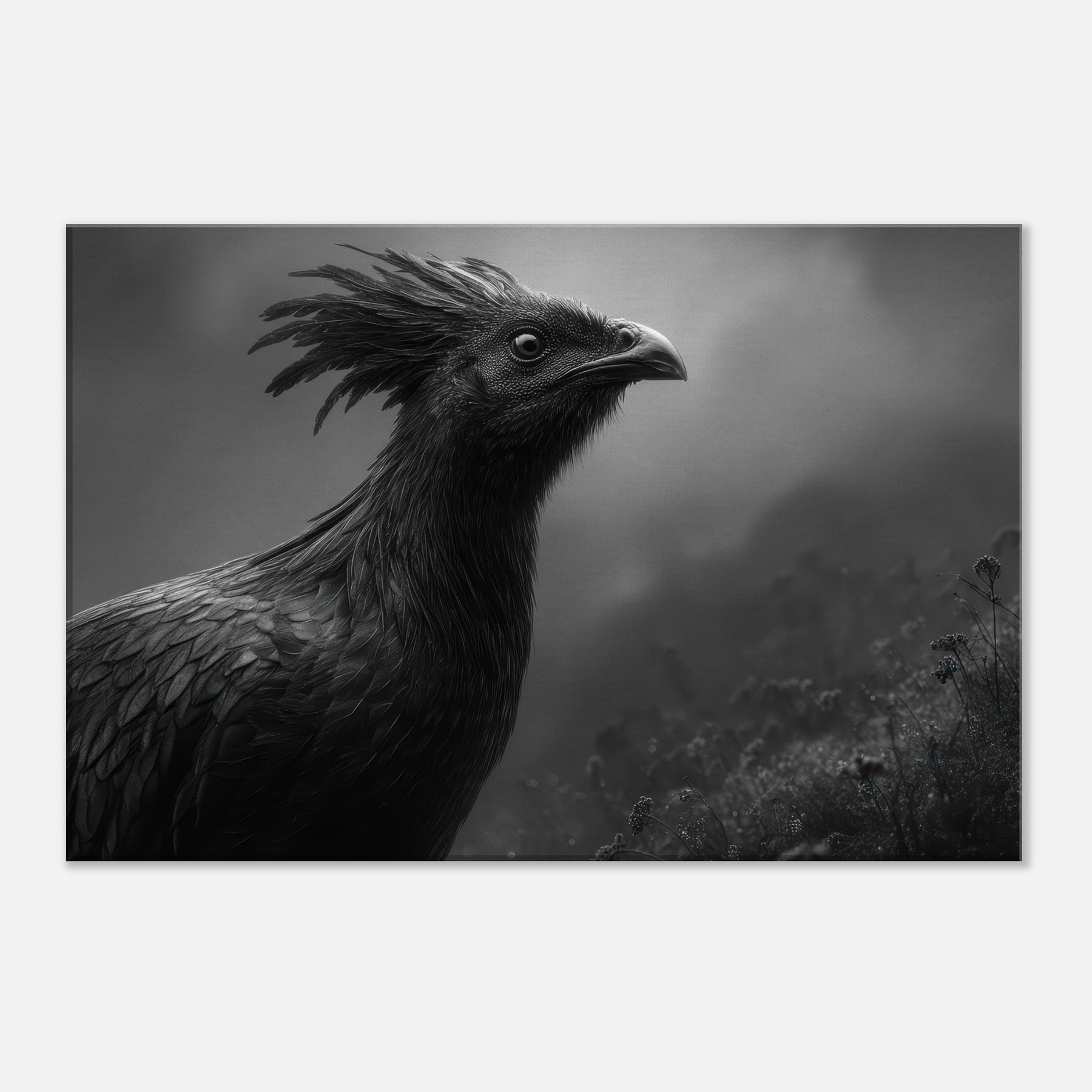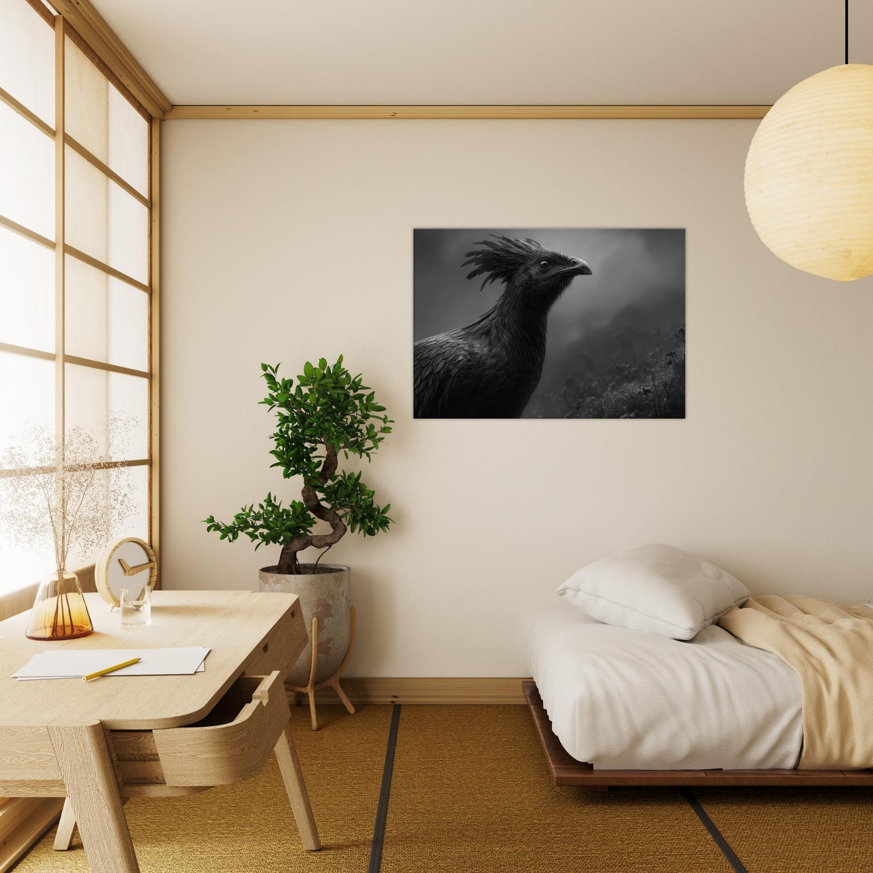 Vermilion Bird of the South reborn from sacred fire emerges in tempered, nocturnal contrast black and white as shadow and flame. This commanding piece folds myth into your living space, where its crested halo and feathered texture shimmer in low light, inviting quiet contemplation.
