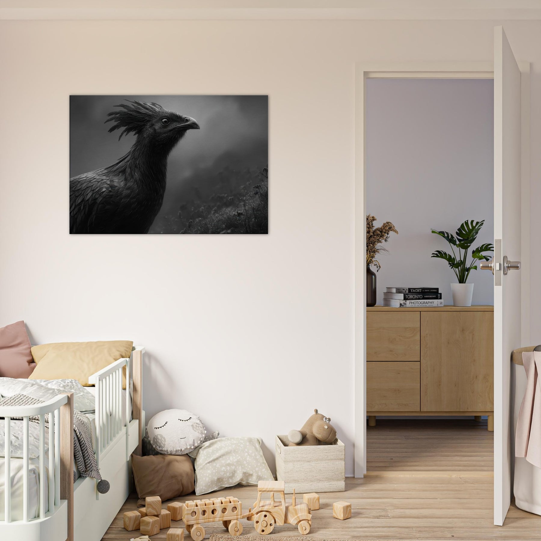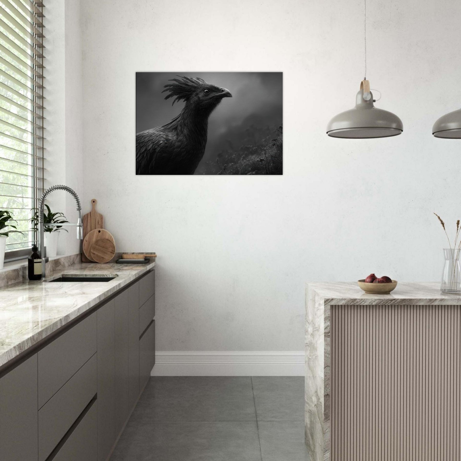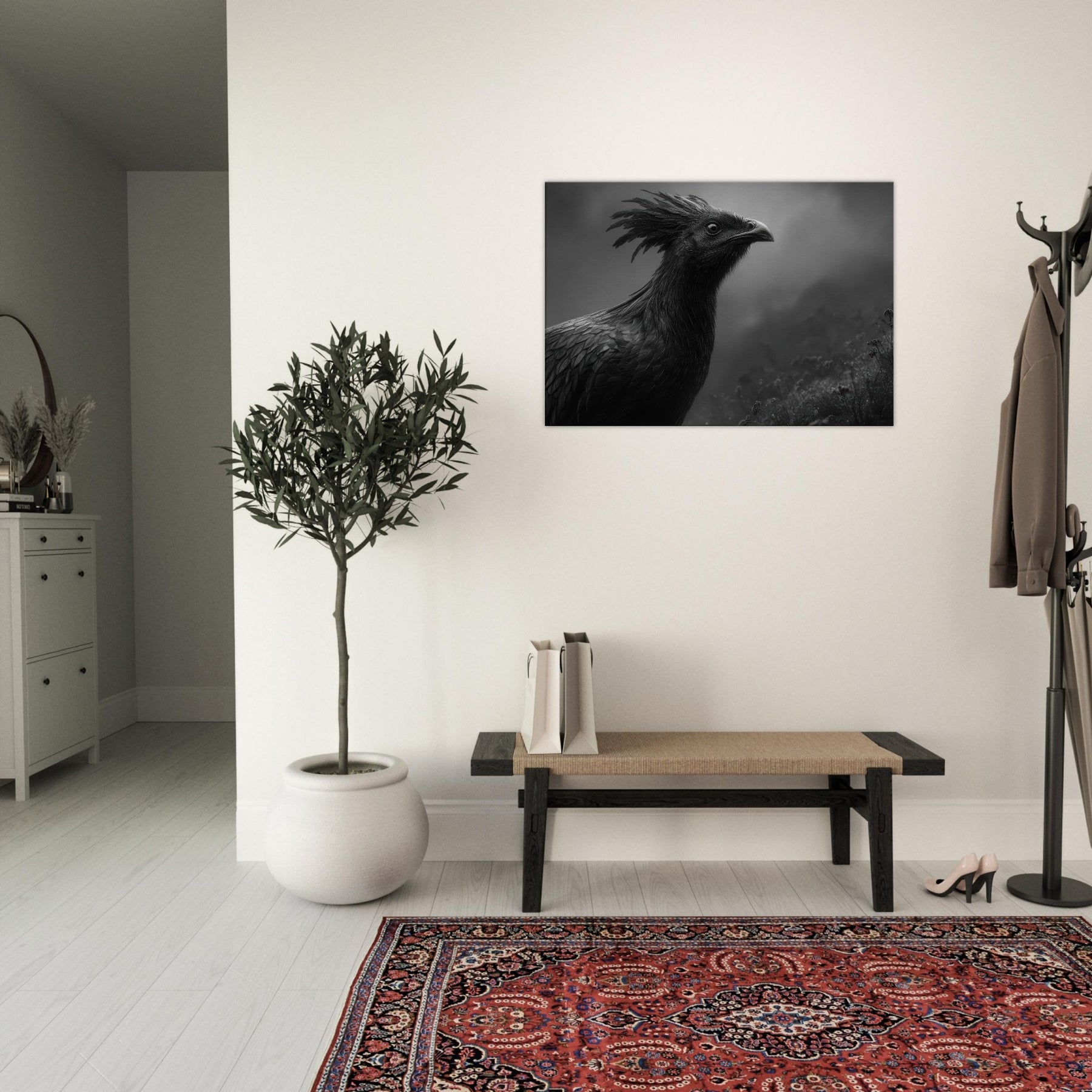 Vermilion Bird of the South reborn from sacred fire emerges in tempered, nocturnal contrast black and white as shadow and flame. This commanding piece folds myth into your living space, where its crested halo and feathered texture shimmer in low light, inviting quiet contemplation.