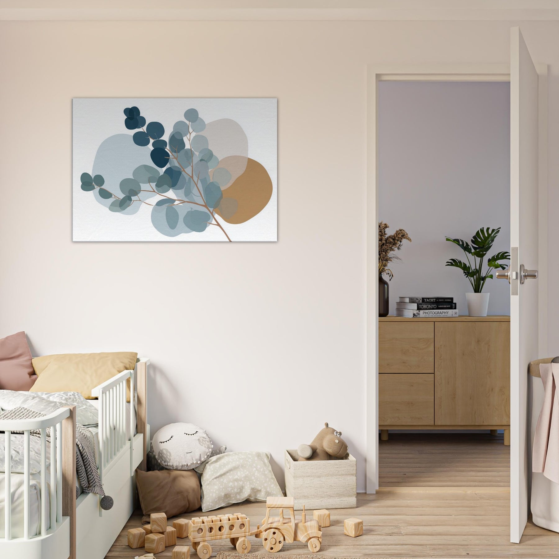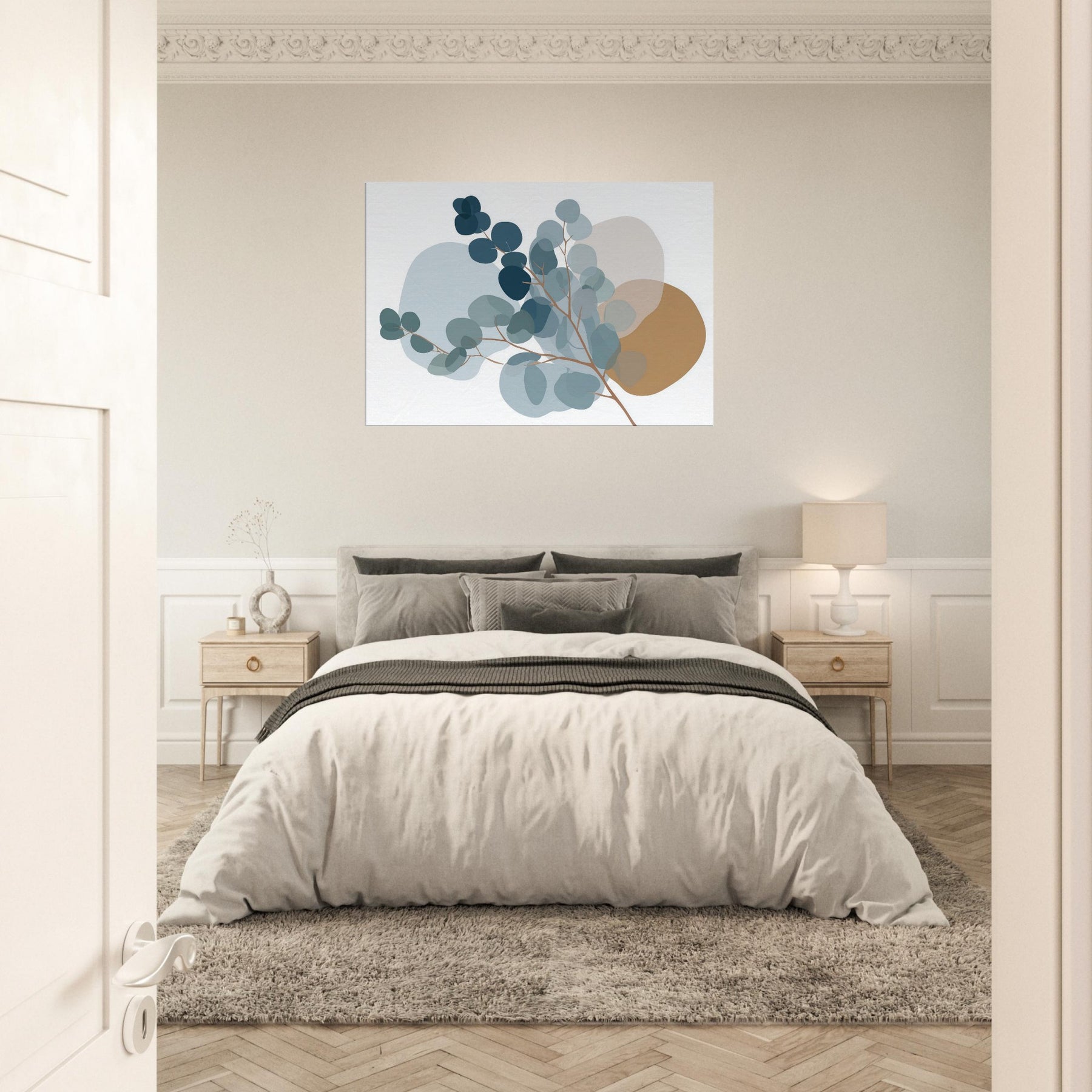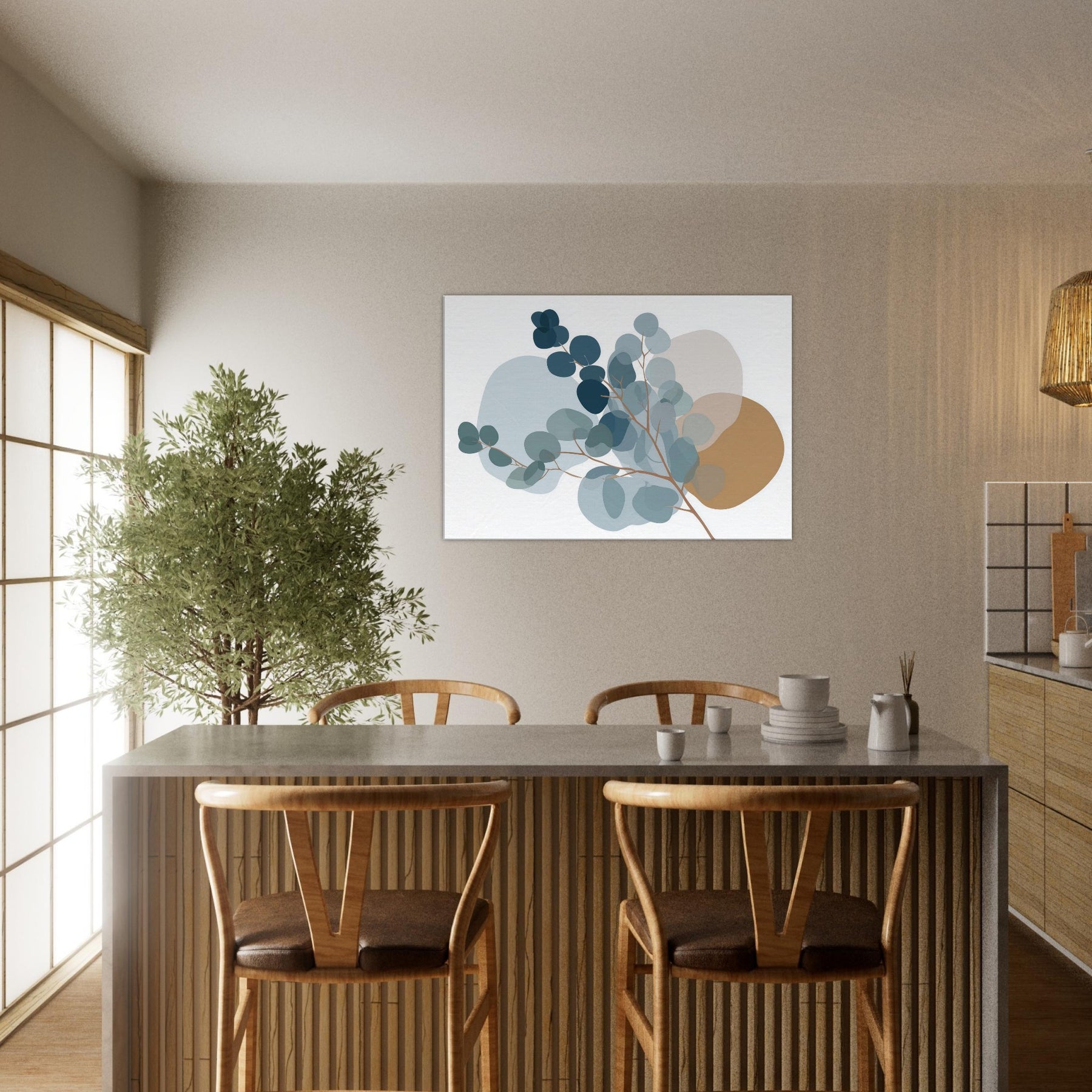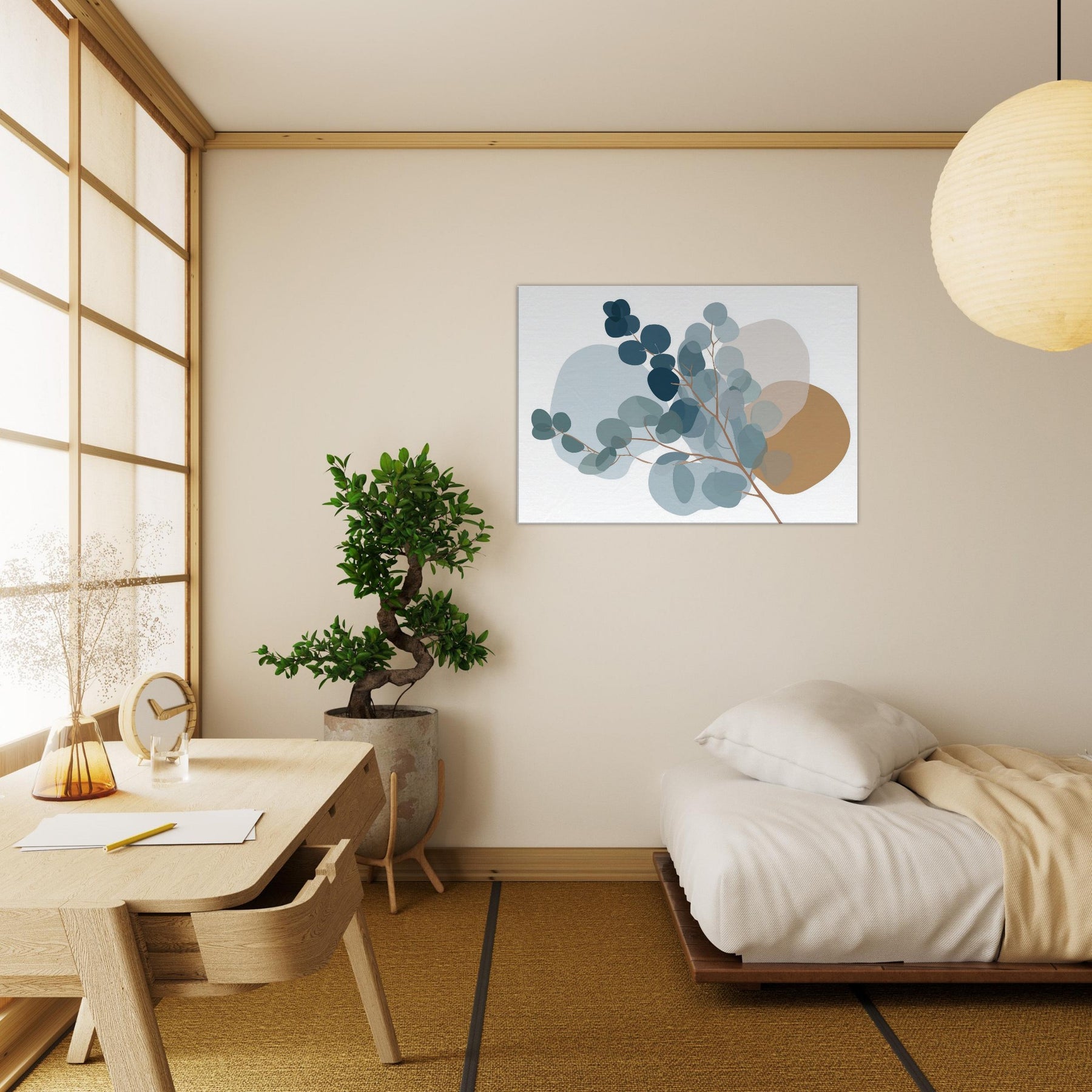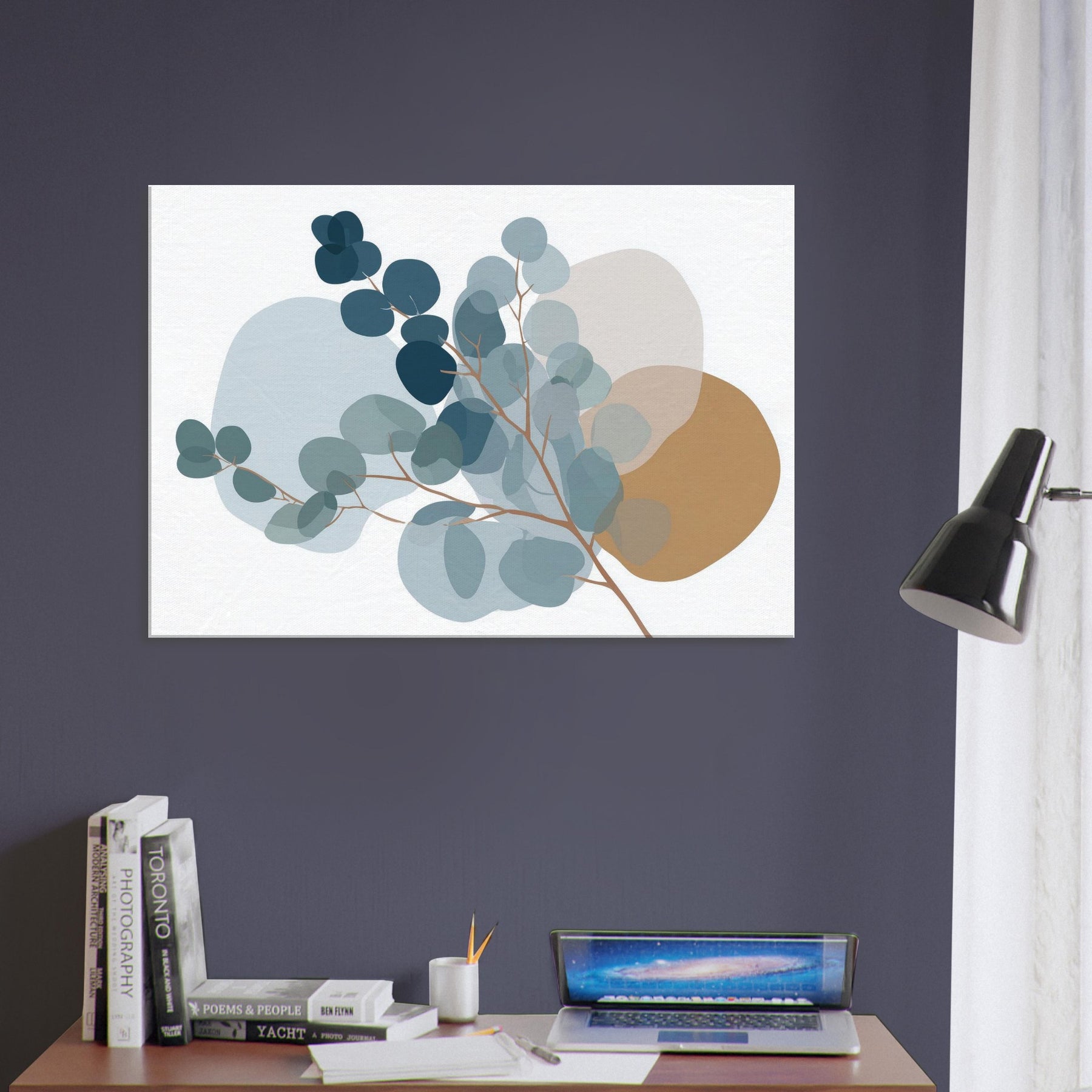 Step into a quiet garden of air and light. This minimalist Eucalyptus composition encases branches with fields of softly overlapping leaves in cool blues, greens, and a touch of warm ochre, like a shoreline at dusk. The palette evokes calm, openness, and a gentle breeze that travels from wall to room, turning an ordinary surface into a tranquil corner. Perfect above a sofa or desk, it invites slow breaths, clean lines, and nature's quiet presence into living spaces.