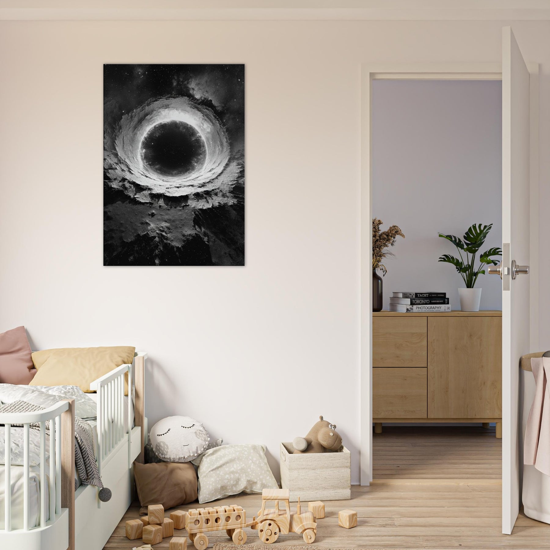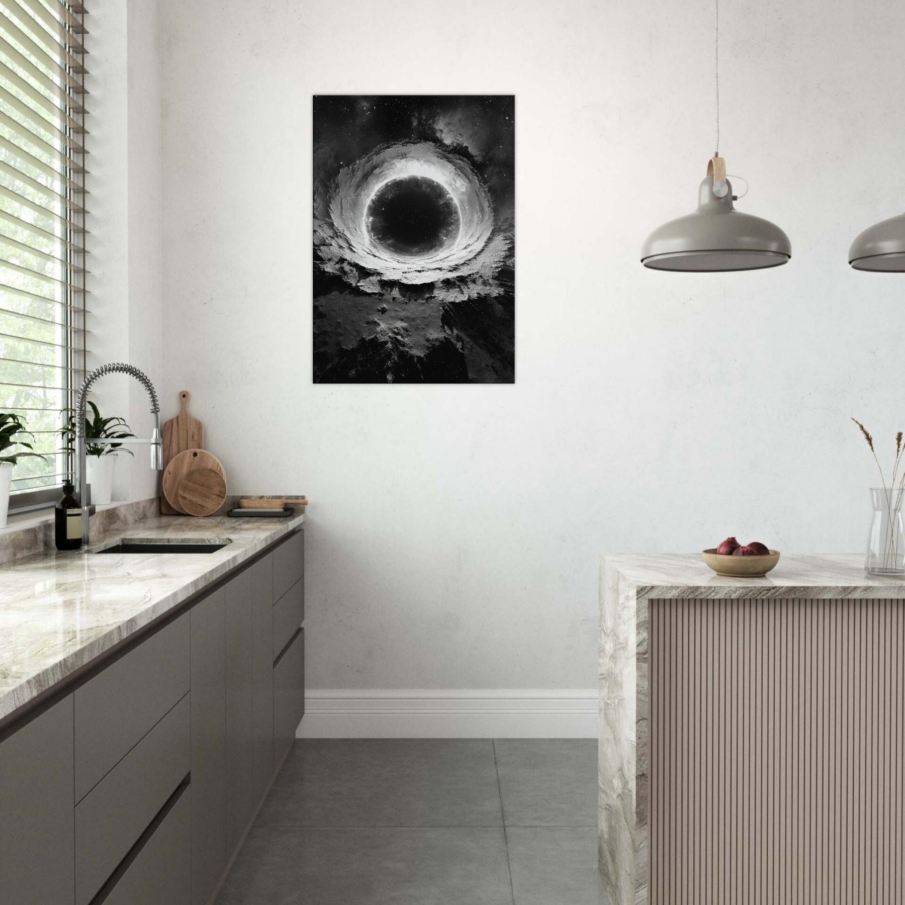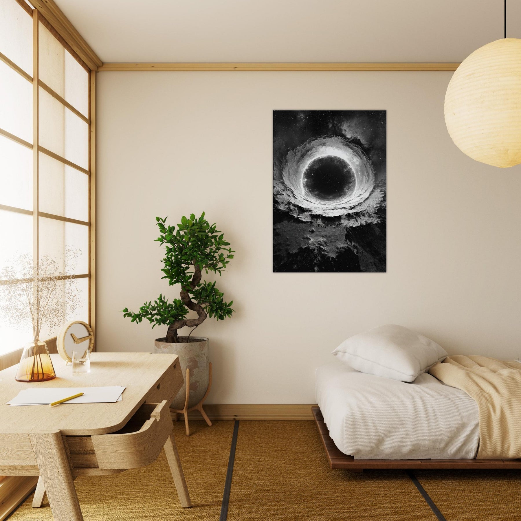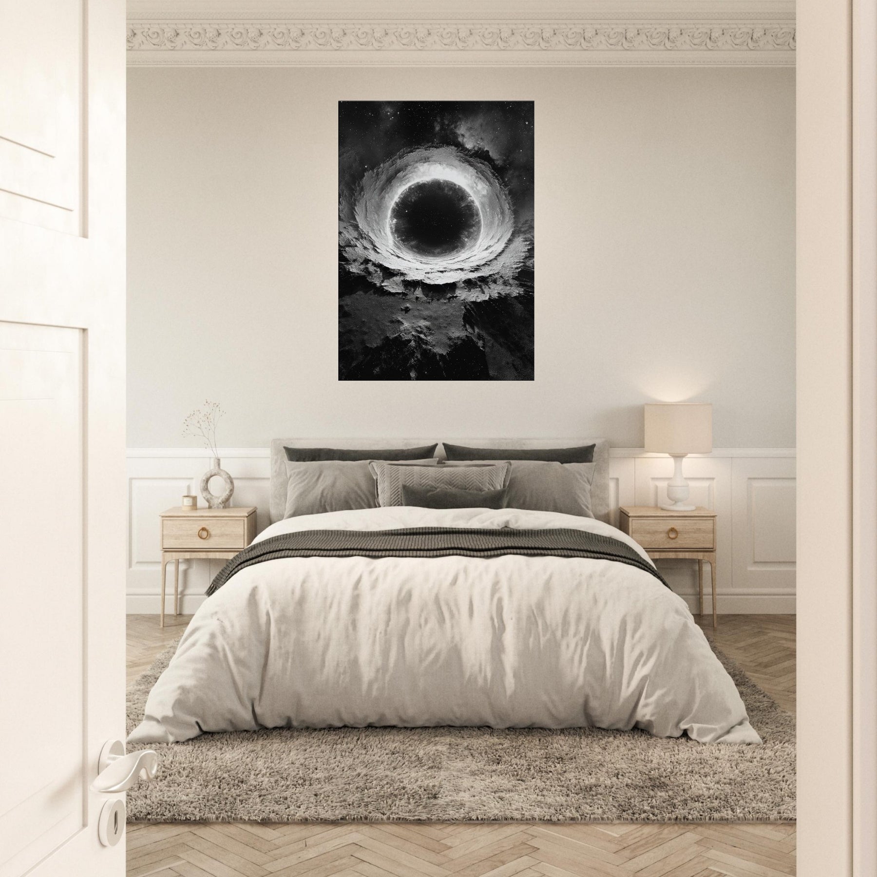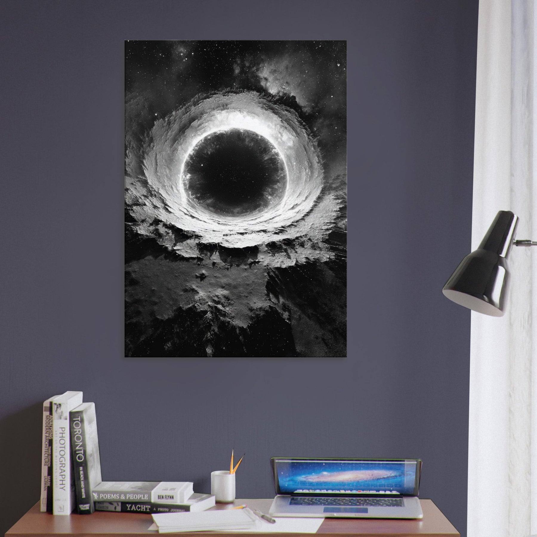 This mystical print invites contemplation, turning a living room into a sanctuary of mood dramatic, serene, and otherworldly. Hang it where morning sun barely touches it, and let the room breathe with orbiting quiet and celestial depth.