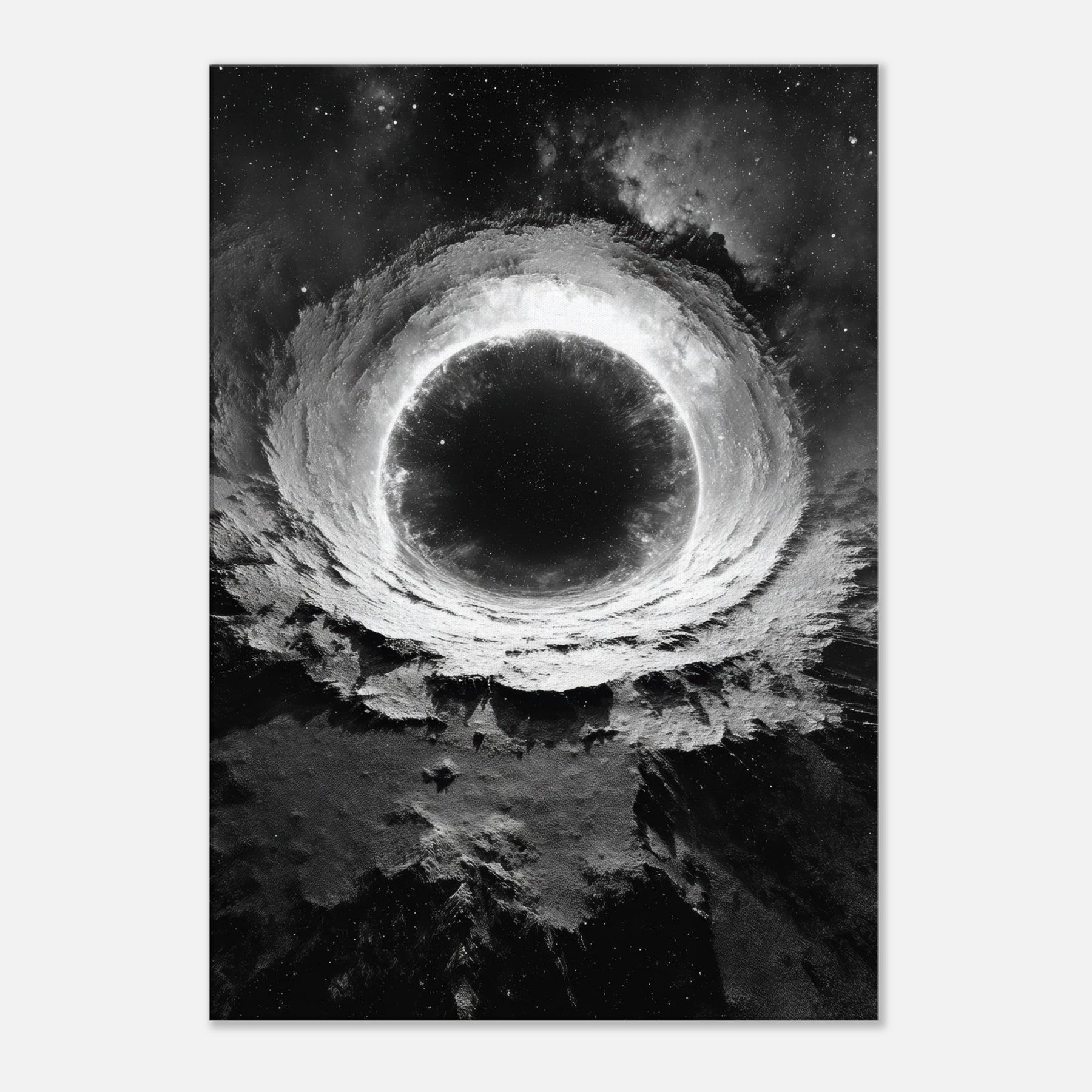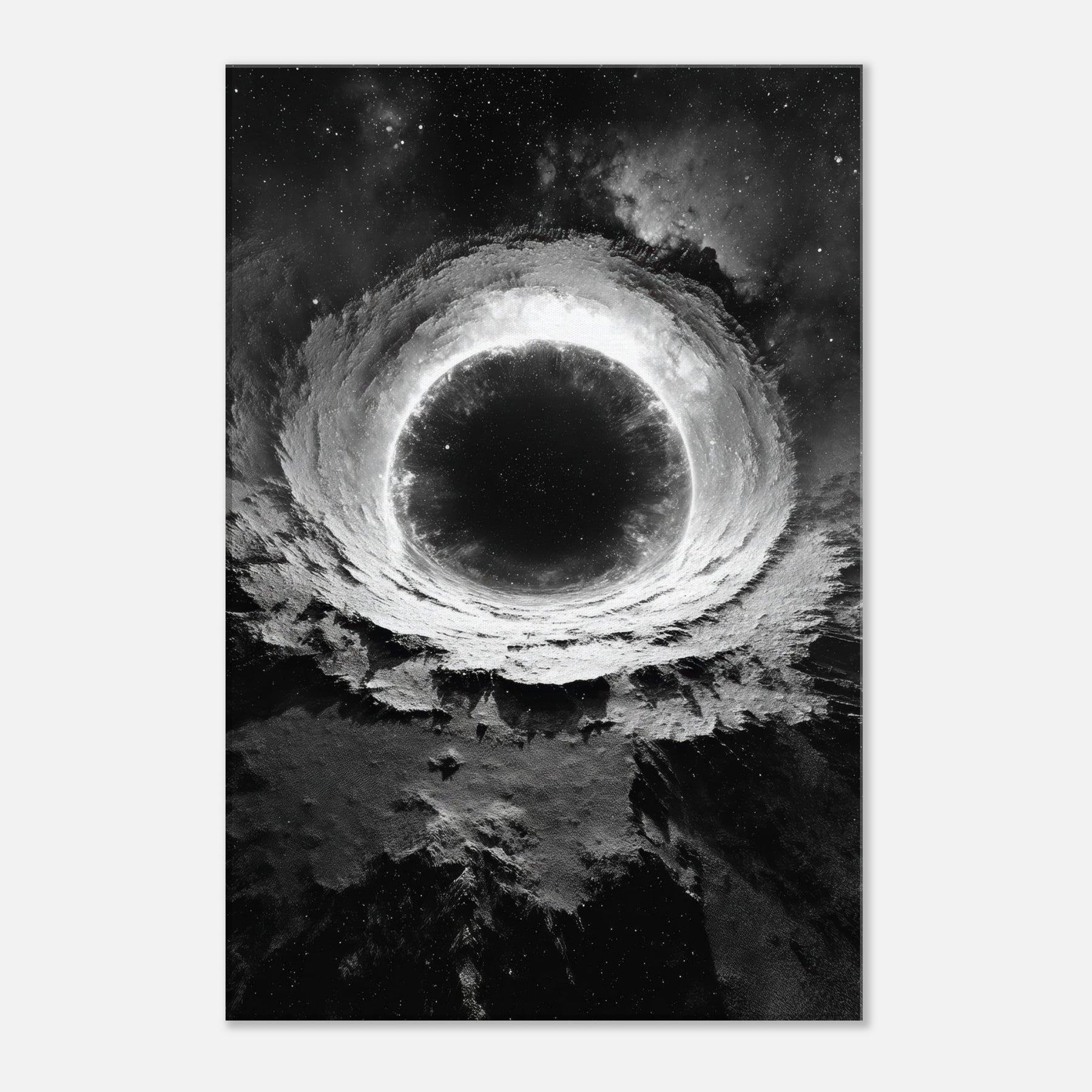 Step into a silent cosmos where a luminous ring of light folds the night into a doorway. The Galaxy centers a velvet void, edged by stellar frost and shadowed cliffs of terrain; the black and white contrast heightens every whisper of texture.