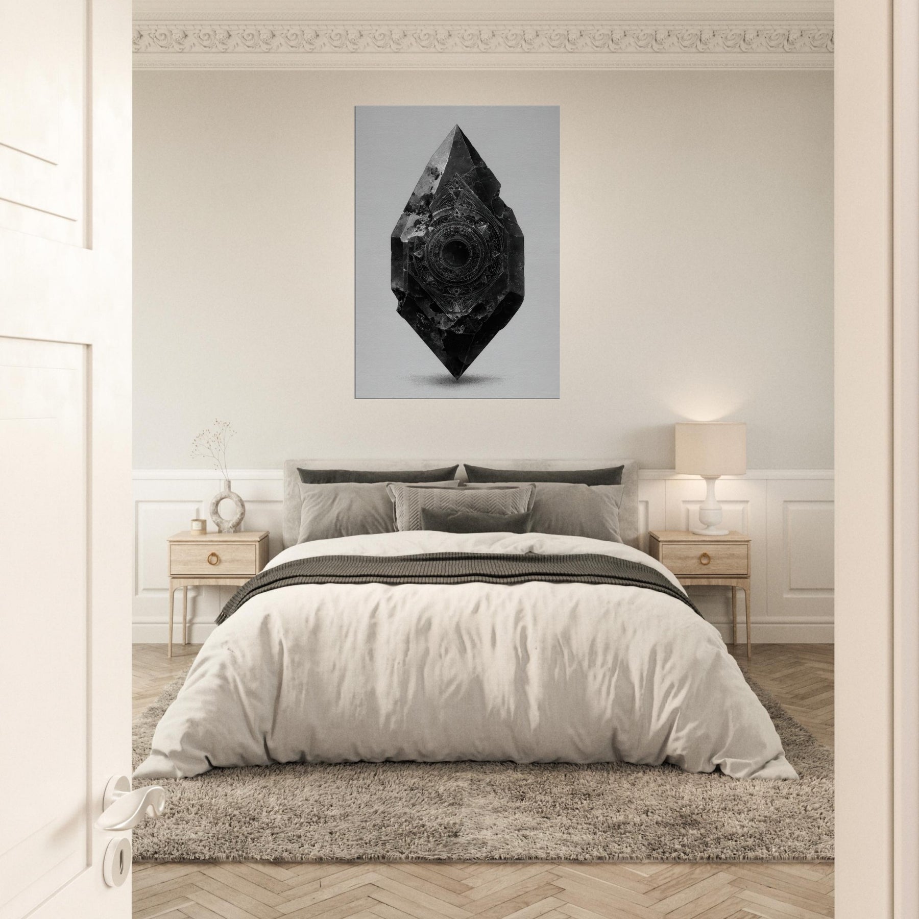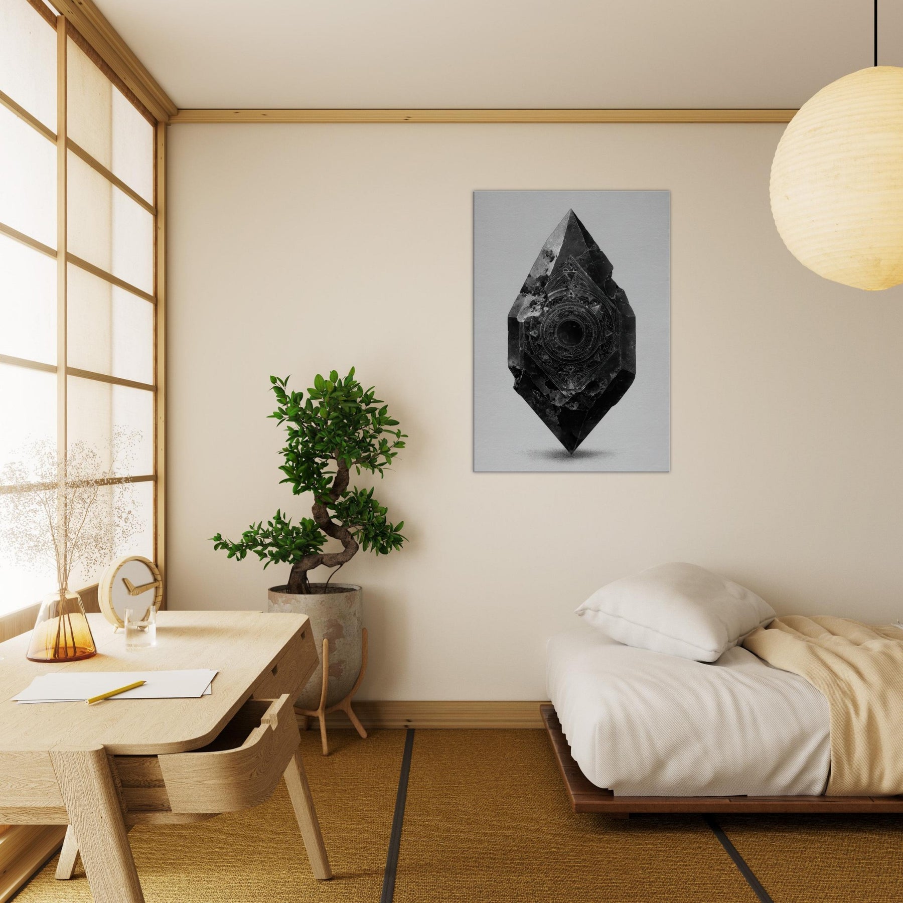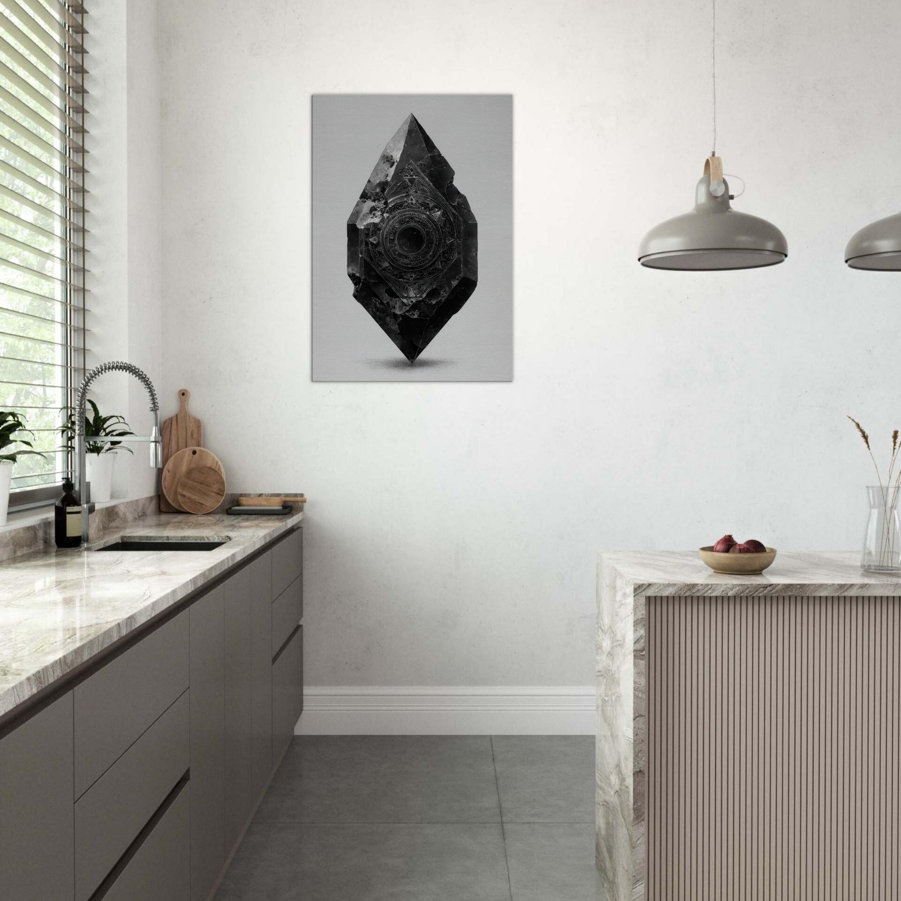 Let the Pendulum (Divination) emerge from black and white as a guiding stillness in the room. This enigmatic sculpture radiates a nocturnal glow the hush of a bell at midnight, the whisper of symbols turning in a quiet orbit. Its beveled facets catch light, casting delicate, shifting shadows across a pale wall. In living spaces, it becomes a focal breath, inviting reflection, ritual, and intention. A mystical presence for living rooms or studios, it steadies mood and elevates contemplation.