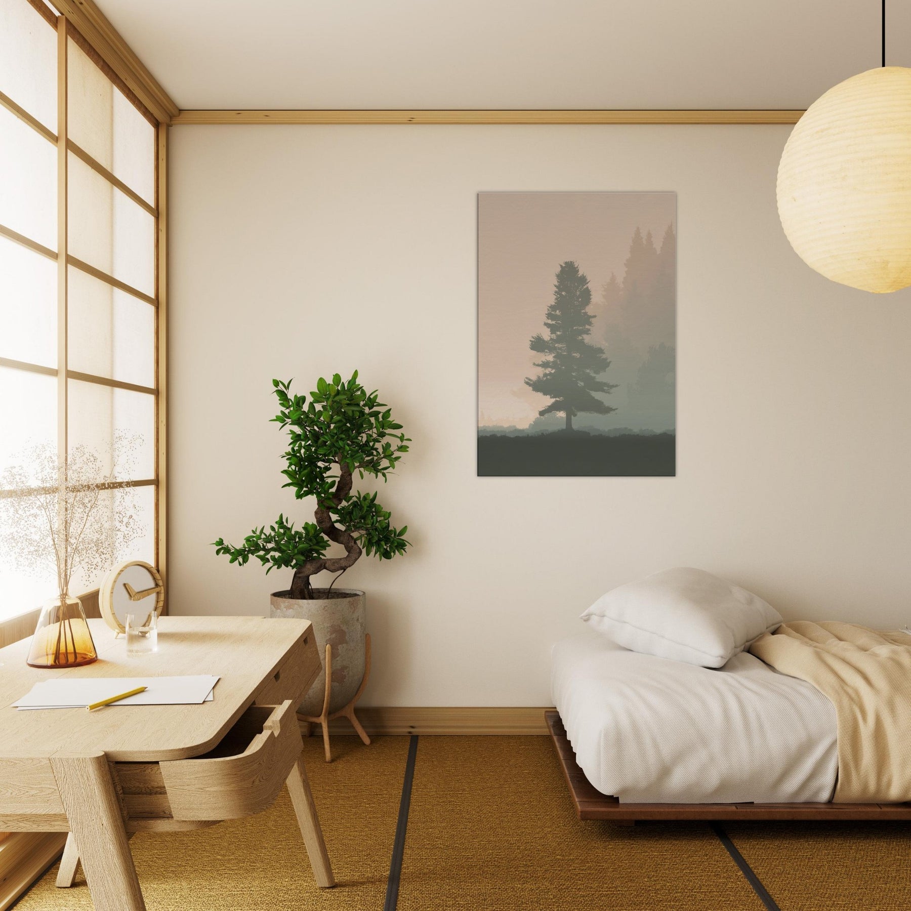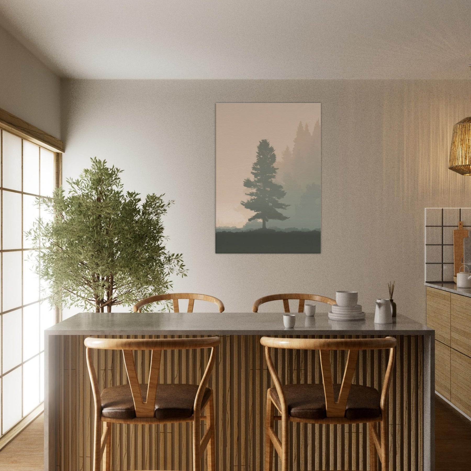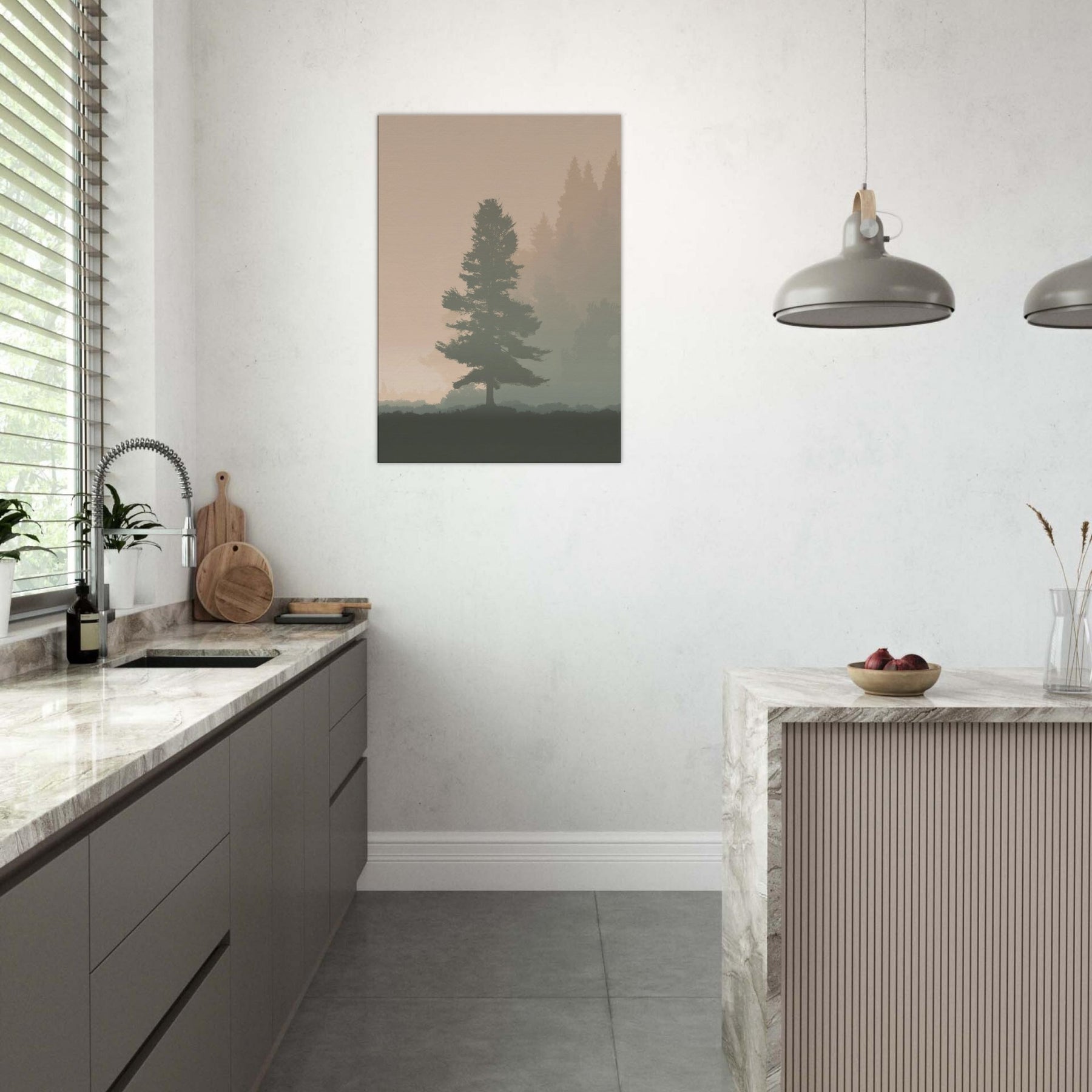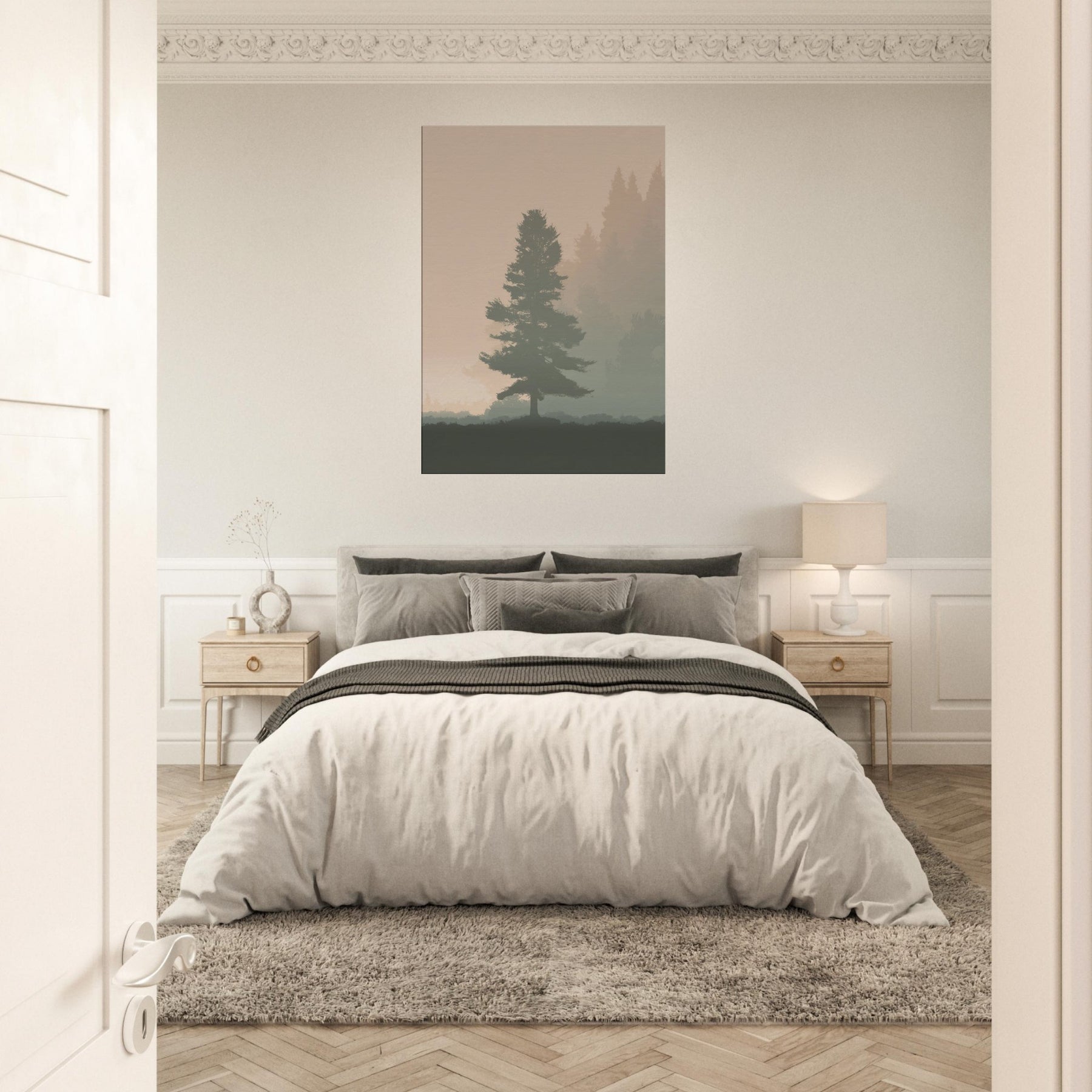 A quiet, breath like presence fills the room with this Foggy Forest minimalist print. Mists soften the horizon, where pine silhouettes drift in muted tones, inviting contemplation rather than clutter. The artwork whispers of morning walks and still air, turning your living space into a sanctuary of focus and ease. Its restrained palette and gentle gradients make walls feel lighter, while the scene grounds a sofa or desk with a natural, eternal hush. Perfect for a serene, modern home.
