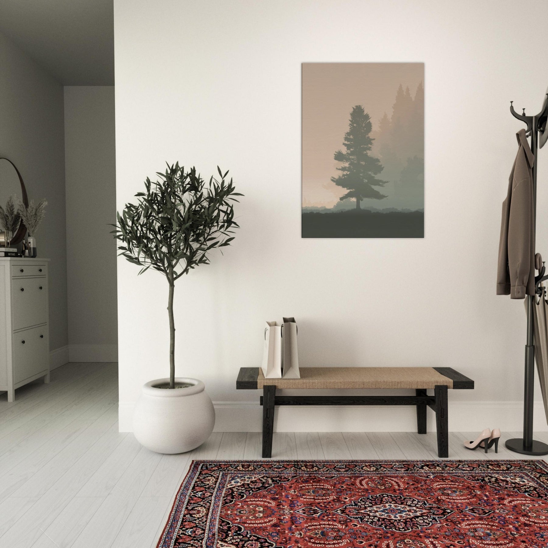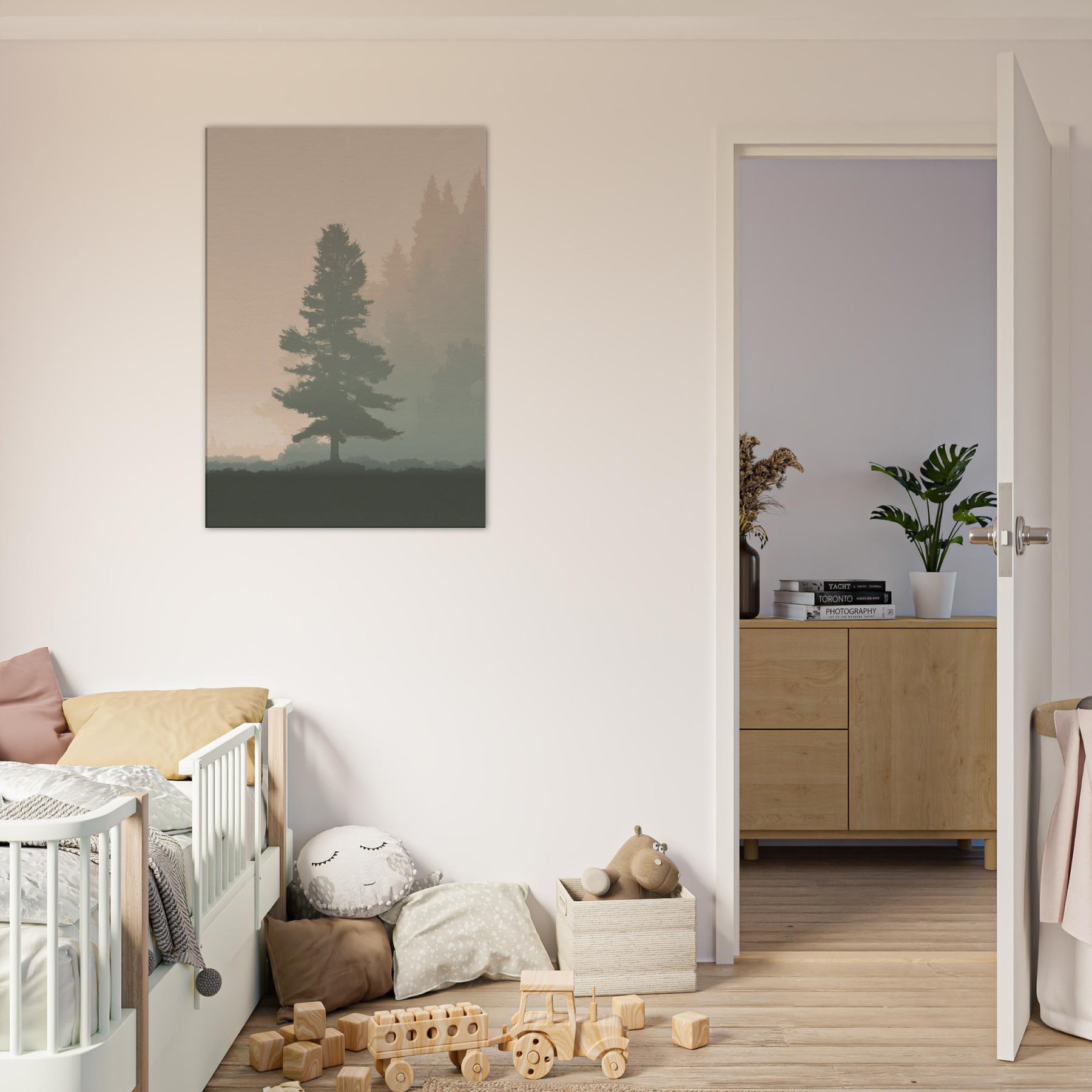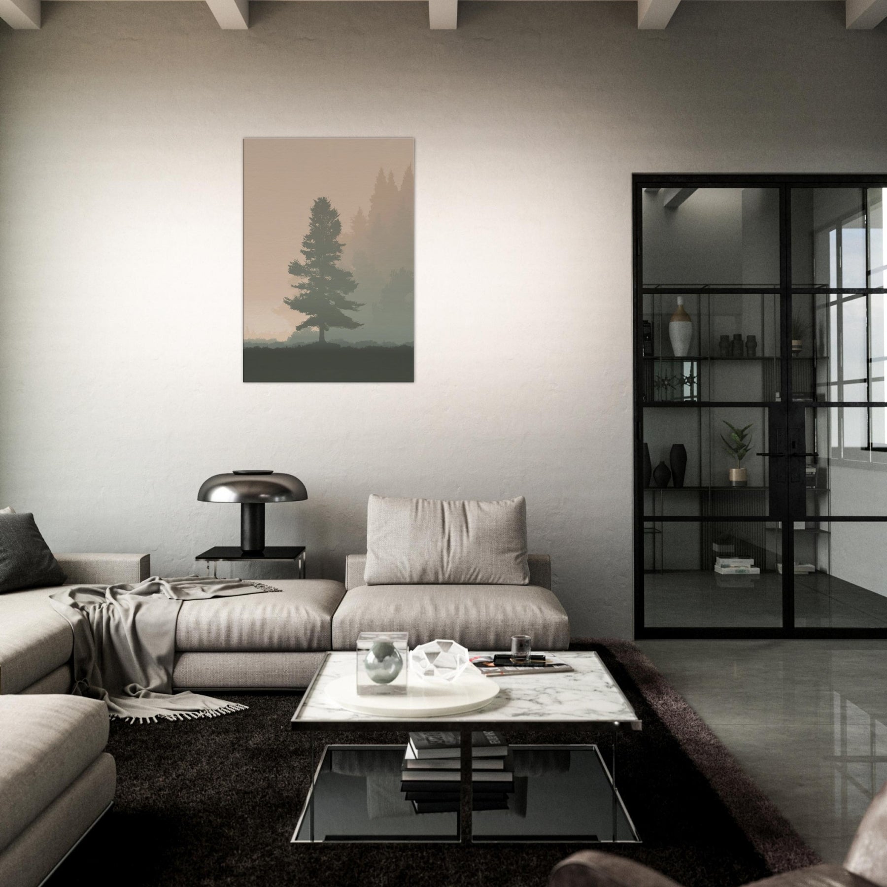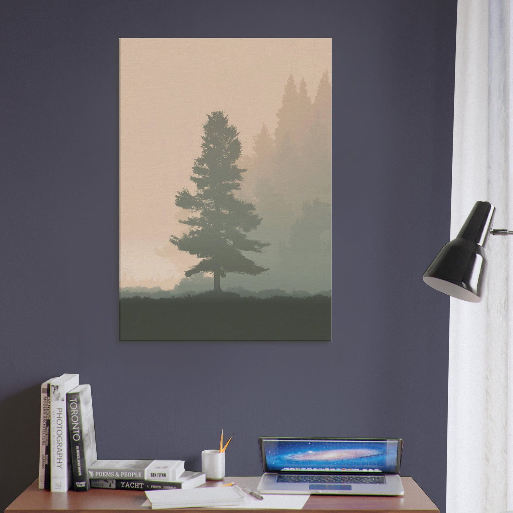 A quiet, breath like presence fills the room with this Foggy Forest minimalist print. Mists soften the horizon, where pine silhouettes drift in muted tones, inviting contemplation rather than clutter. The artwork whispers of morning walks and still air, turning your living space into a sanctuary of focus and ease. Its restrained palette and gentle gradients make walls feel lighter, while the scene grounds a sofa or desk with a natural, eternal hush. Perfect for a serene, modern home.