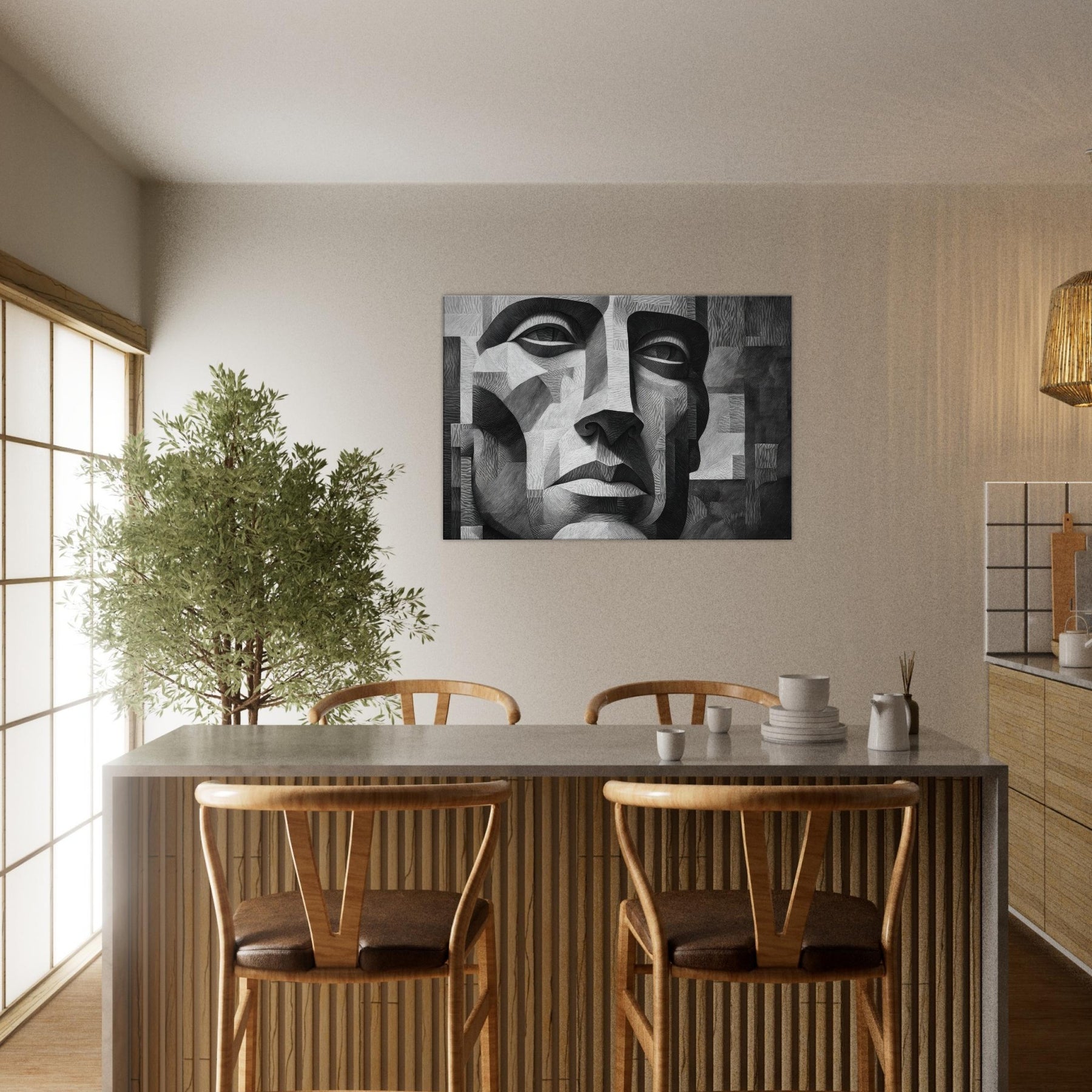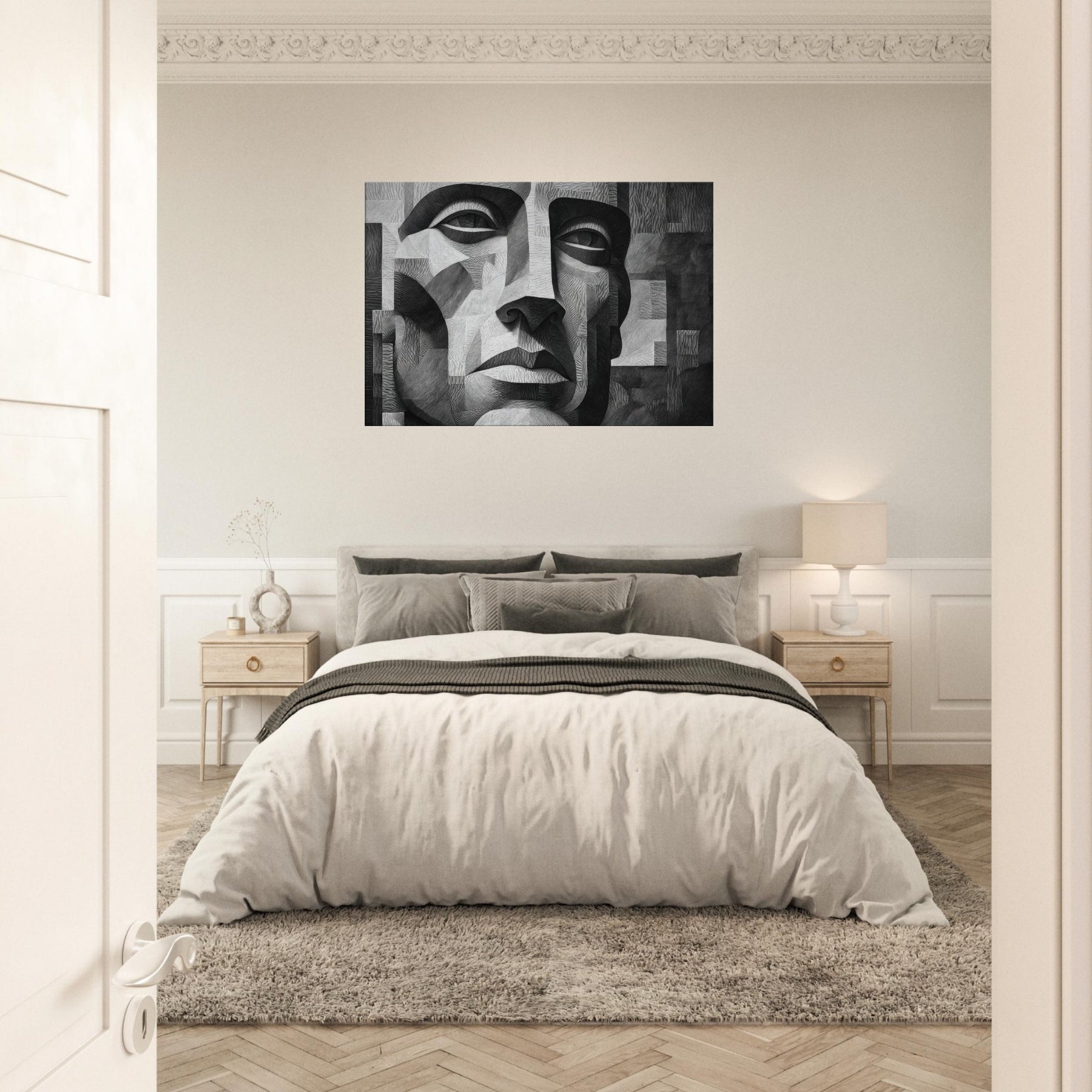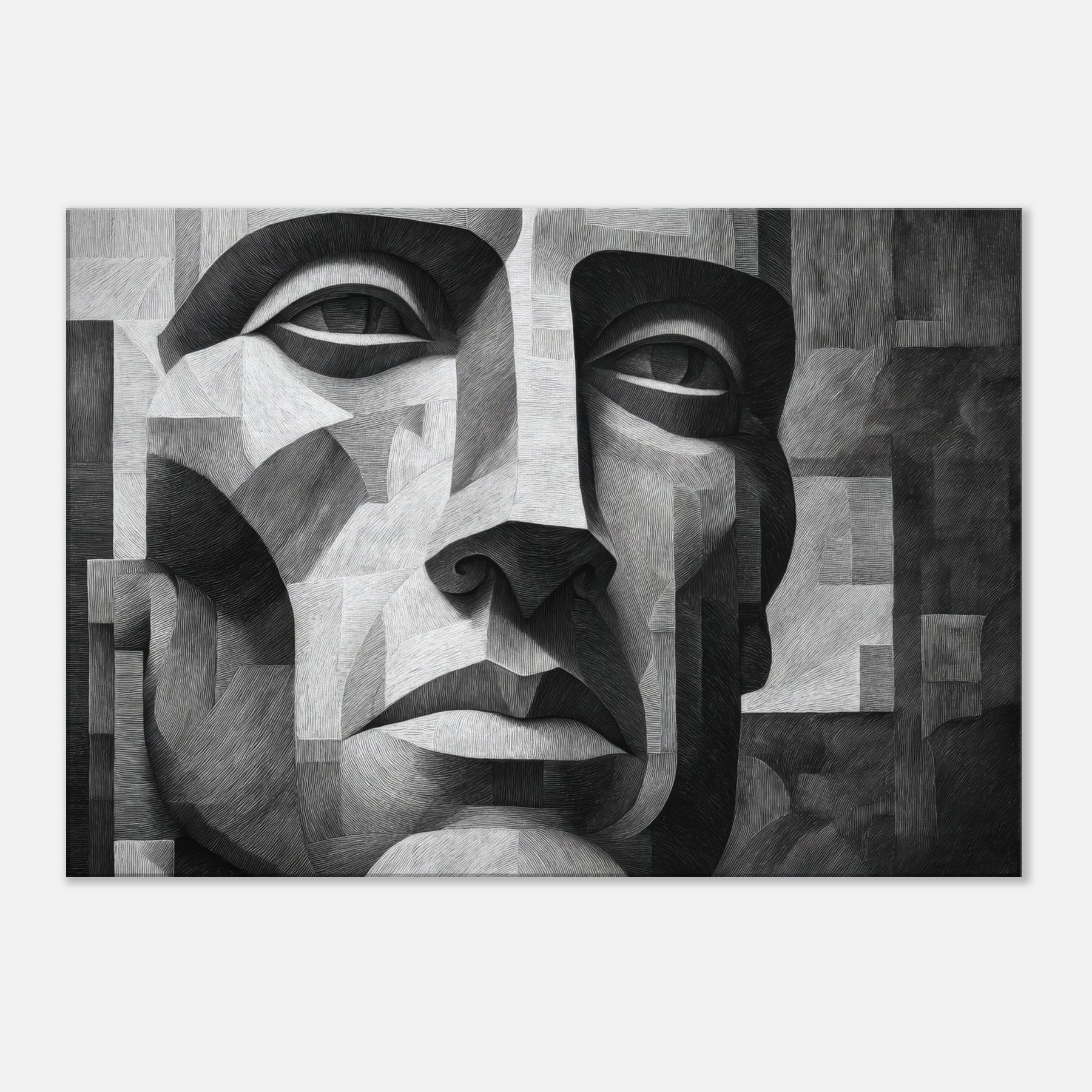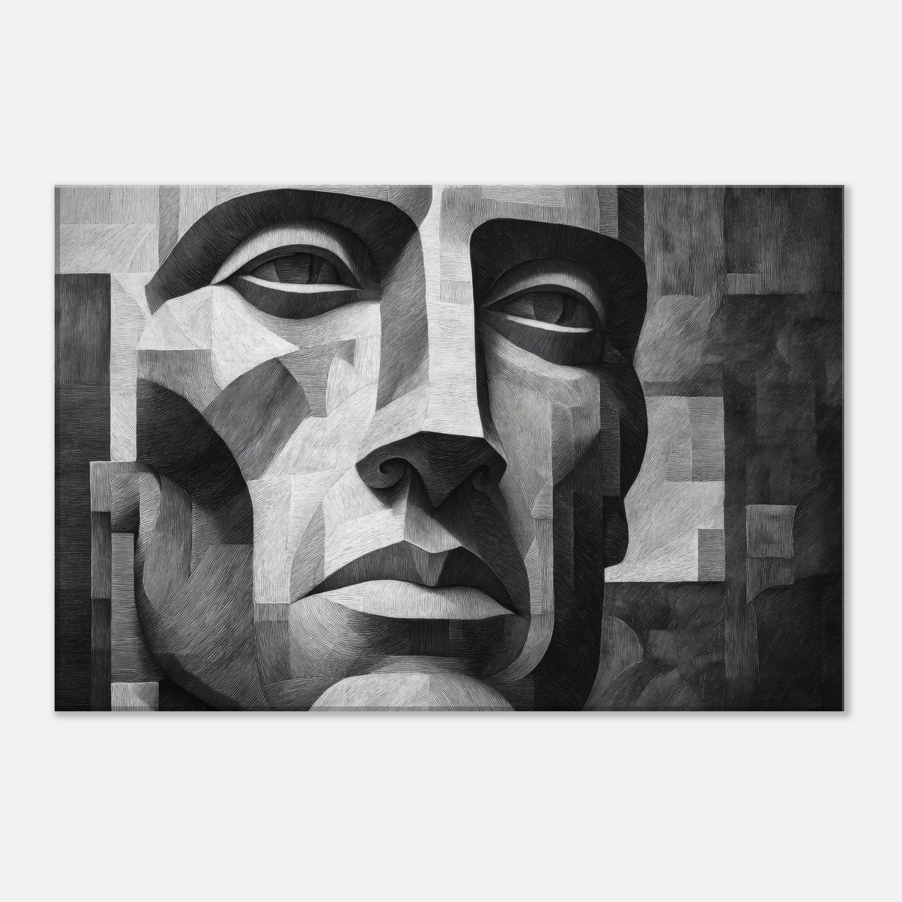 Shaded planes and razor thin lines converge in a singular Cubist Face, rendered in stark black and white. This sculpted mosaic of light and shadow invites the eye to travel across linen like textures, revealing new expressions with every turn.