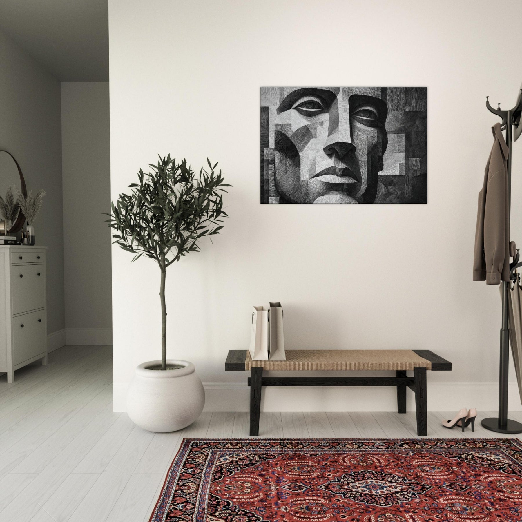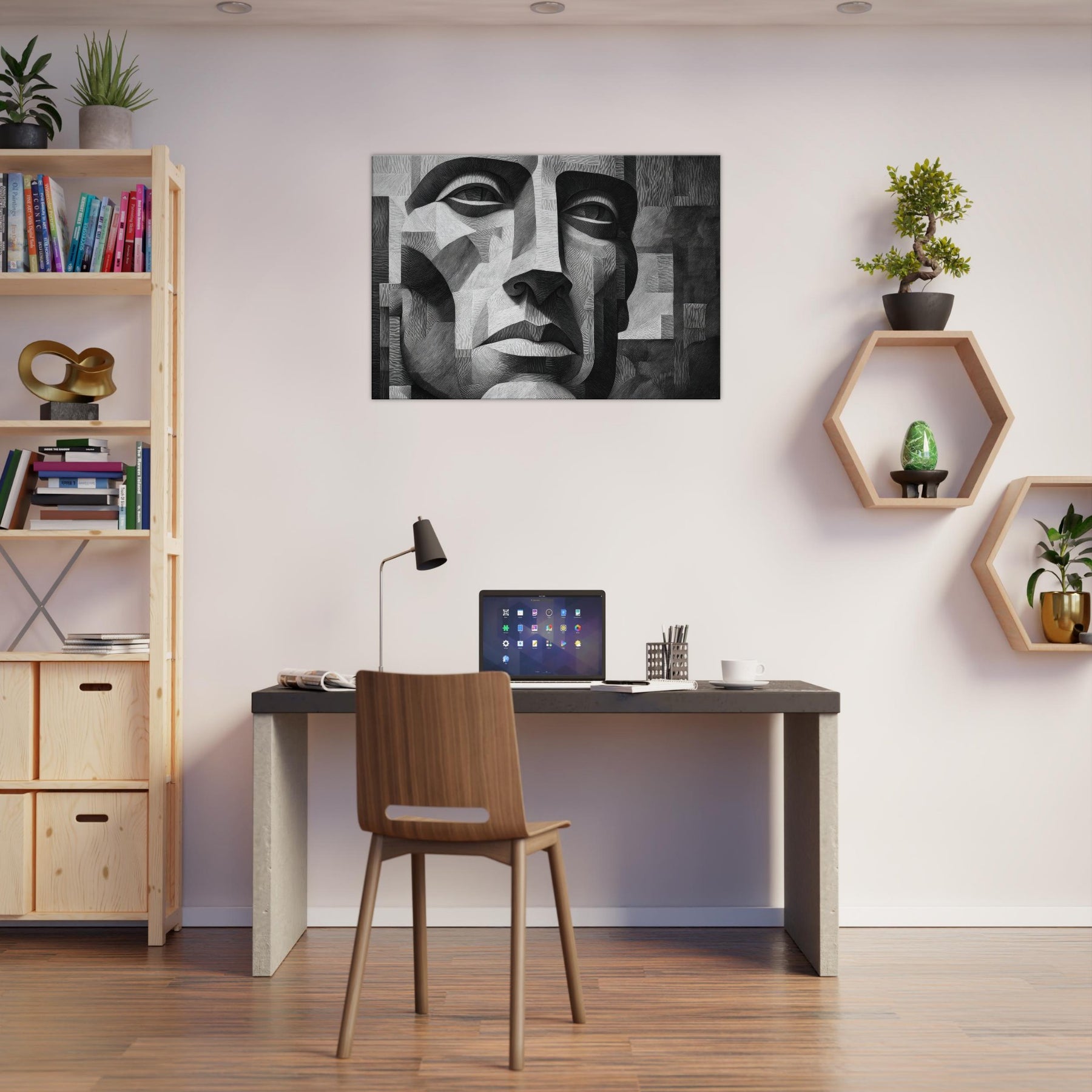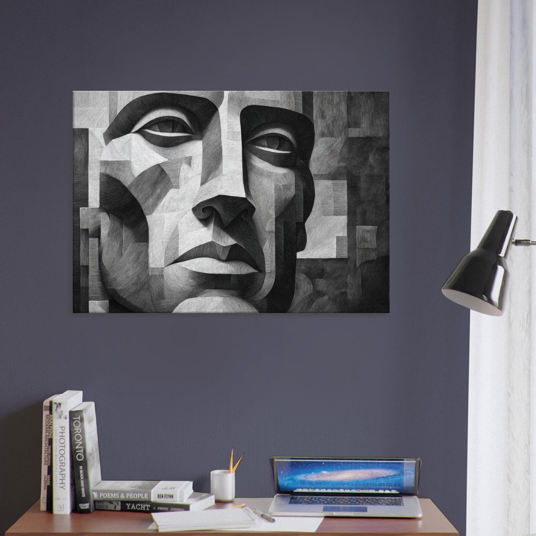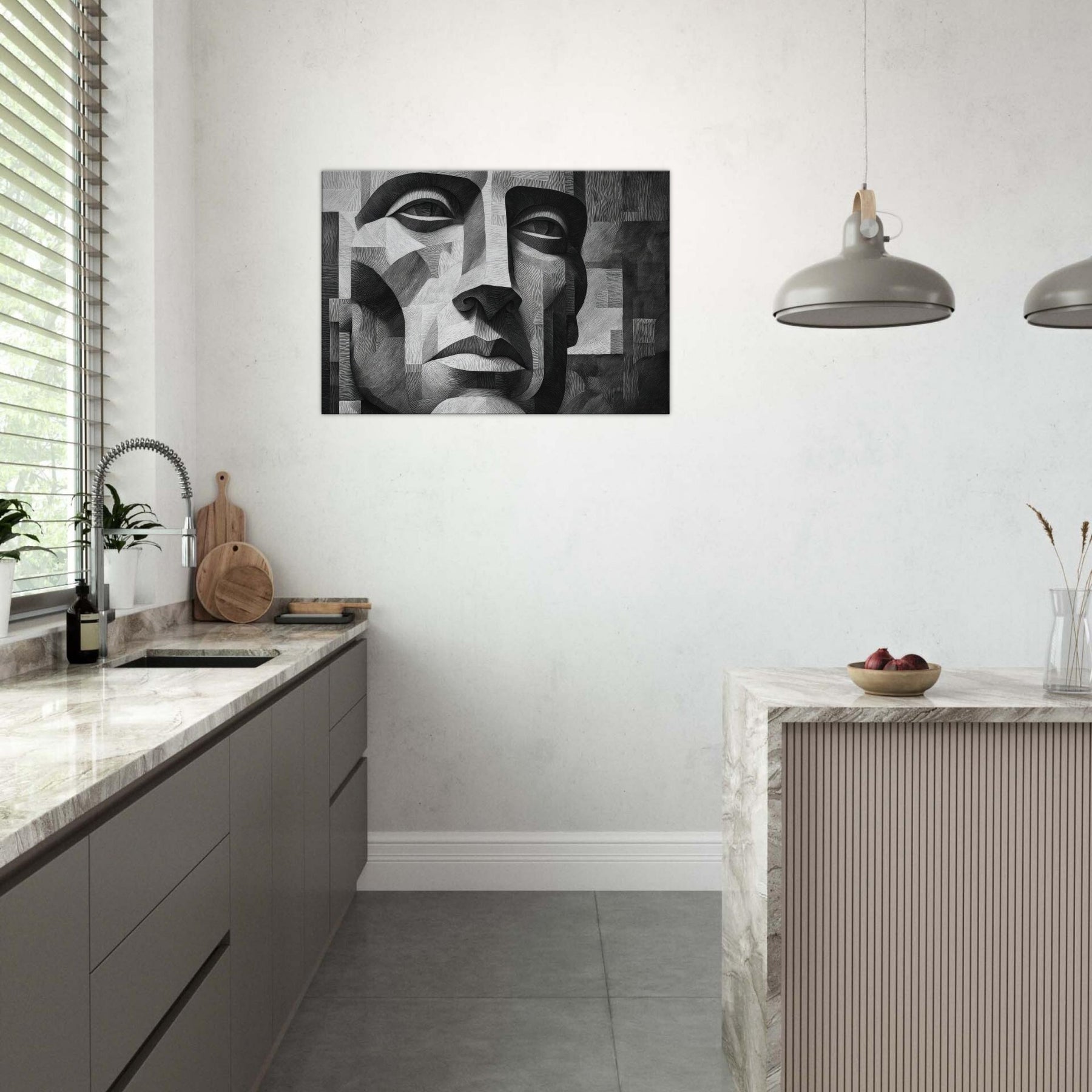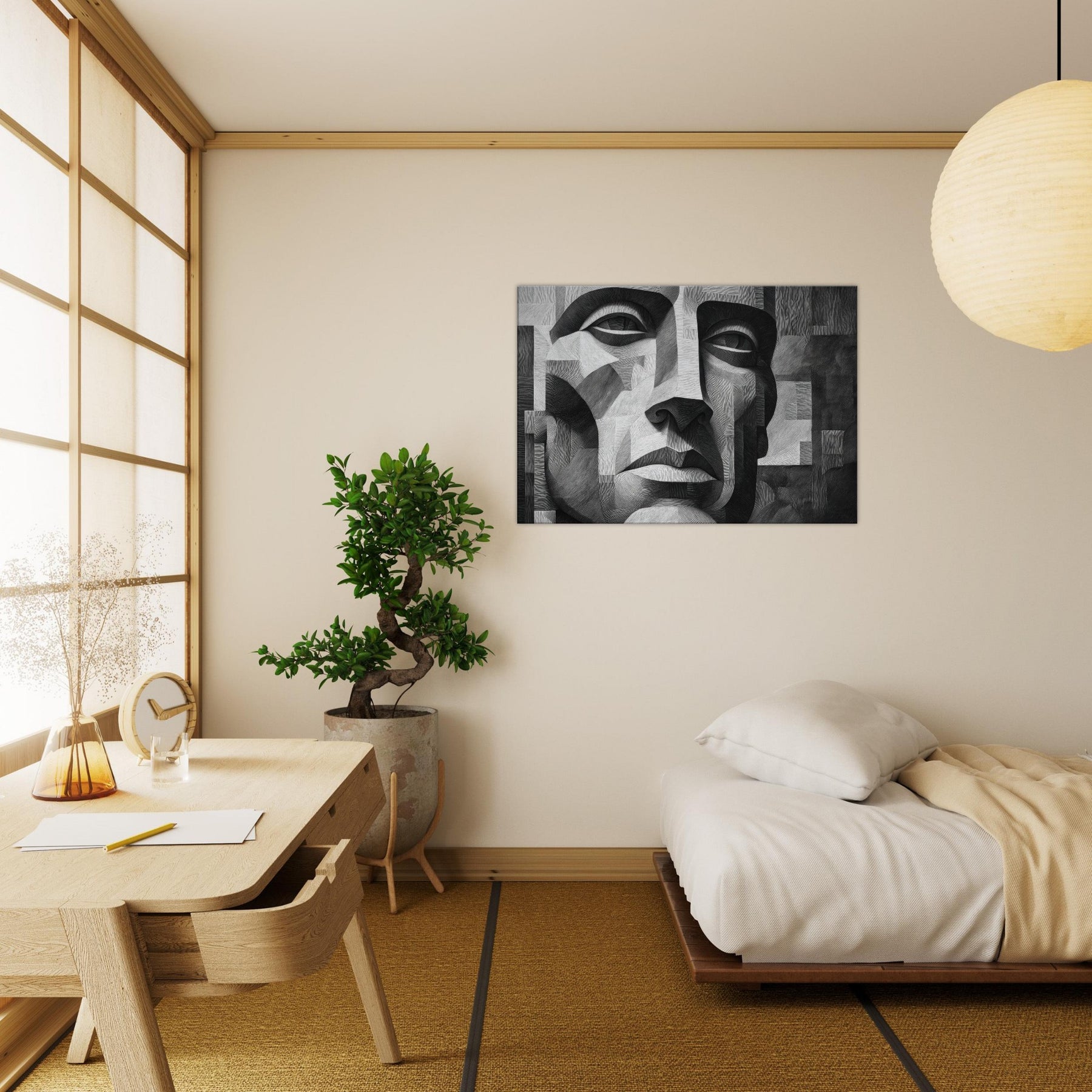 Shaded planes and razor thin lines converge in a singular Cubist Face, rendered in stark black and white. This sculpted mosaic of light and shadow invites the eye to travel across linen like textures, revealing new expressions with every turn.