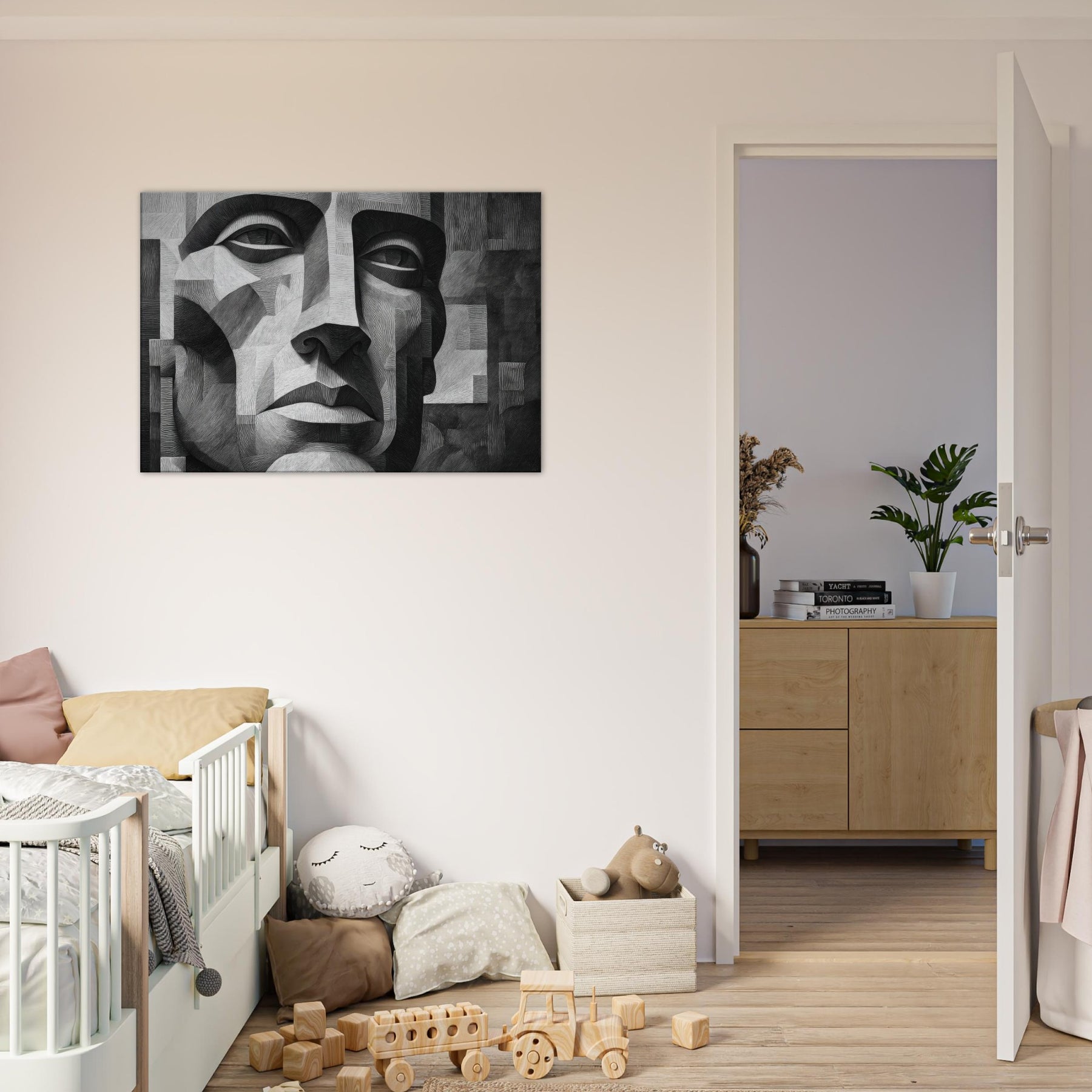 In a living room, it anchors a quiet conversation corner, amplifying a room's mood with contemplative stillness. The artwork hums with modern melancholy and clarity, turning flat walls into a stage for memory and thought.