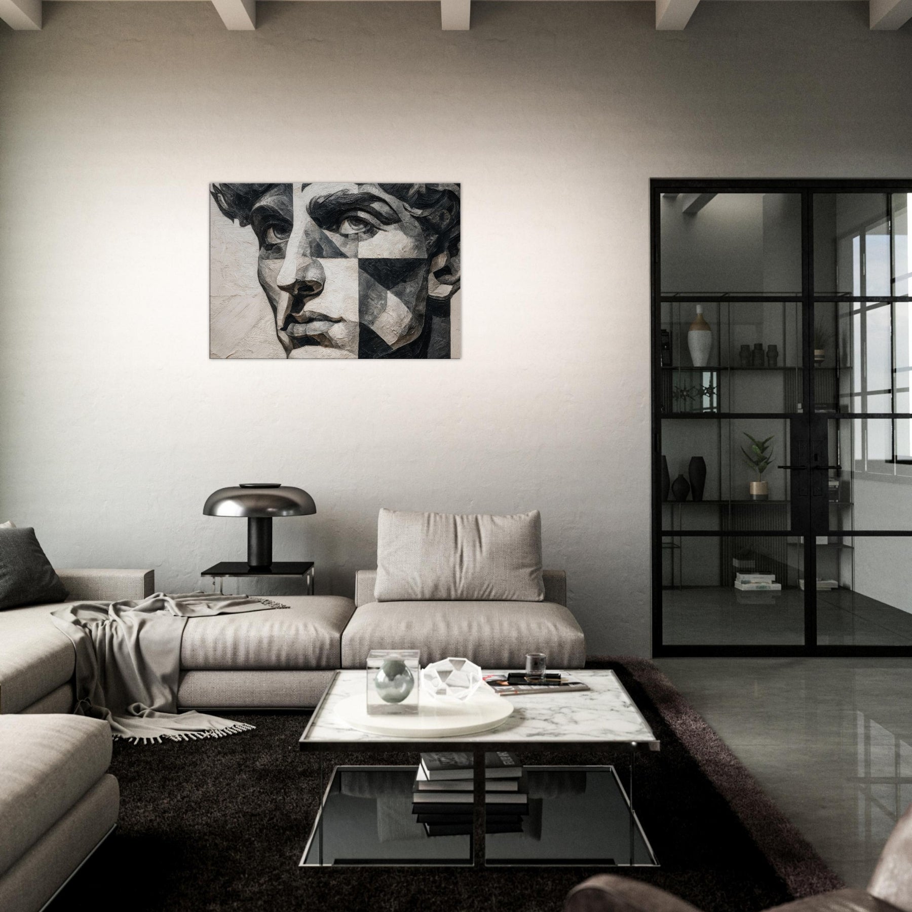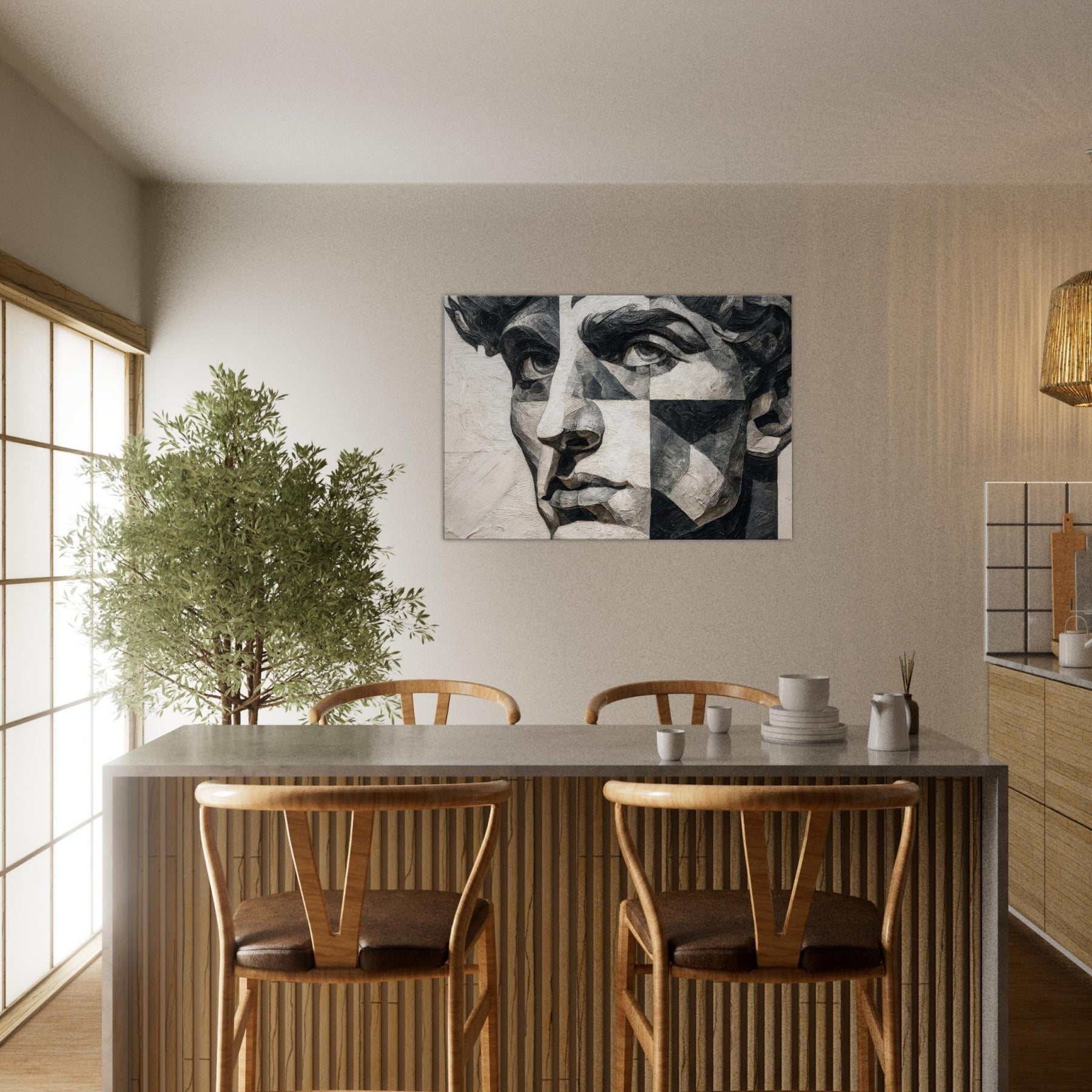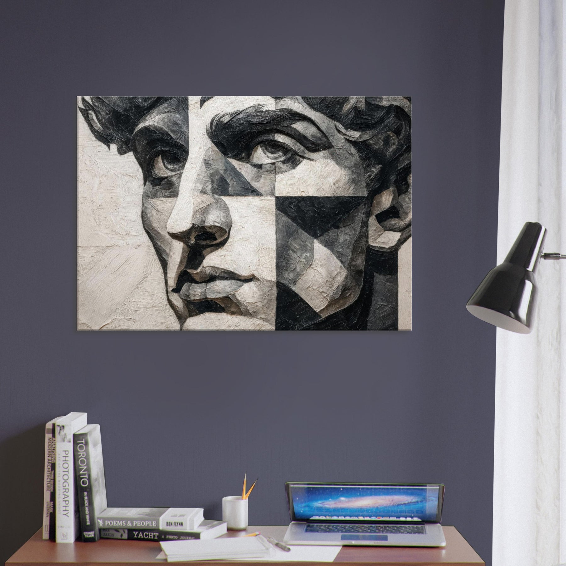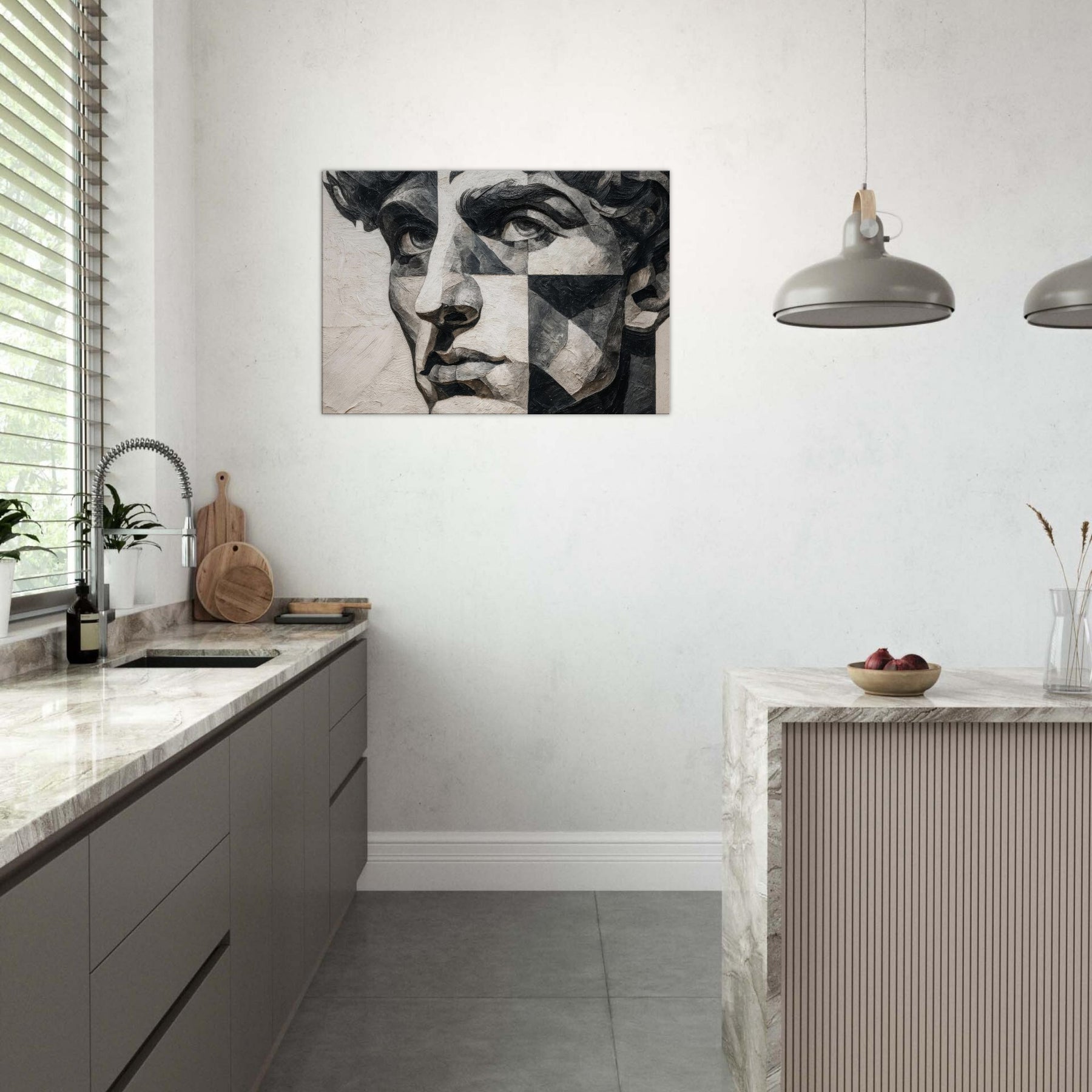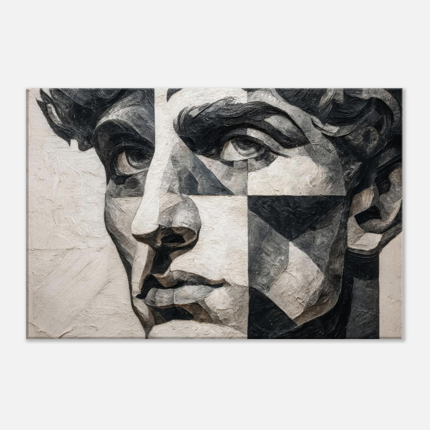 Allow the Cubist Face to anchor a room with quiet intensity. This black and white study dissolves a singular into shifting planes and tactile textures, inviting the eye to wander from shadow to light.