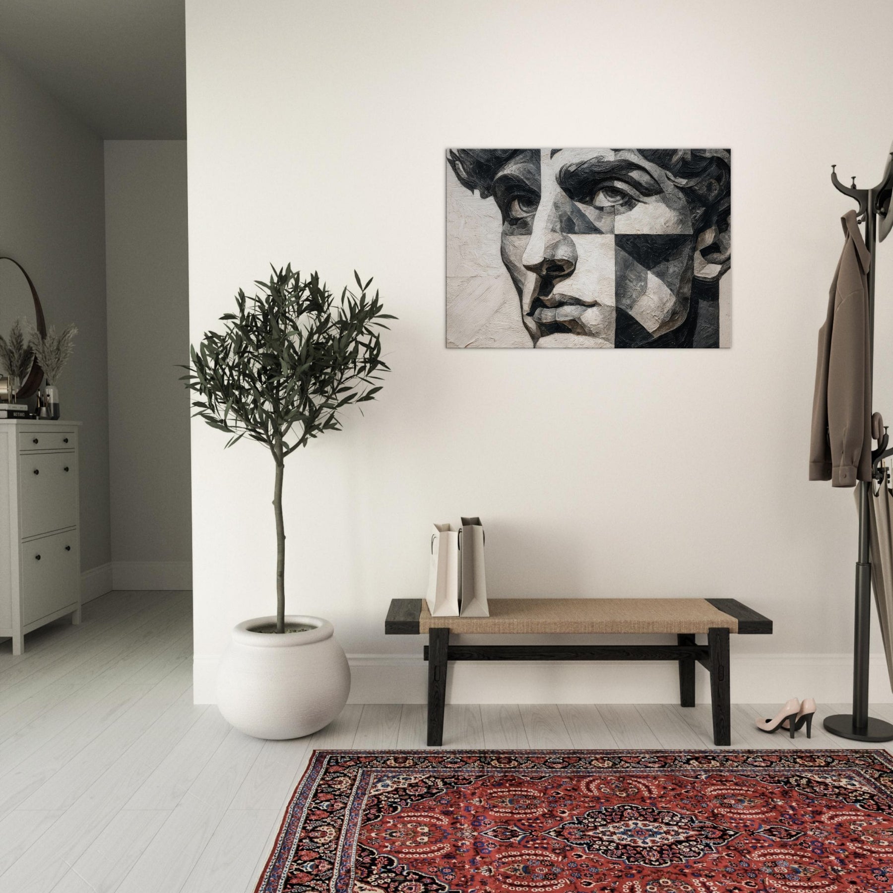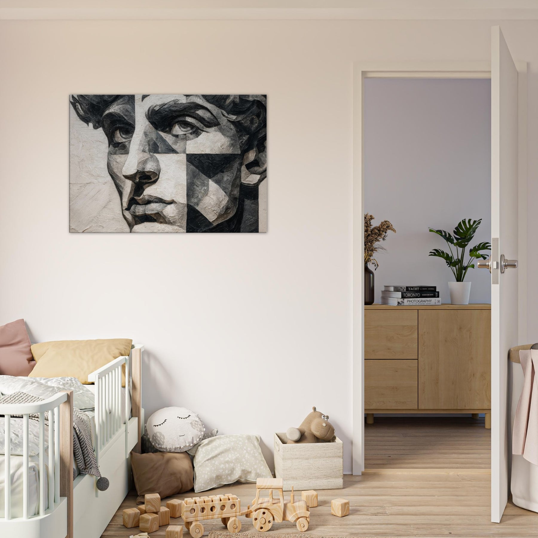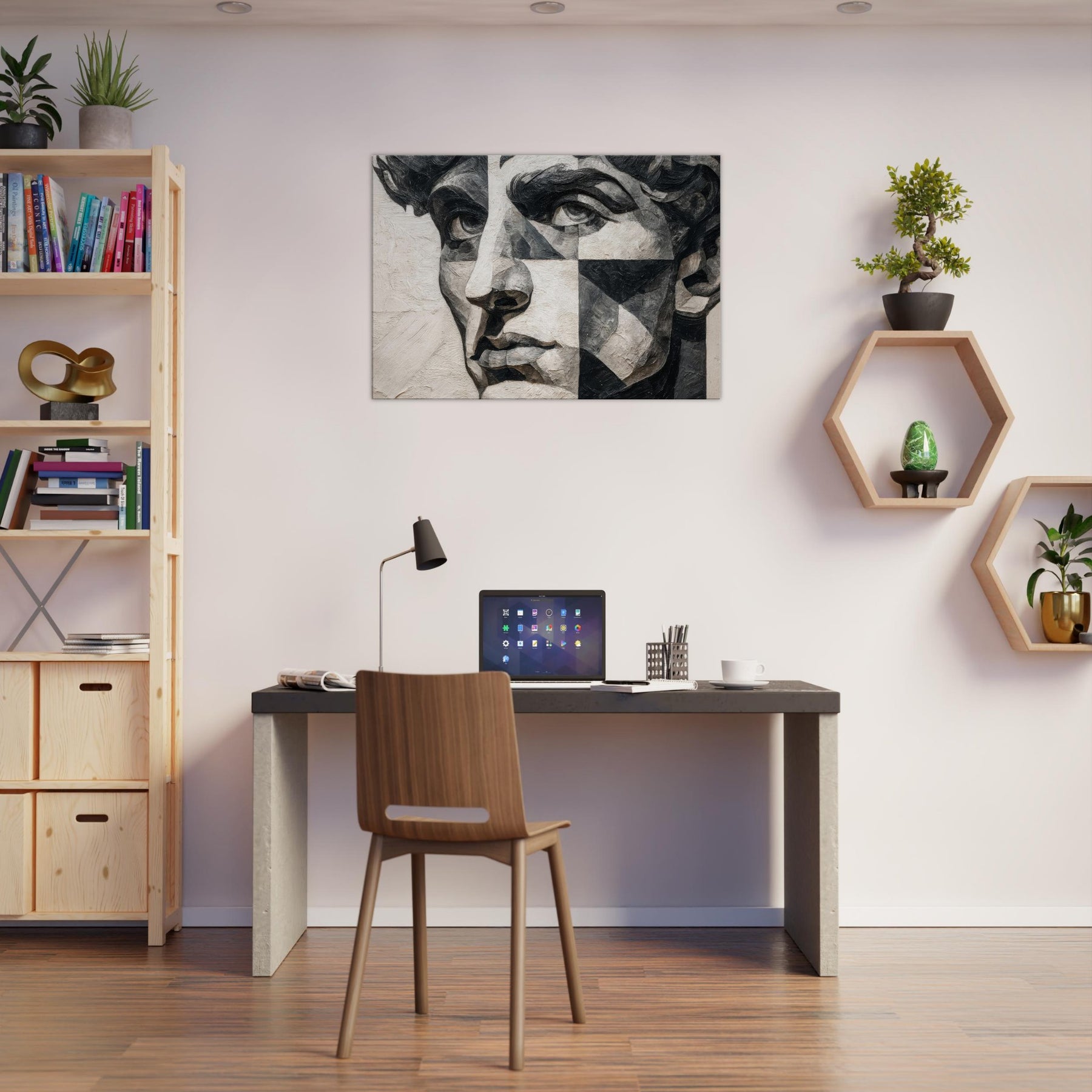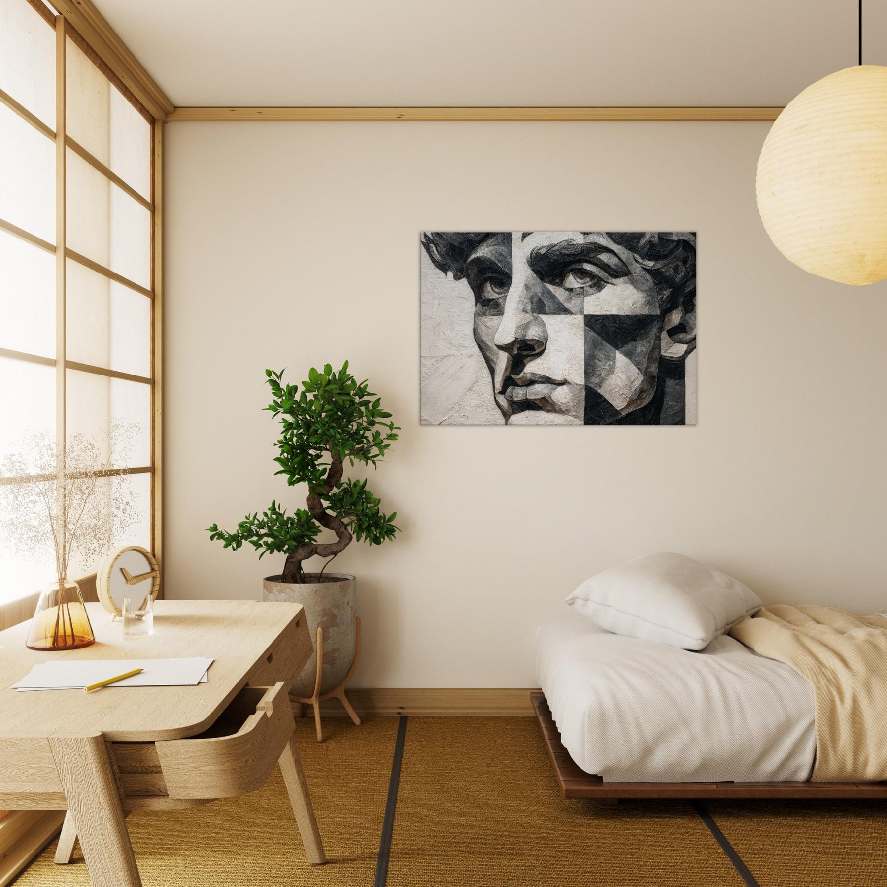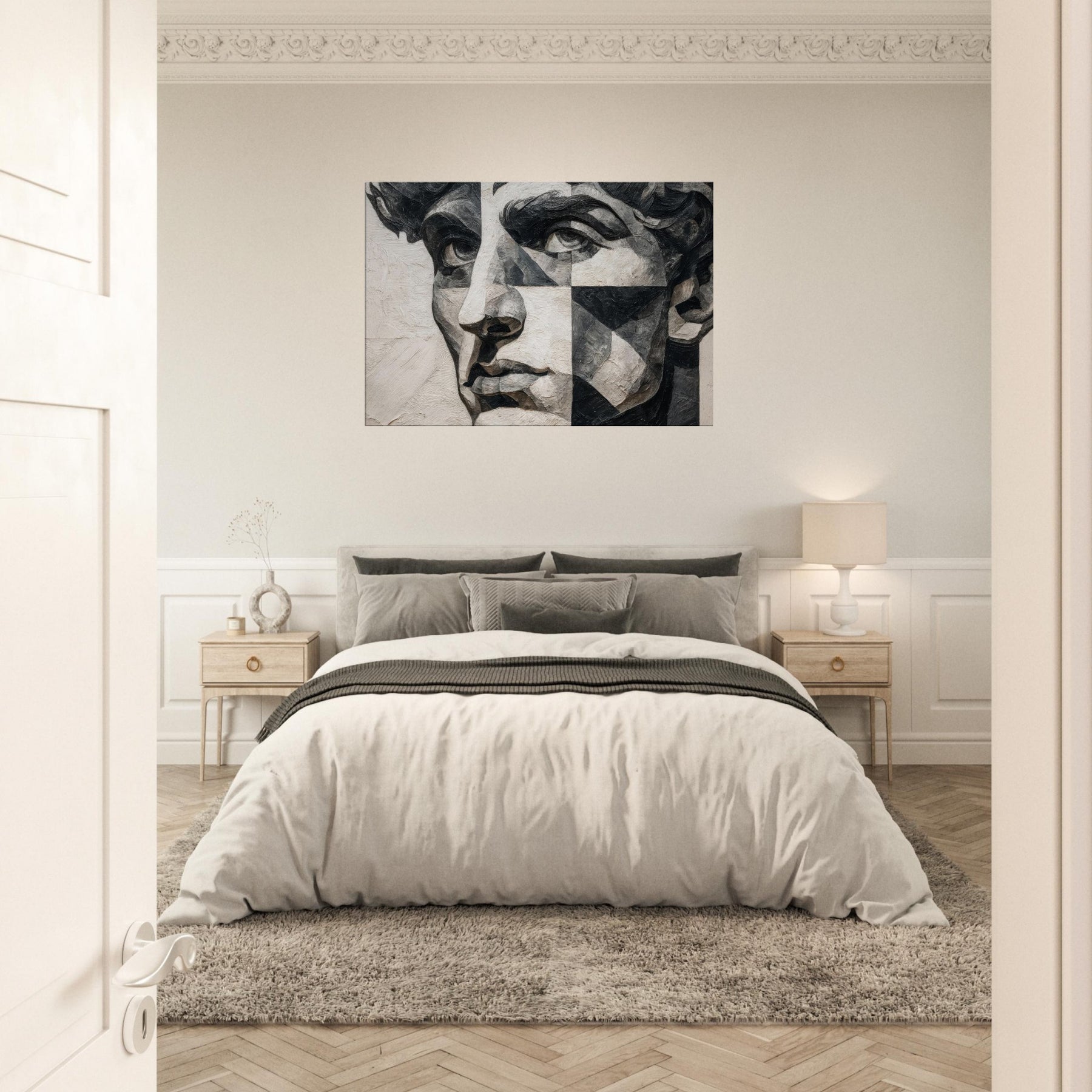 Allow the Cubist Face to anchor a room with quiet intensity. This black and white study dissolves a singular into shifting planes and tactile textures, inviting the eye to wander from shadow to light.