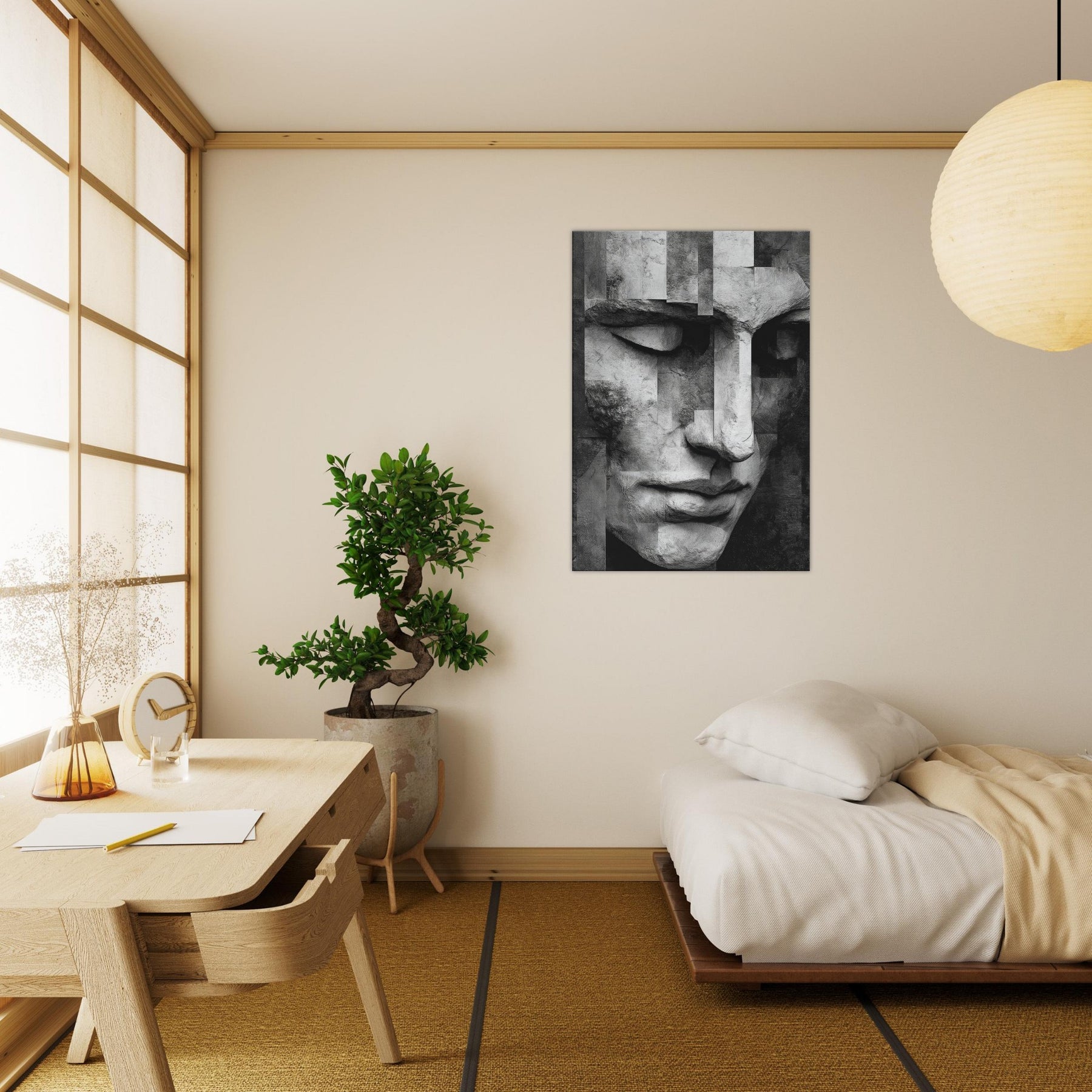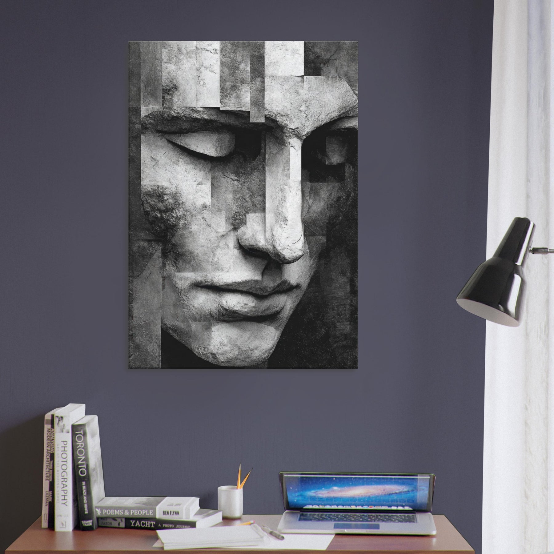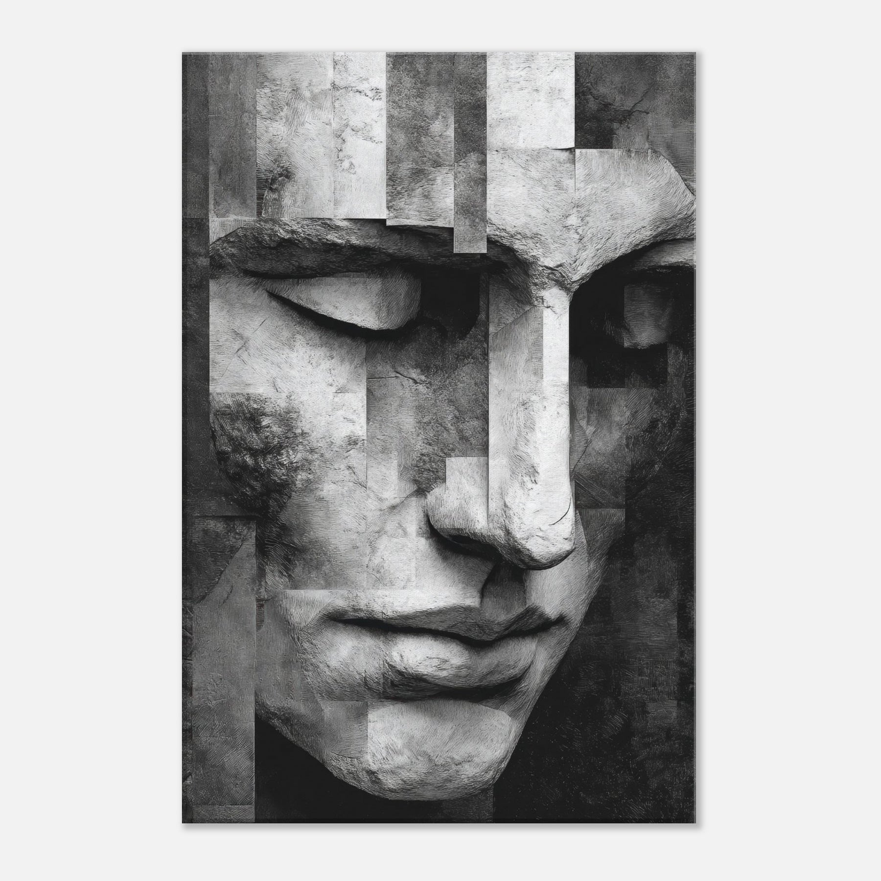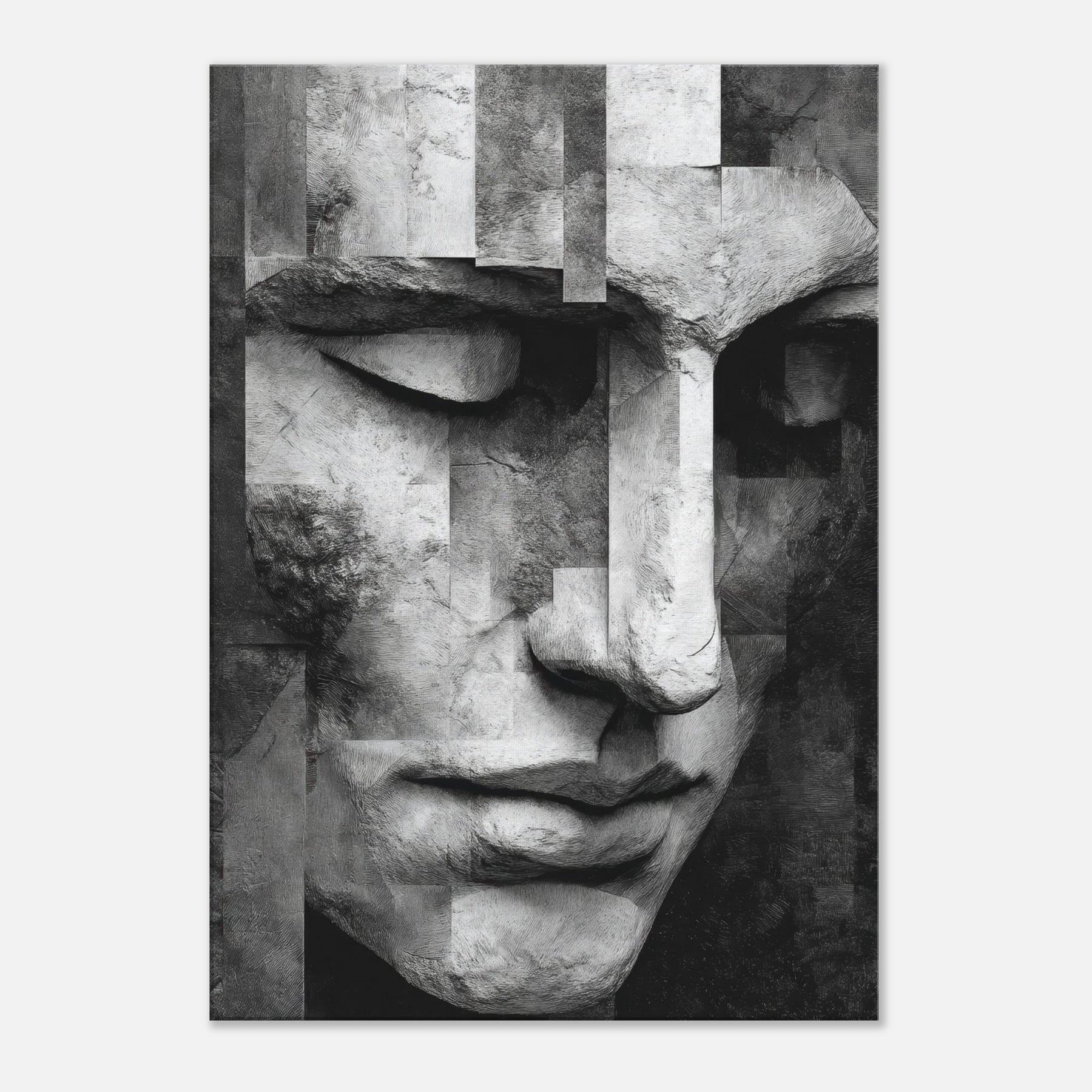 Let the Cubist Face drift into your living space as a center of quiet dialogue. This black and white study dissolves and reassembles emotion in soft planes and precise edges, inviting the eye to wander and linger.