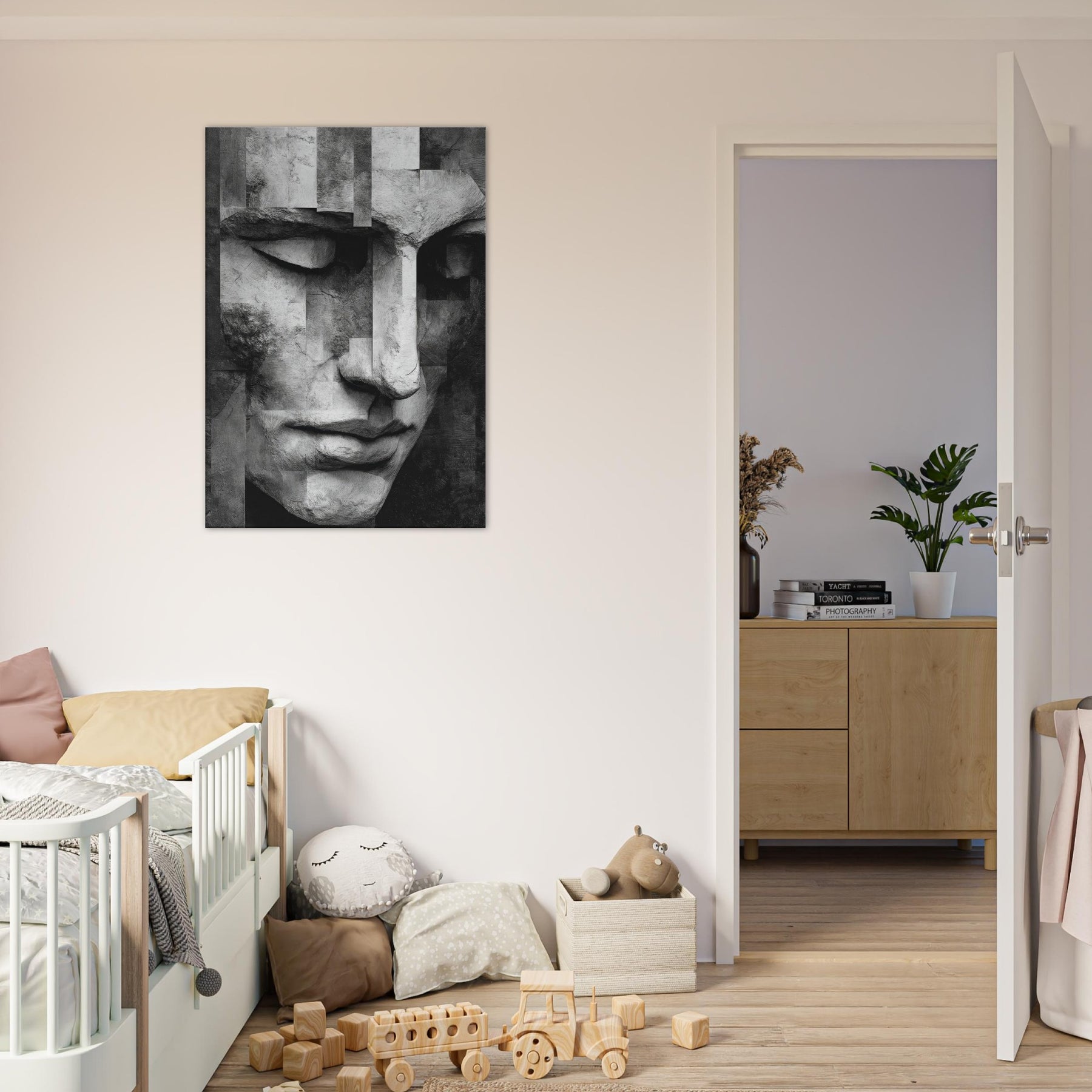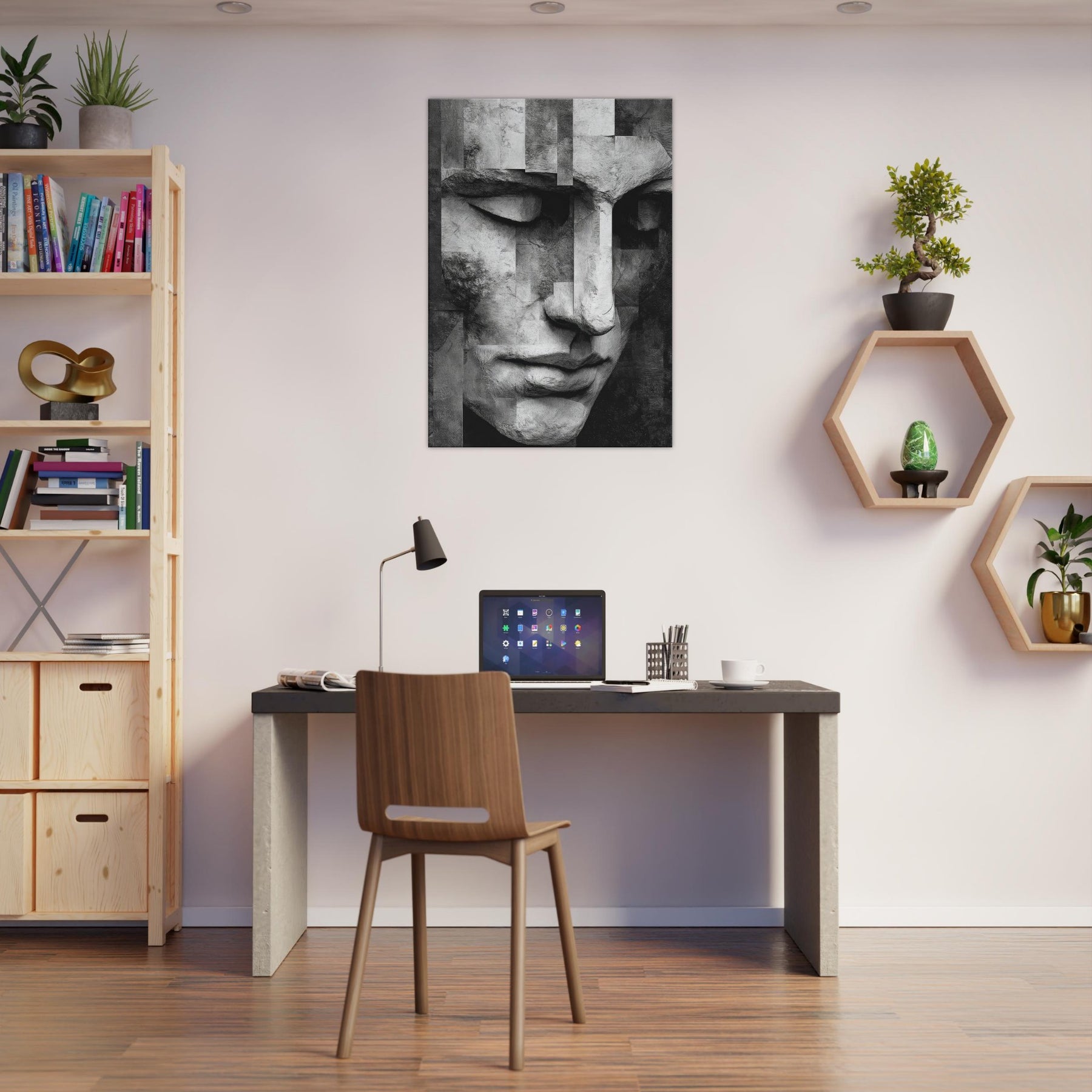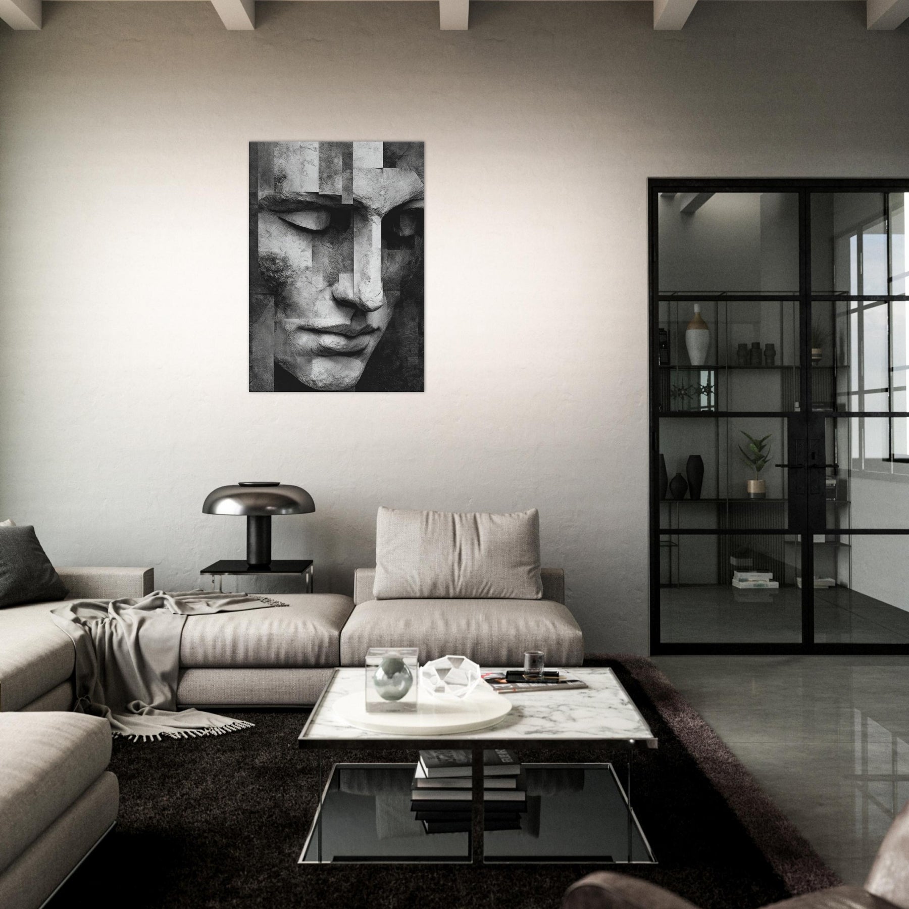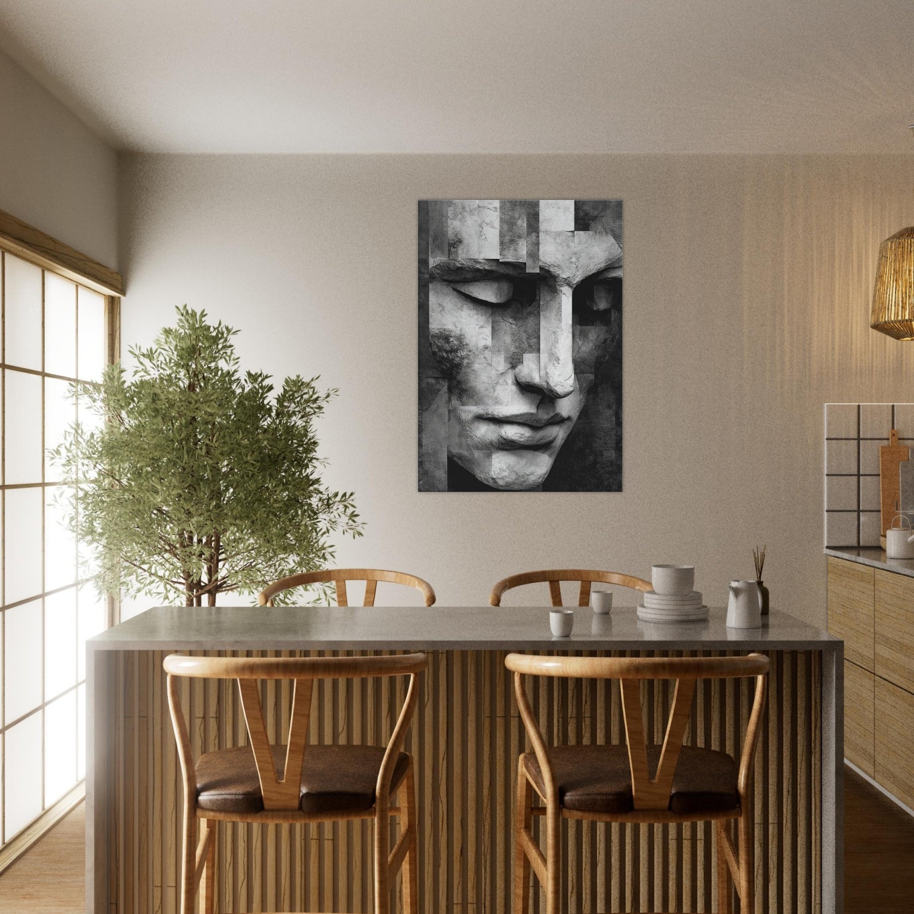 Let the Cubist Face drift into your living space as a center of quiet dialogue. This black and white study dissolves and reassembles emotion in soft planes and precise edges, inviting the eye to wander and linger.