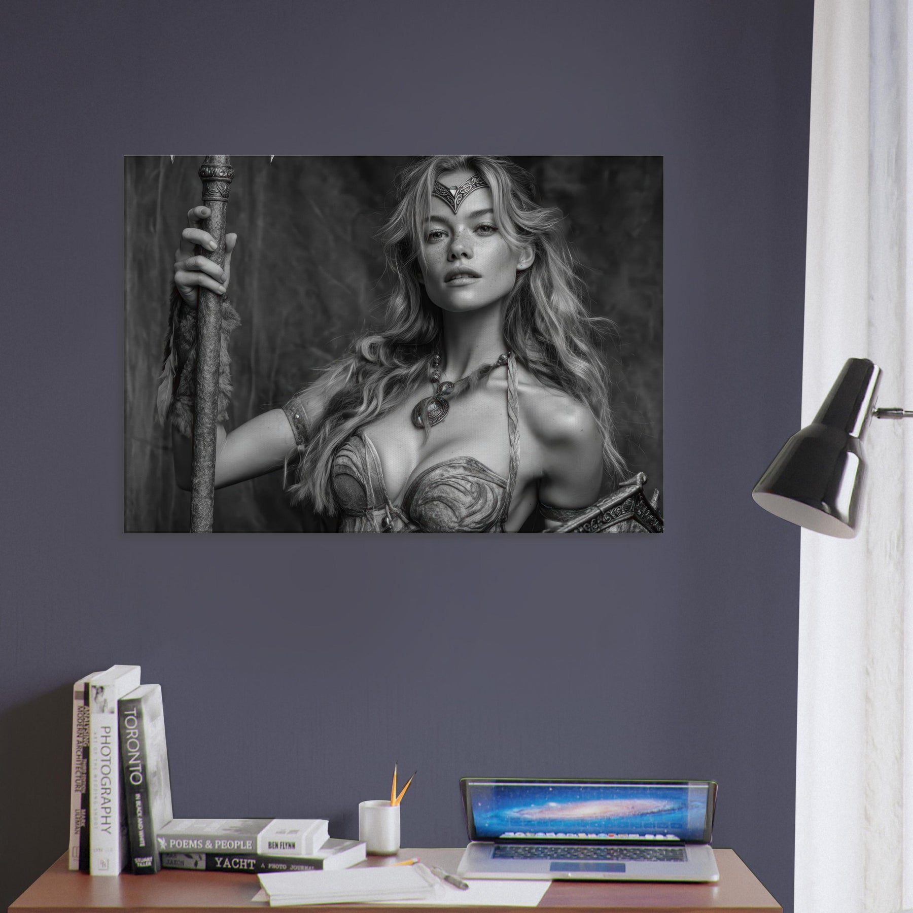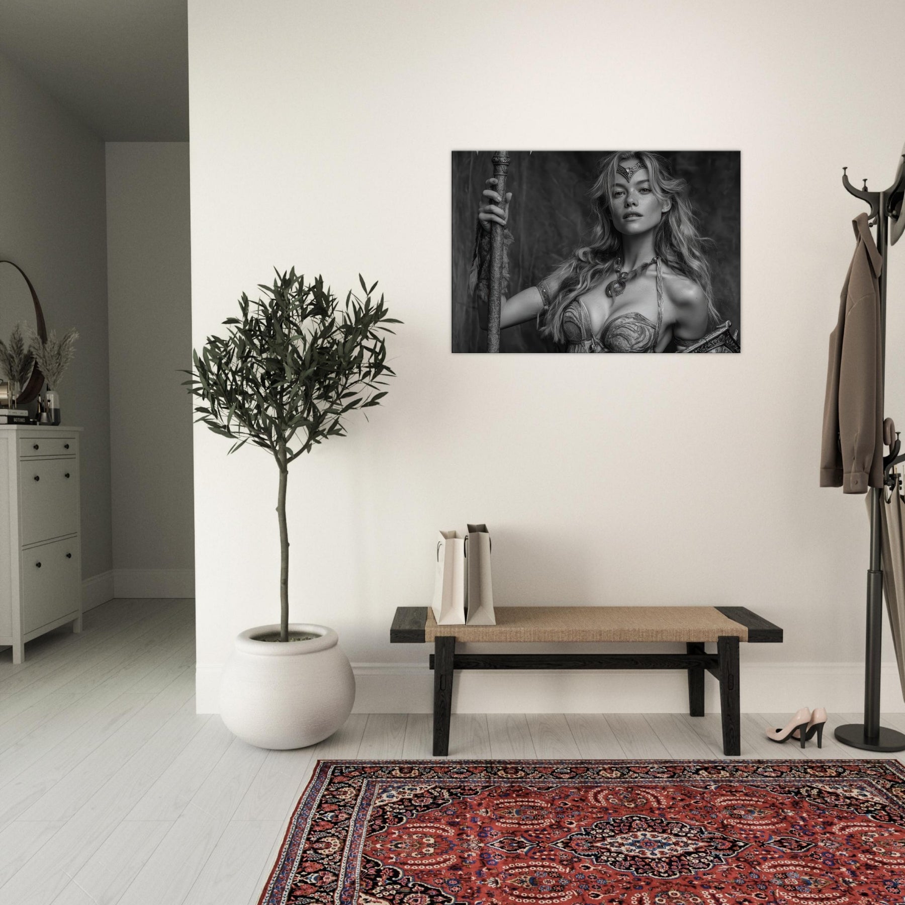 Immerse your space in a nocturnal reverie where Freyja emerges in stark, silvered shades. This black and white portal radiates quiet strength and tender ferocity, marrying goddessly beauty with warlike resolve. The line work and chiaroscuro carve her presence into the room, turning a wall into a story you can inhabit.