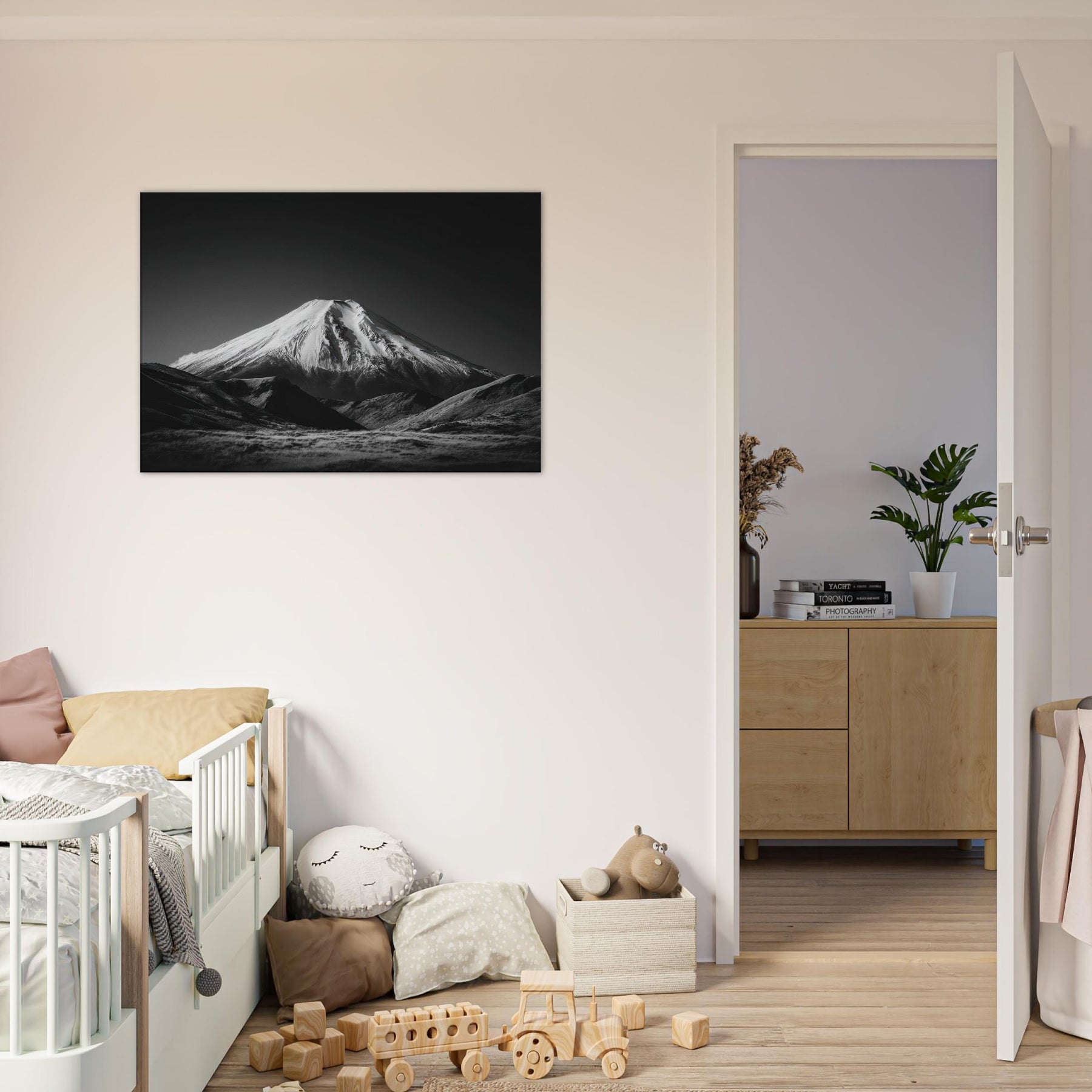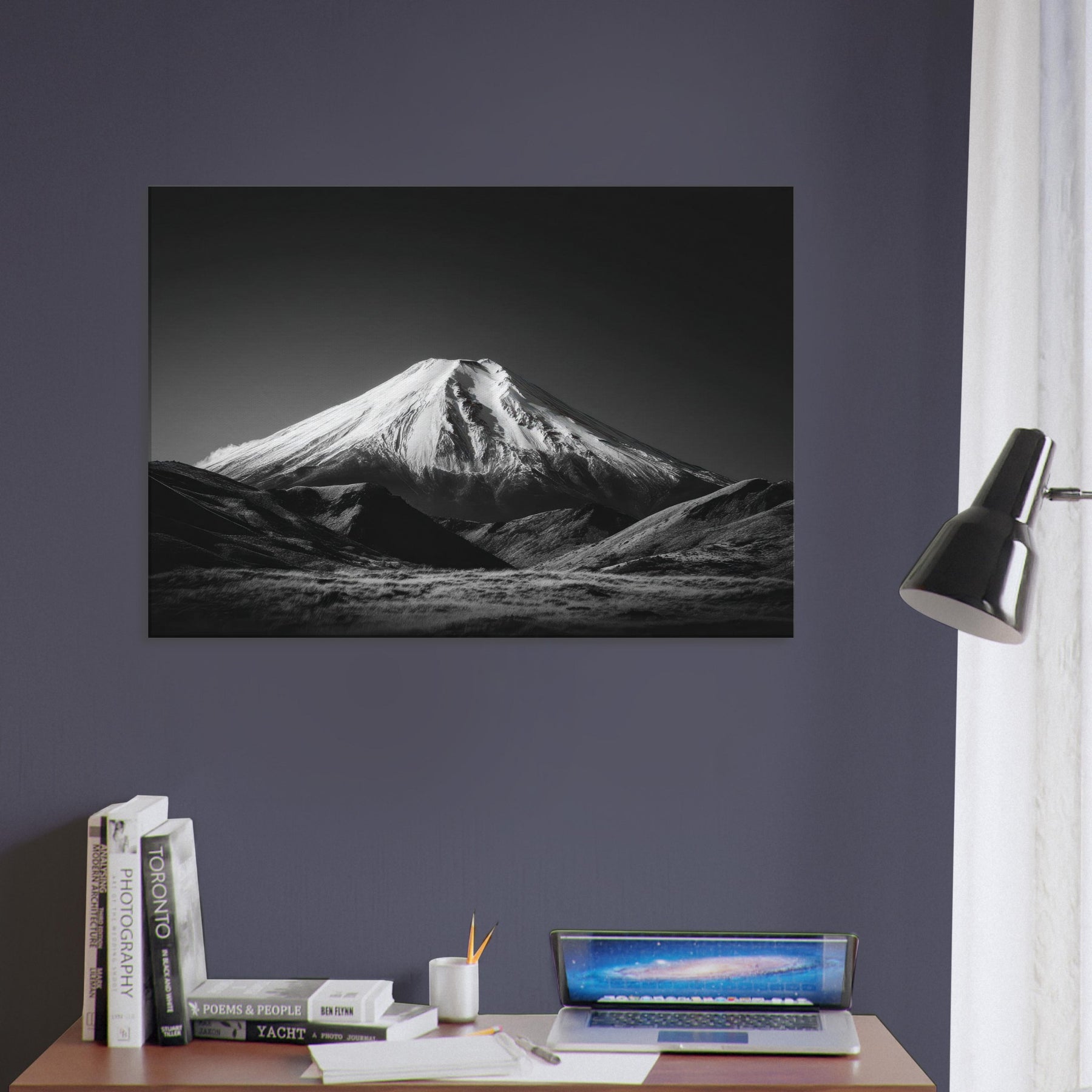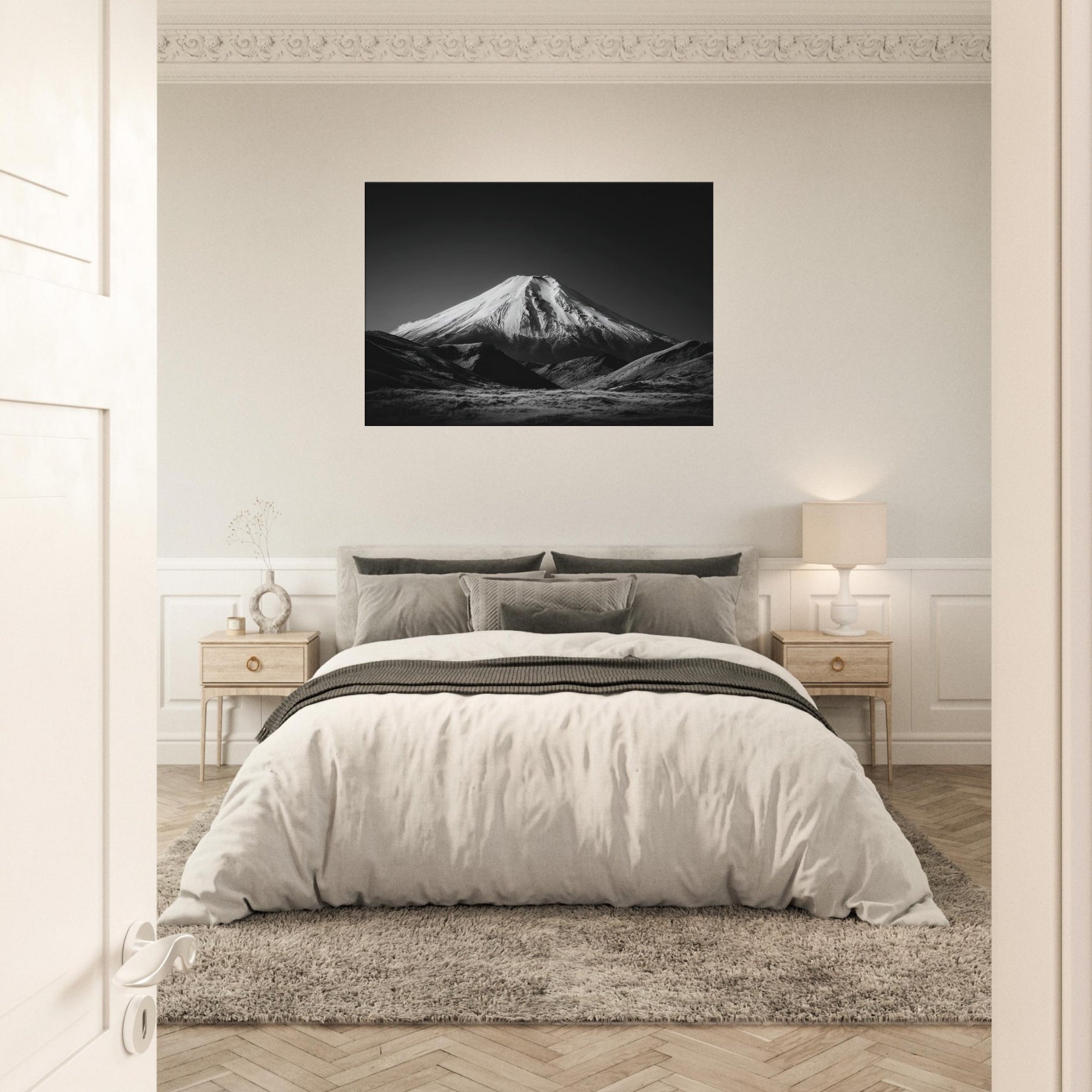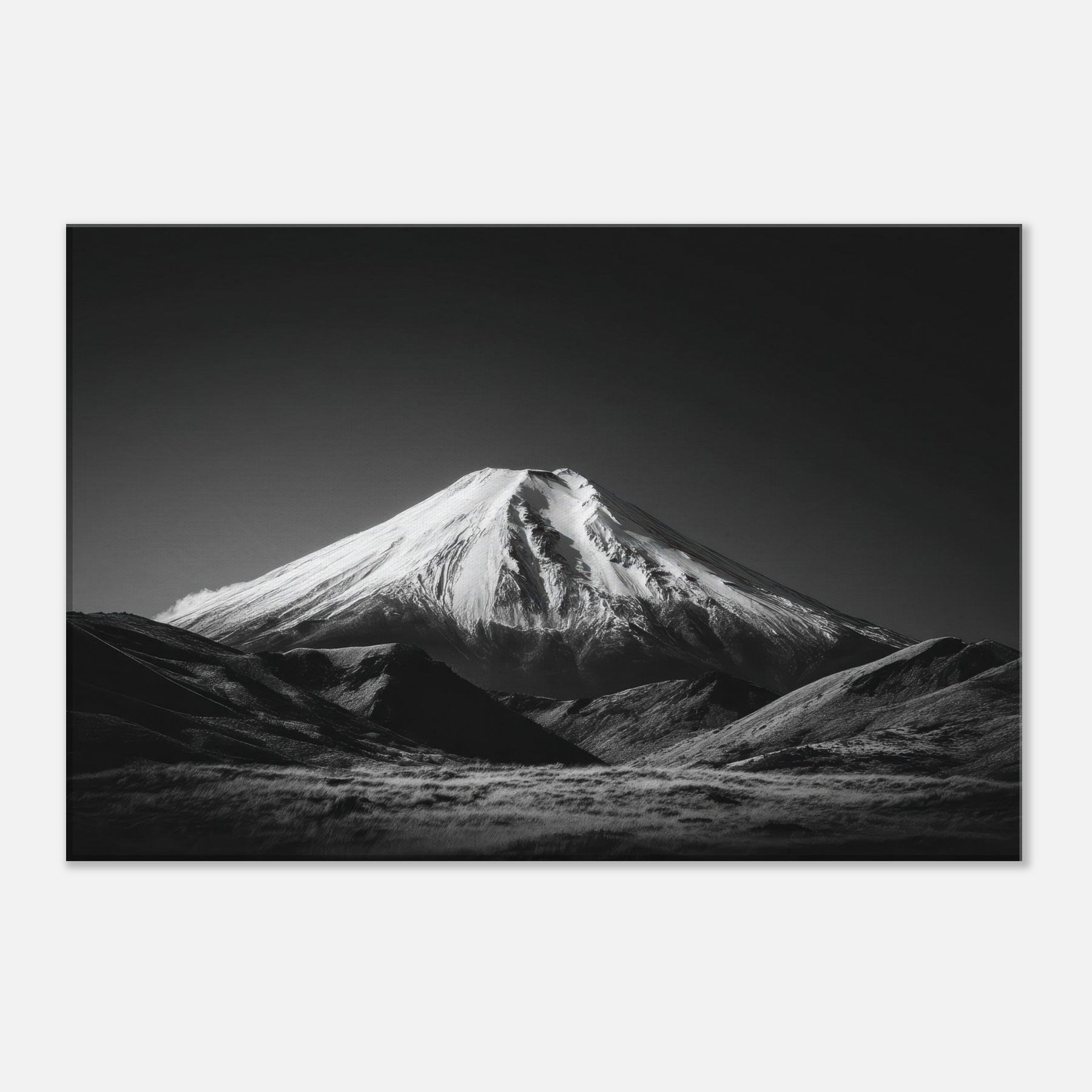Mount Fuji rises in a pristine black and white reverie, a quiet sentinel over a wind polished surface. This wall print on museum-grade canvas captures the volcano’s sculpted slopes in stark contrast frost white ridges against velvet darkness evoking stillness, focus, and clarity.
