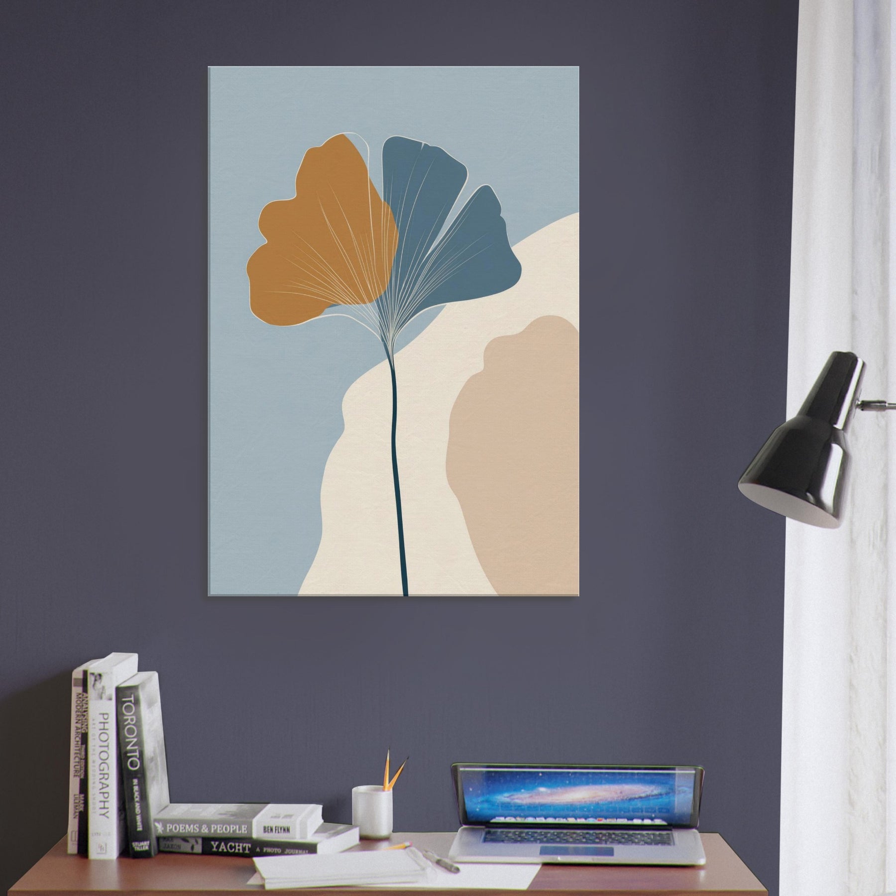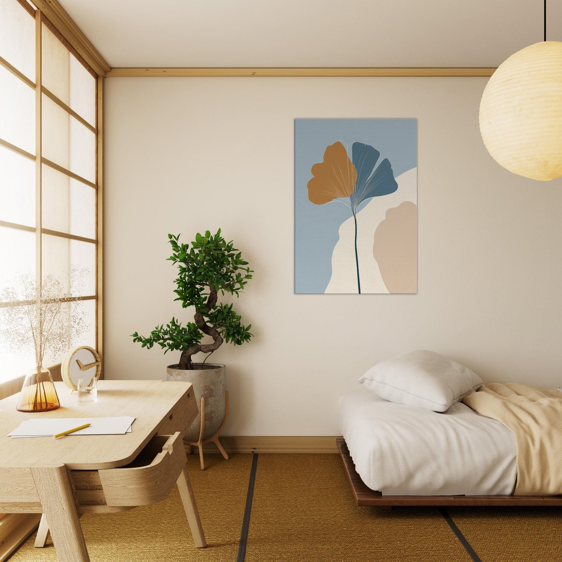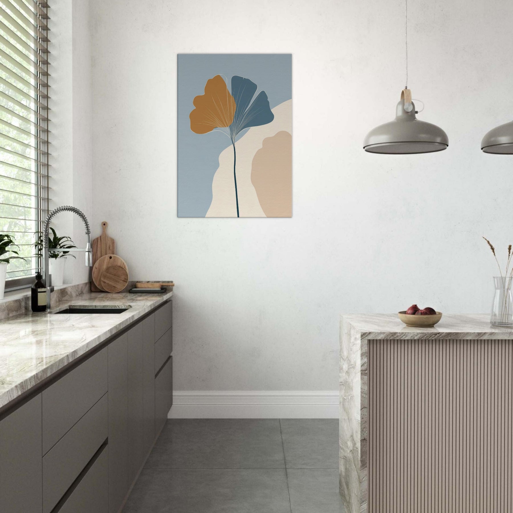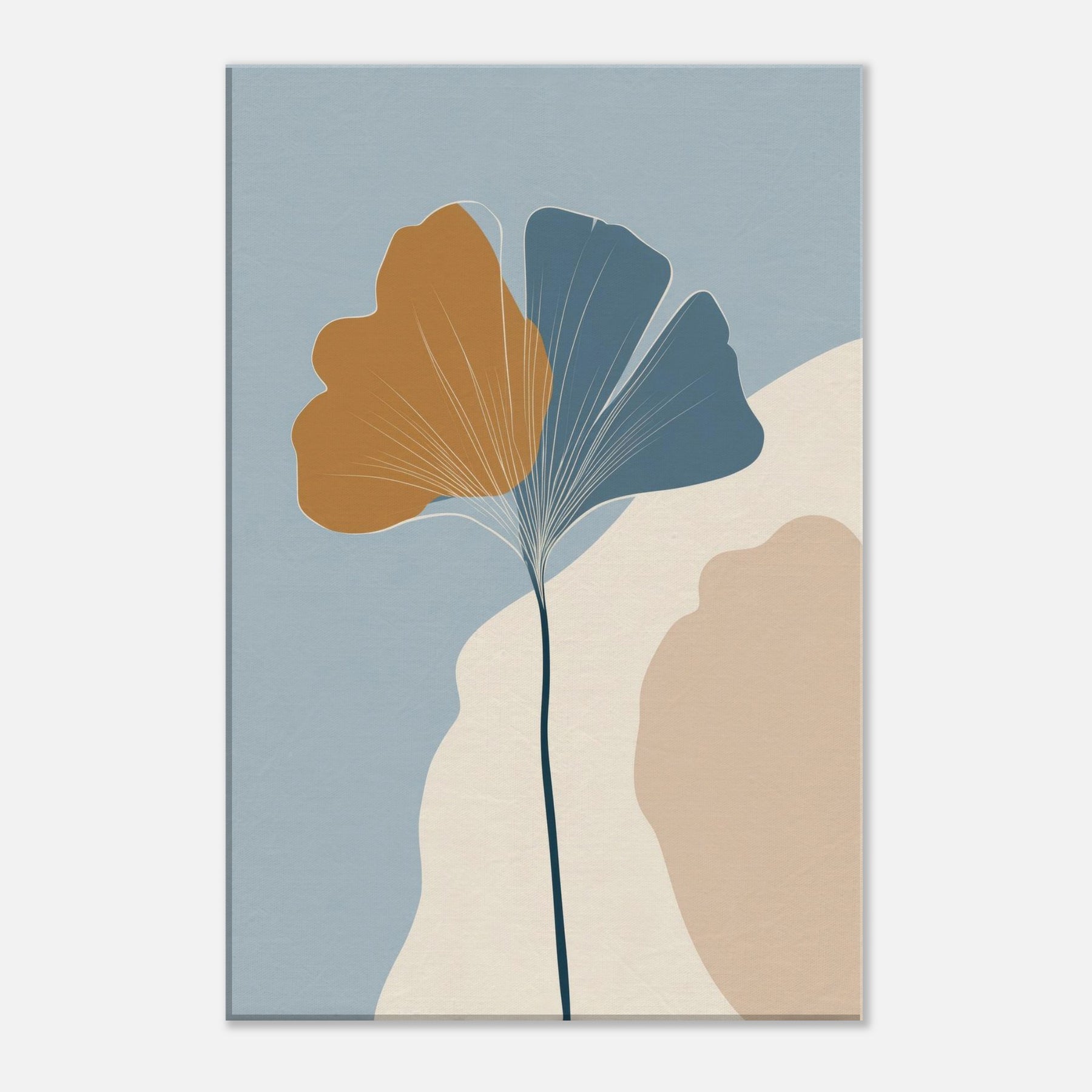 Like a breath of quiet in a crowded room, this minimalist composition turns the Ginkgo Leaf into a meditation on balance and light. A slender stem rises to cradle the two tone fan shapes, the golden ochre and cool blue gray inviting warmth and calm. The soft ground of cream and stone hints at a sunlit morning, while negative space becomes room to breathe. Hang it in a living space to invite stillness, clarity, and a touch of nature's resilience.