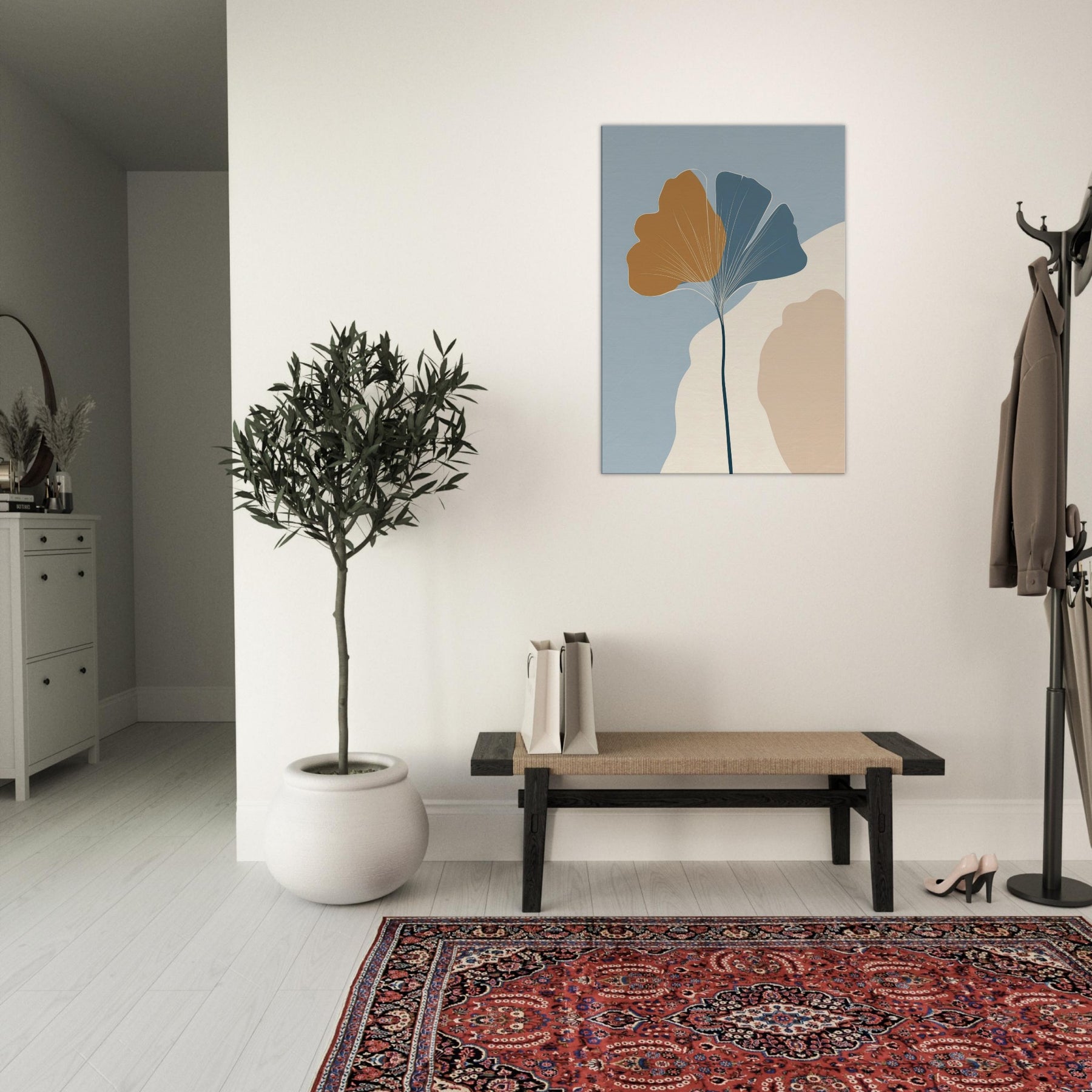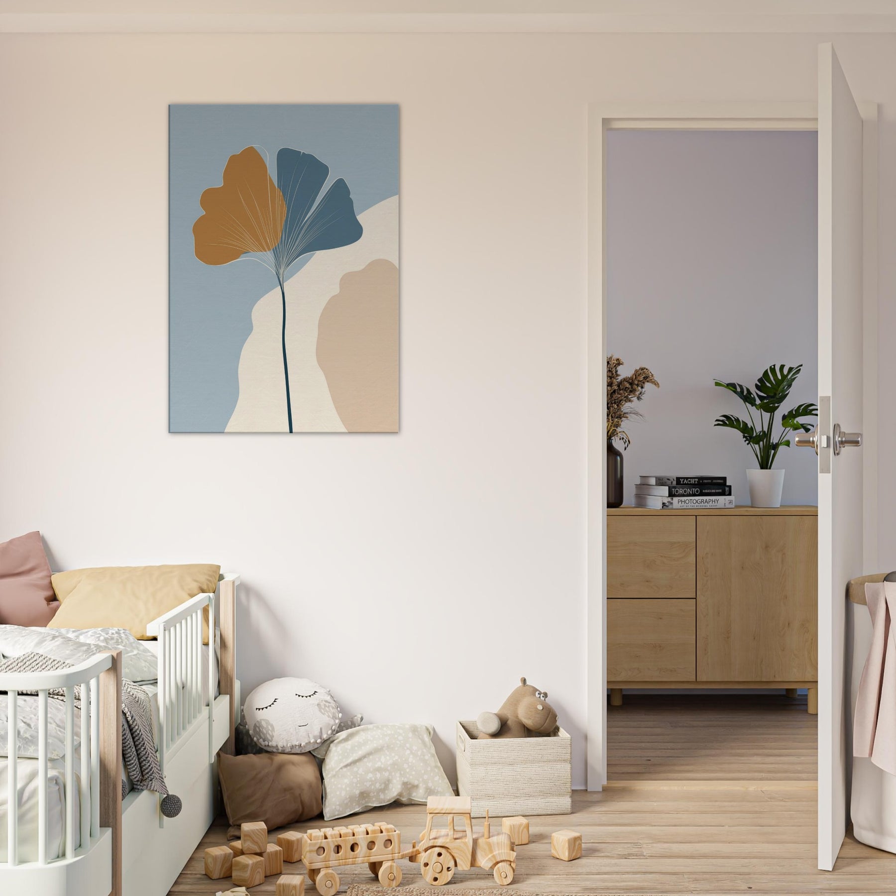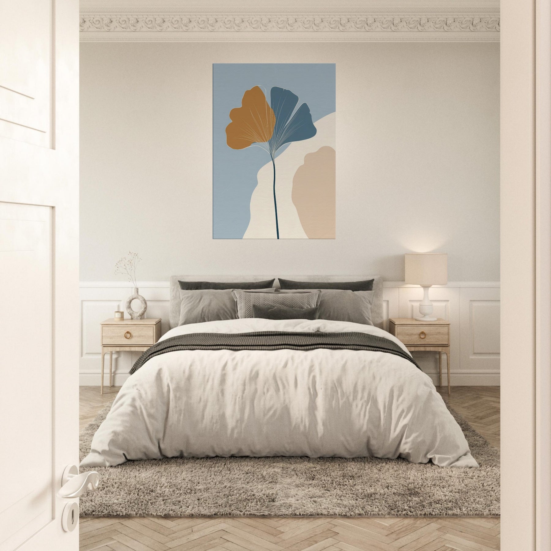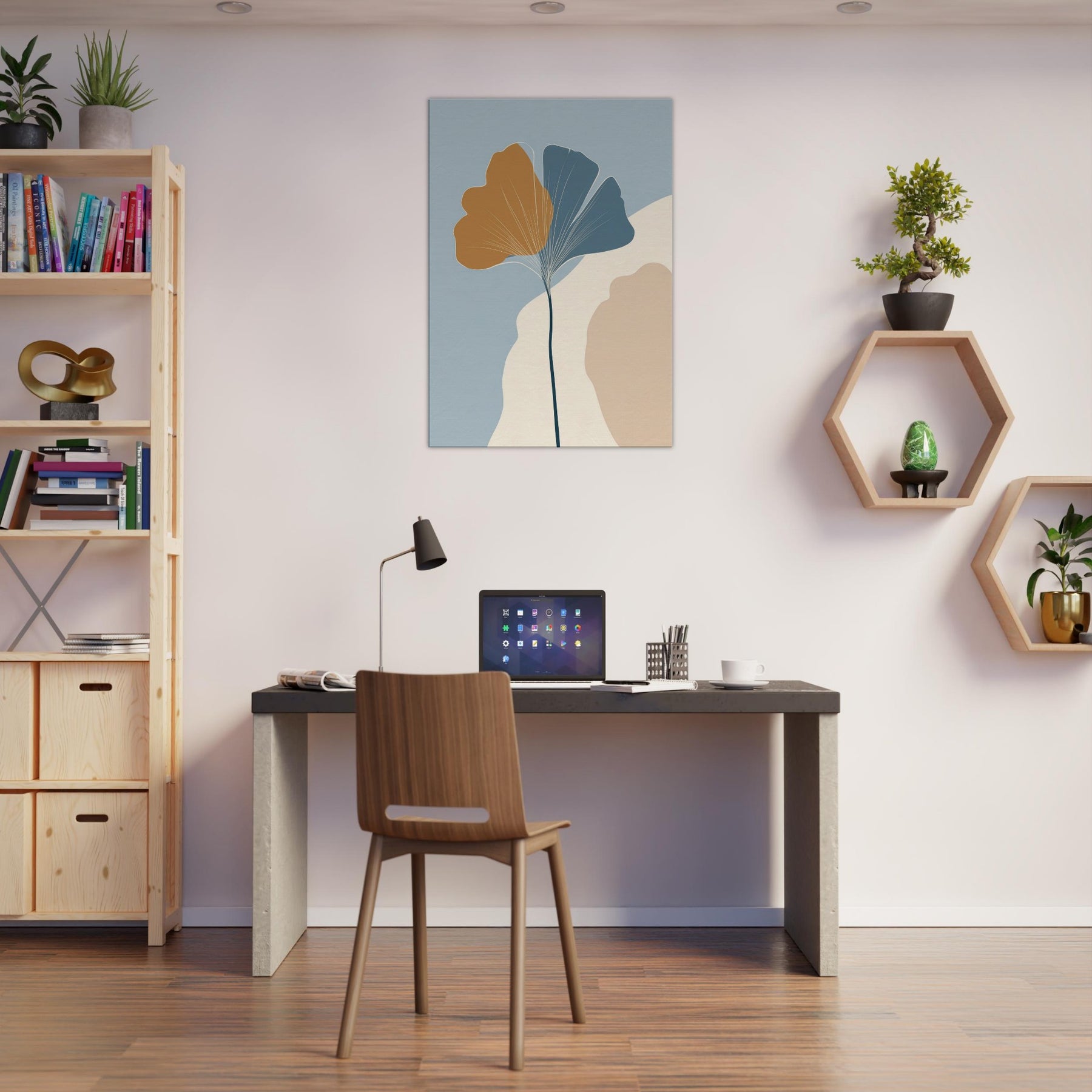 Like a breath of quiet in a crowded room, this minimalist composition turns the Ginkgo Leaf into a meditation on balance and light. A slender stem rises to cradle the two tone fan shapes, the golden ochre and cool blue gray inviting warmth and calm. The soft ground of cream and stone hints at a sunlit morning, while negative space becomes room to breathe. Hang it in a living space to invite stillness, clarity, and a touch of nature's resilience.