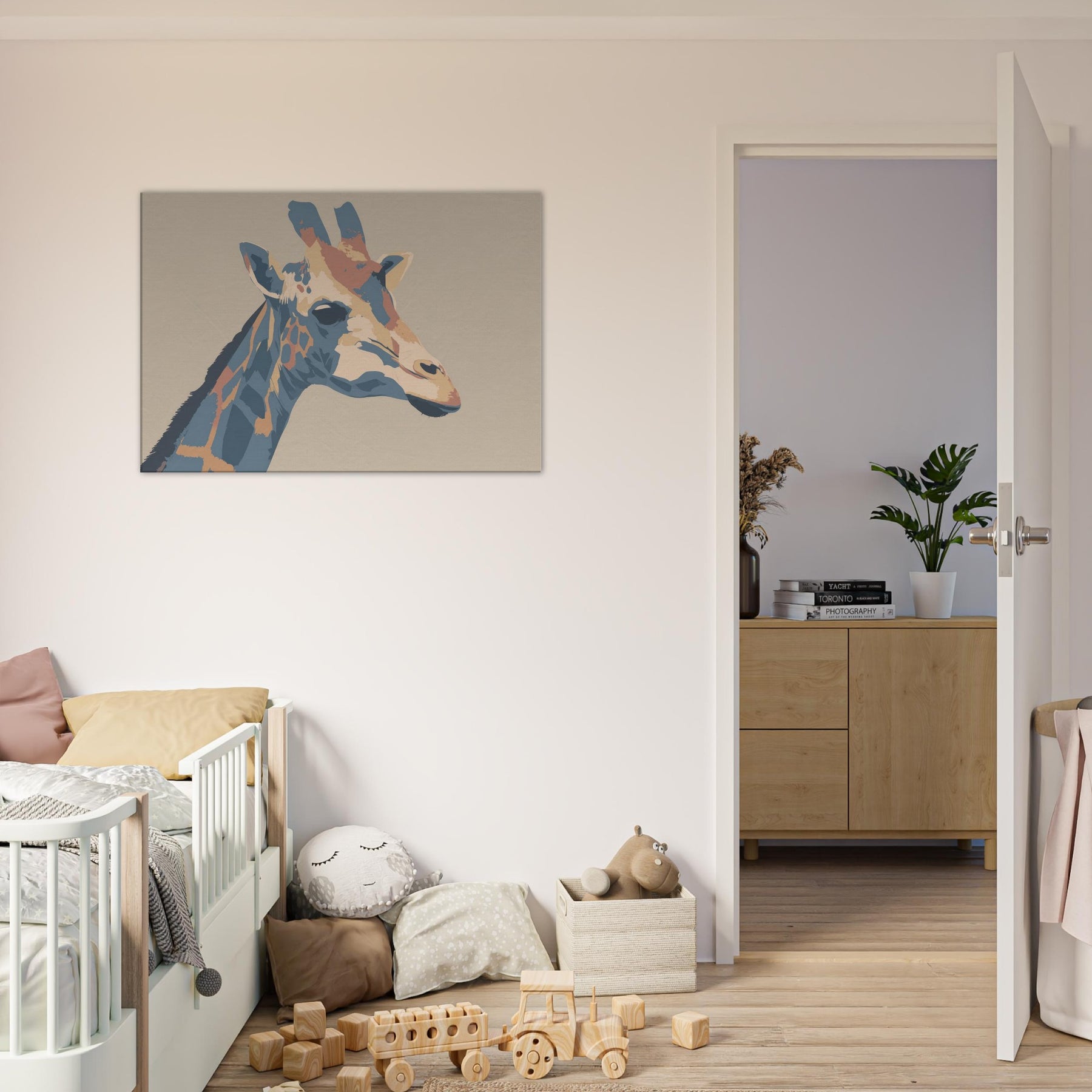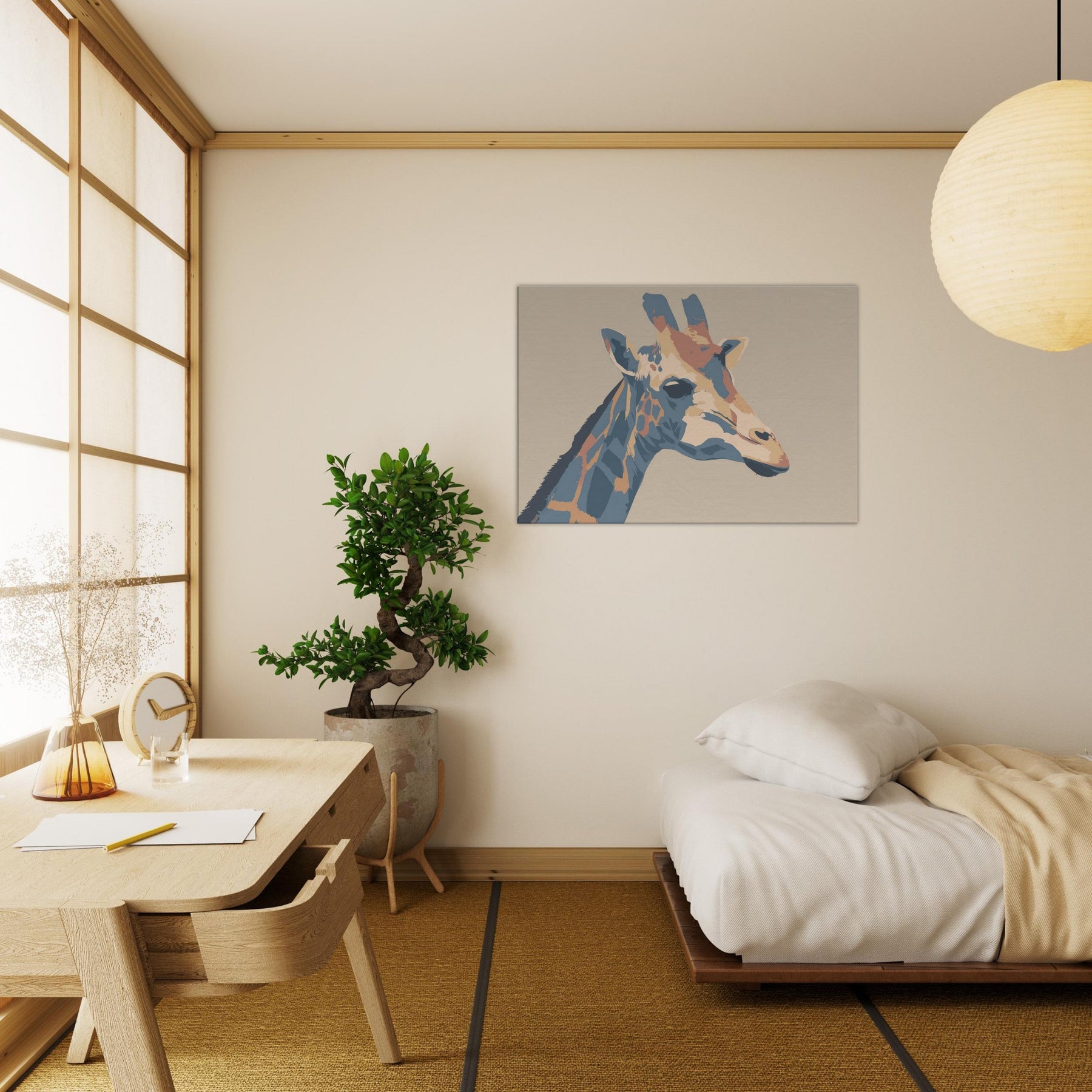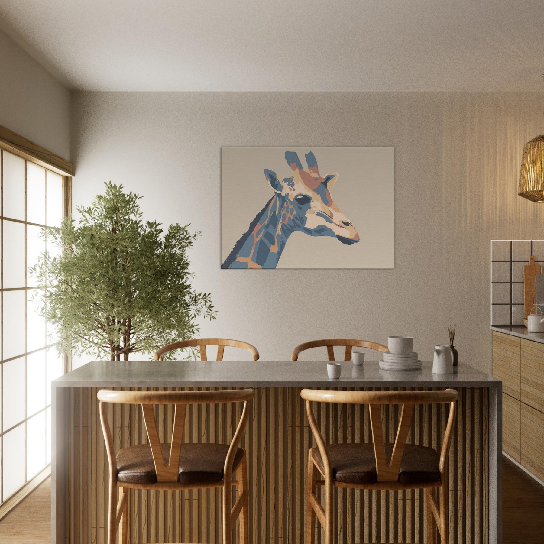 An elegant, pared back gaze in soft, painterly planes. This Giraffe composition invites calm into the living room, where warm neutrals and cool blues meet in quiet rhythm. The minimalist lines trace a tall, graceful silhouette, letting light and negative space breathe around it. It feels like a gentle memory of a savanna sunset, captured in layered color blocks that shift with the day. Hang it above a sofa or bedside wall to slow the room, spark conversation, and remind you to breathe and dream.