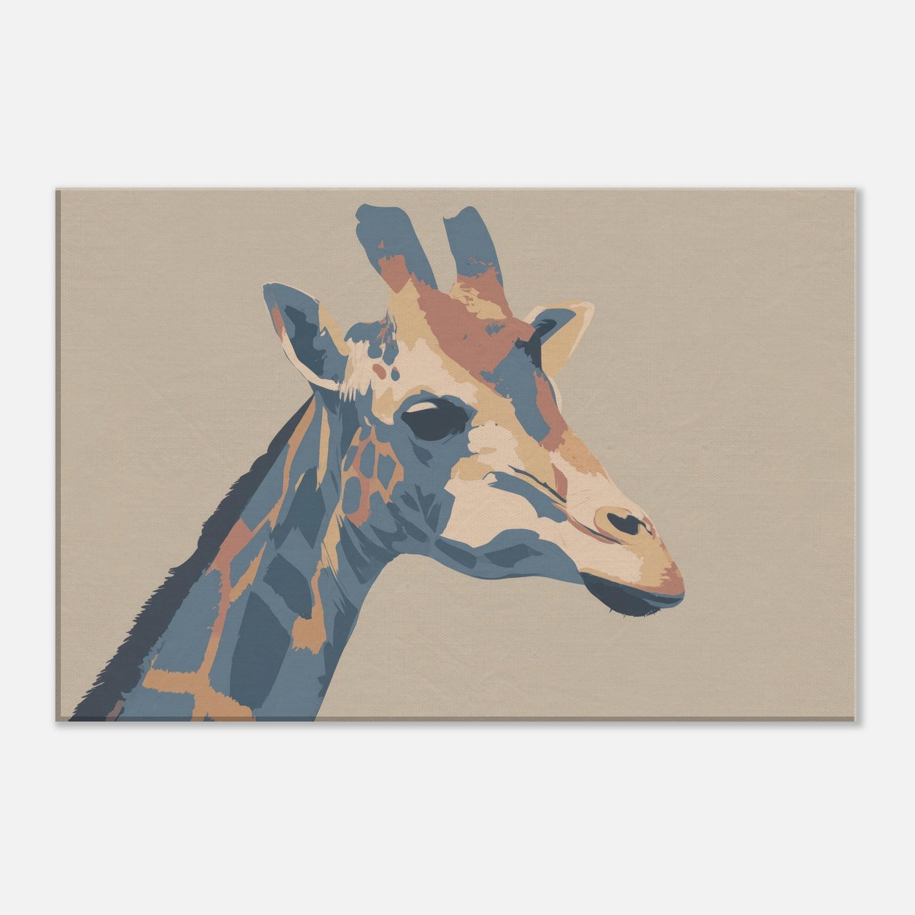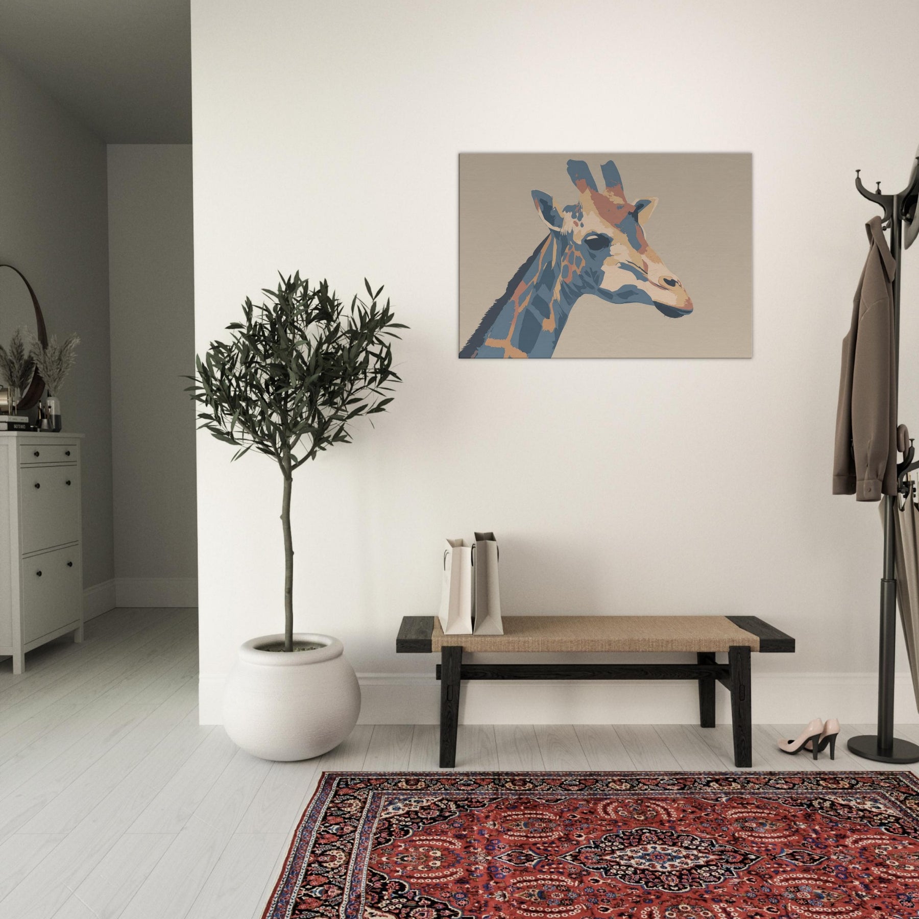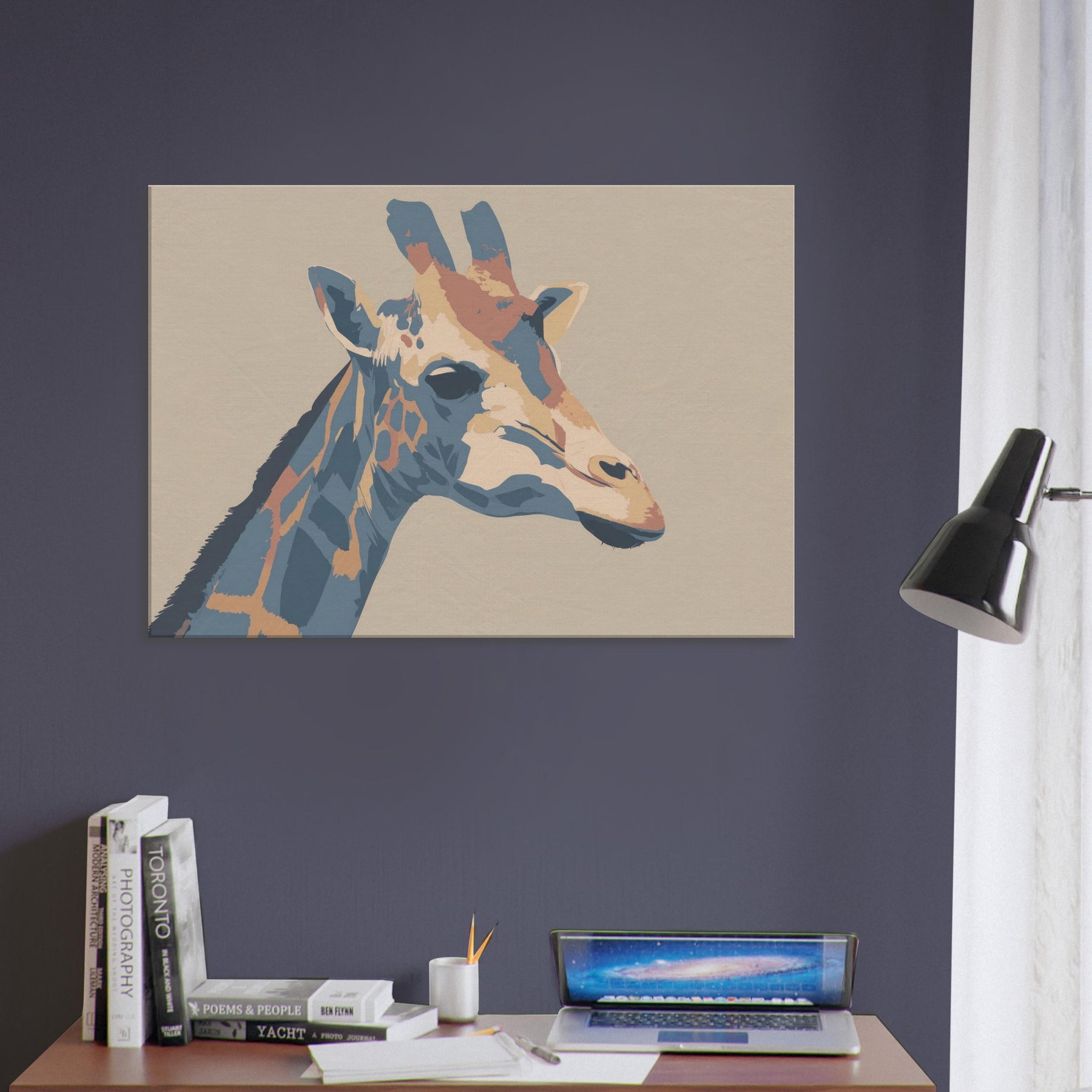 An elegant, pared back gaze in soft, painterly planes. This Giraffe composition invites calm into the living room, where warm neutrals and cool blues meet in quiet rhythm. The minimalist lines trace a tall, graceful silhouette, letting light and negative space breathe around it. It feels like a gentle memory of a savanna sunset, captured in layered color blocks that shift with the day. Hang it above a sofa or bedside wall to slow the room, spark conversation, and remind you to breathe and dream.