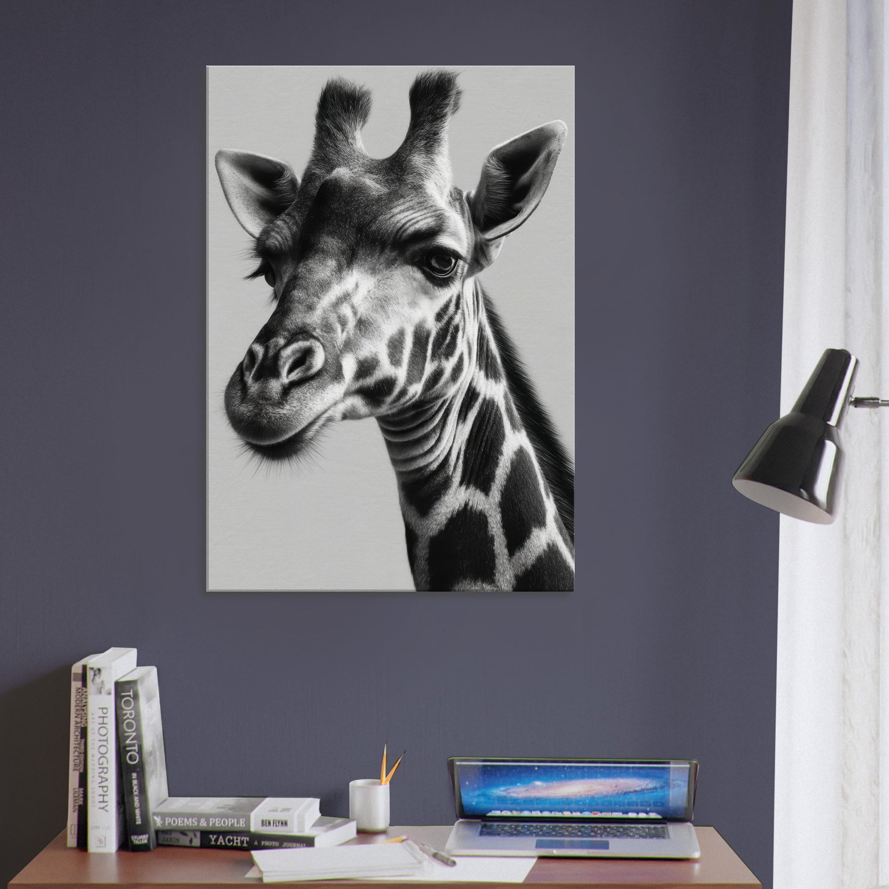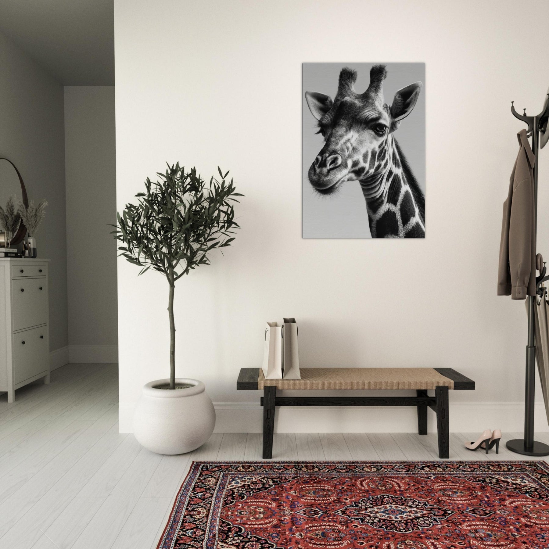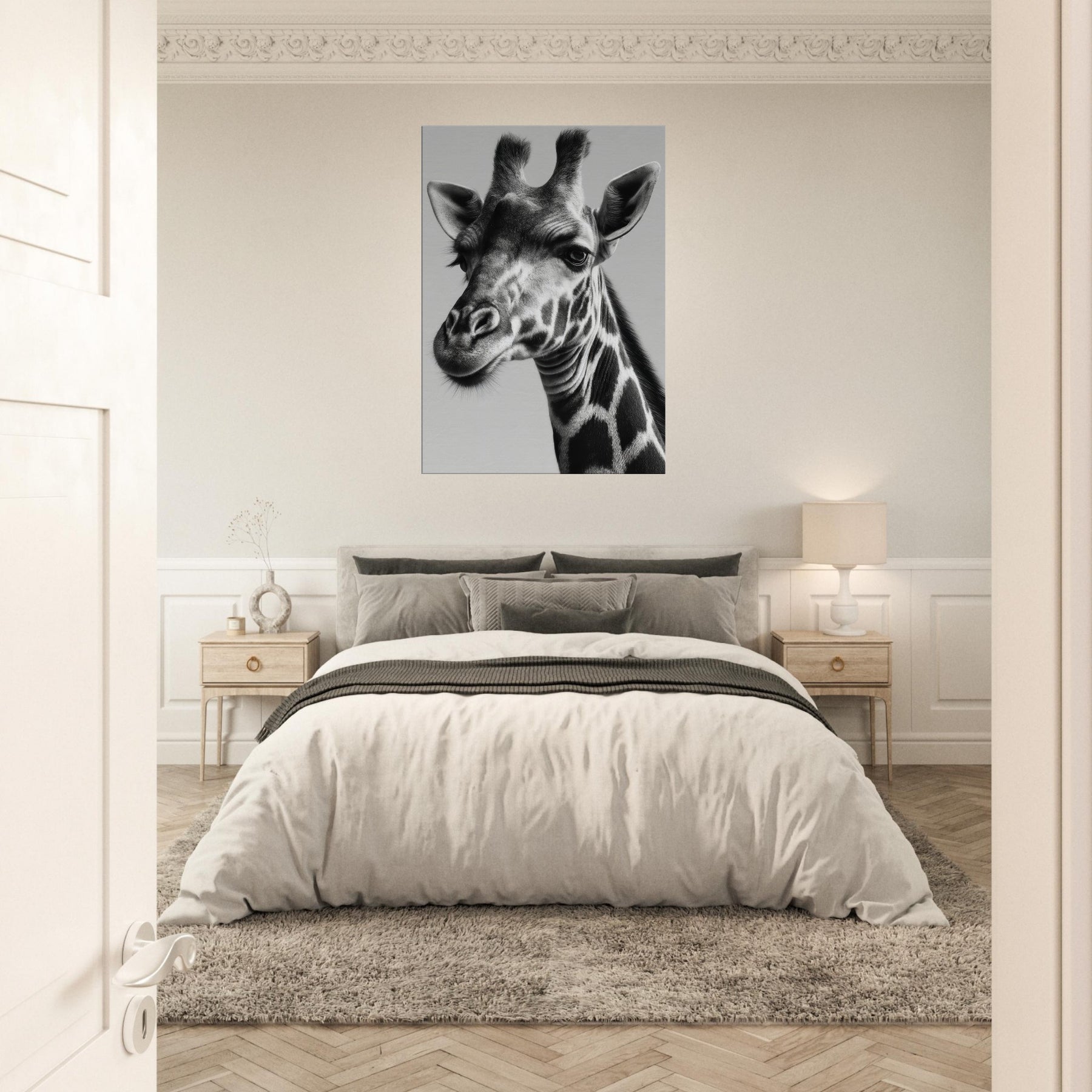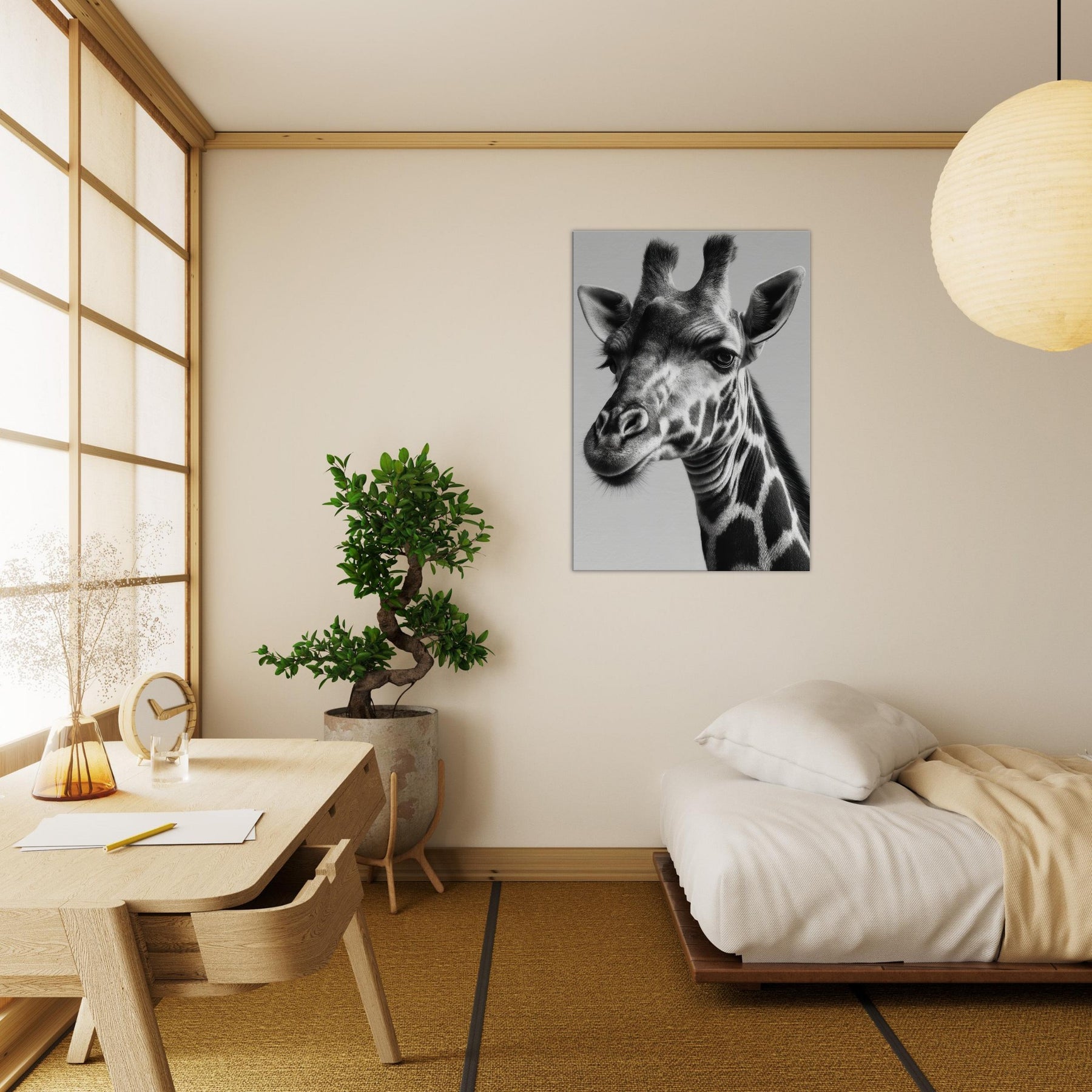 Immerse your space in the quiet grandeur of a monochrome moment. This black and white captures a giraffe in timeless stillness, where line and texture become poetry, and light suggests a gallery hush.