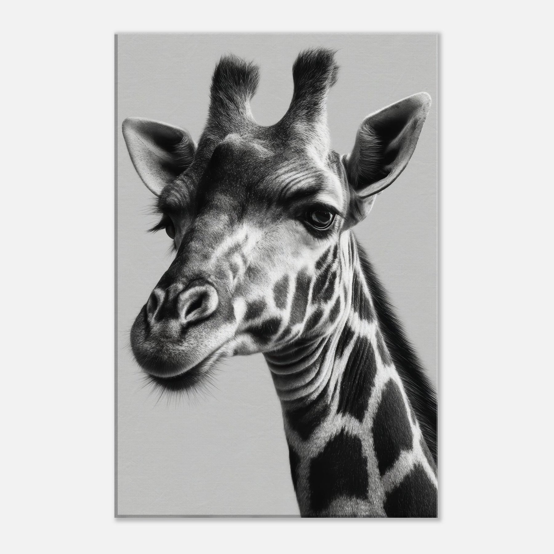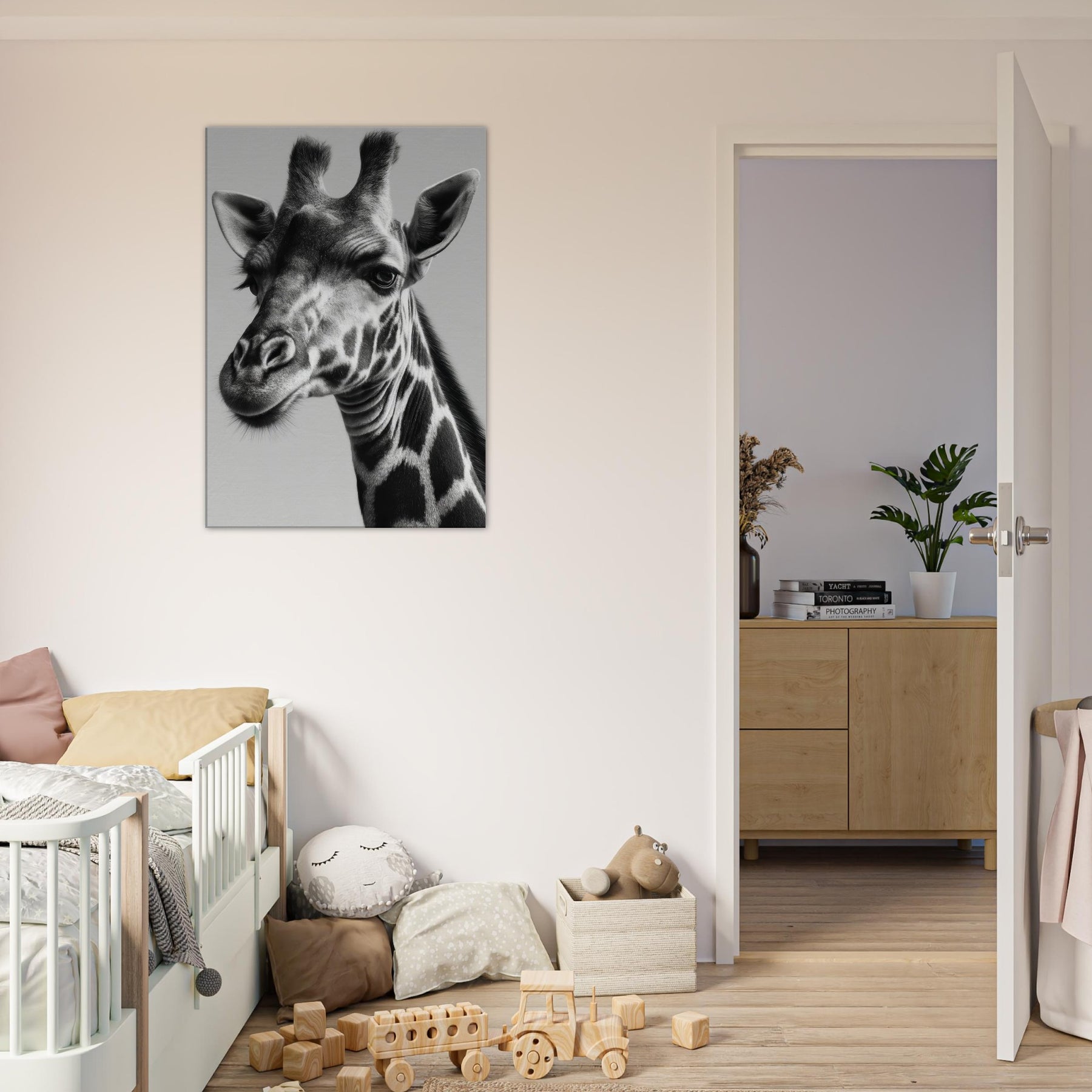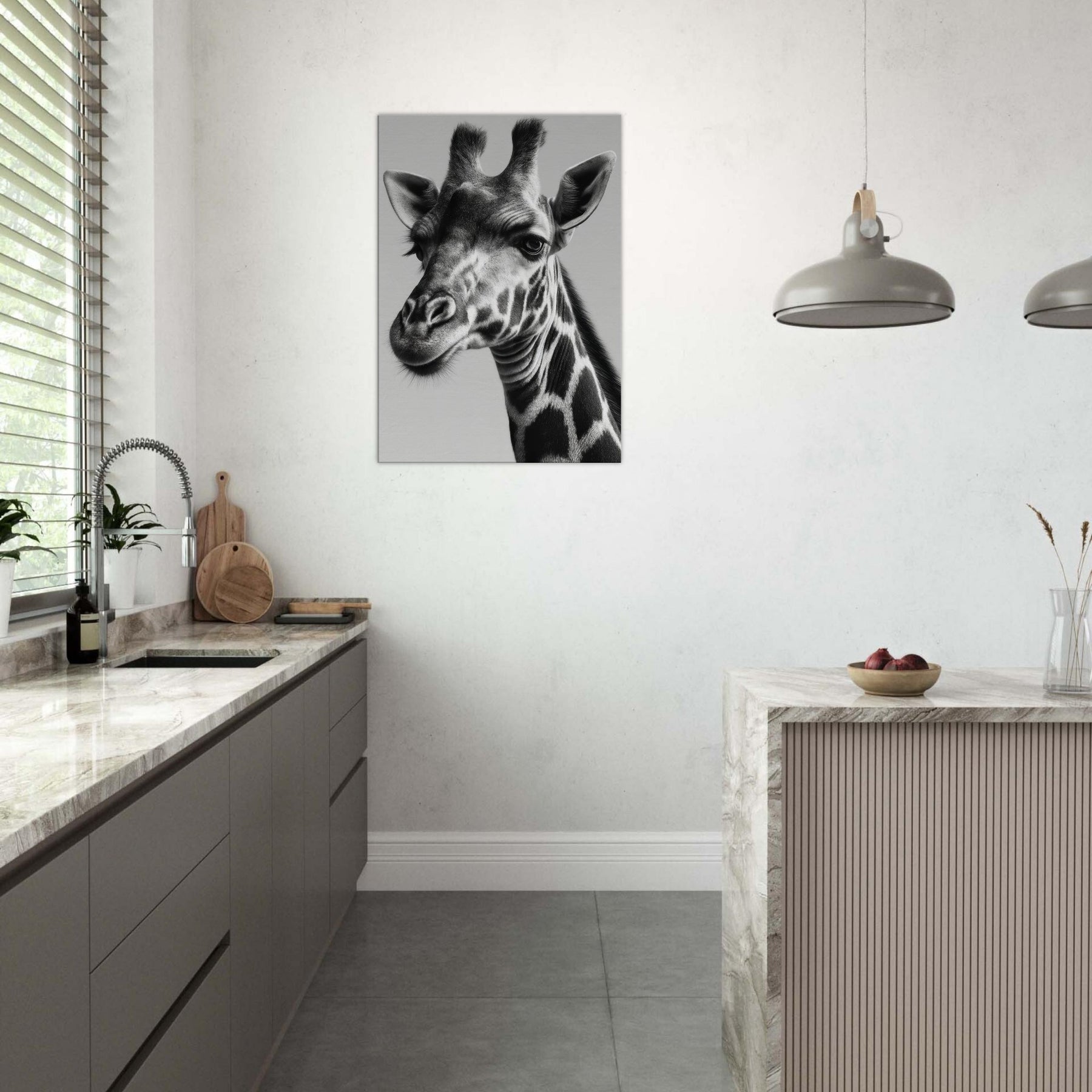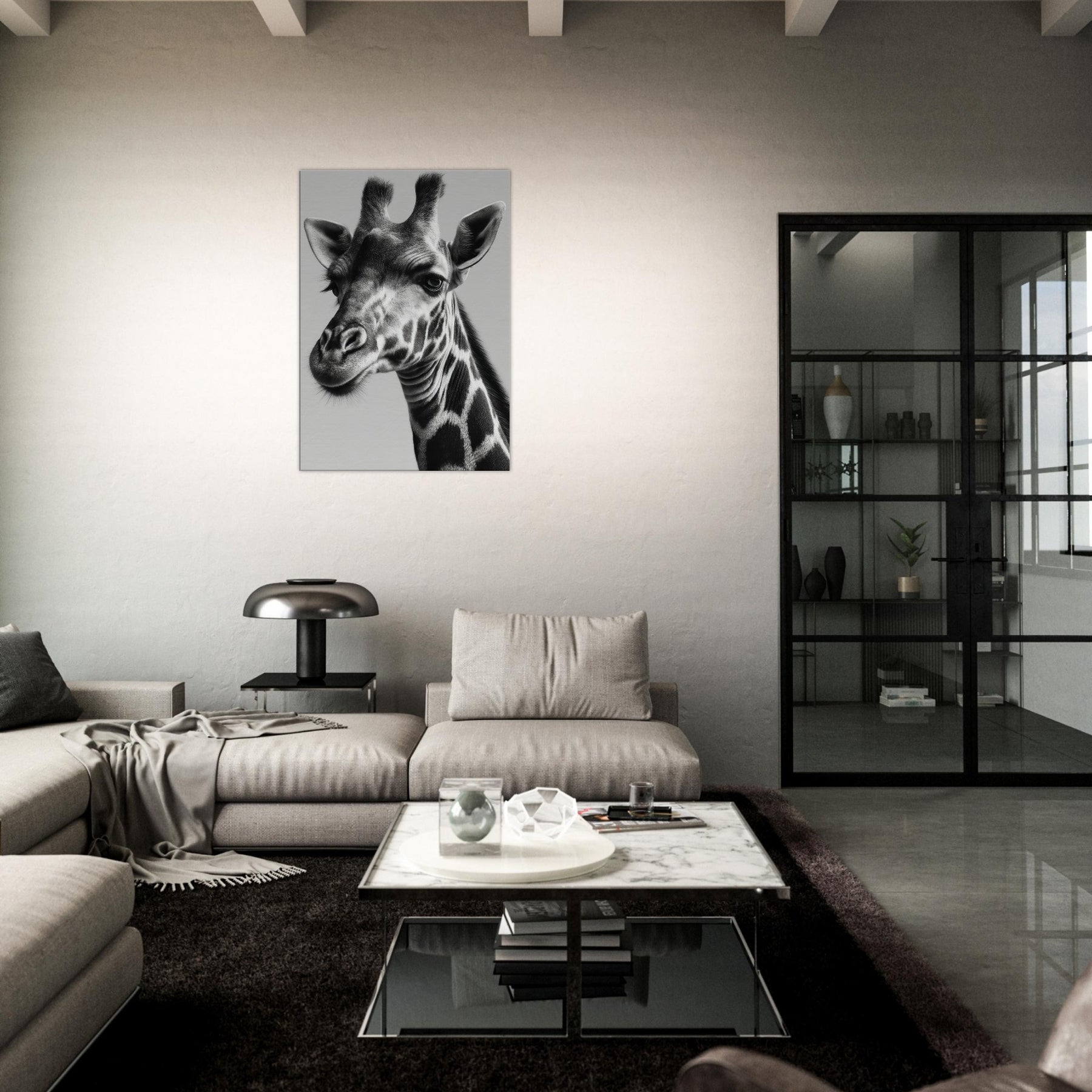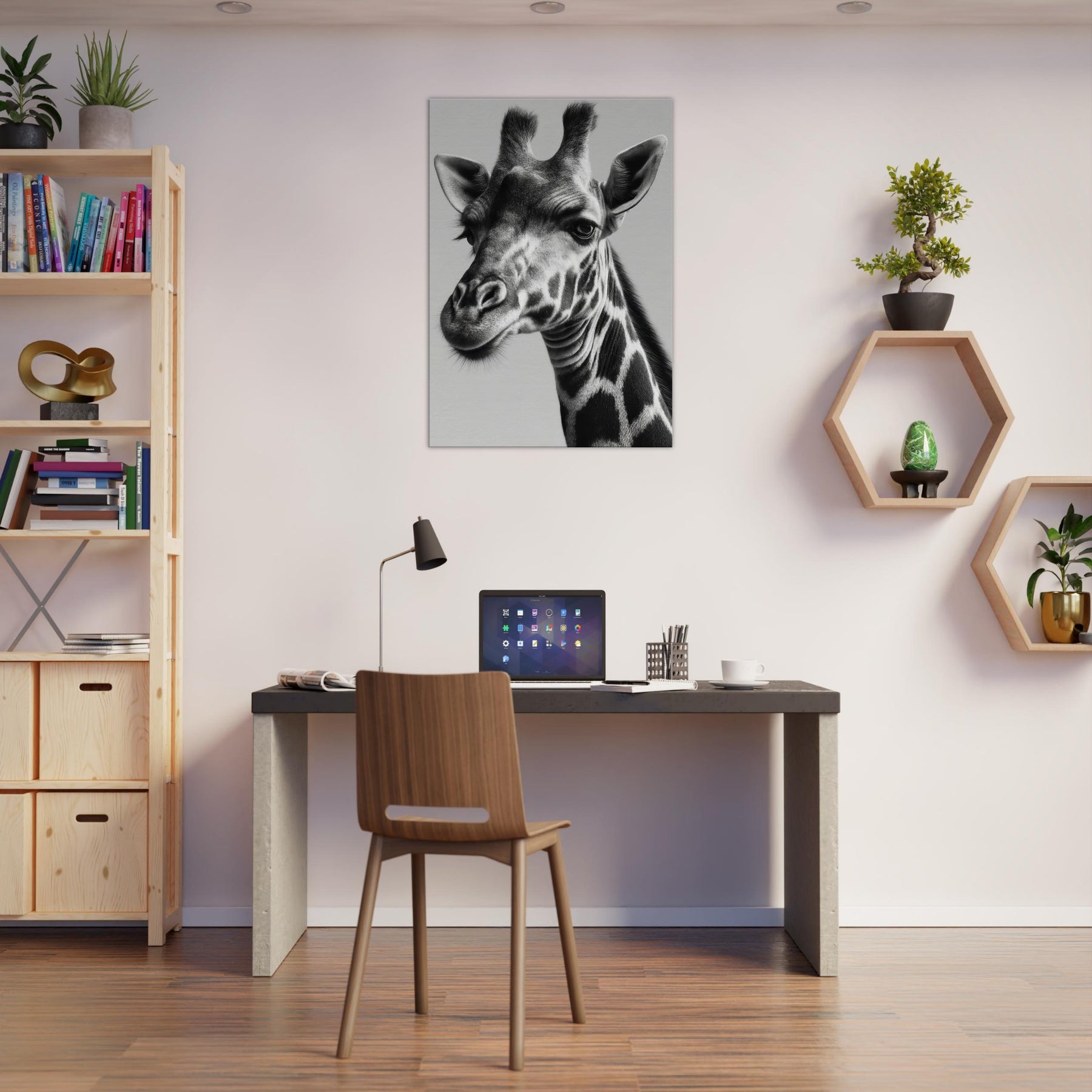 Immerse your space in the quiet grandeur of a monochrome moment. This black and white captures a giraffe in timeless stillness, where line and texture become poetry, and light suggests a gallery hush.