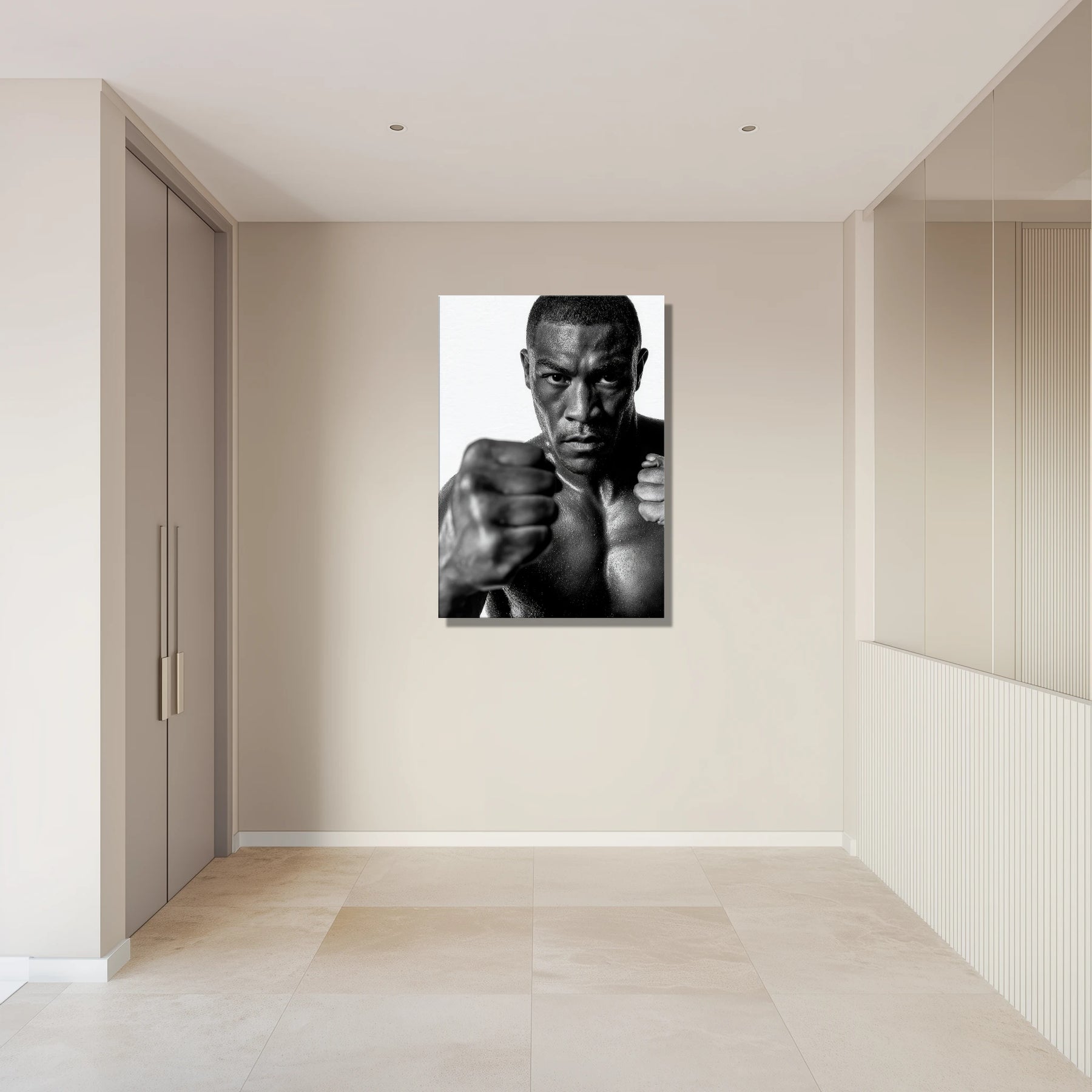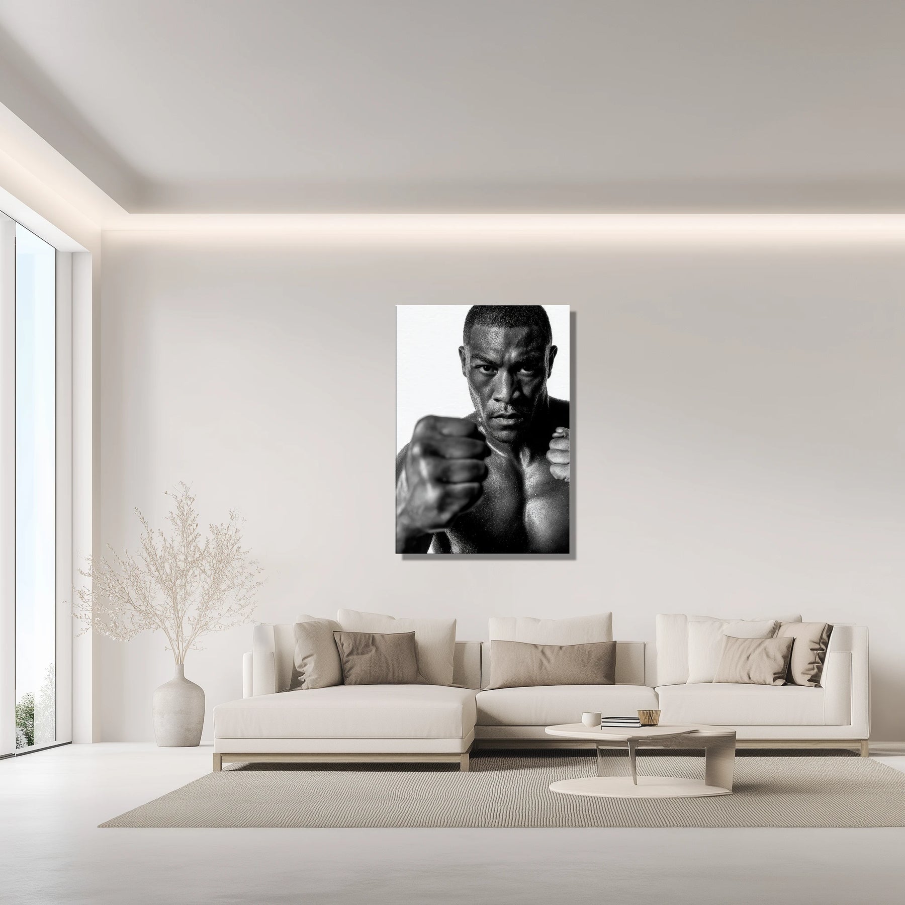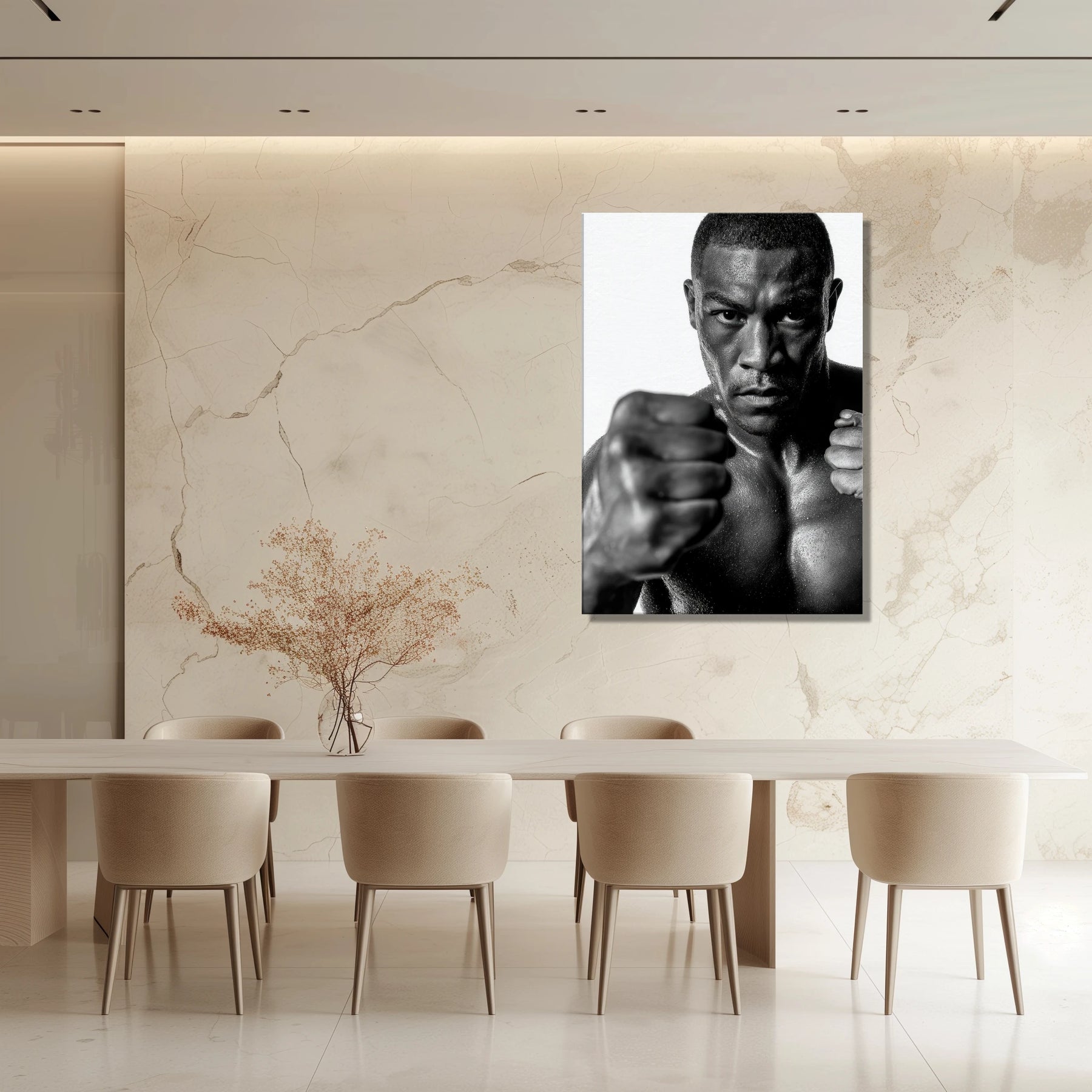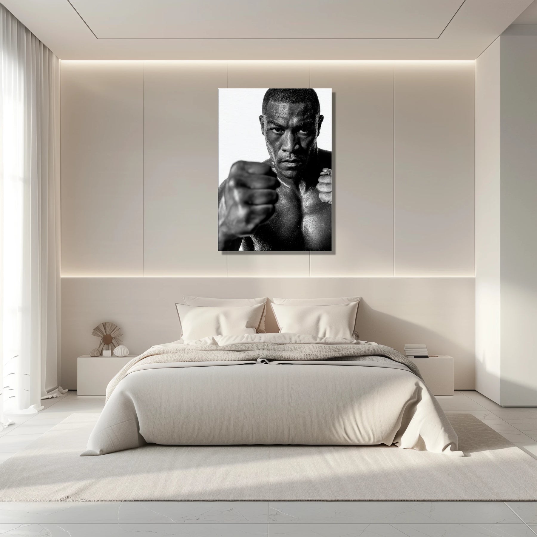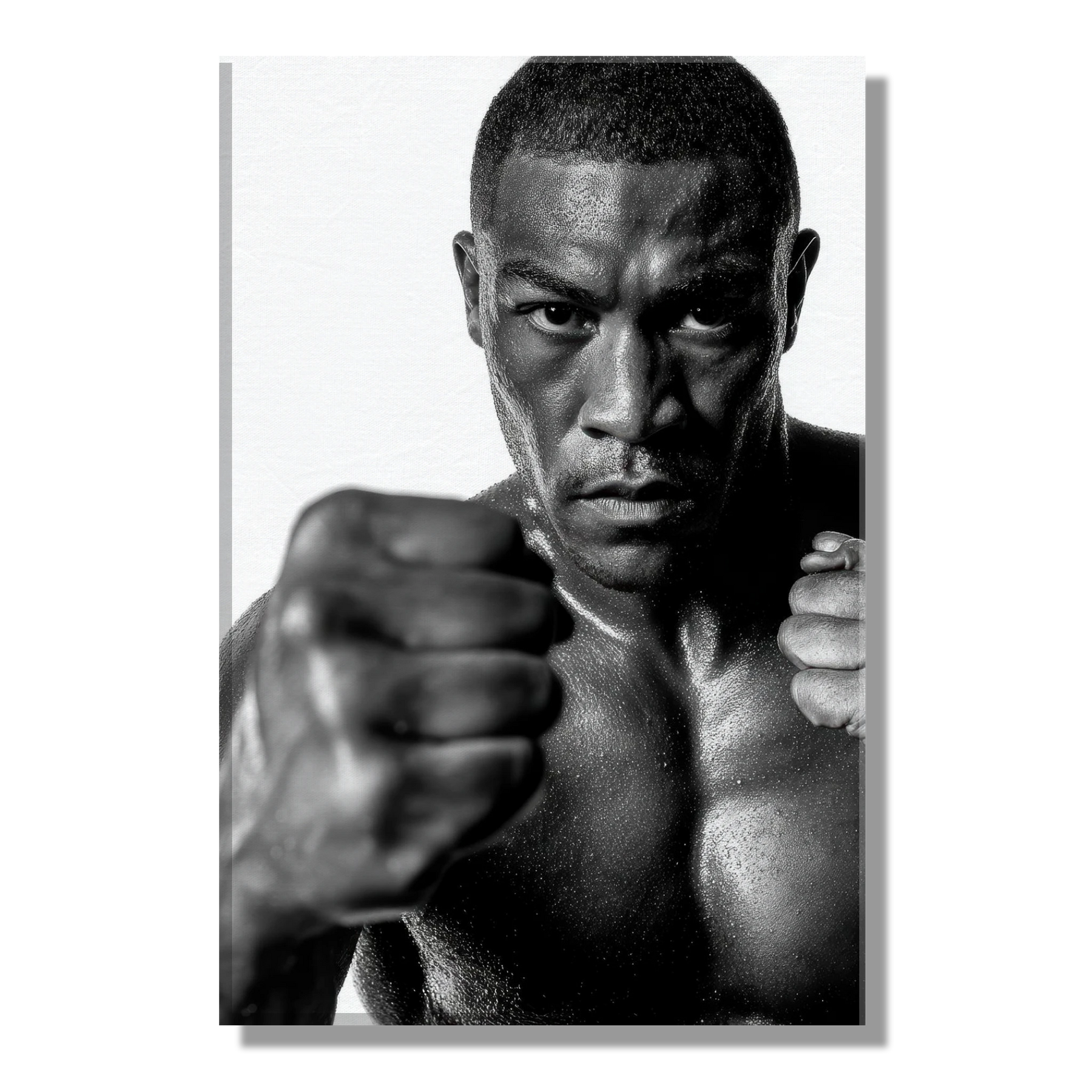 An intense study of focus and force, this black and white image captures the Boxer Guard Stance with quiet gravity. The high contrast lighting slices the muscles into ribbons of light and shadow, turning motion into stillness.