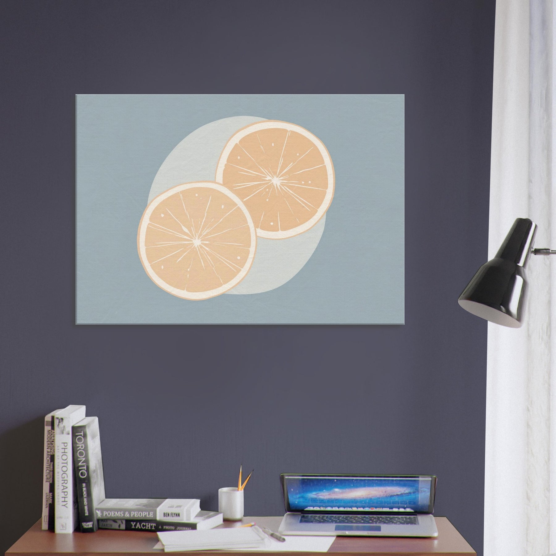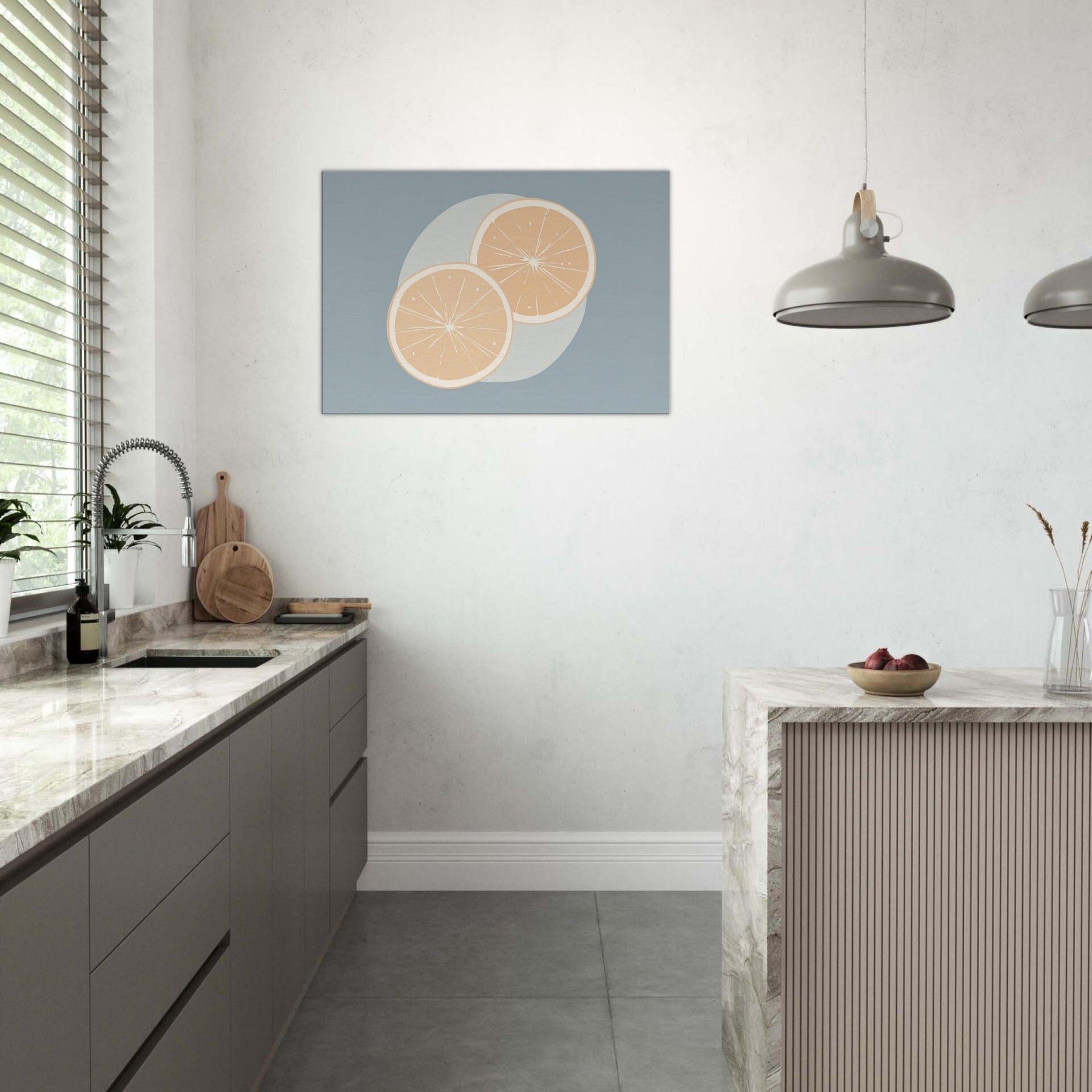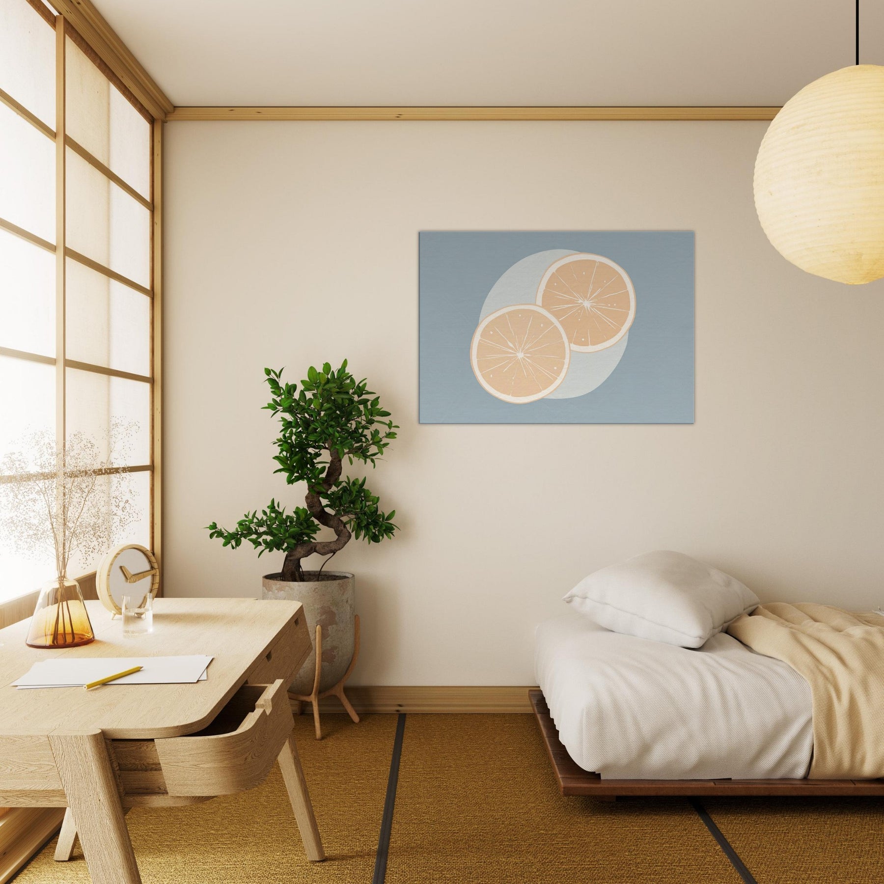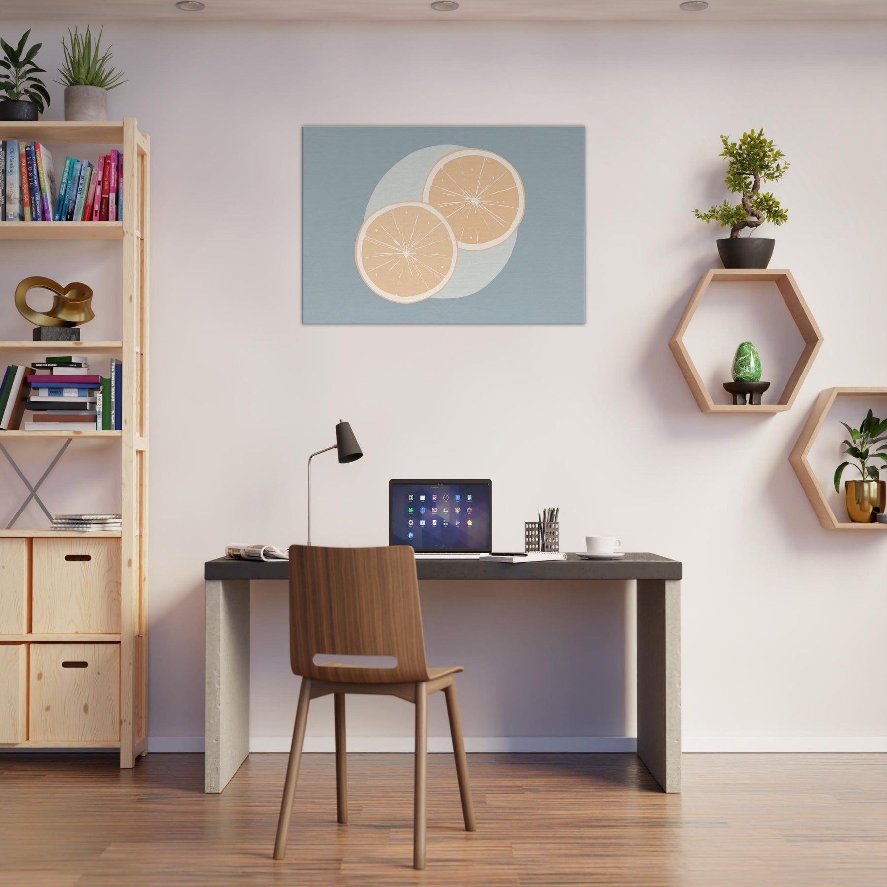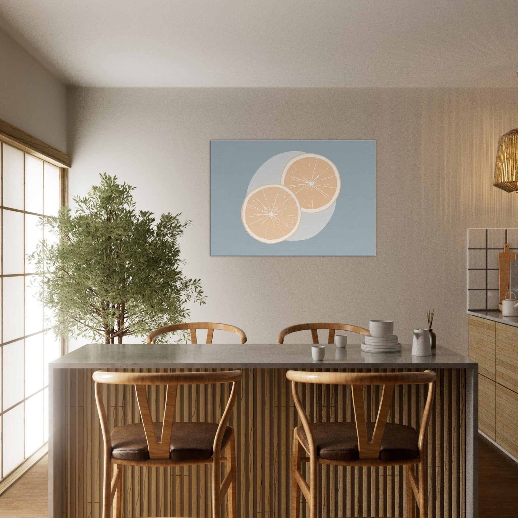 Fluid, clean lines render Citrus Halves as a gentle emblem of everyday brightness. The soft peach tones hover on a cool blue canvas, paired with a muted circular backdrop that anchors the composition. It invites quiet contemplation and a sense of renewal, turning a sunlit corner into a space of calm concentration. Perfect for kitchens, living rooms, or studies, this piece adds a tactile sense of warmth without clutter, letting light and space breathe around it.