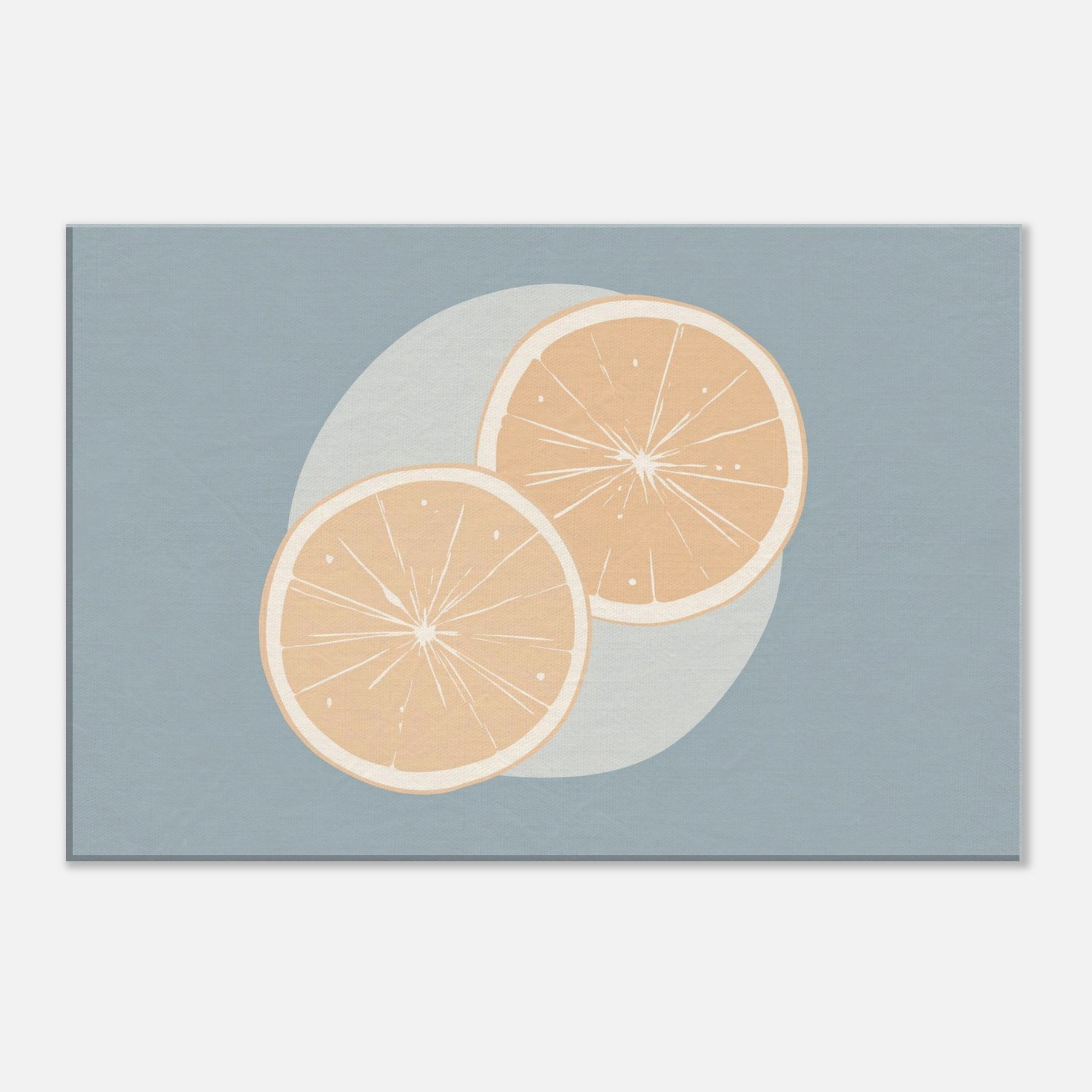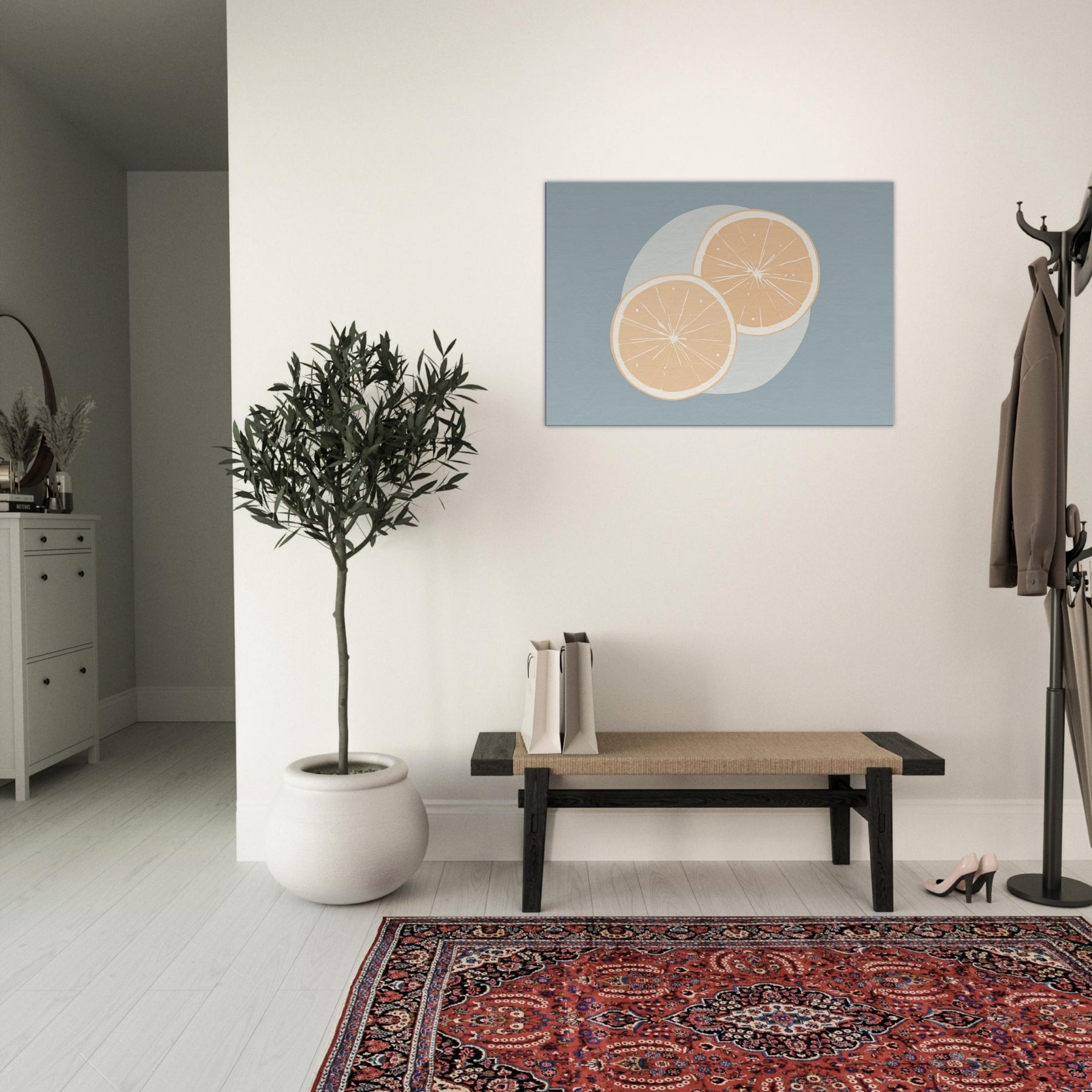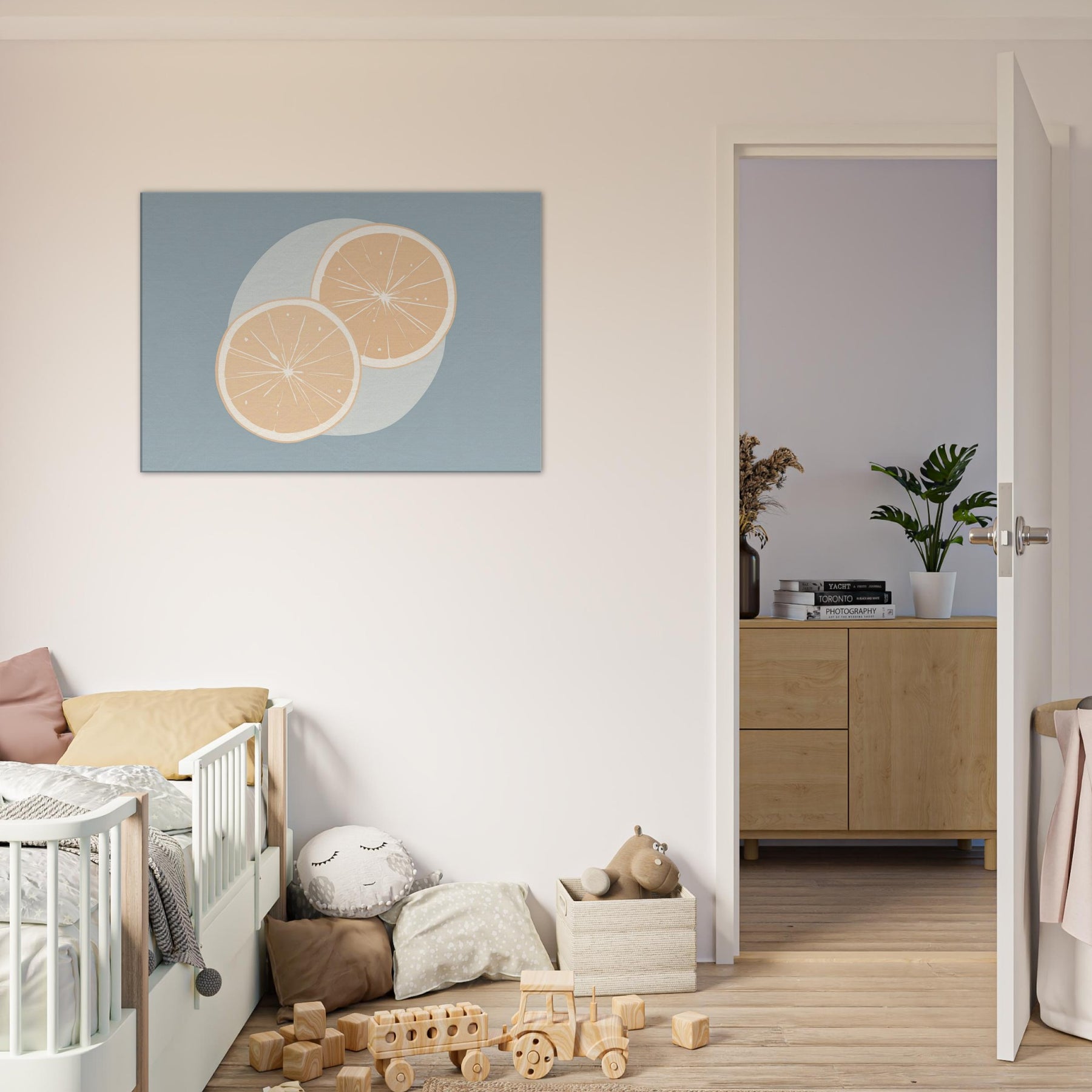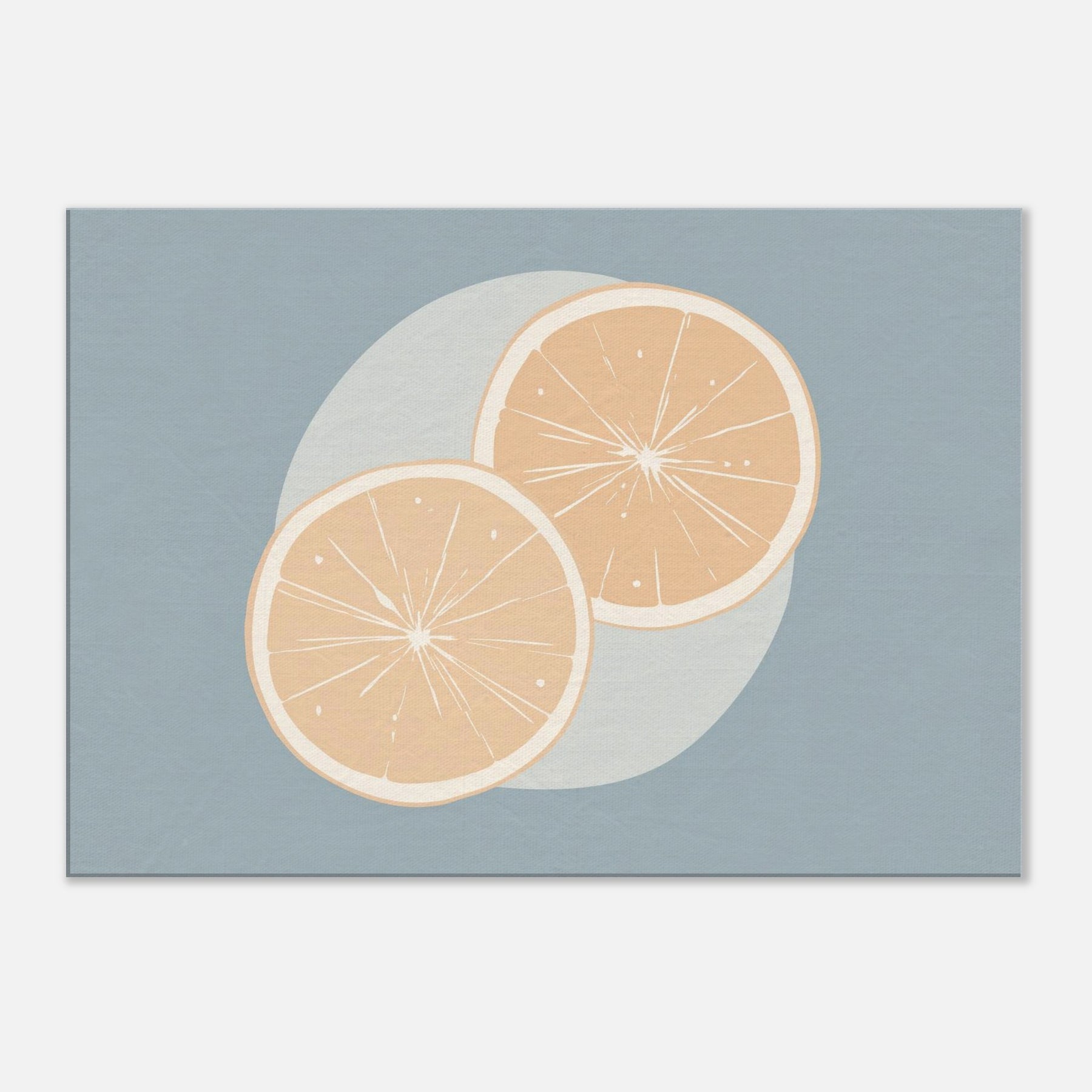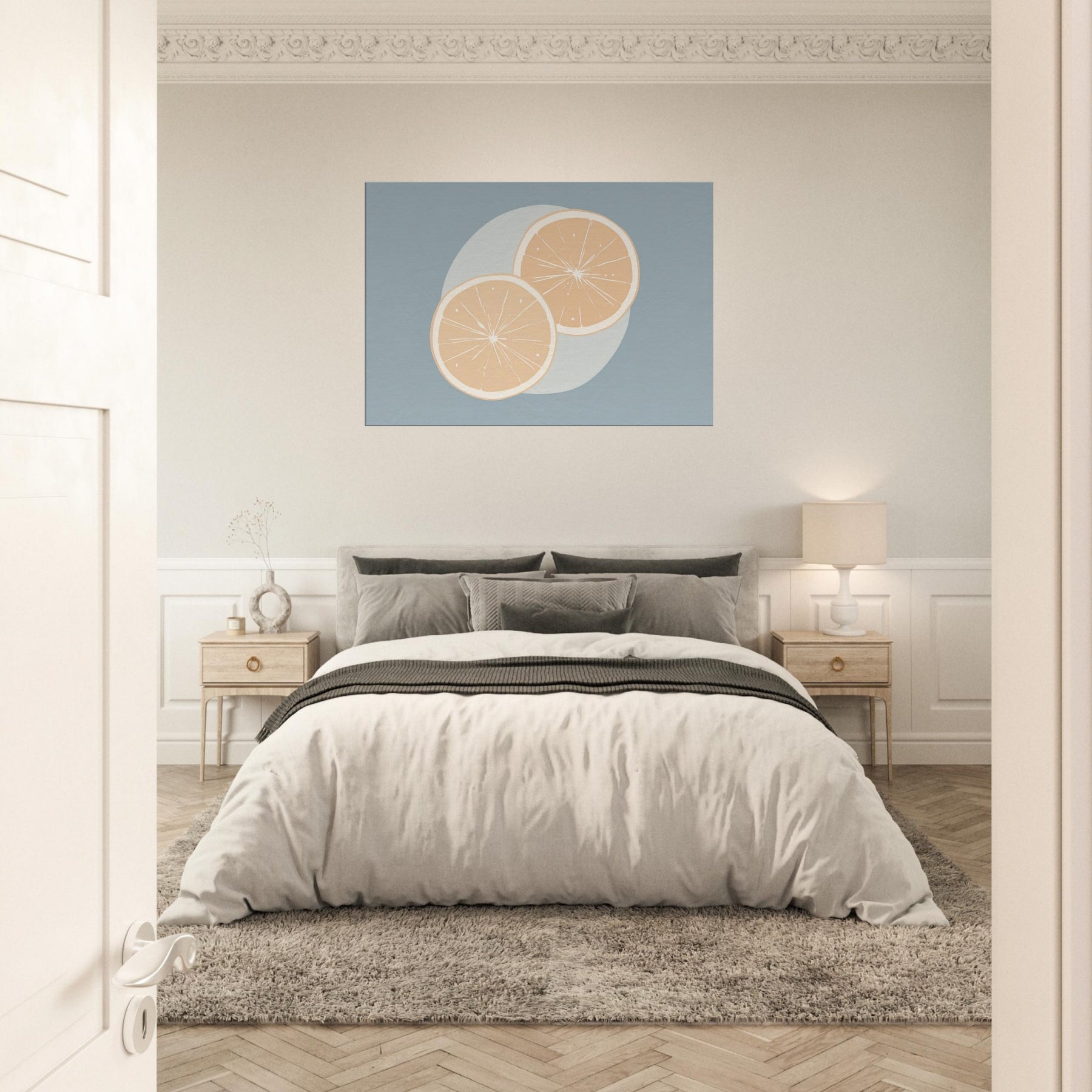 Fluid, clean lines render Citrus Halves as a gentle emblem of everyday brightness. The soft peach tones hover on a cool blue canvas, paired with a muted circular backdrop that anchors the composition. It invites quiet contemplation and a sense of renewal, turning a sunlit corner into a space of calm concentration. Perfect for kitchens, living rooms, or studies, this piece adds a tactile sense of warmth without clutter, letting light and space breathe around it.