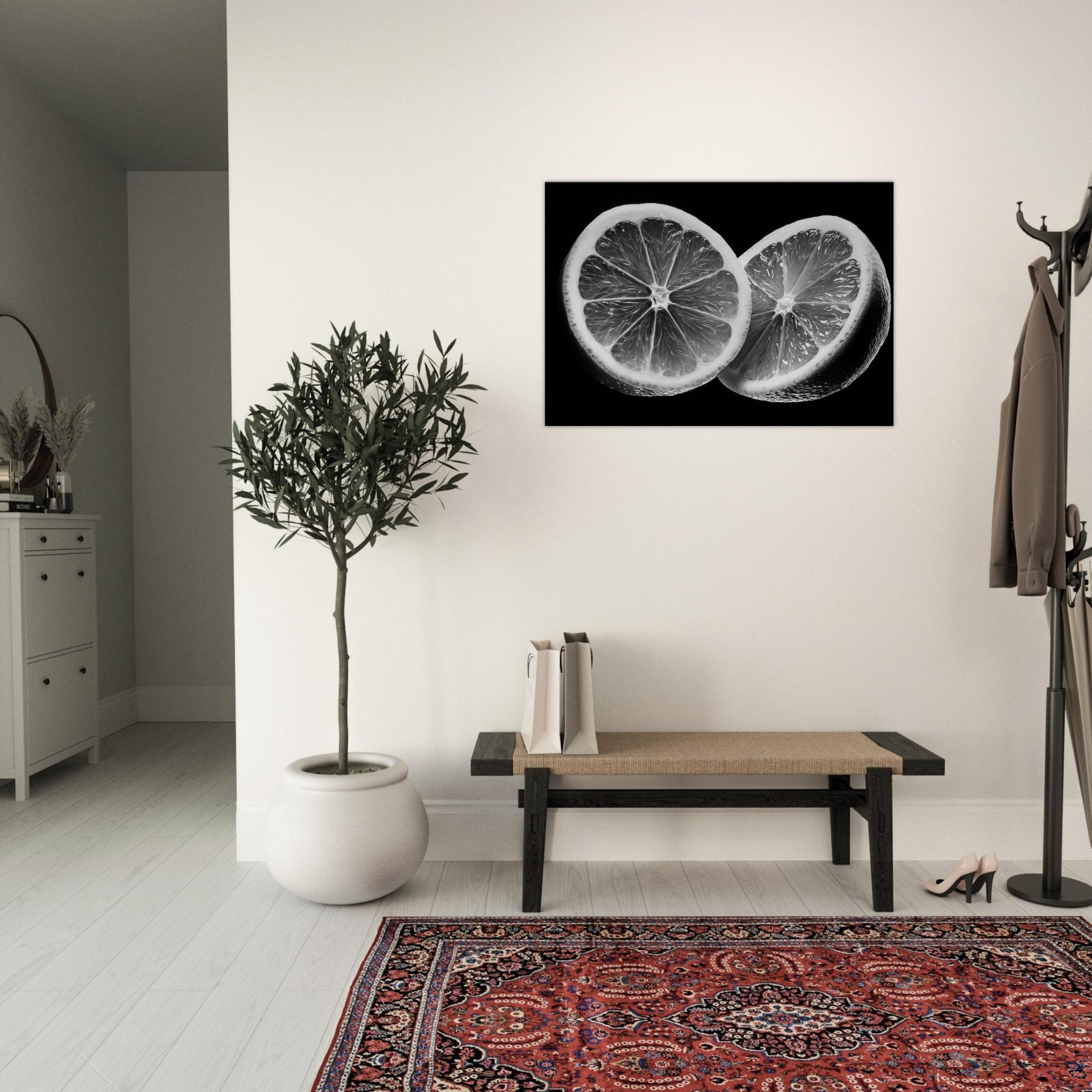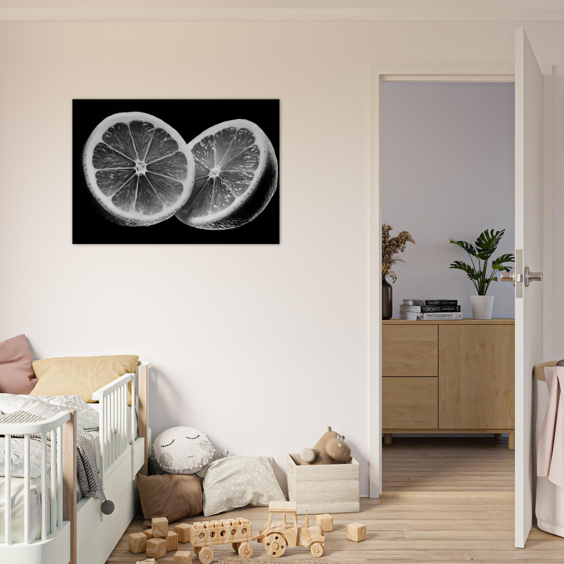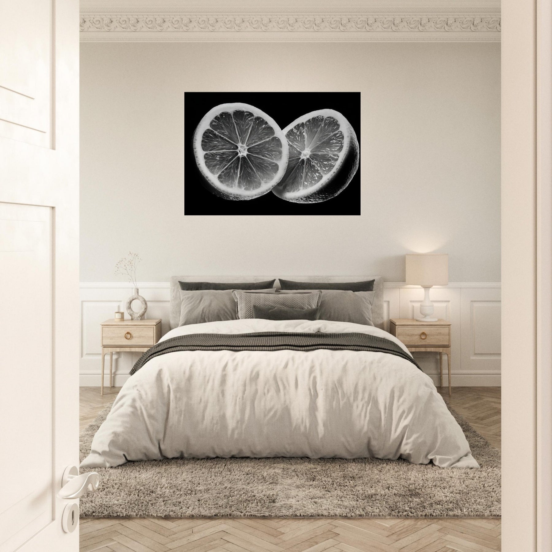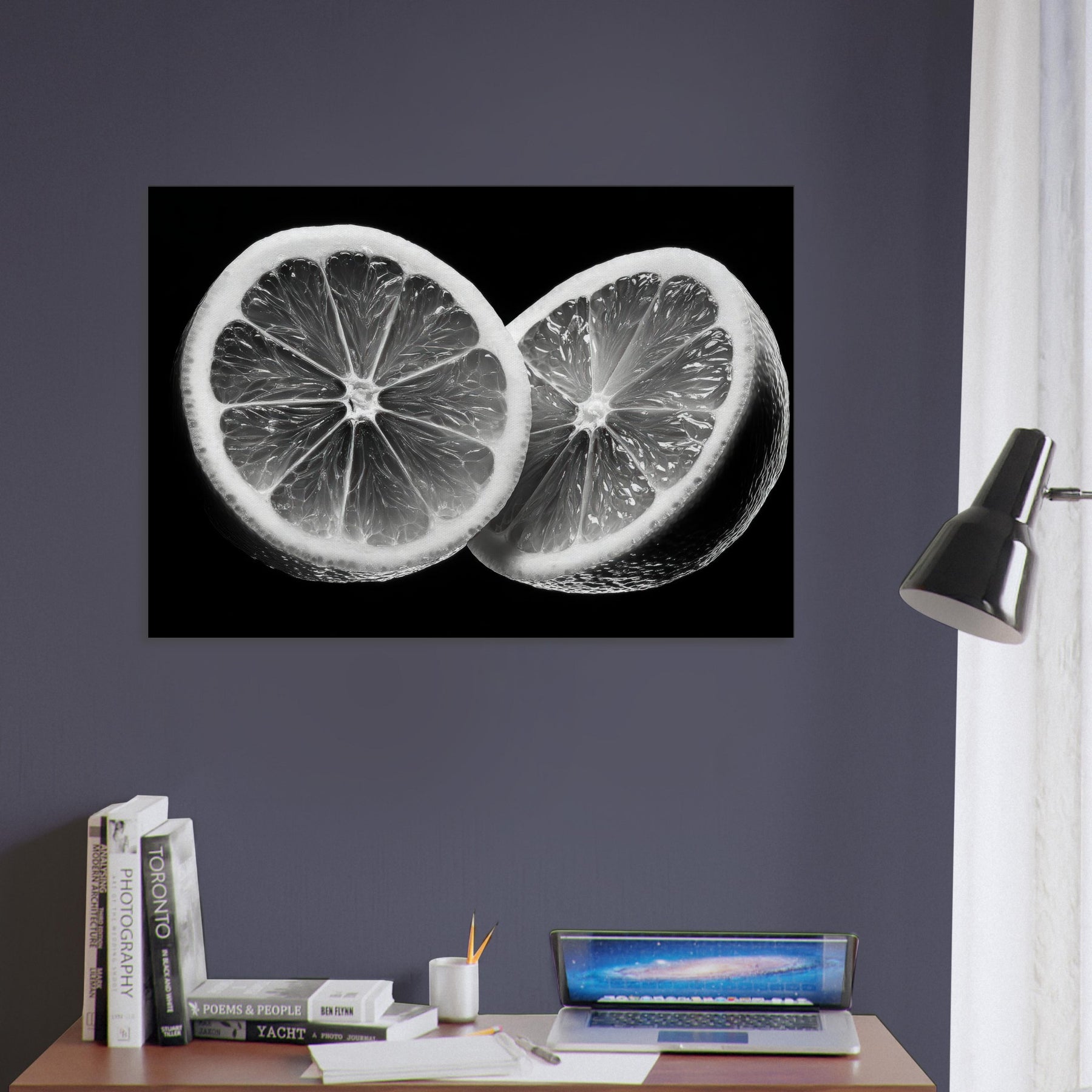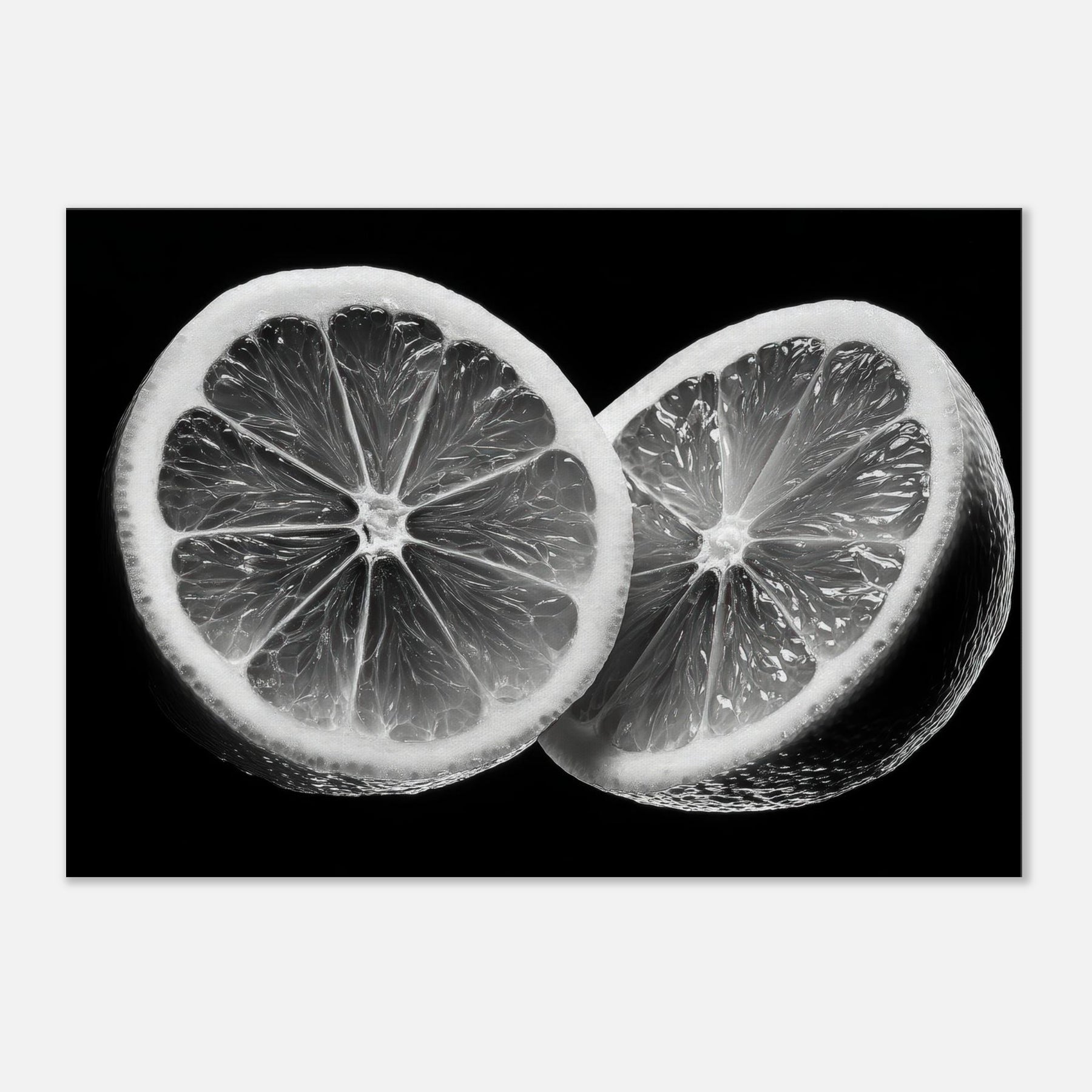 A black and white study, this elegant wall art captures the citrus tension between gloss and shadow. The close up slices reveal translucent membranes and radiant zest, arranged as a graphic, icon like still life.