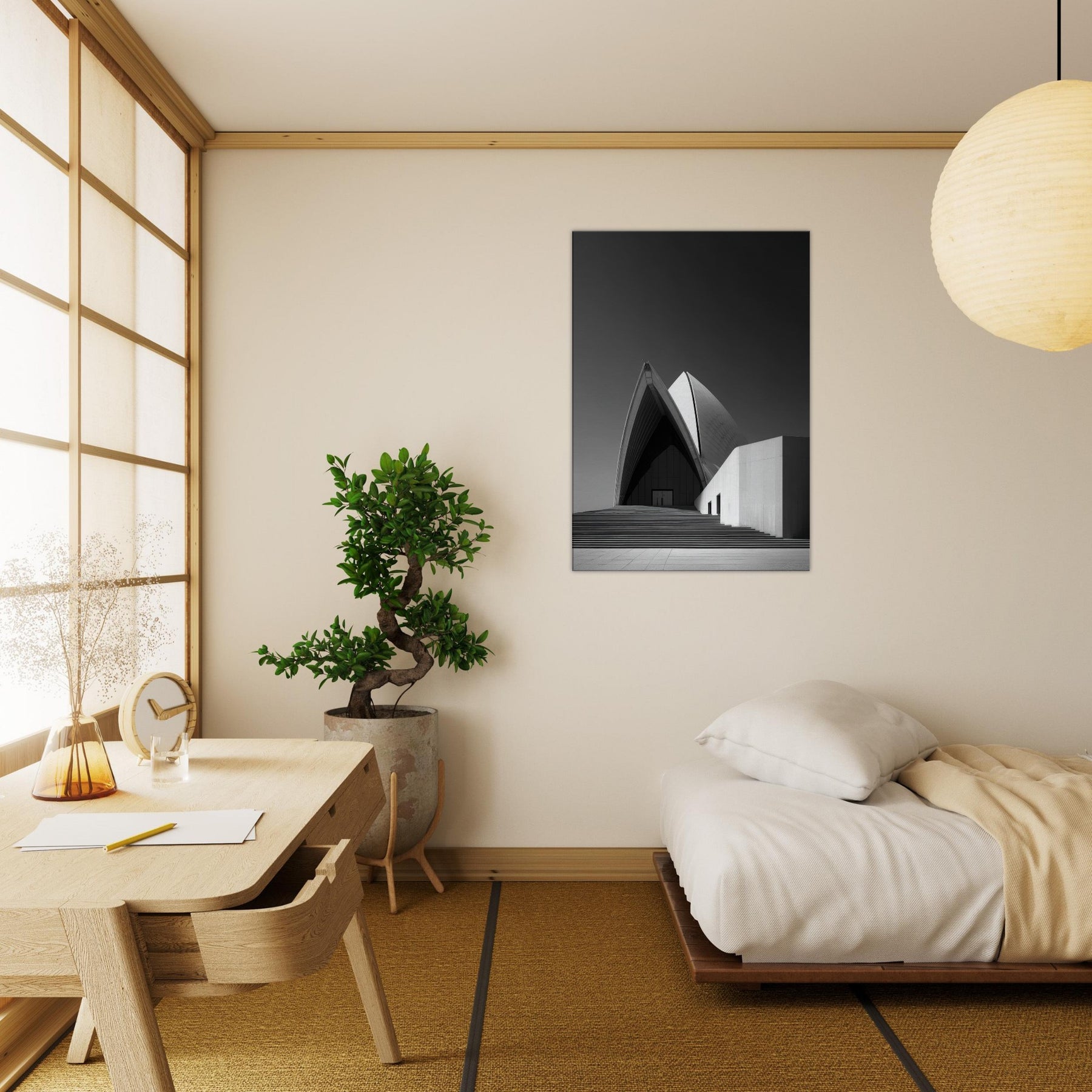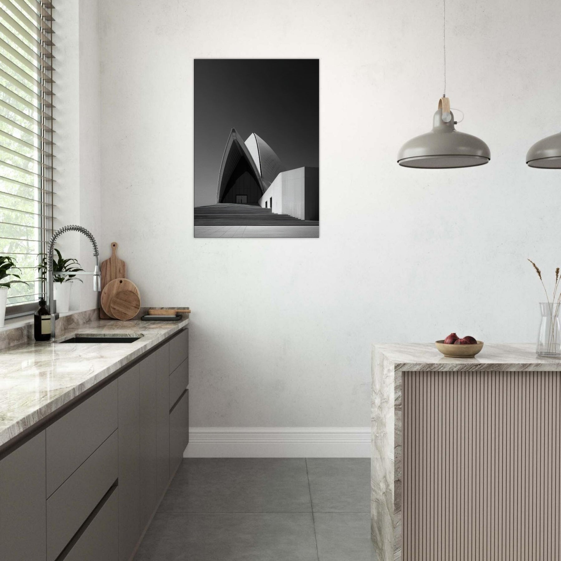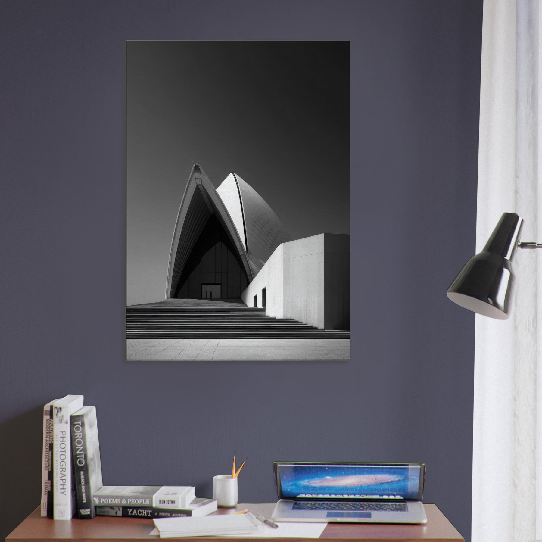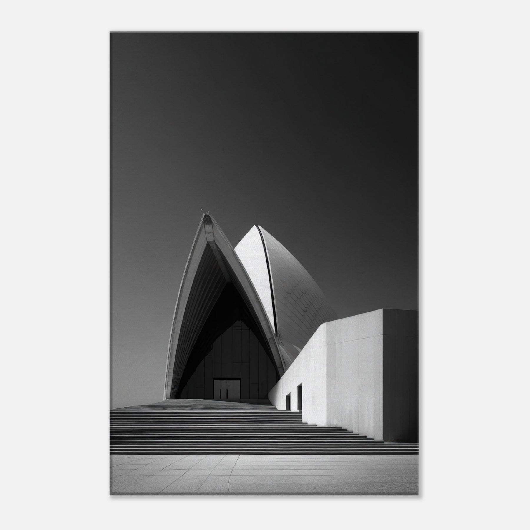 Drawn in stark black and white, this image of the Sydney Opera House distills movement into stillness. The arcing shell echoes like a tide of light, inviting calm and focus in any room.