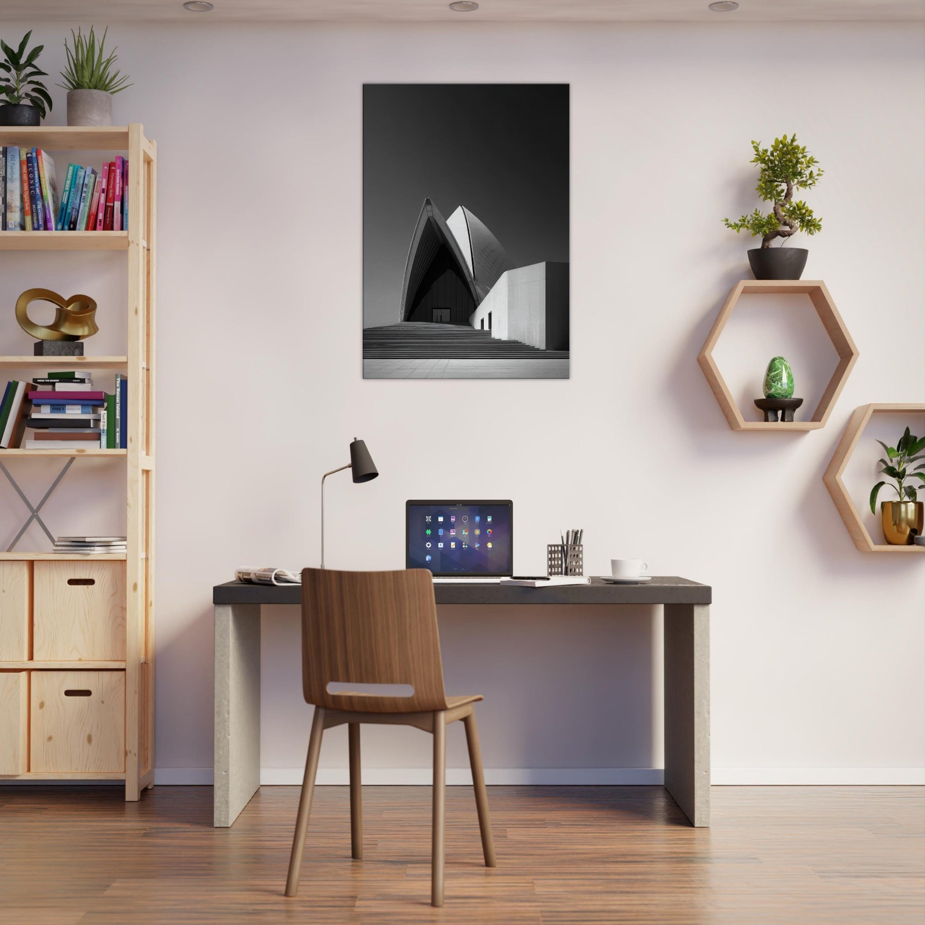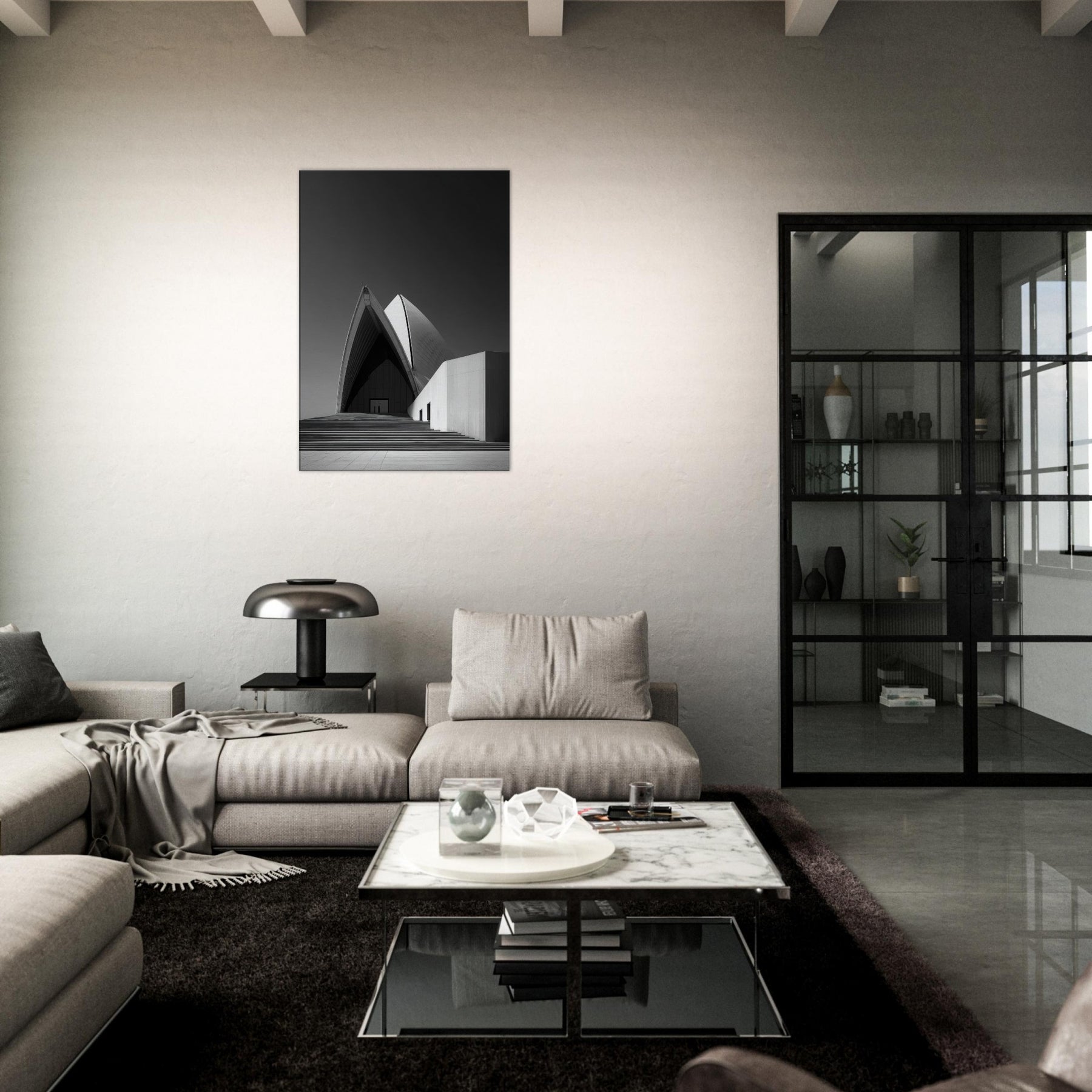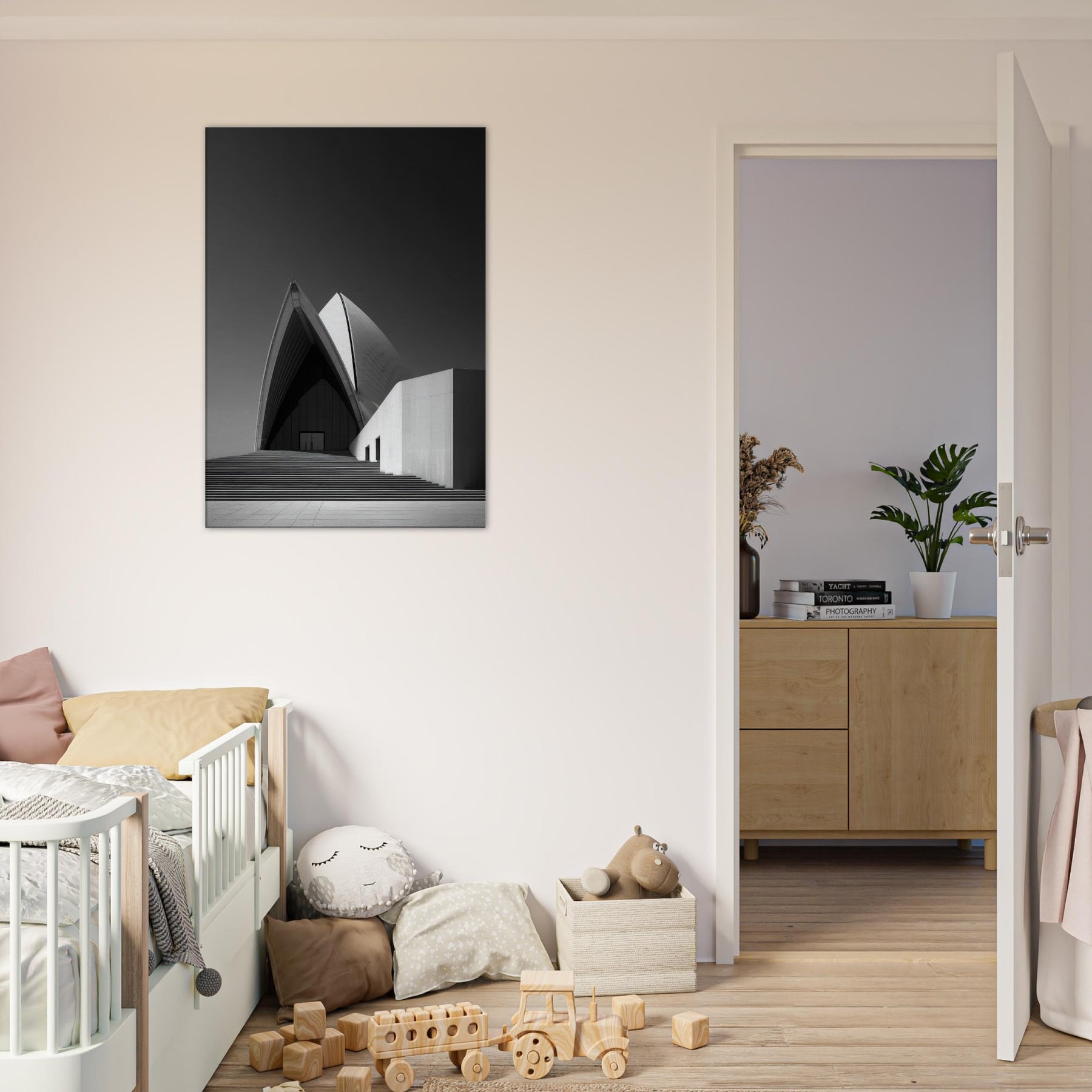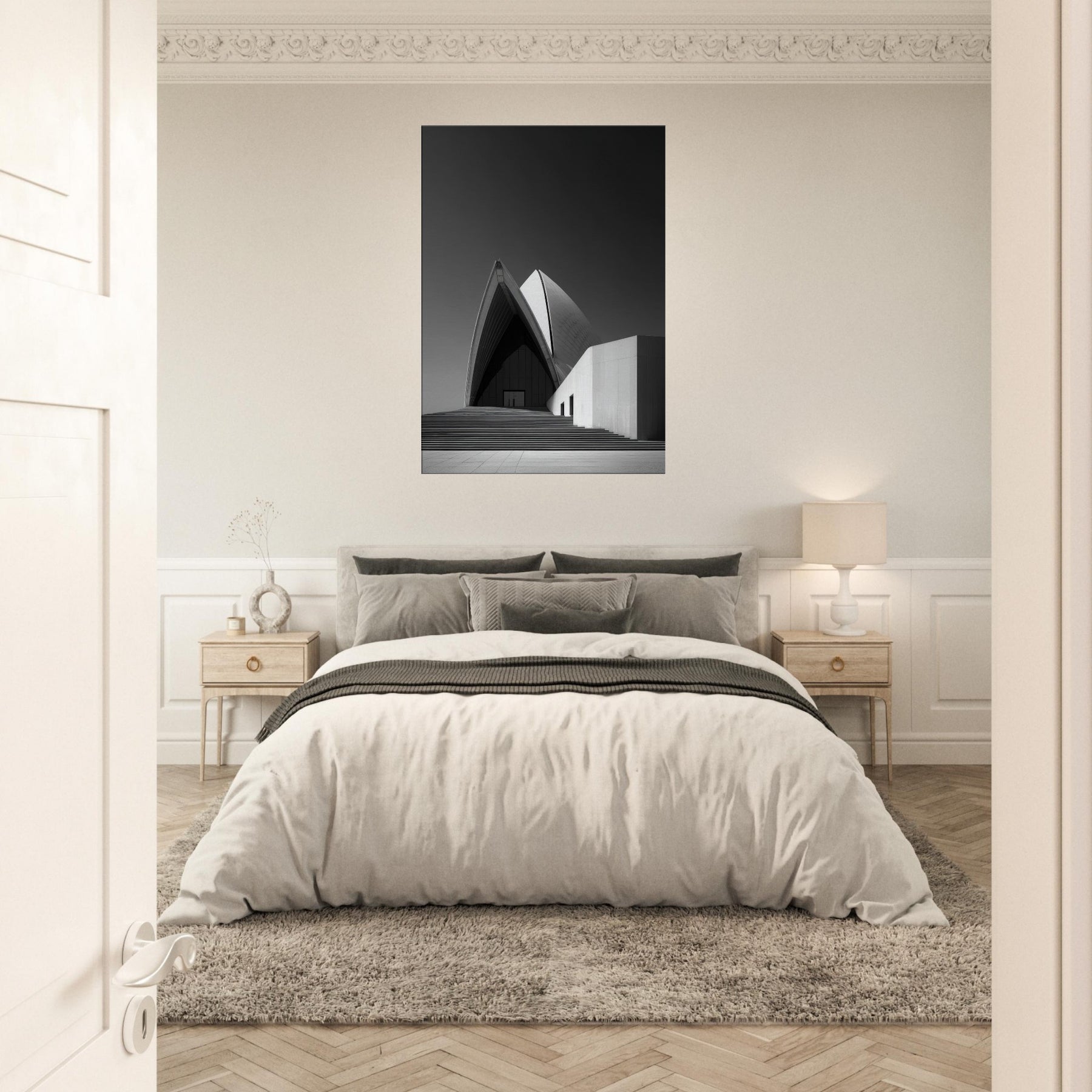 Drawn in stark black and white, this image of the Sydney Opera House distills movement into stillness. The arcing shell echoes like a tide of light, inviting calm and focus in any room.
