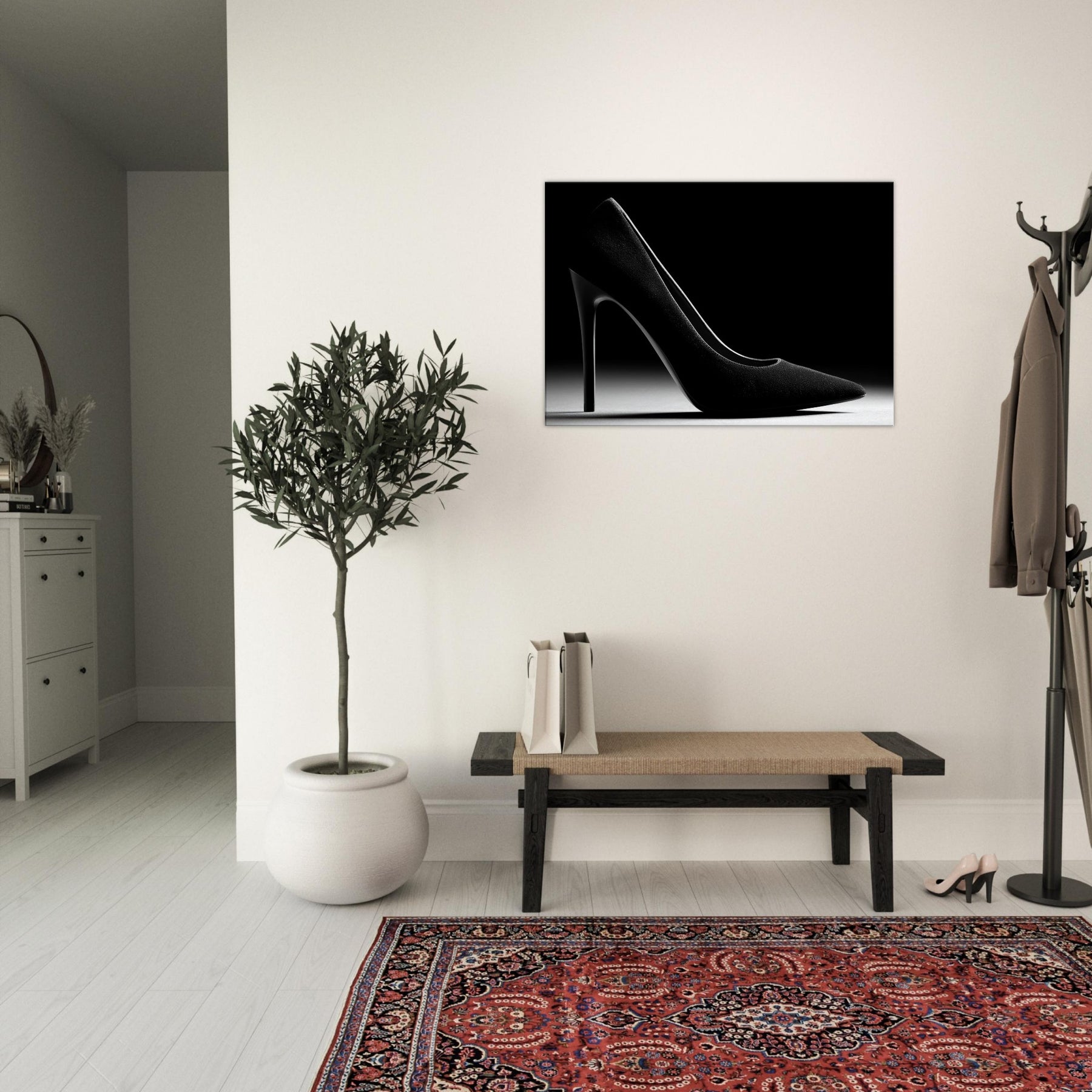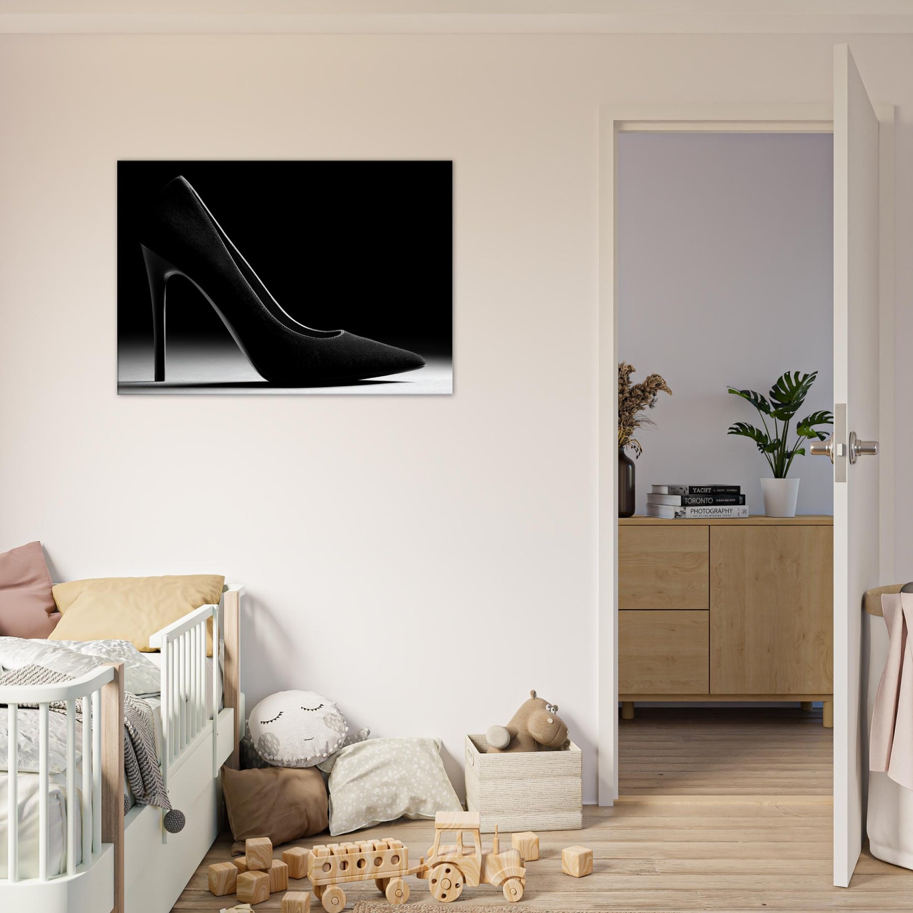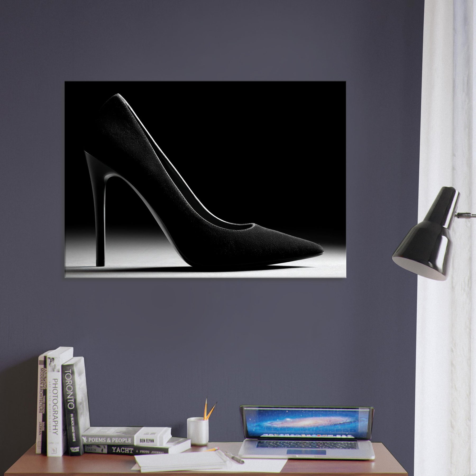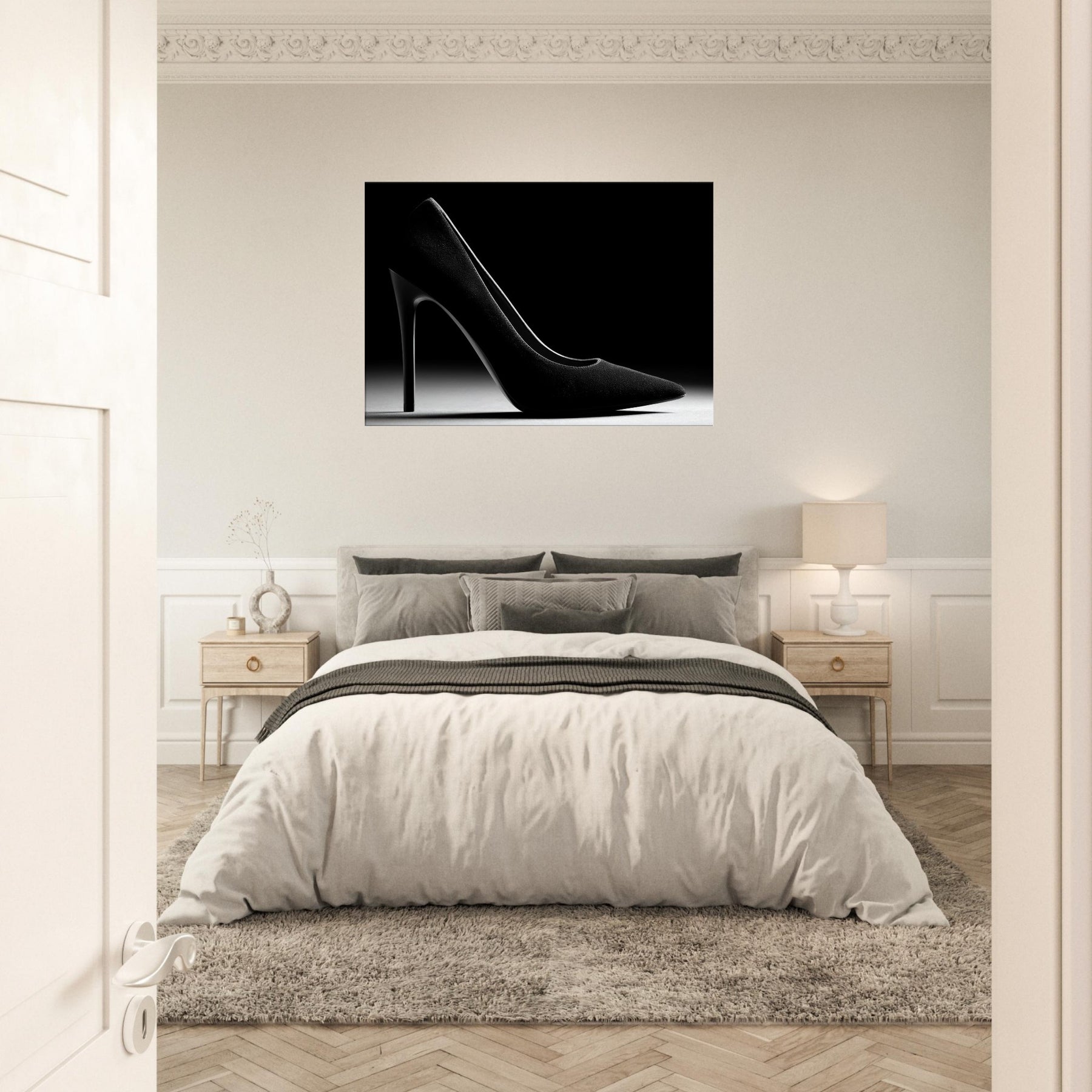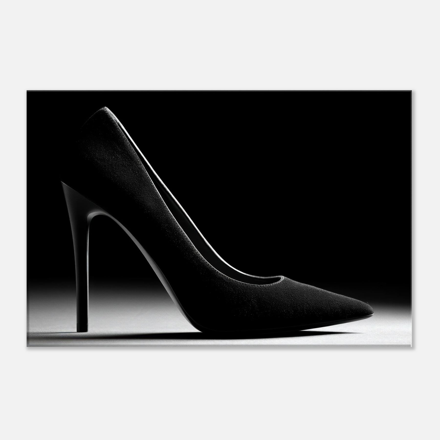An arresting silhouette, this high heel leans into the light as if about to stride into the room. In stark black and white, every curve catches a whisper of shadow, turning a common object into a sculptural moment. The gleam along the edge suggests luxury and precision, a reminder that style can be serene. Hang it where drama meets daily life above a console, in a hall, or beside a minimalist sofa and let the room breathe with confident, effortless chic.