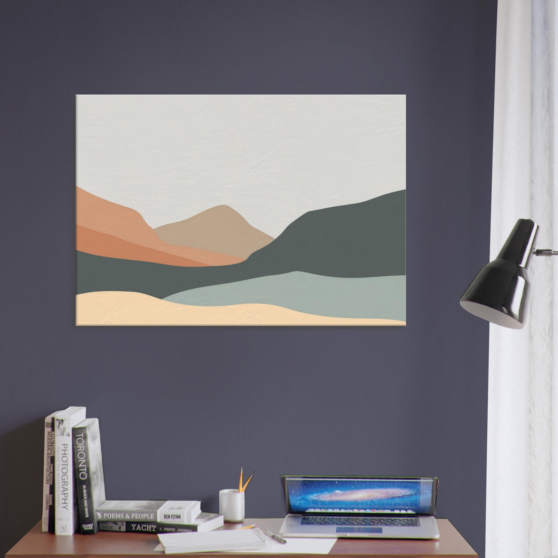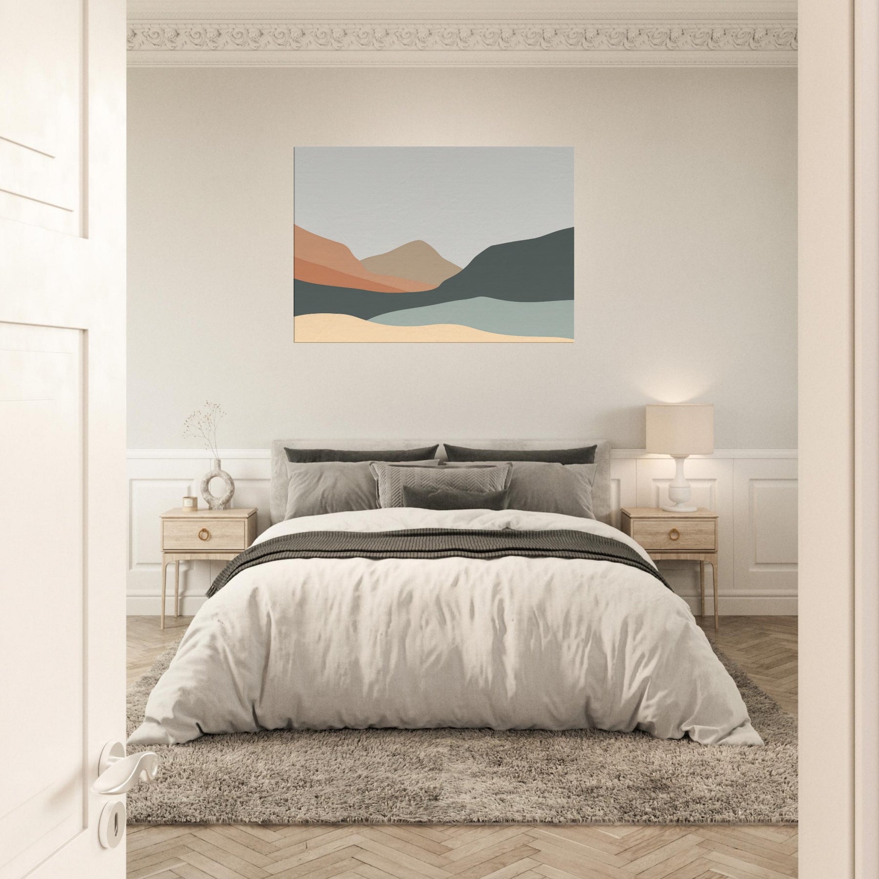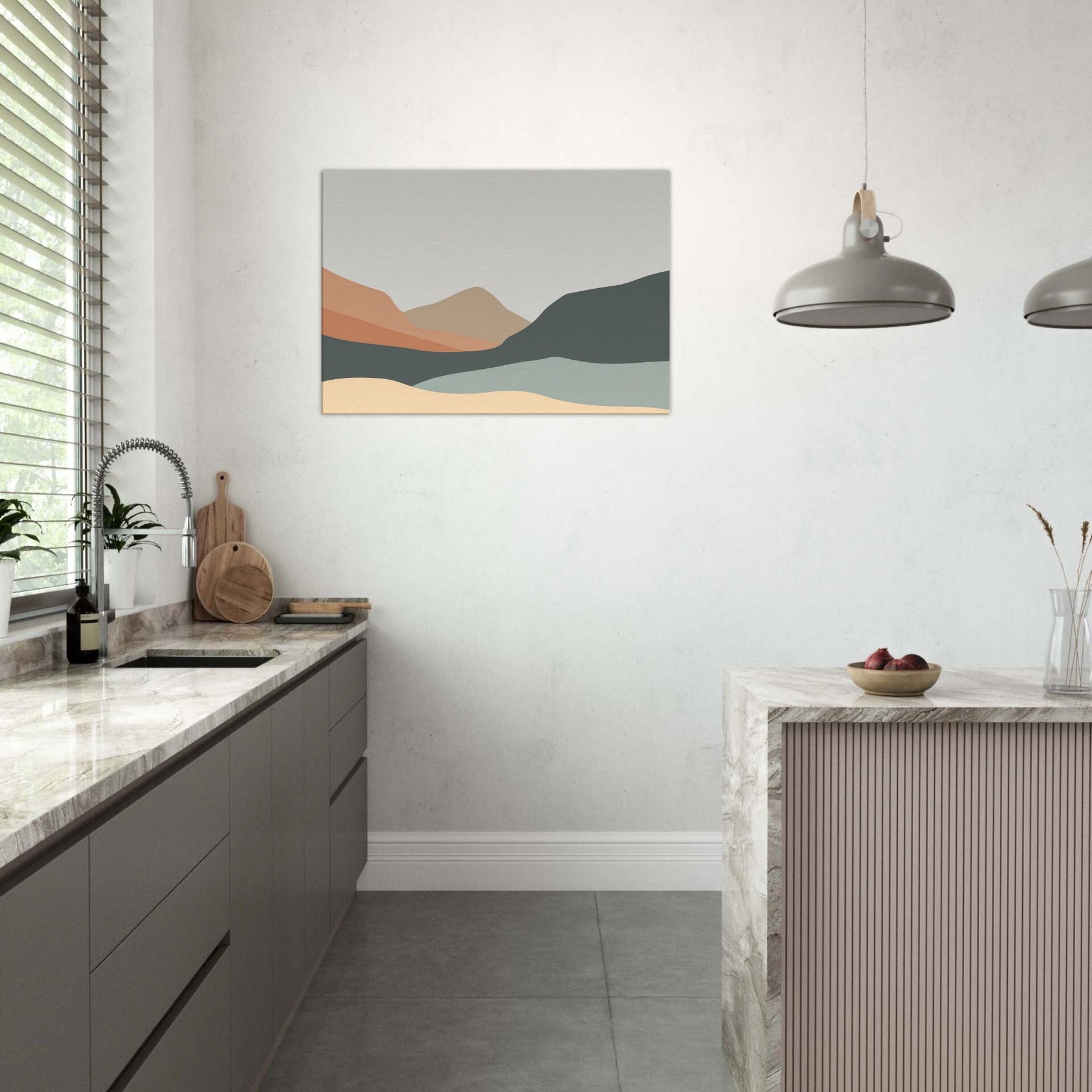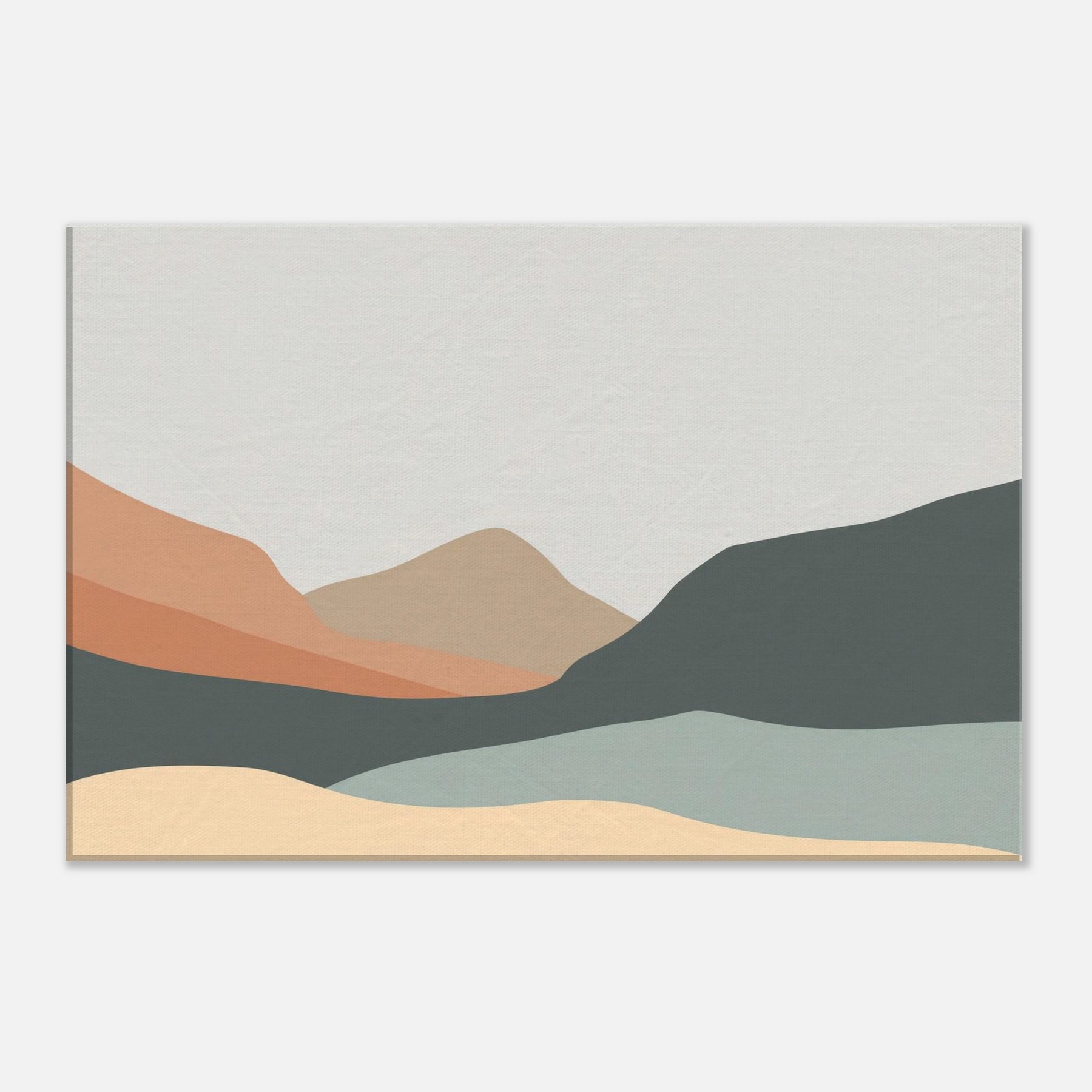 An understated study of distance, this piece reduces the to soft, overlapping silhouettes of Hills in layered earth tones. The palette peach, sand, slate, and pale sage bathes a room in quiet light, guiding the eye along a serene horizon. In a living room or study, the minimalist forms become a calm tonic, inviting contemplation without overpowering existing decor. It creates spaciousness and pairs with natural textures and neutral fabrics, turning walls into a gentle, breathing backdrop.