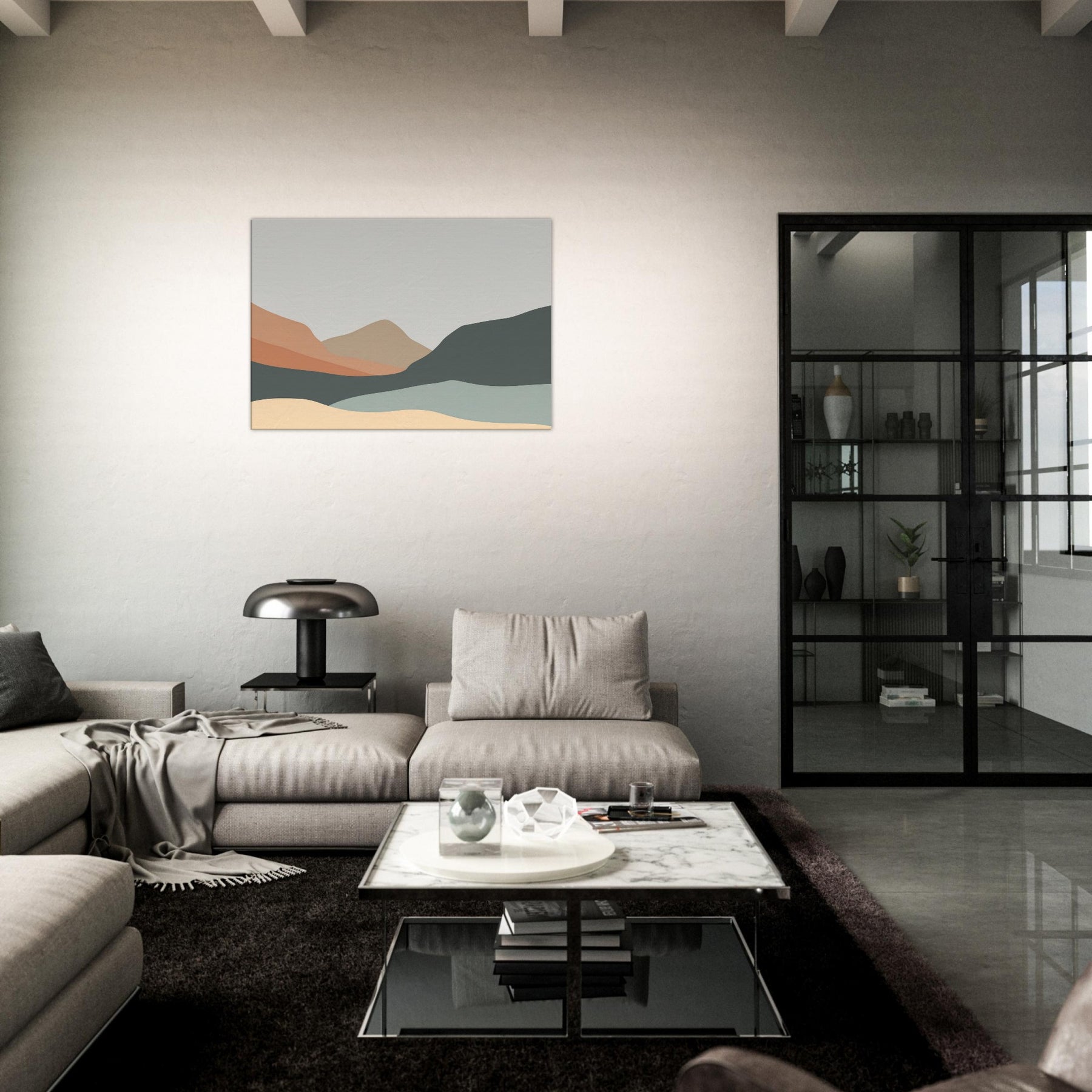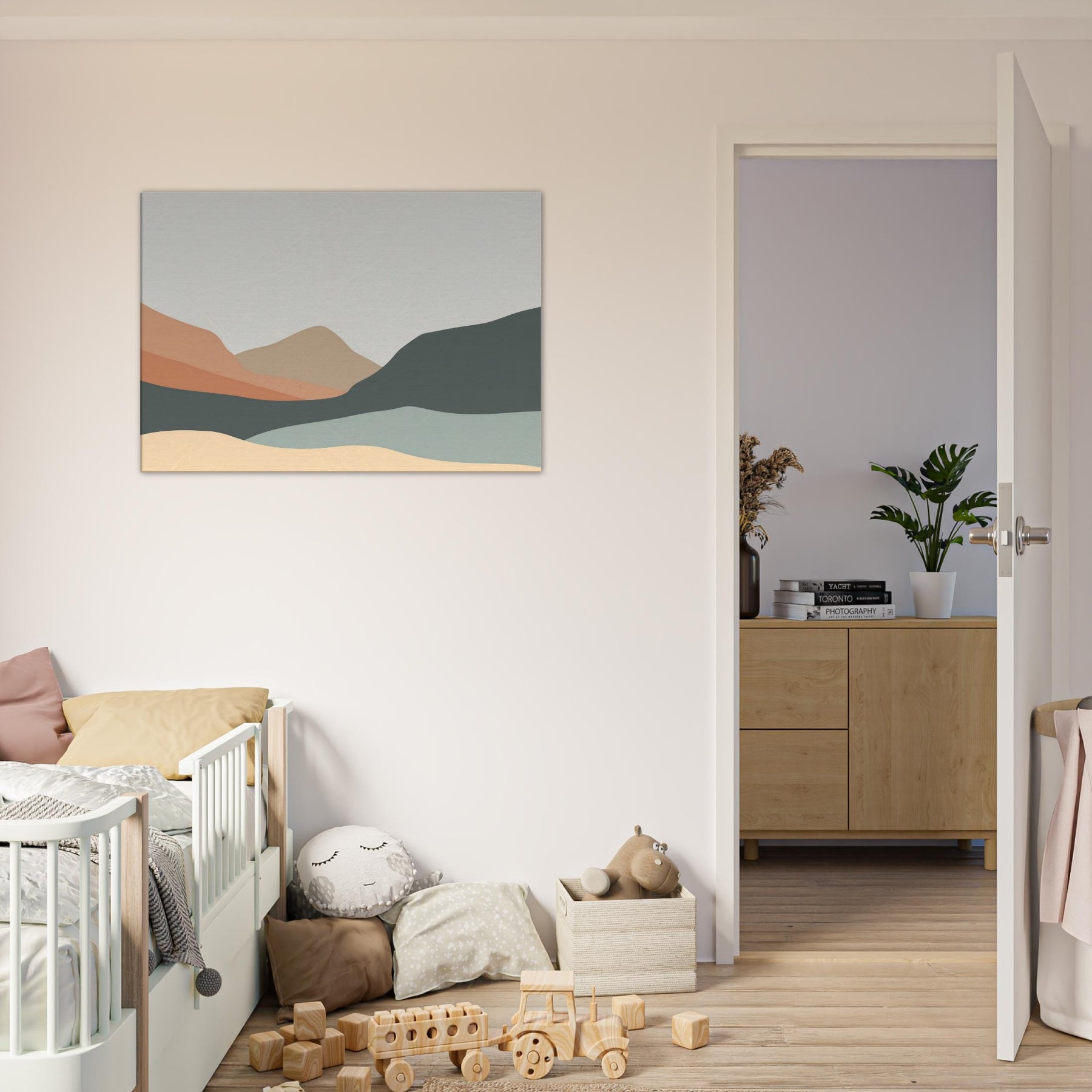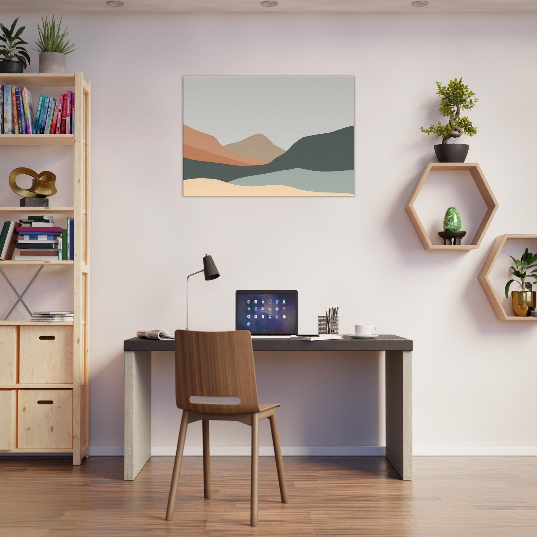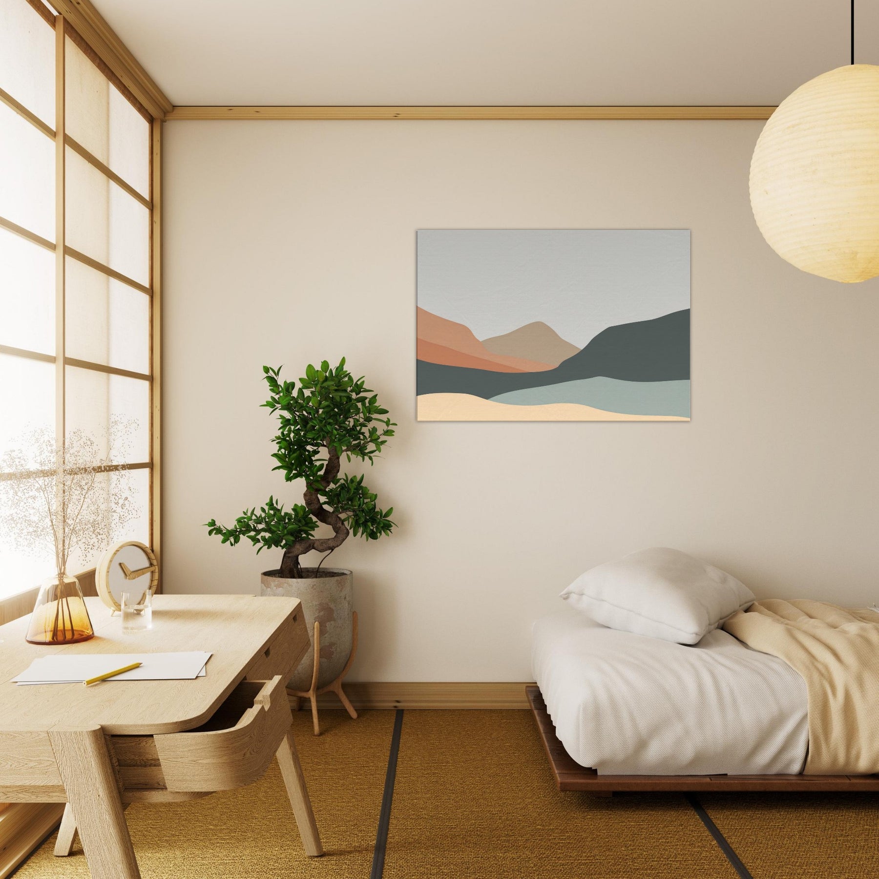 An understated study of distance, this piece reduces the to soft, overlapping silhouettes of Hills in layered earth tones. The palette peach, sand, slate, and pale sage bathes a room in quiet light, guiding the eye along a serene horizon. In a living room or study, the minimalist forms become a calm tonic, inviting contemplation without overpowering existing decor. It creates spaciousness and pairs with natural textures and neutral fabrics, turning walls into a gentle, breathing backdrop.