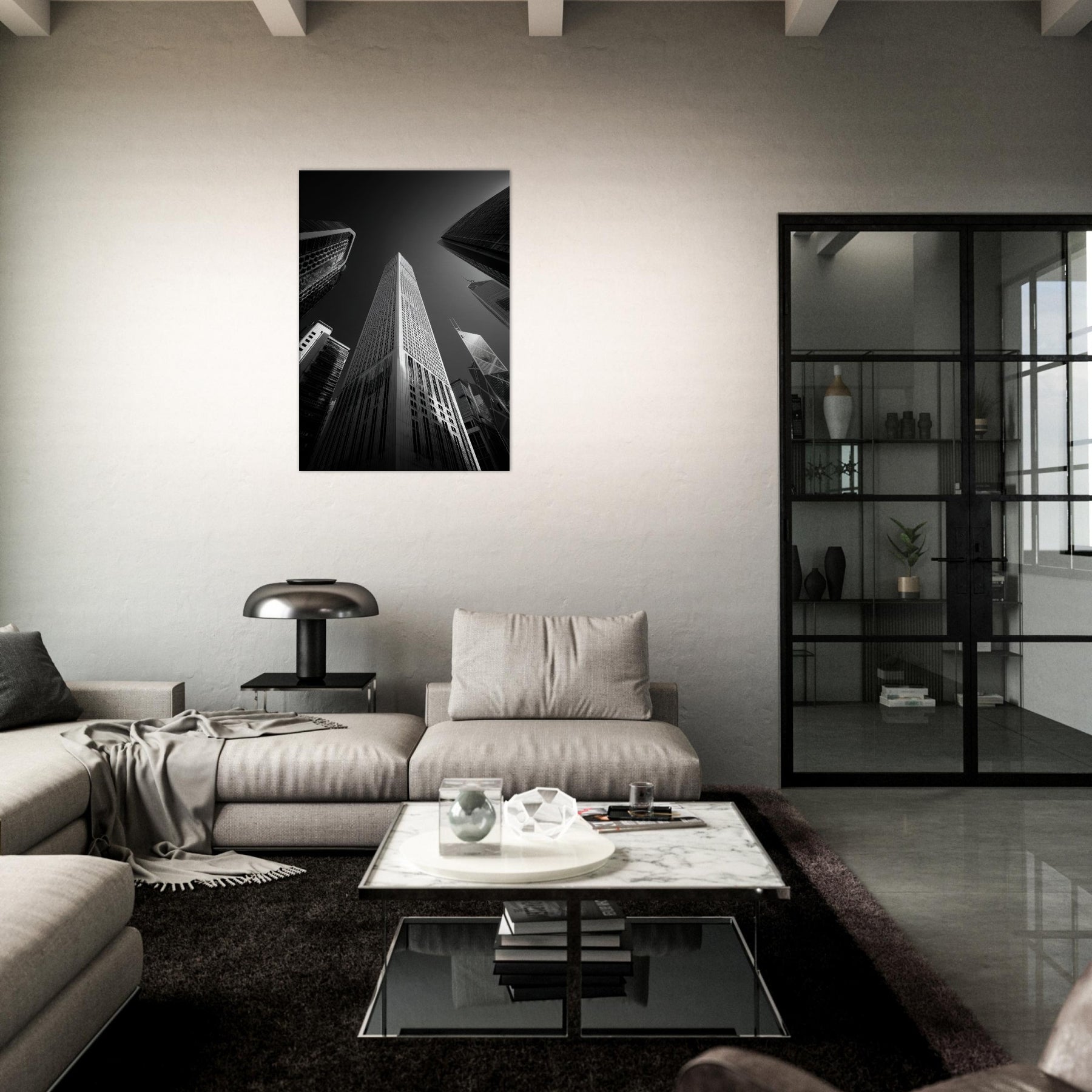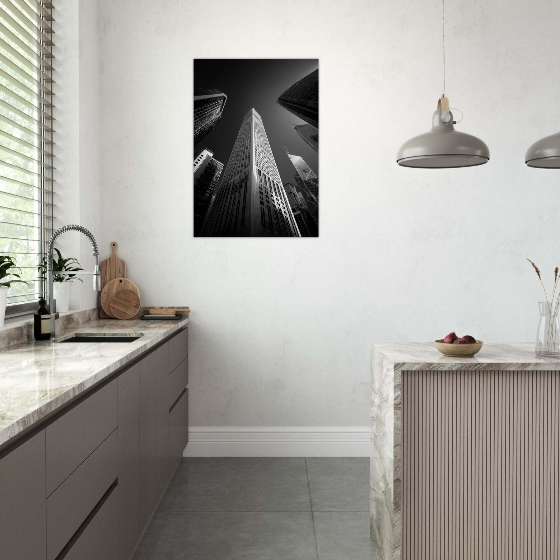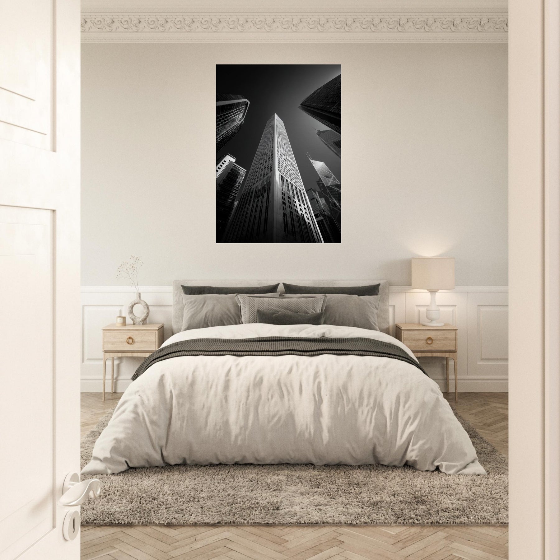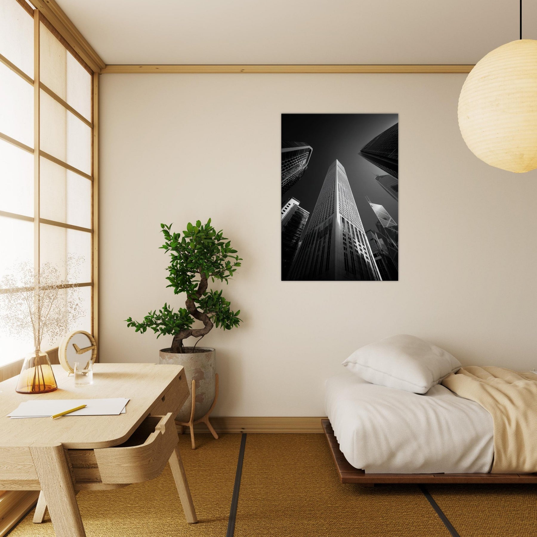 Drawn in stark chiaroscuro, this photograph captures Hong Kong's heartbeat in pure black and white. Skyscrapers stretch like inked prayers, light slicing the glass and casting long shadows that mingle with the room's quiet.