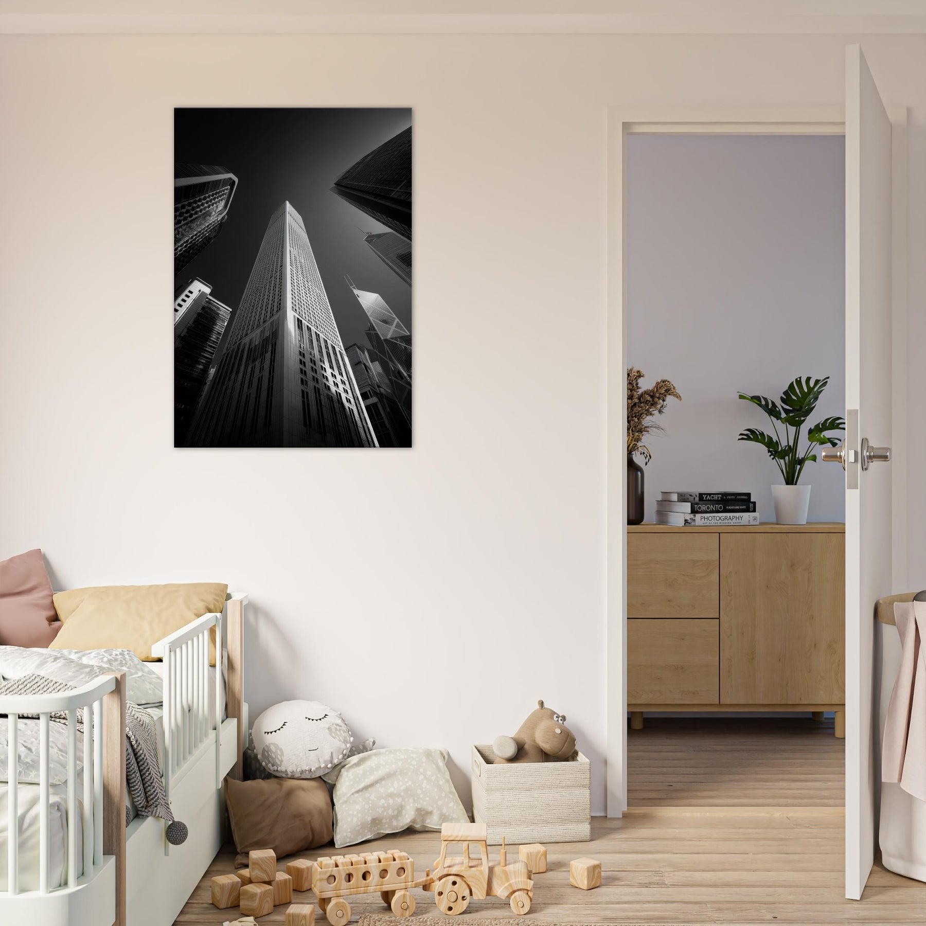 The absence of color sharpens texture steel, concrete, wind swept edges so each corner becomes a memory of streets and harbor. In a living space, this print lends drama and balance, inviting contemplation, a quiet urban poem above a sofa or along a hallway, timeless and modern.