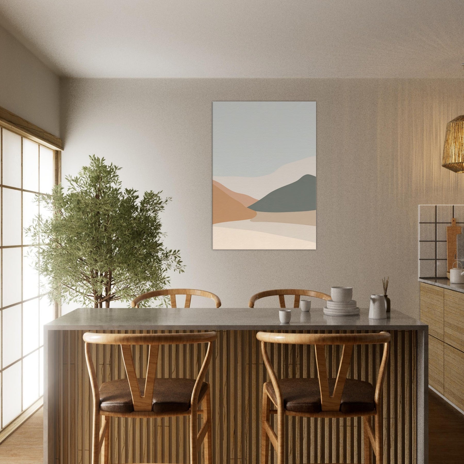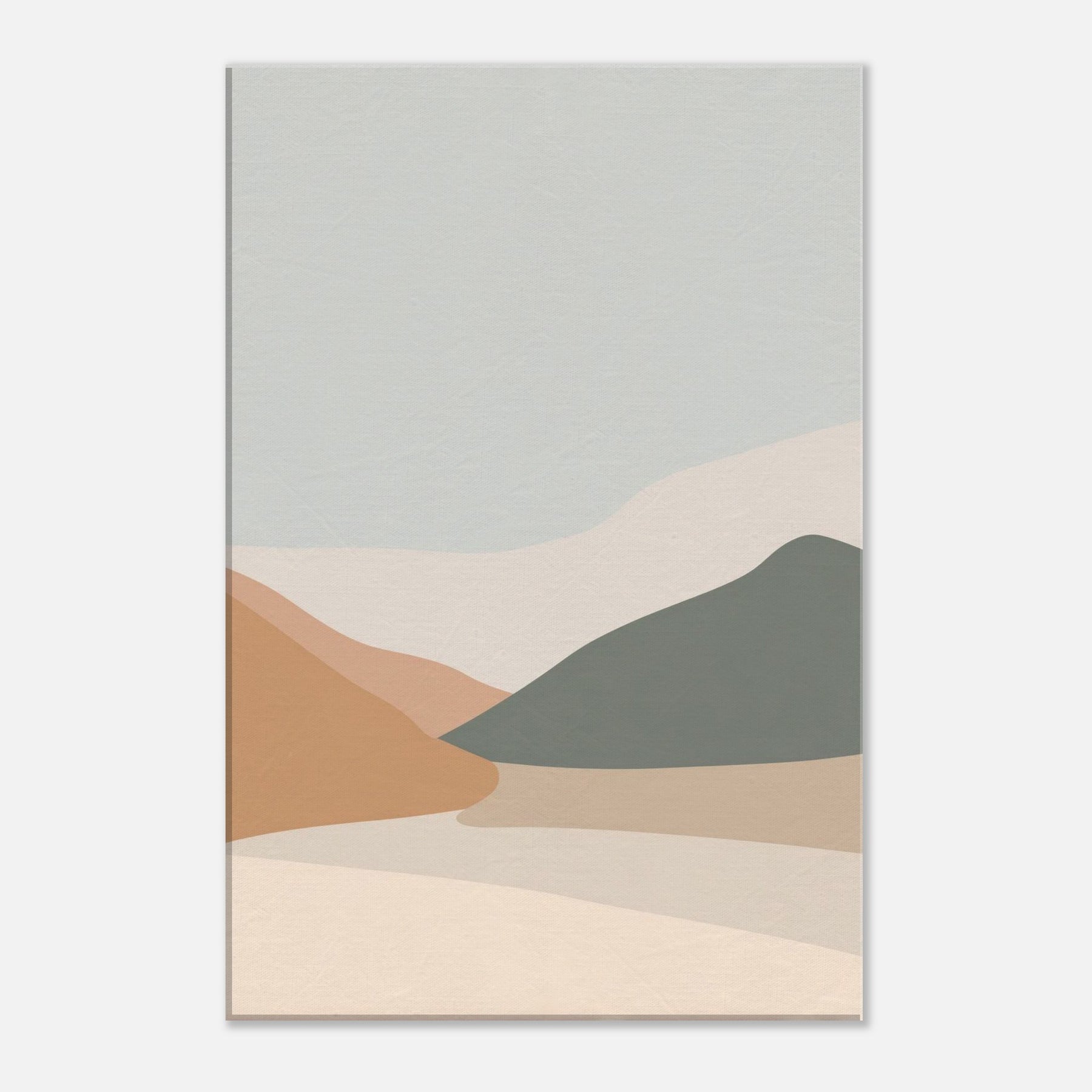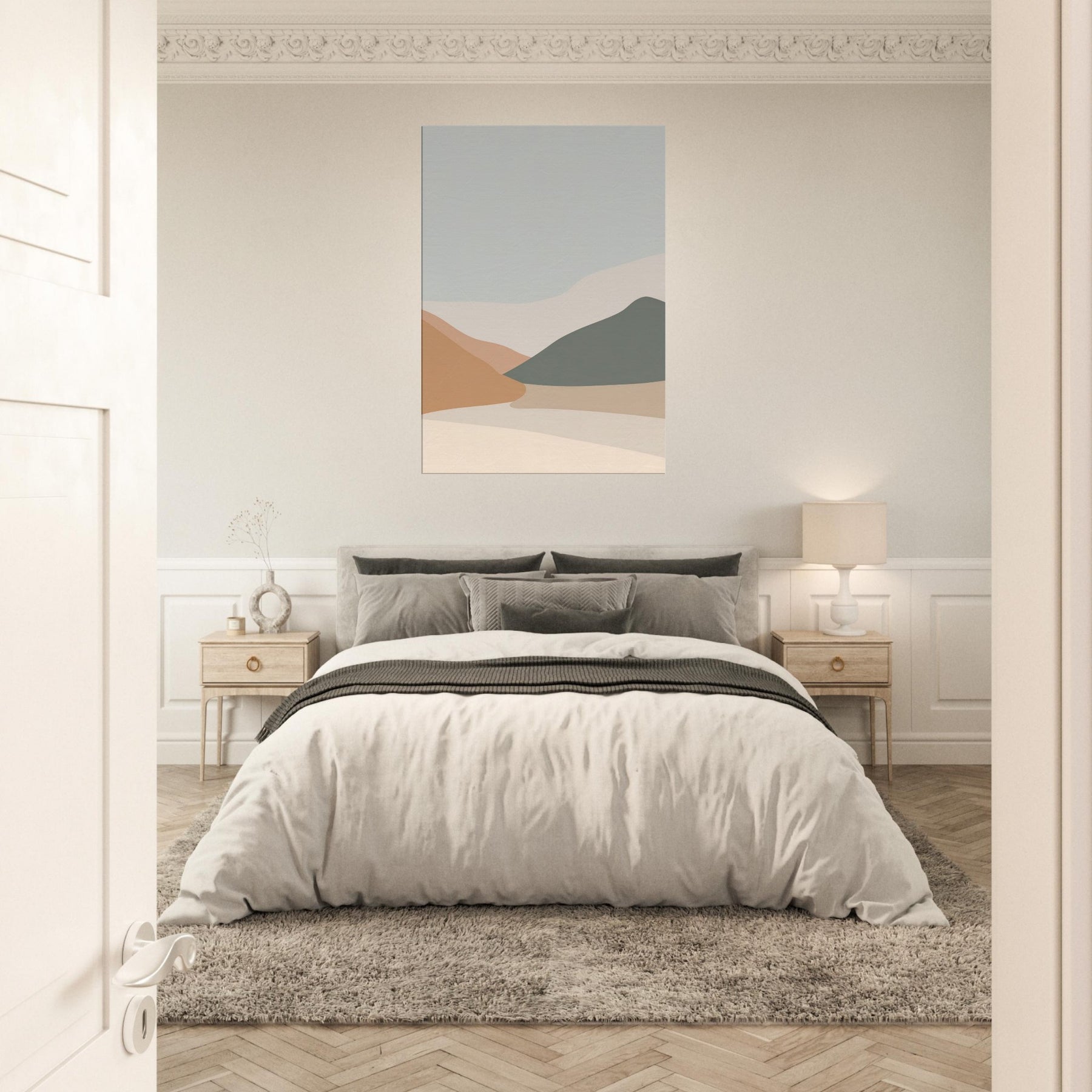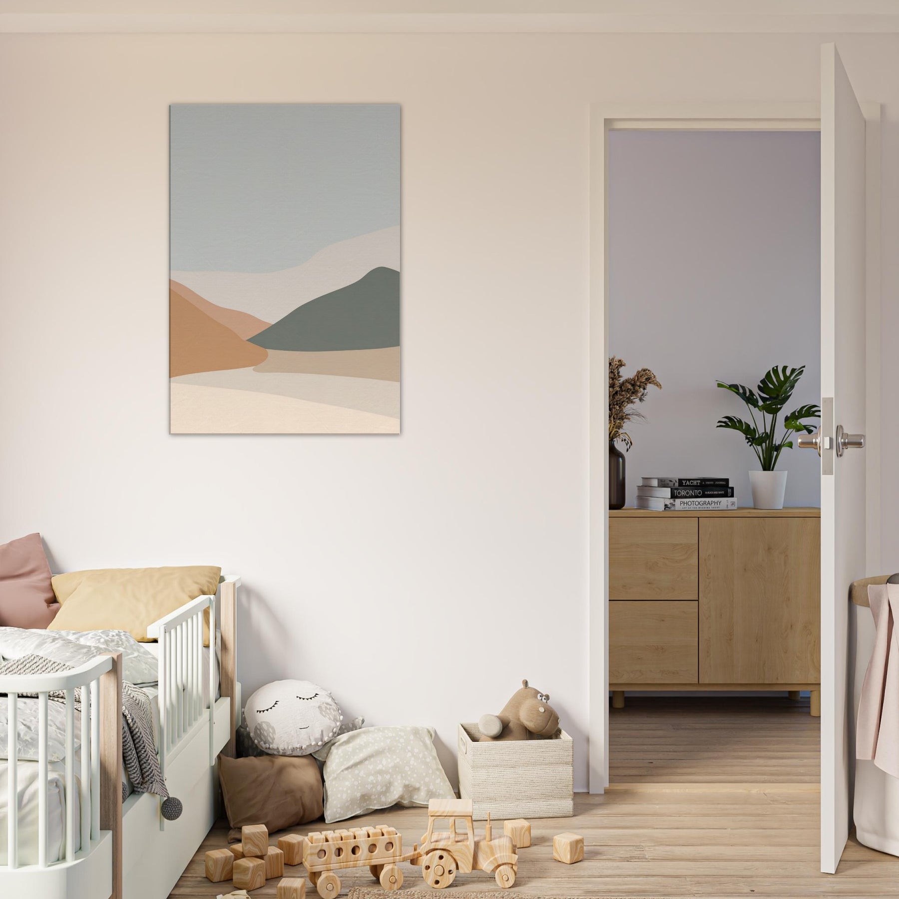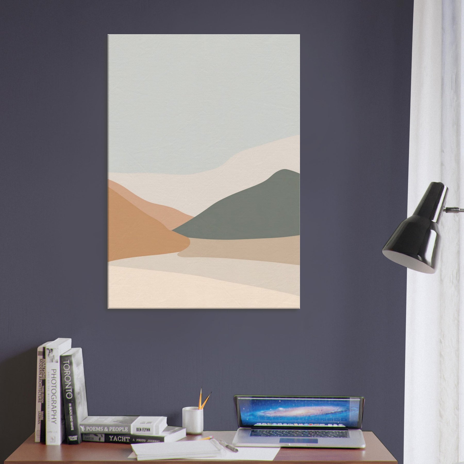 Like a quiet conversation with the horizon, this minimalist composition invites the eye to travel across softly layered Hills in a restrained palette of sand, sage, and pale blue. The gentle curves evoke distant valleys and morning air, turning a wall into a lens for calm. In living rooms, bedrooms, or studios, it adds quiet sophistication without shouting, pairing beautifully with natural textures and warm lighting. A timeless reminder that nature's geometry can soothe, center, and elevate everyday space.