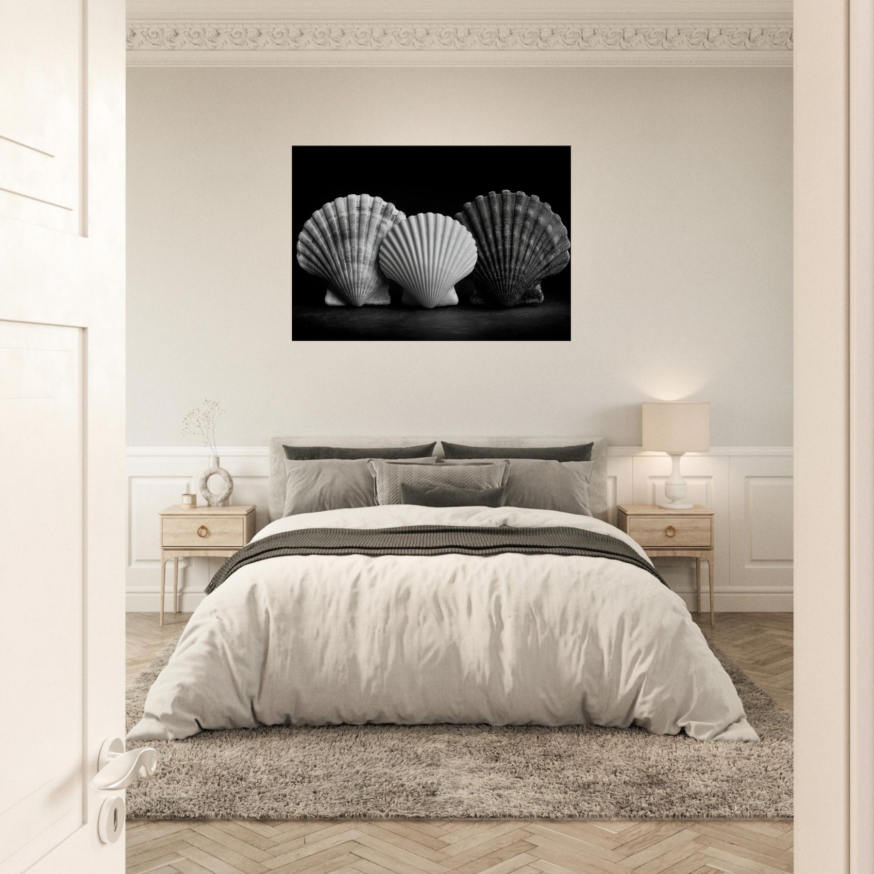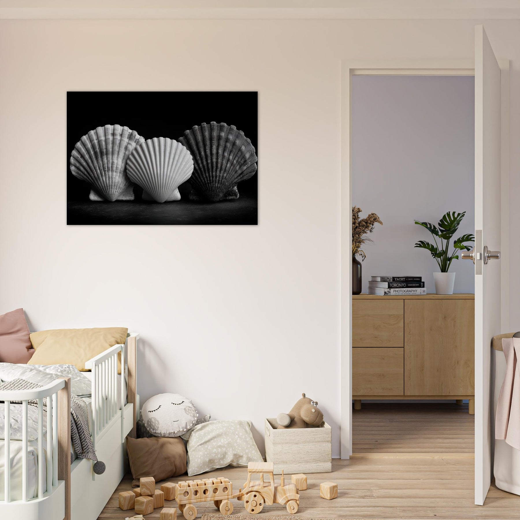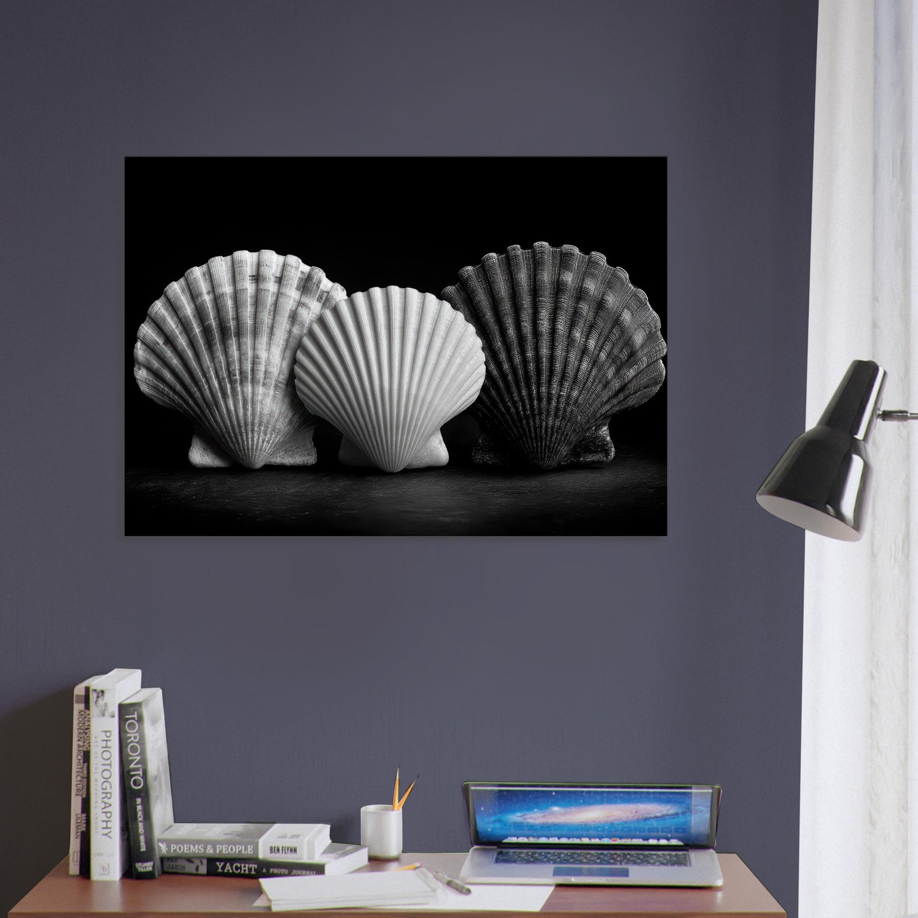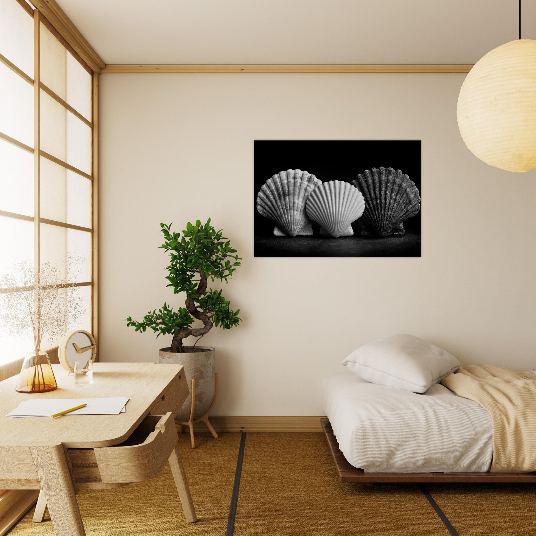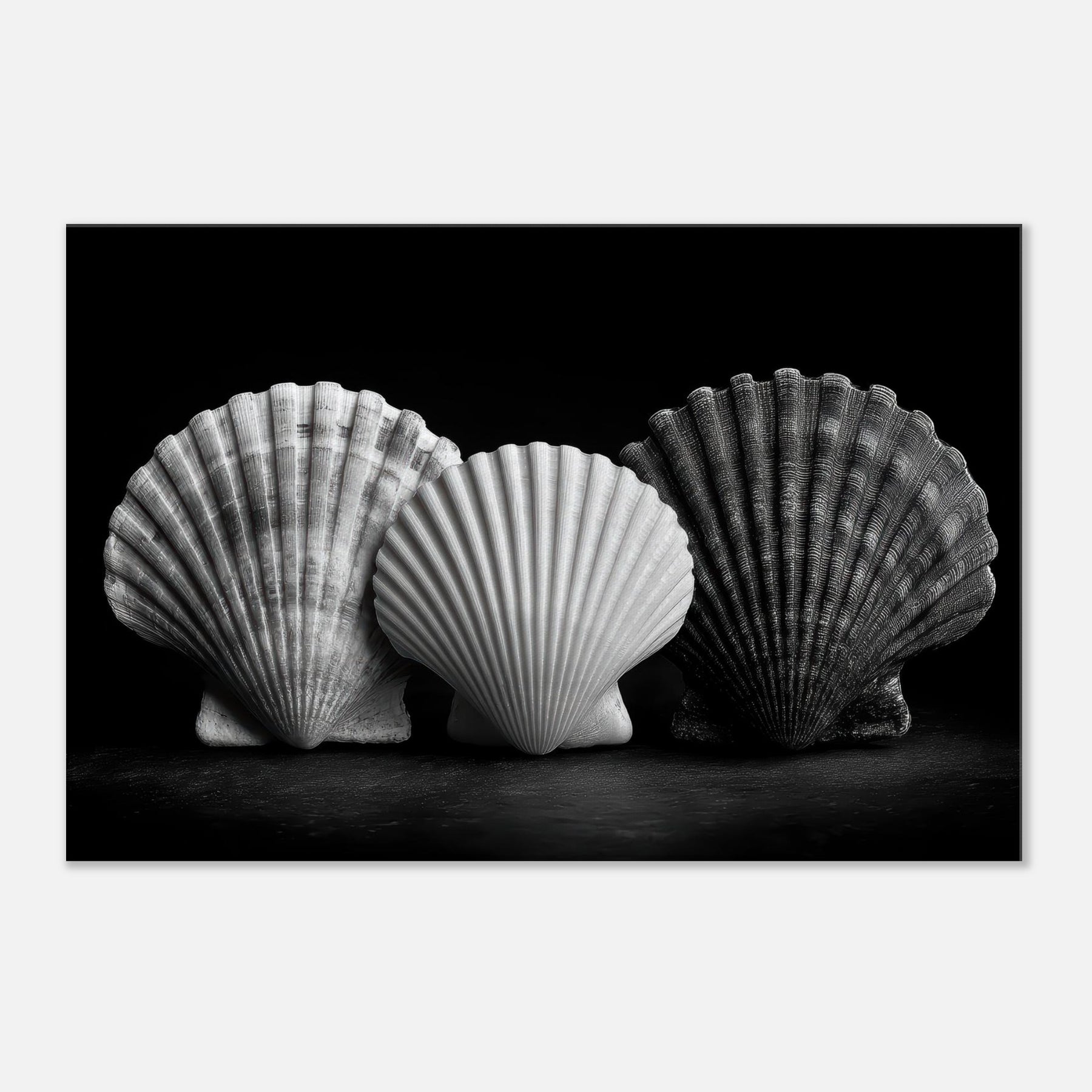 It arrives as a monochrome meditation on form and calm. In stark black and white, the three shells stand like quiet silhouettes, their ridges catching light and shadow with a tactile rhythm.