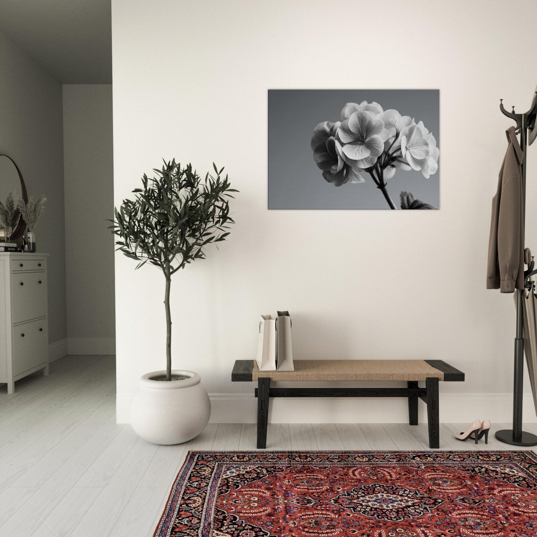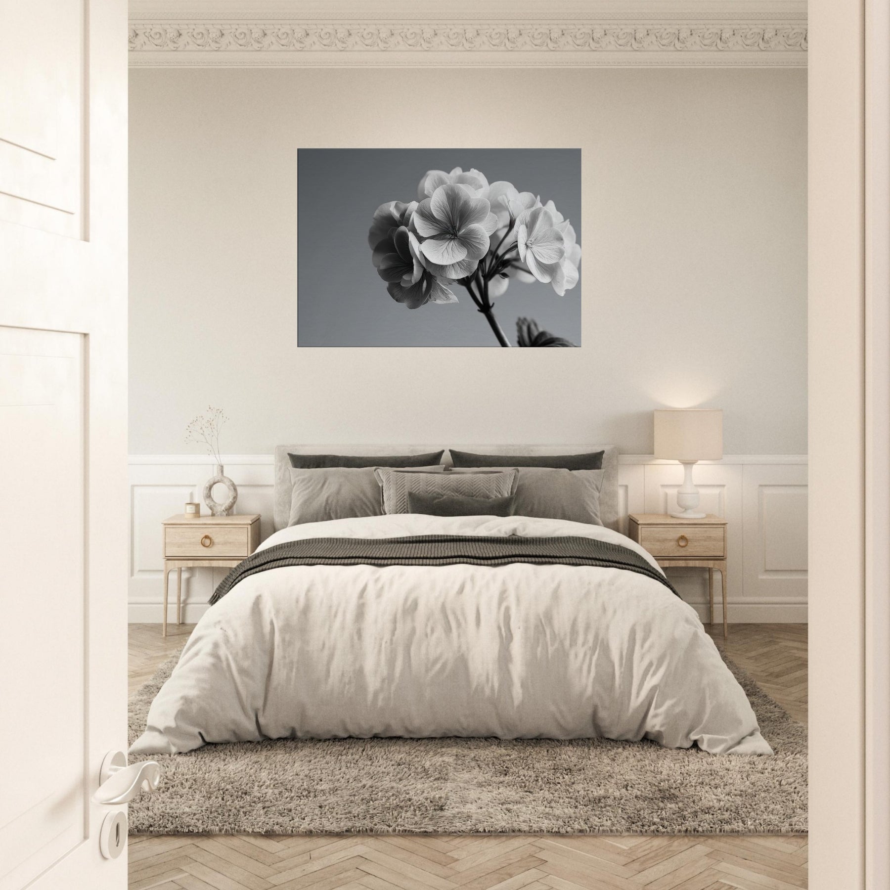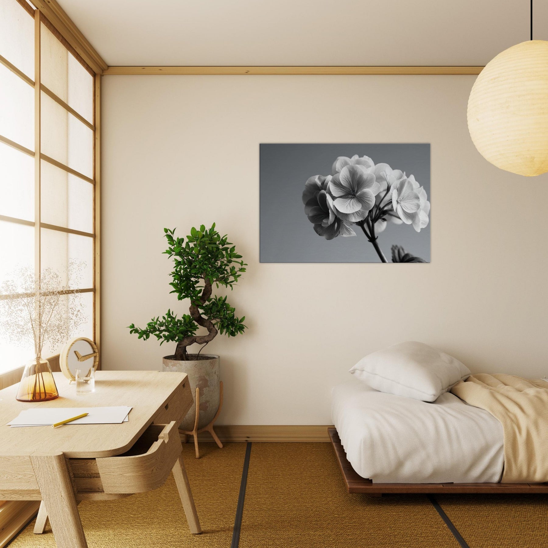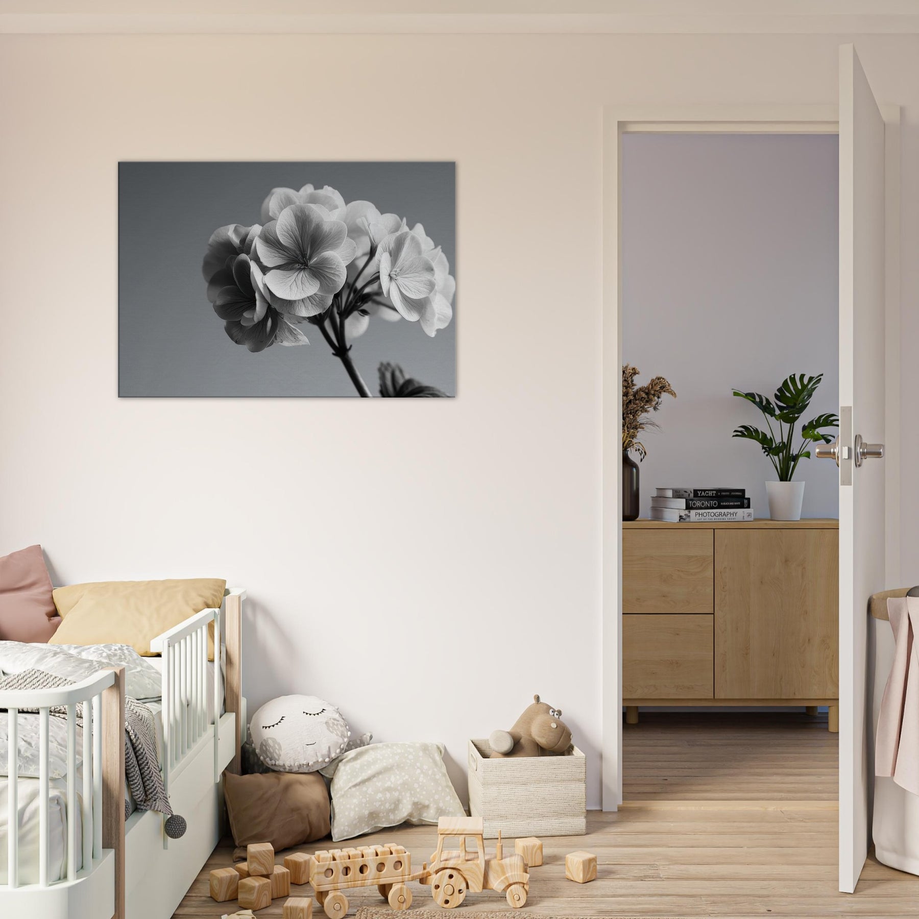 Immerse your space in the quiet drama of a hydrangea captured in pristine black and white. This wall art invites soft light and shadow to play across every petal, turning a simple bloom into a refined conversation piece.