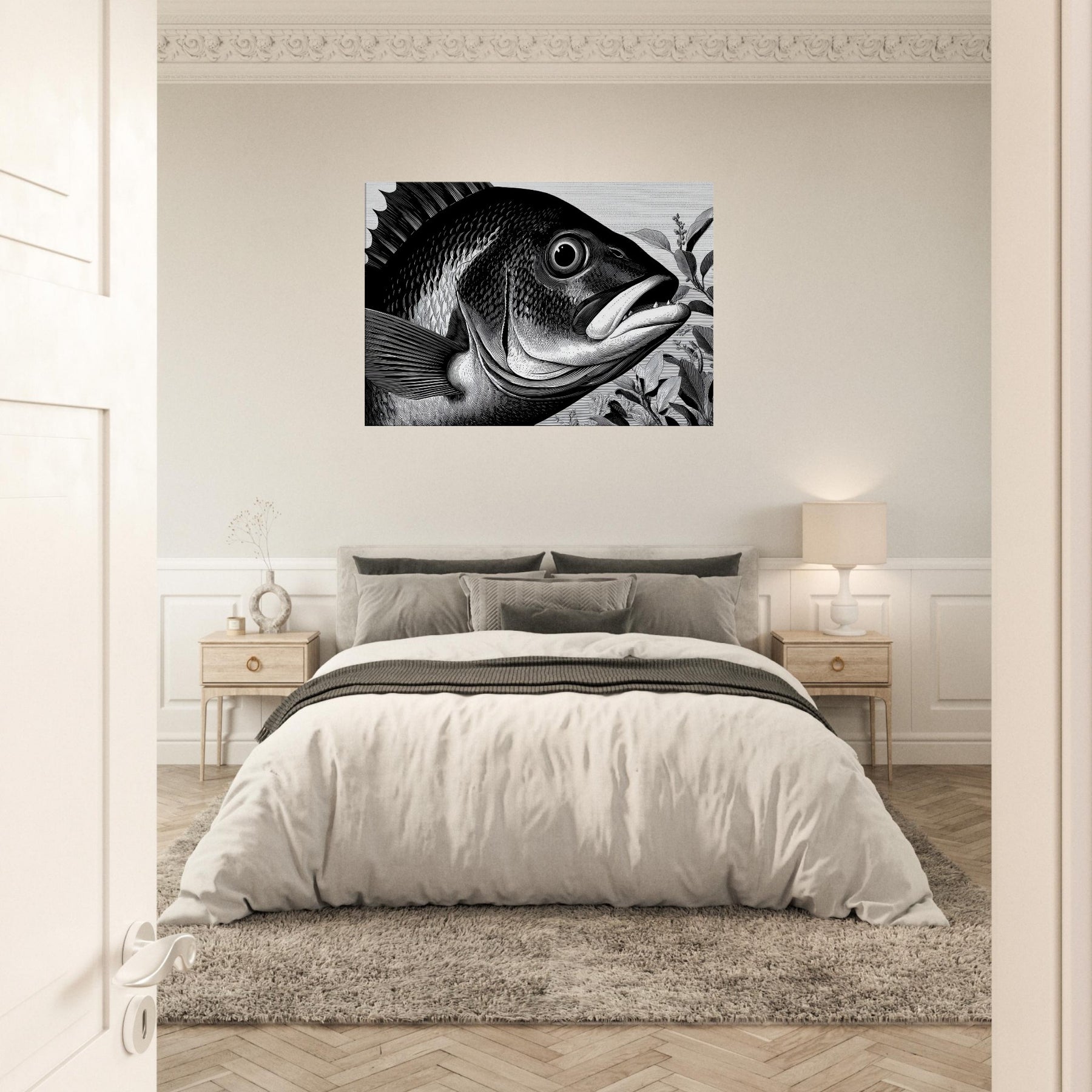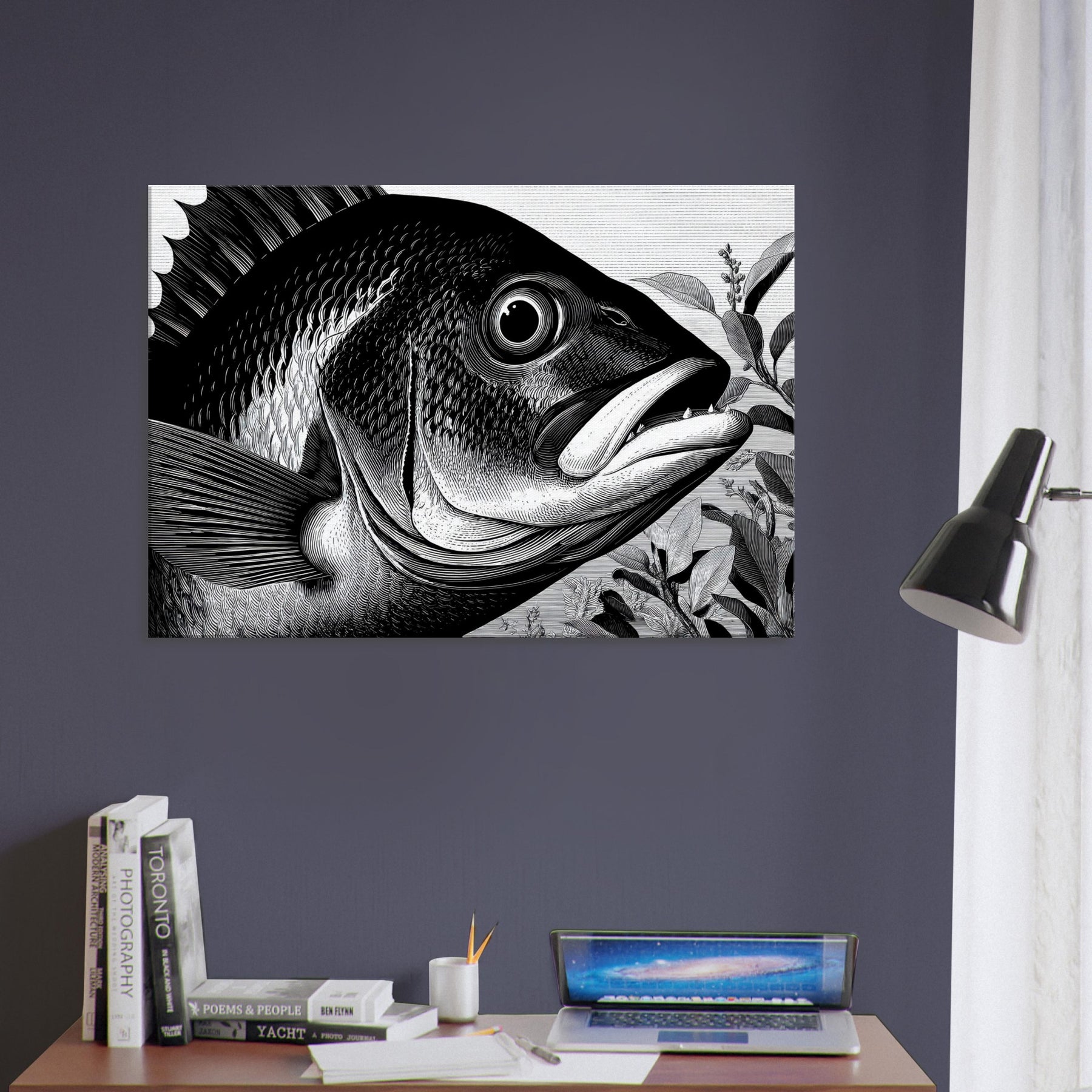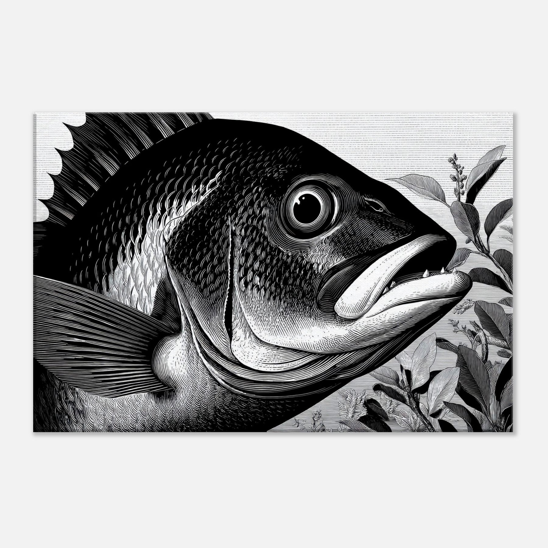 Let the Tropical Fish rise in monochrome poetry, a black and white chorus that brings ocean hush to your living room. This sculpture like print captures a tropical life in high contrast linework: the bold silhouette, delicate scales, and a curving mouth gliding among leaves.