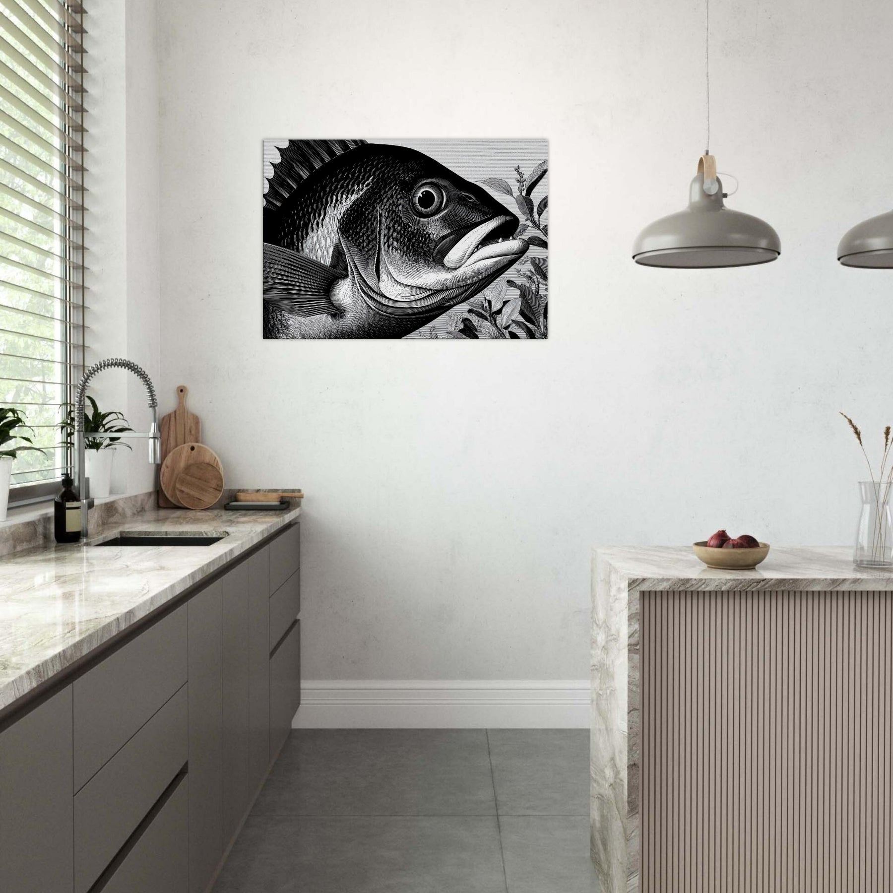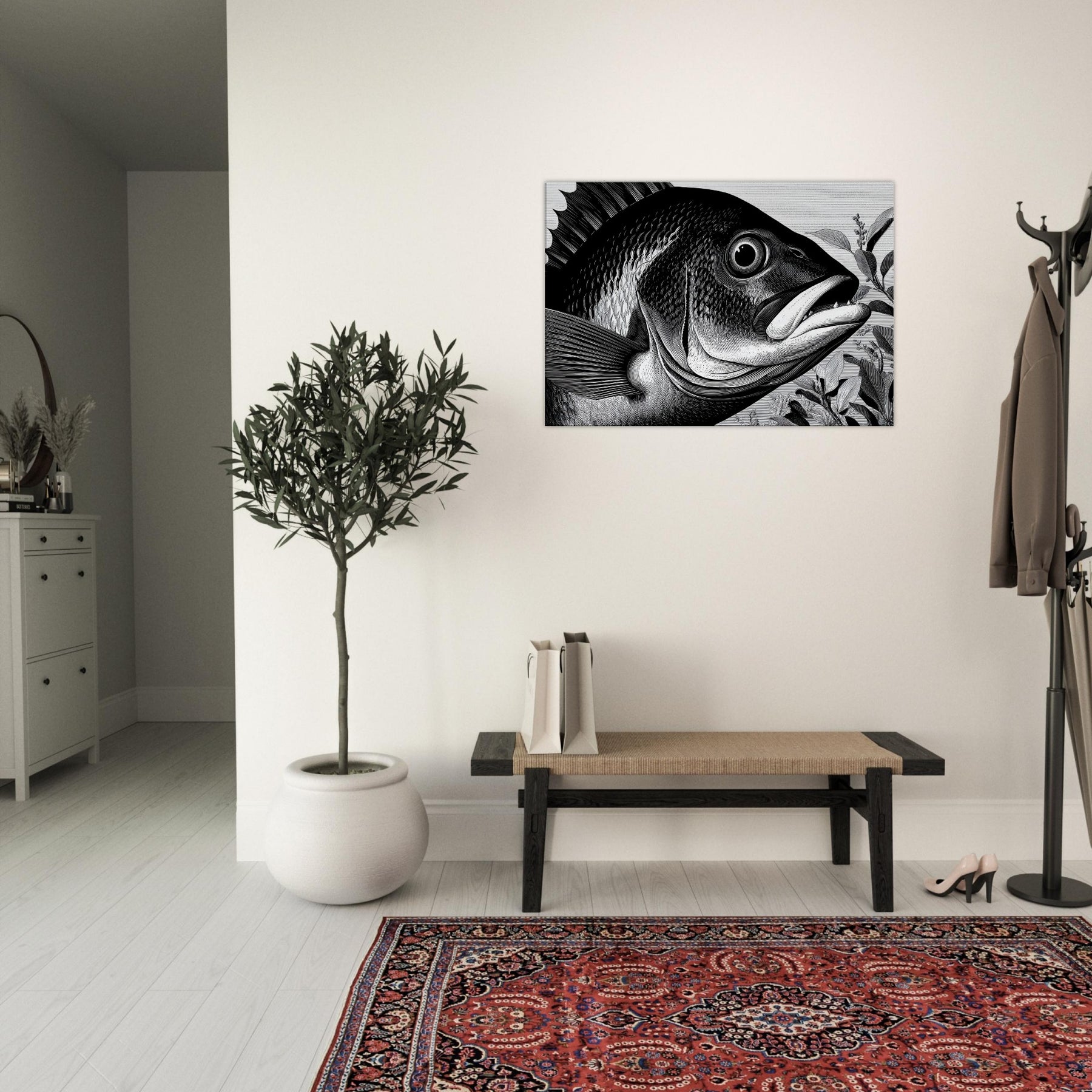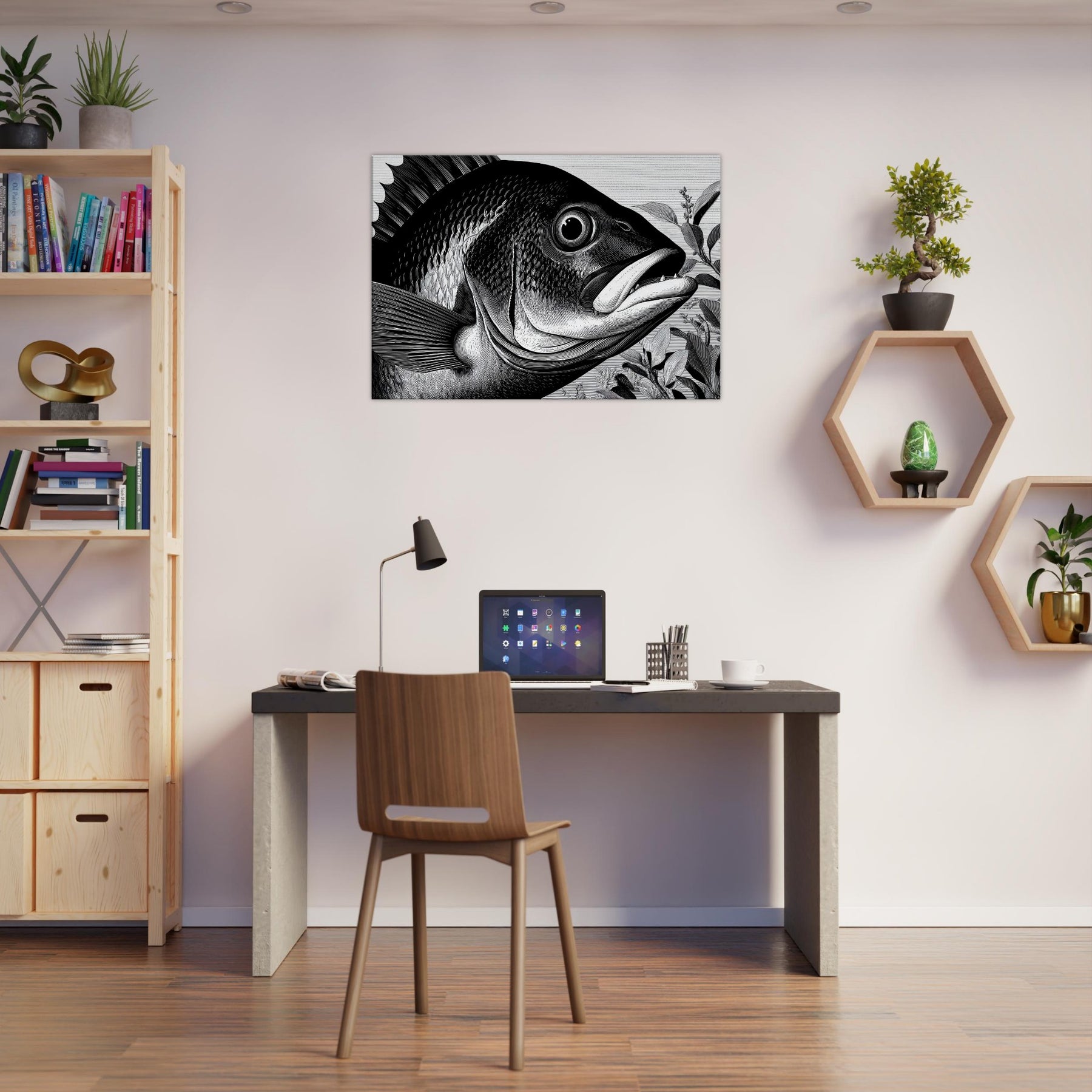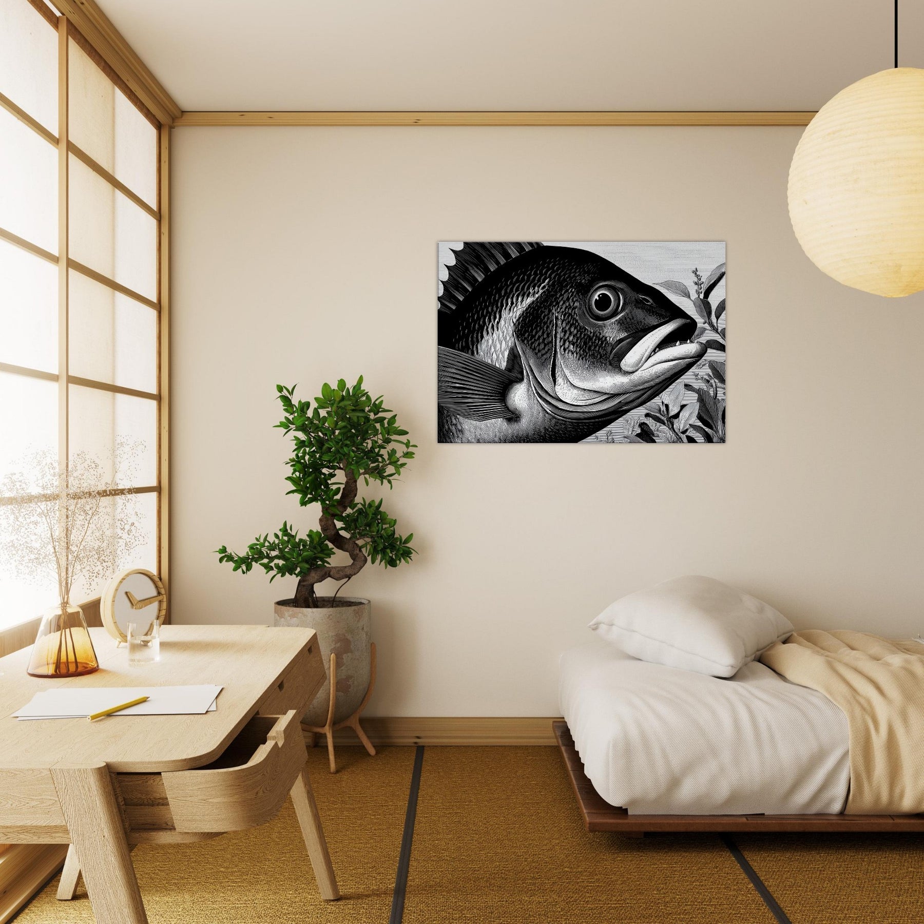 The air of stillness invites contemplation, while the rhythm of its fins adds movement to any wall. Perfect for a modern lounge, hallway, or study, it pairs with natural textures and minimal color for a tranquil focal point.