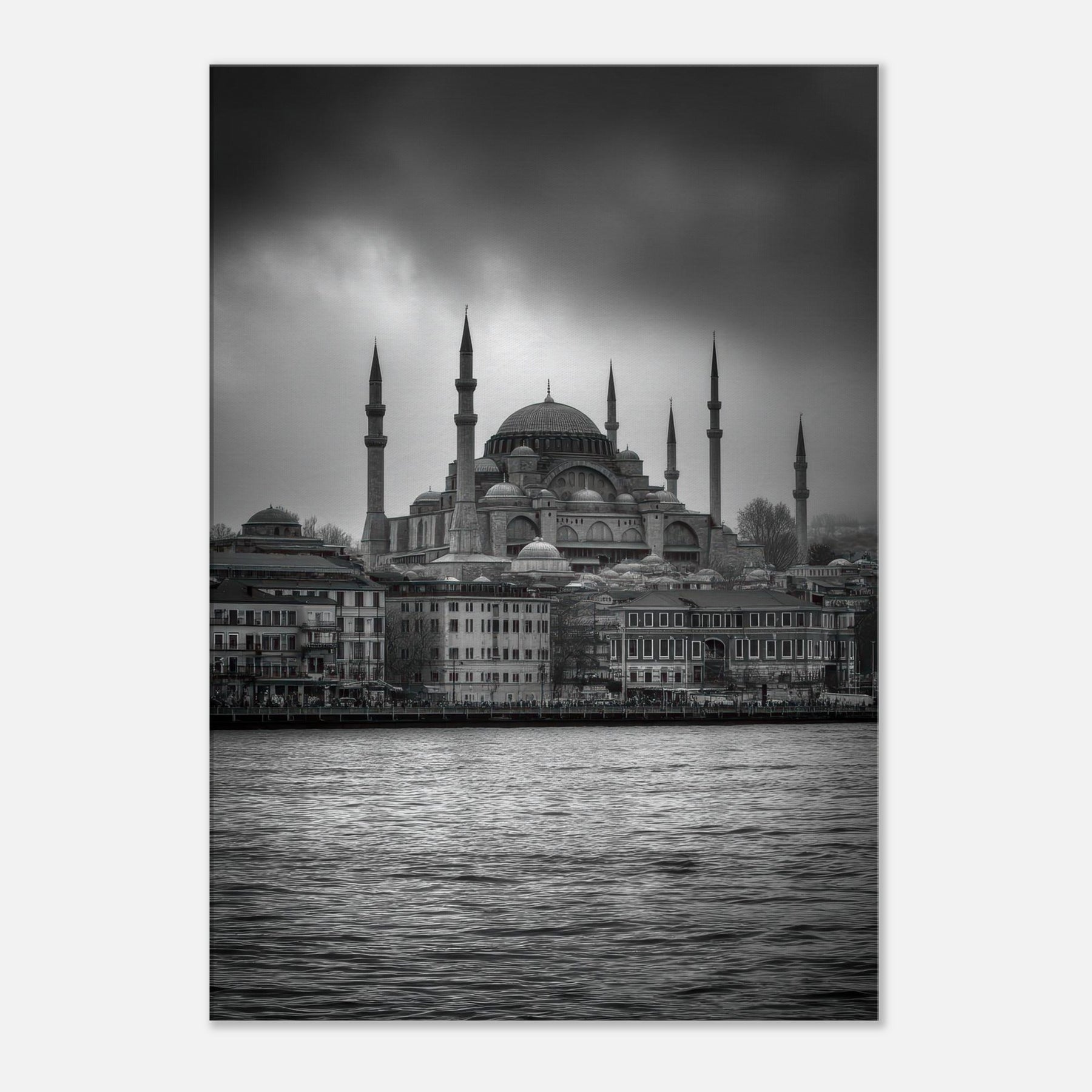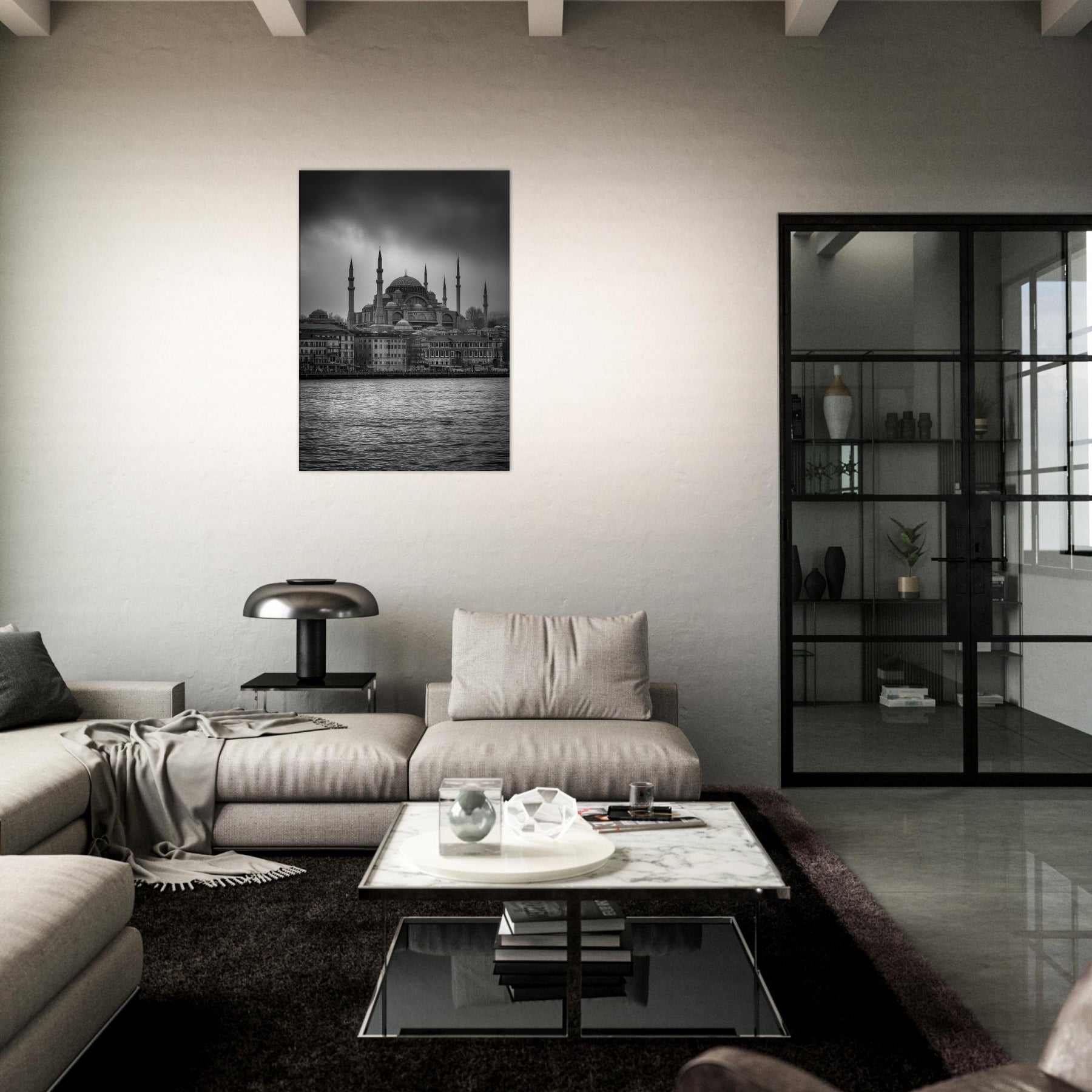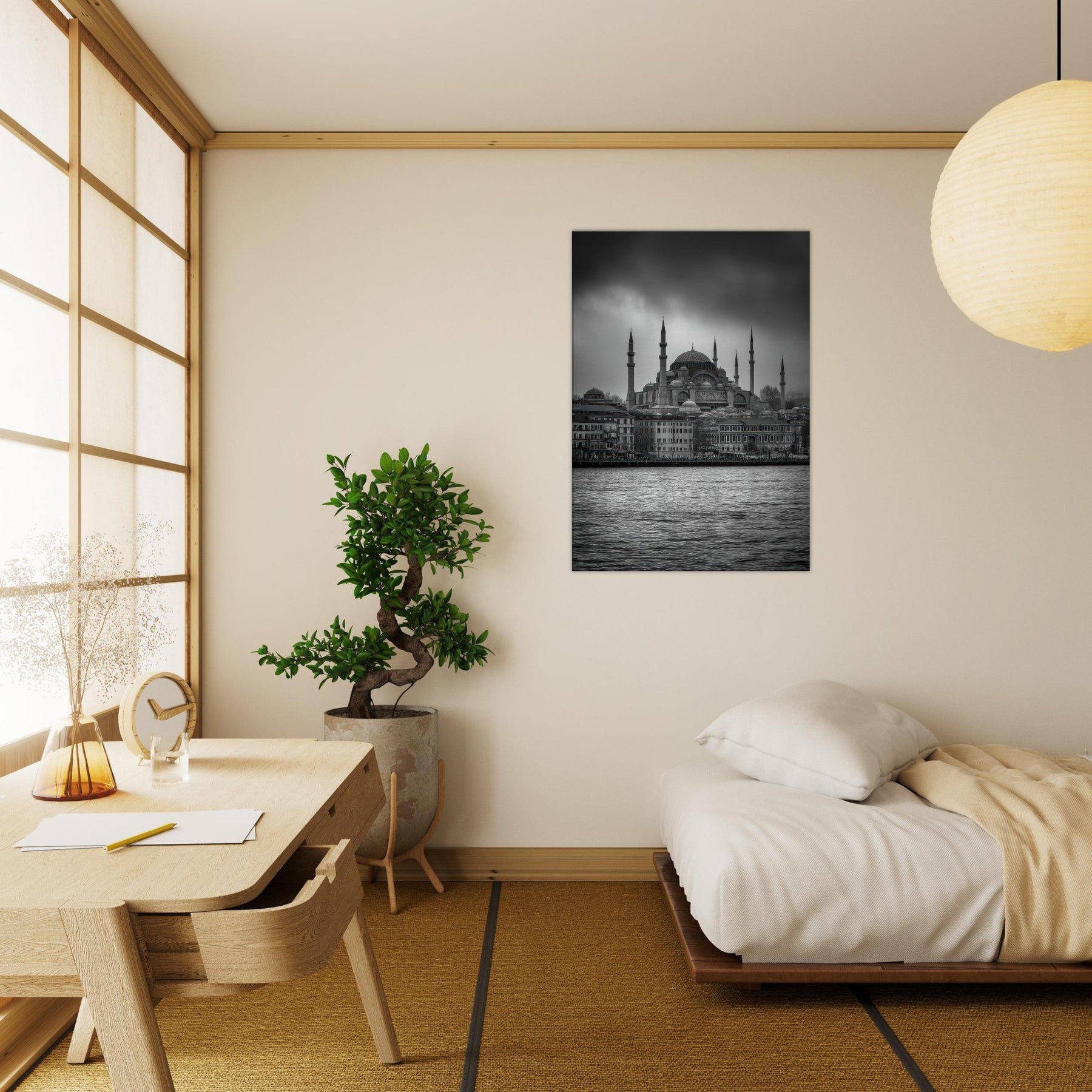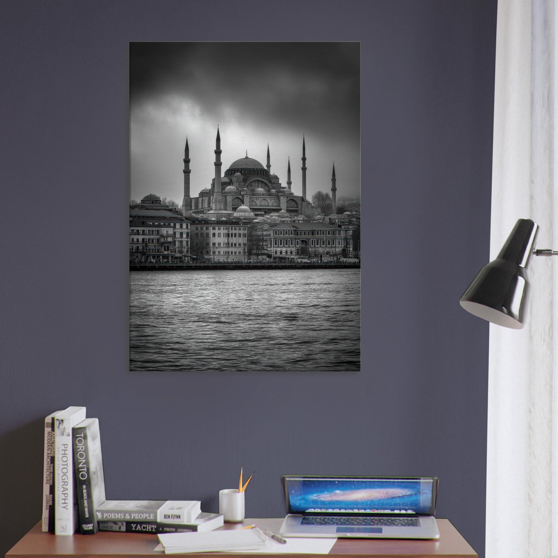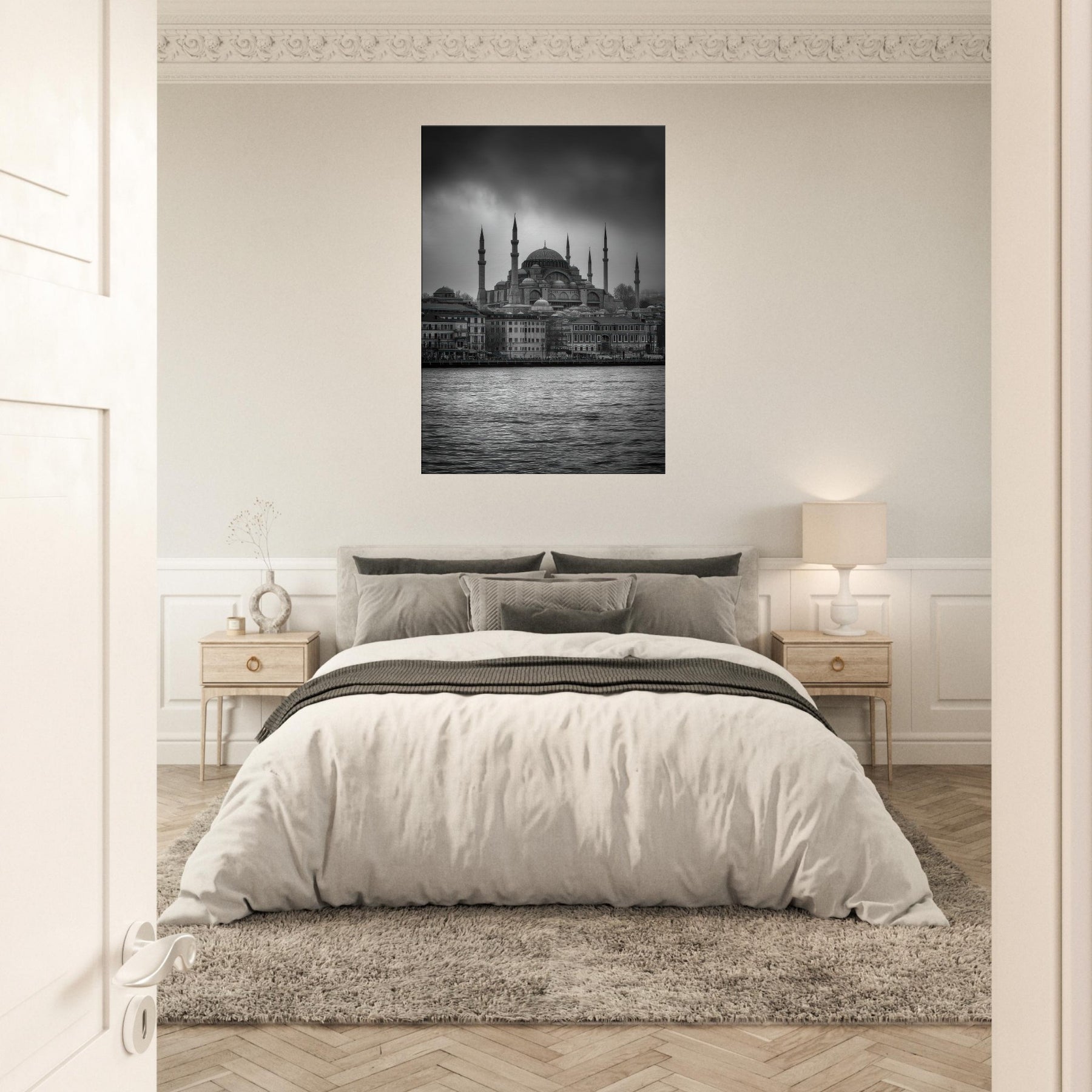 In this black and white study, Istanbul rises as a poised silhouette along the water, where domes and minarets carve the skyline with quiet authority. The contrasts of light and shadow sketch texture across stone and waves, inviting a contemplative mood that softens modern living spaces.