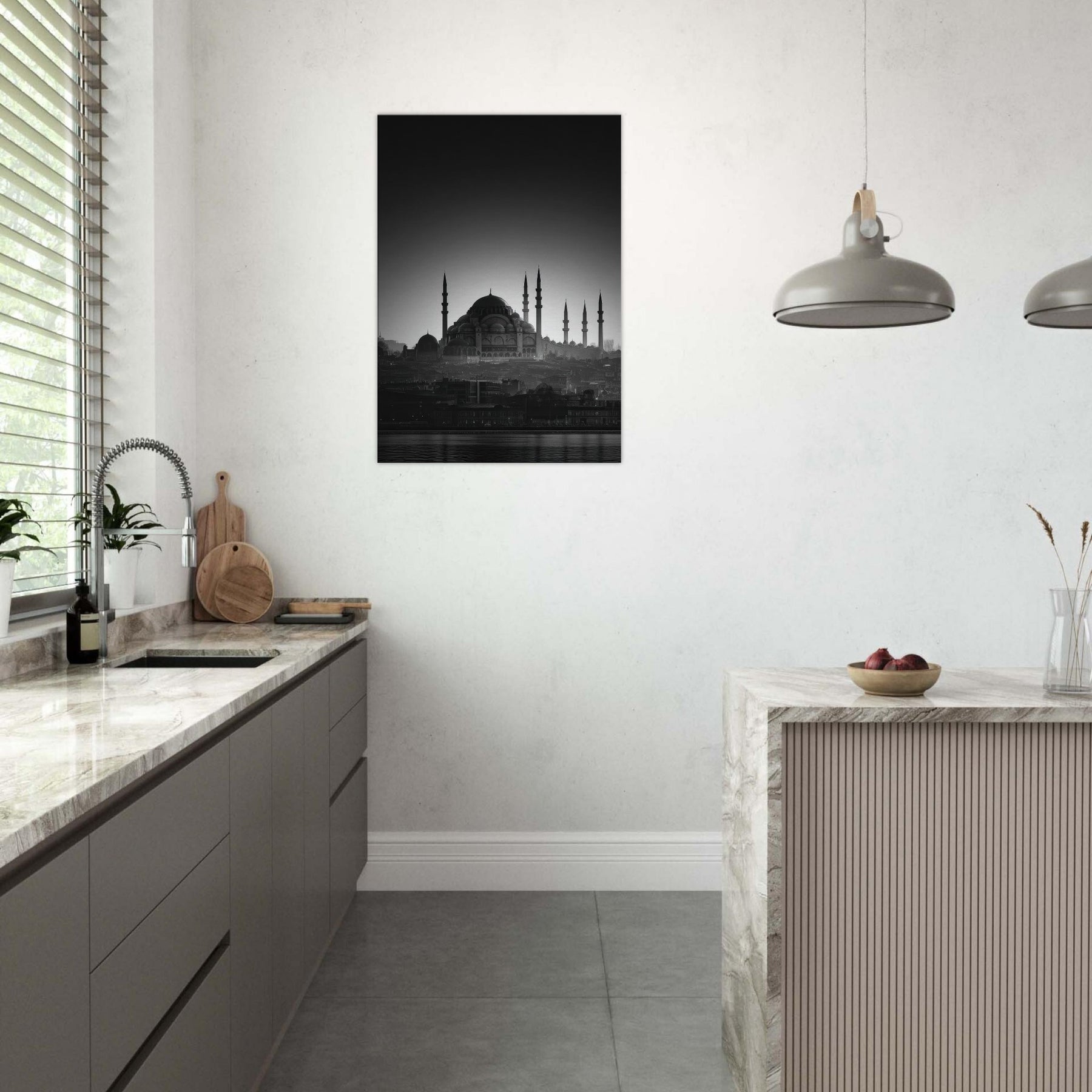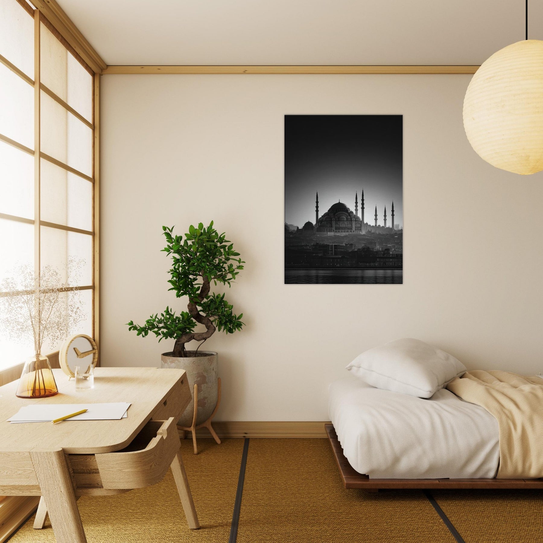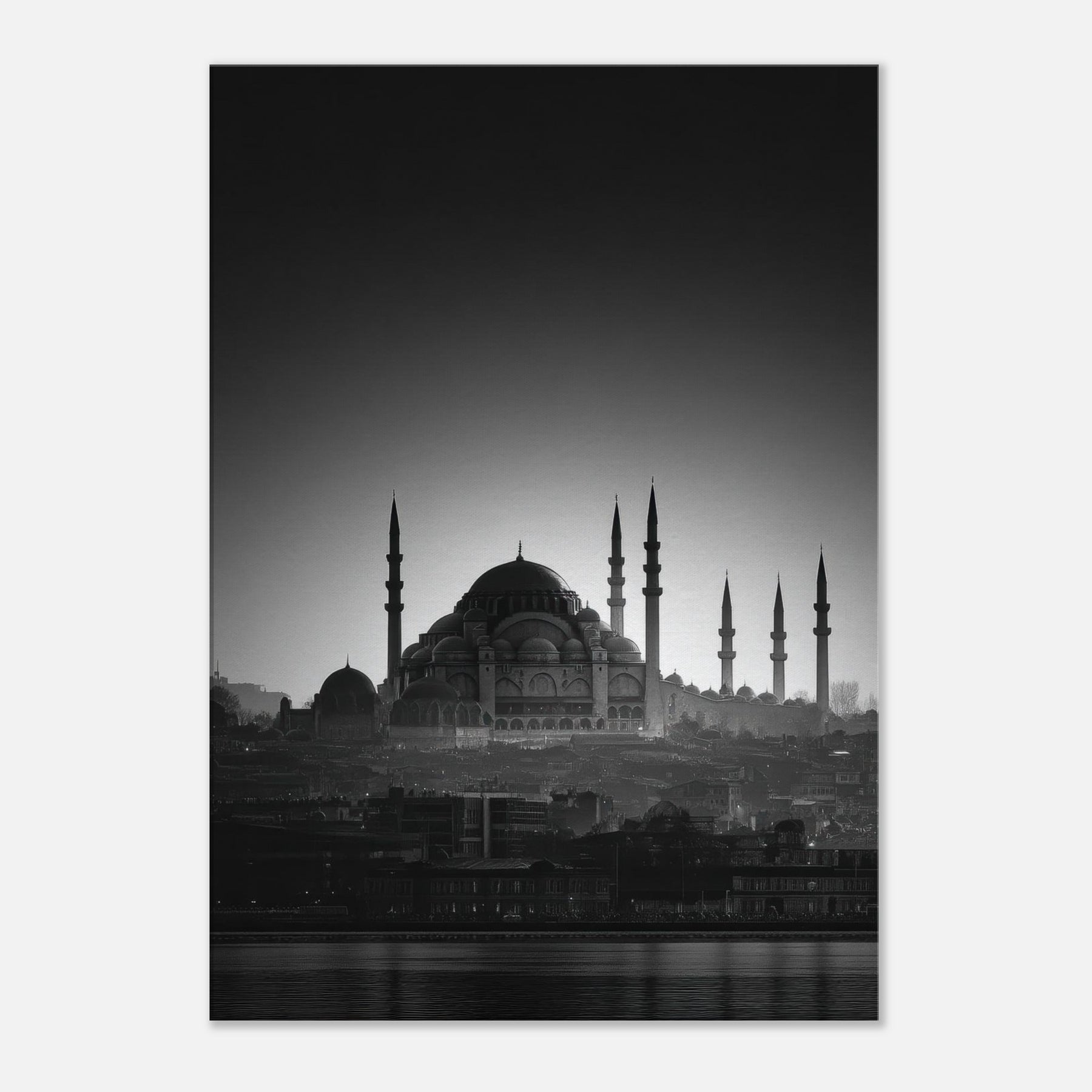 In black and white, a city wakes in a single breath of light. The domes and minarets carve a serene skyline, where Istanbul breathes between shadow and glow. This wall art invites calm into the living room, a quiet focal point that distills memory into lines and silhouettes.