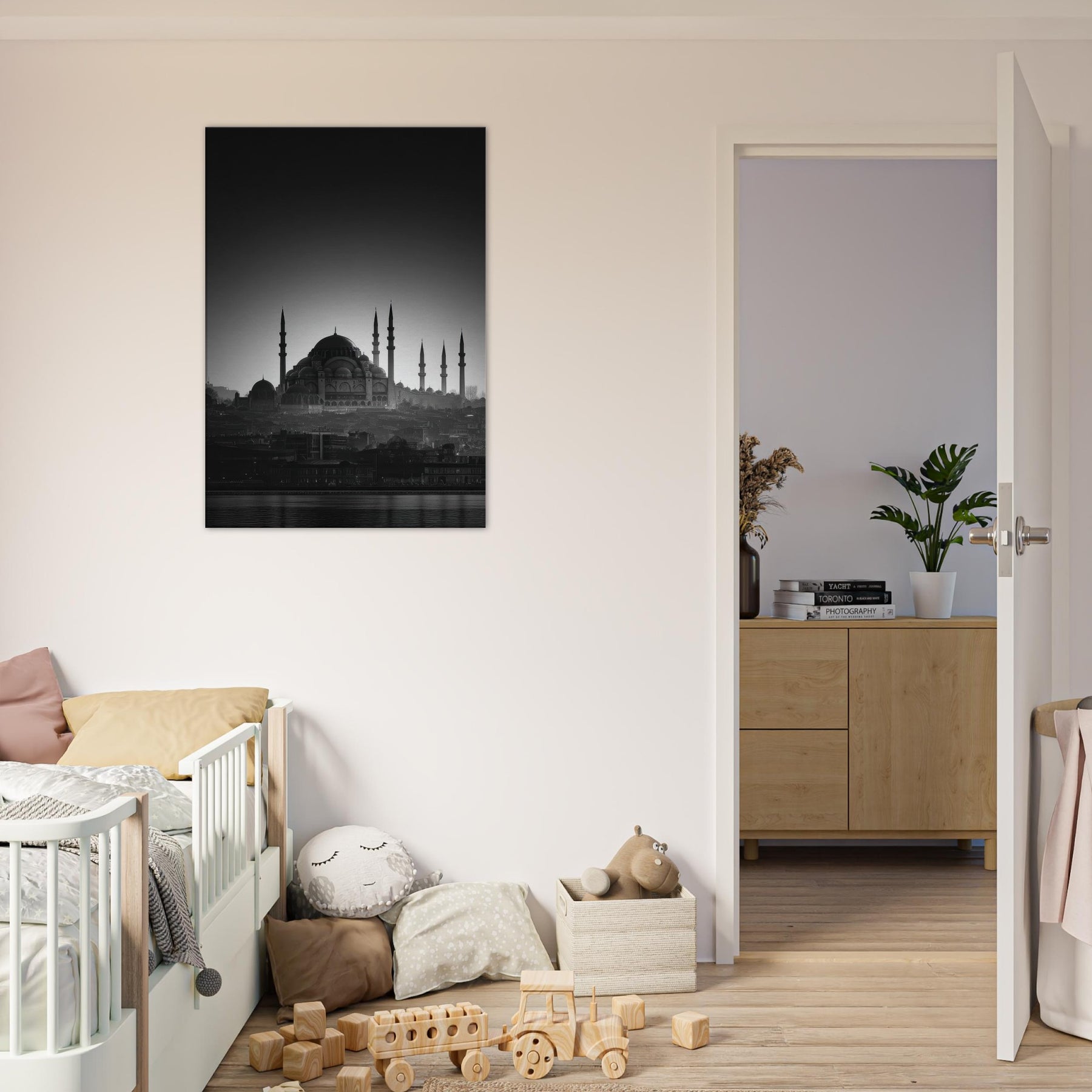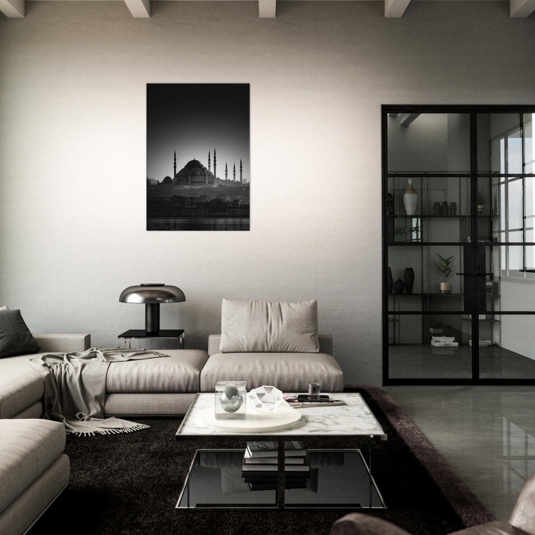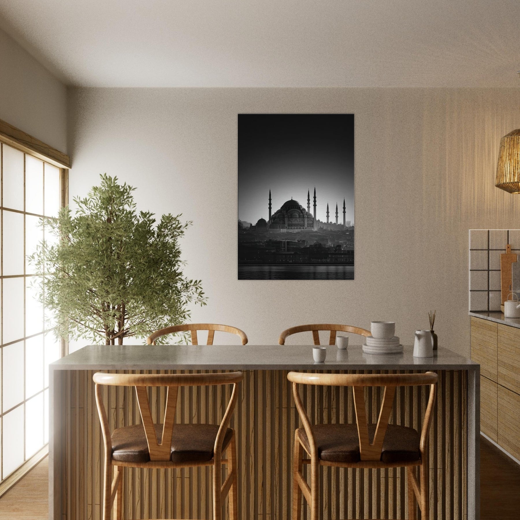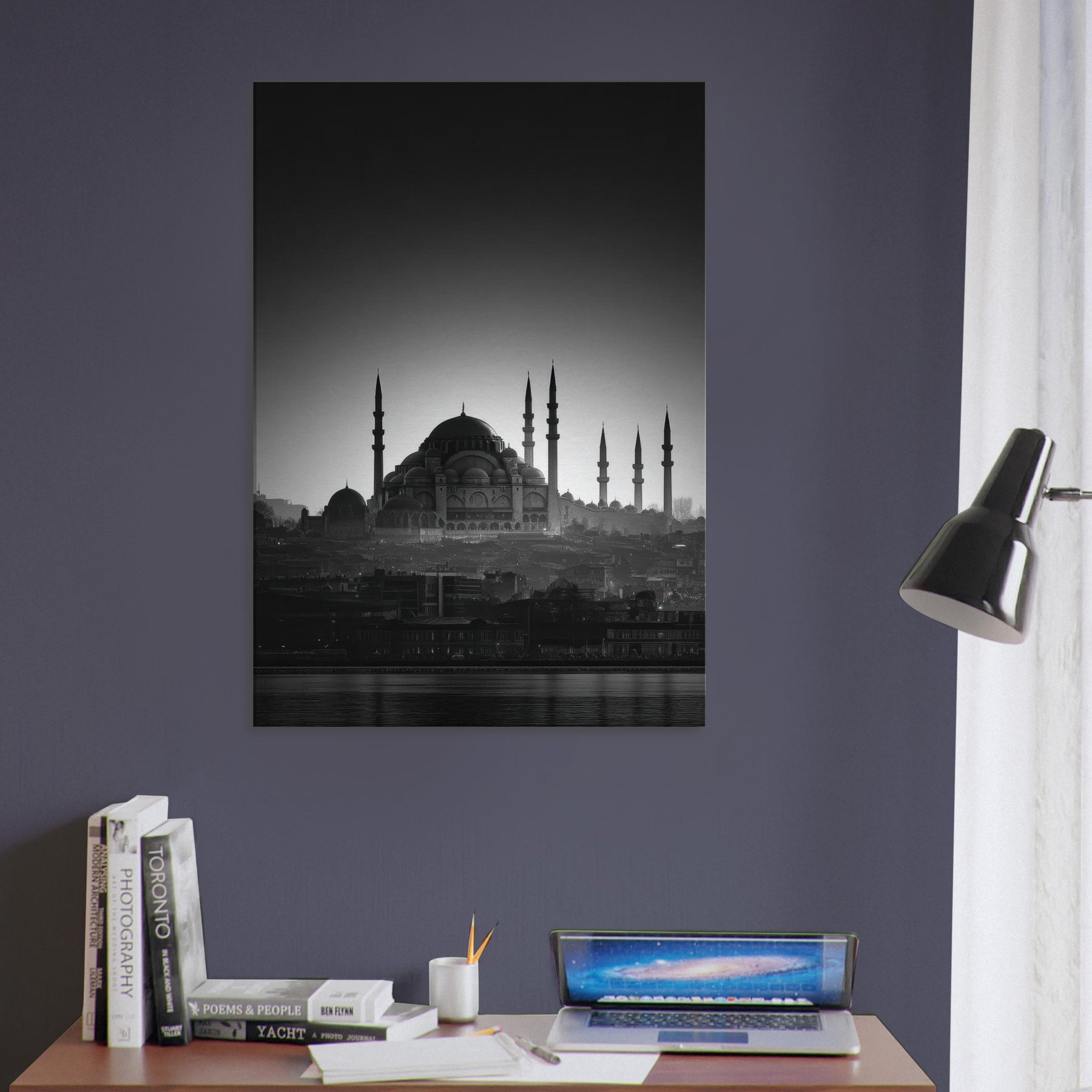 In black and white, a city wakes in a single breath of light. The domes and minarets carve a serene skyline, where Istanbul breathes between shadow and glow. This wall art invites calm into the living room, a quiet focal point that distills memory into lines and silhouettes.