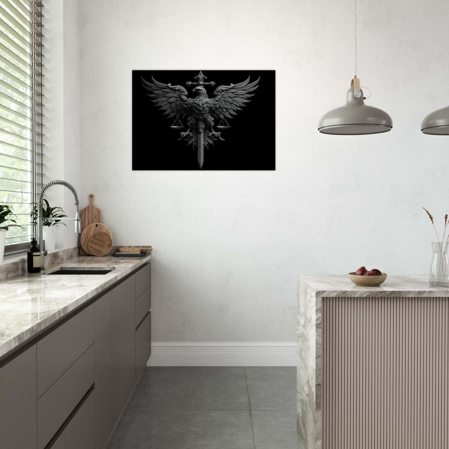An emblem of transcendence, Archangel Michael stands sovereign, wings unfurled, sword poised, scales balanced in a silent vow. The black and white rendering carves every feather and contour with reverent care, turning justice into a tangible presence.