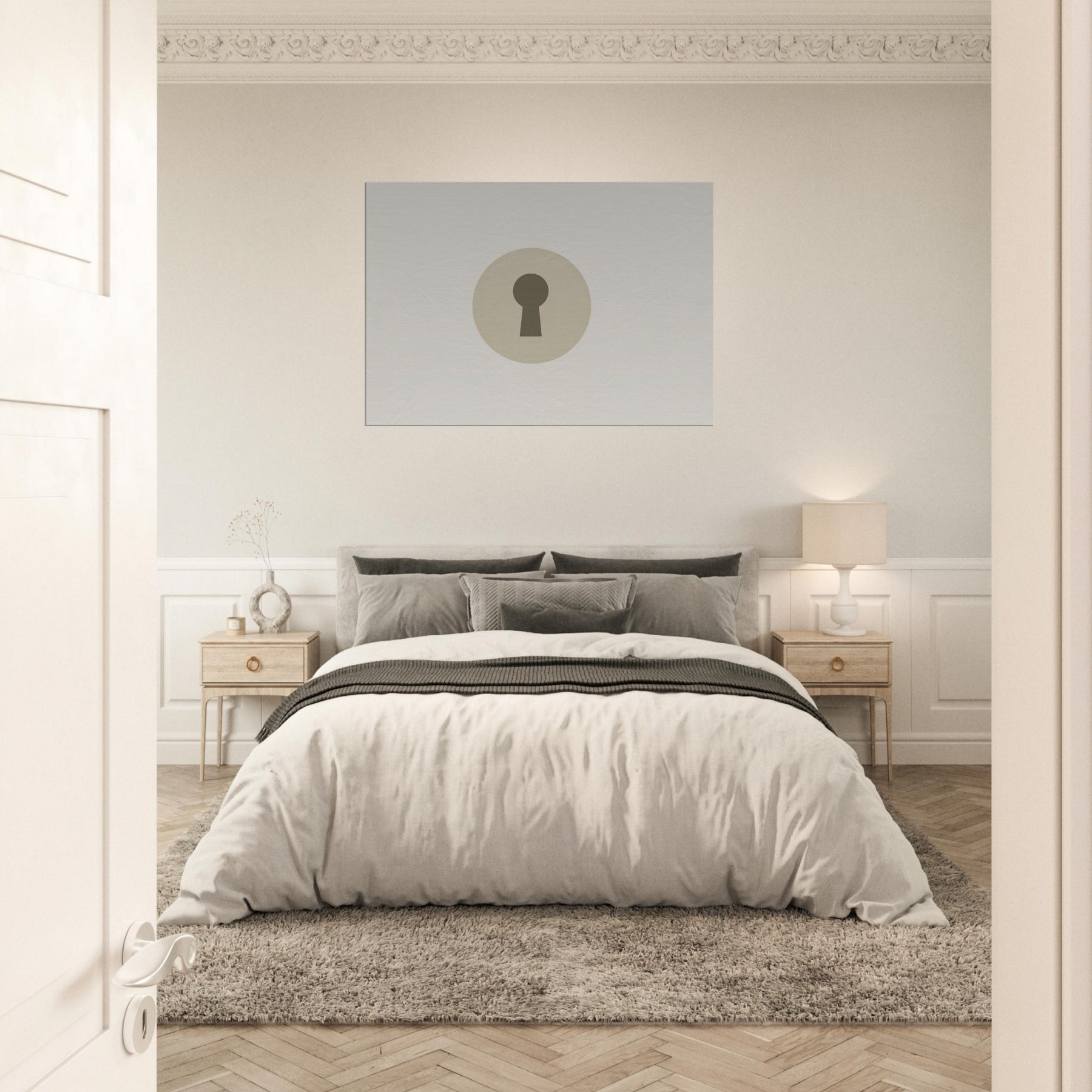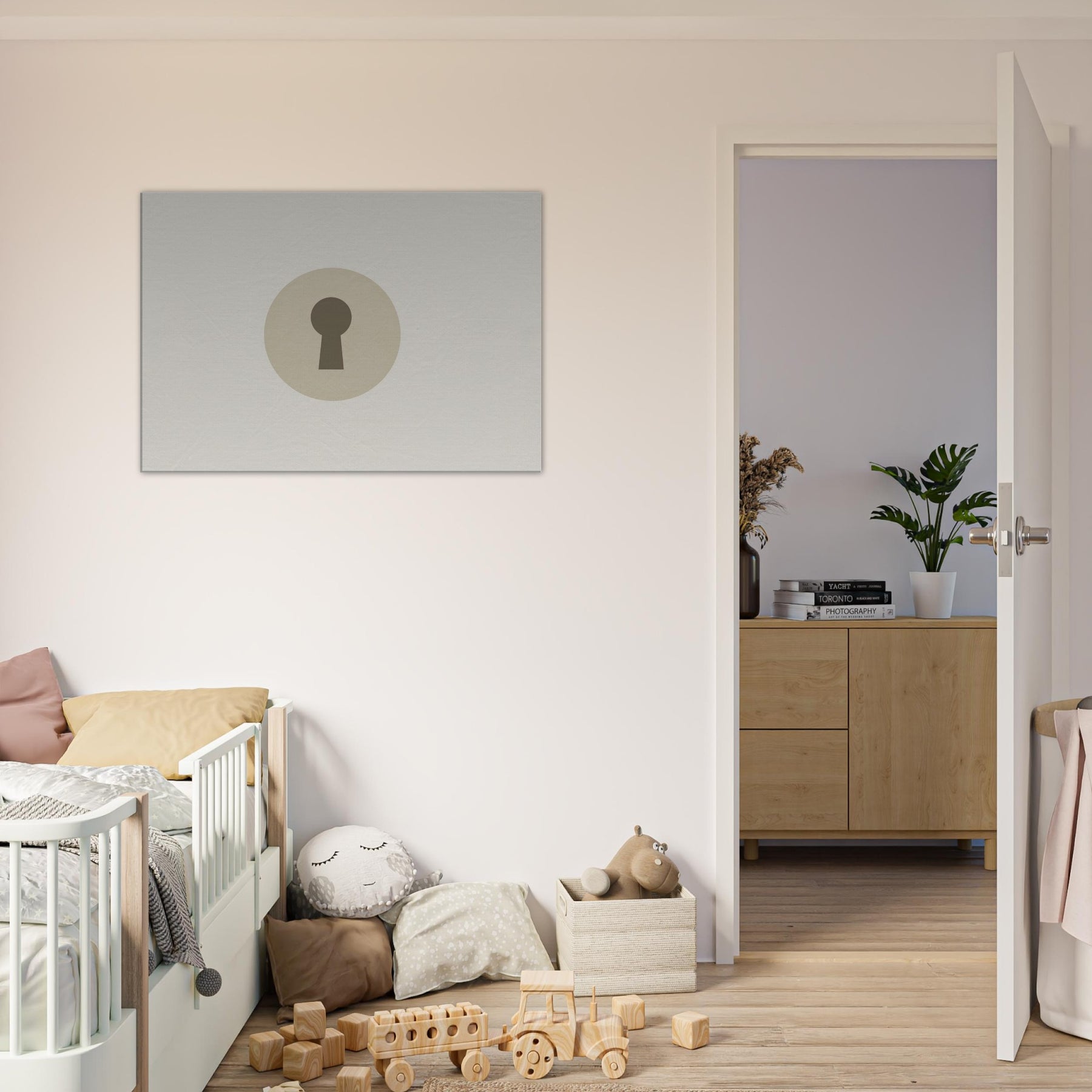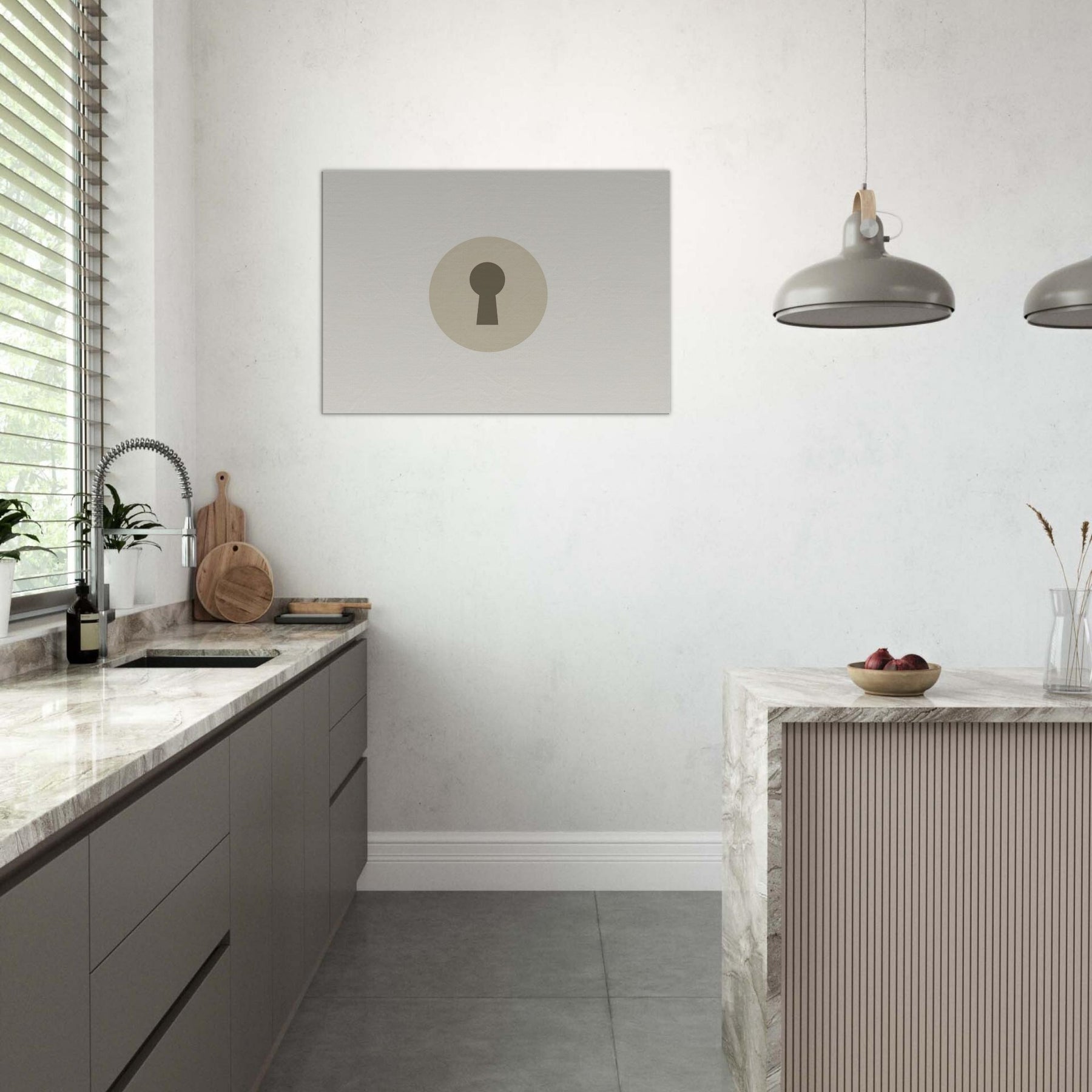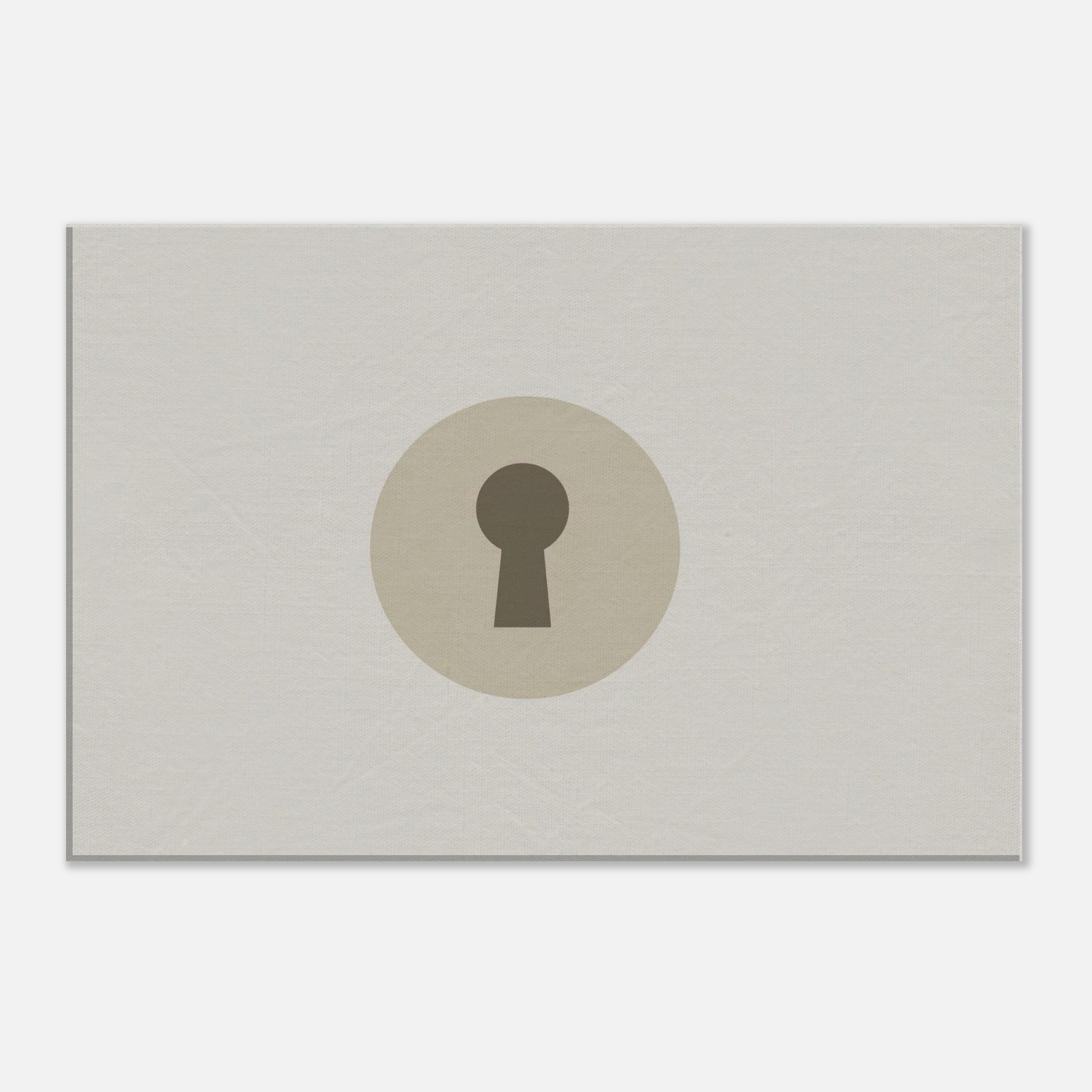 A serene circle encloses a simple keyhole silhouette a symbol of access, memory, and quiet mystery. The minimalist form and soft, neutral tones invite stillness, turning walls into a calm stage for reflection. The Key & Keyhole motif speaks in understated geometry, pairing with sunlit mornings or midnight shadows. Hang it beside a sofa or above a desk to slow the day, and watch light play along clean lines, adding timeless elegance and a subtle invitation to pause.