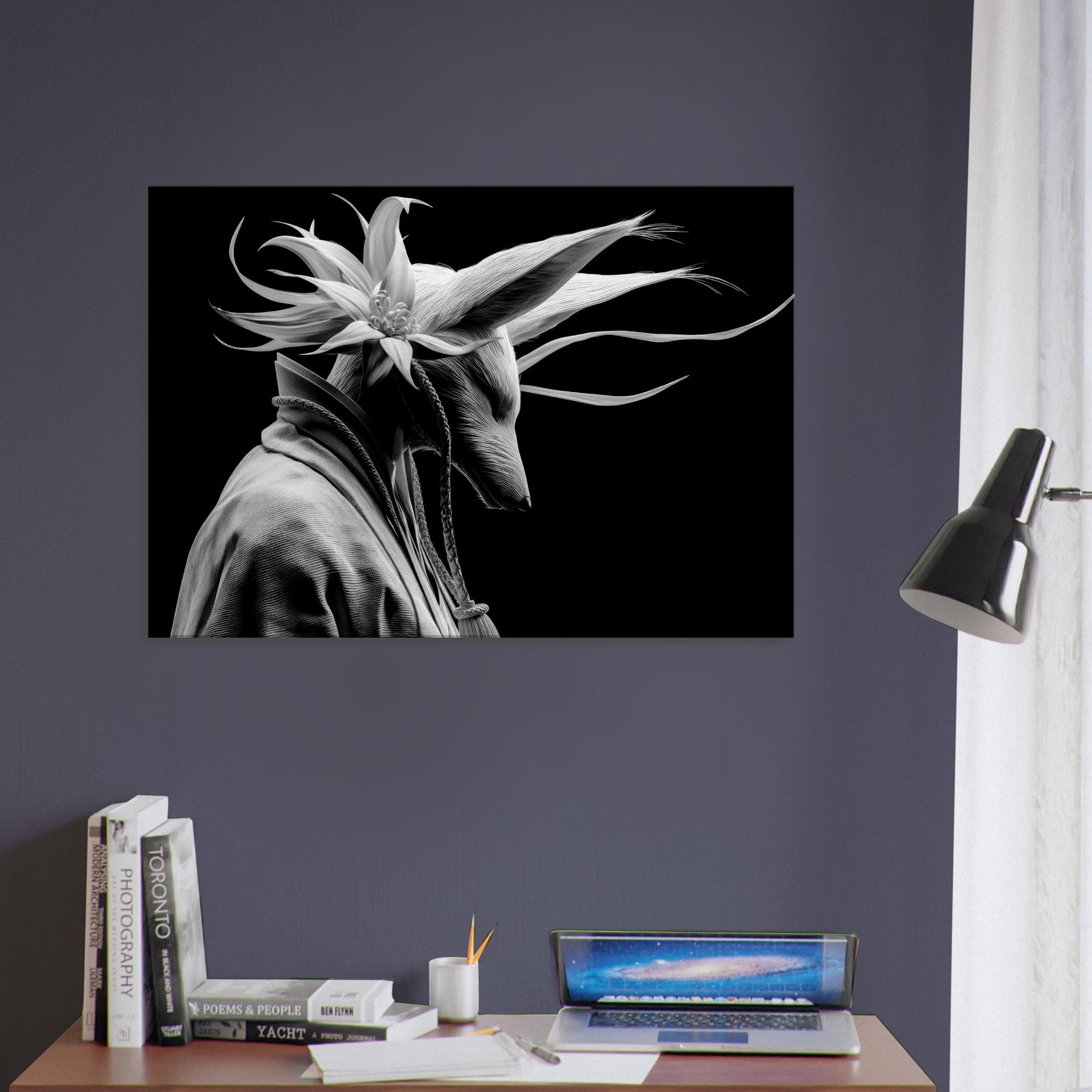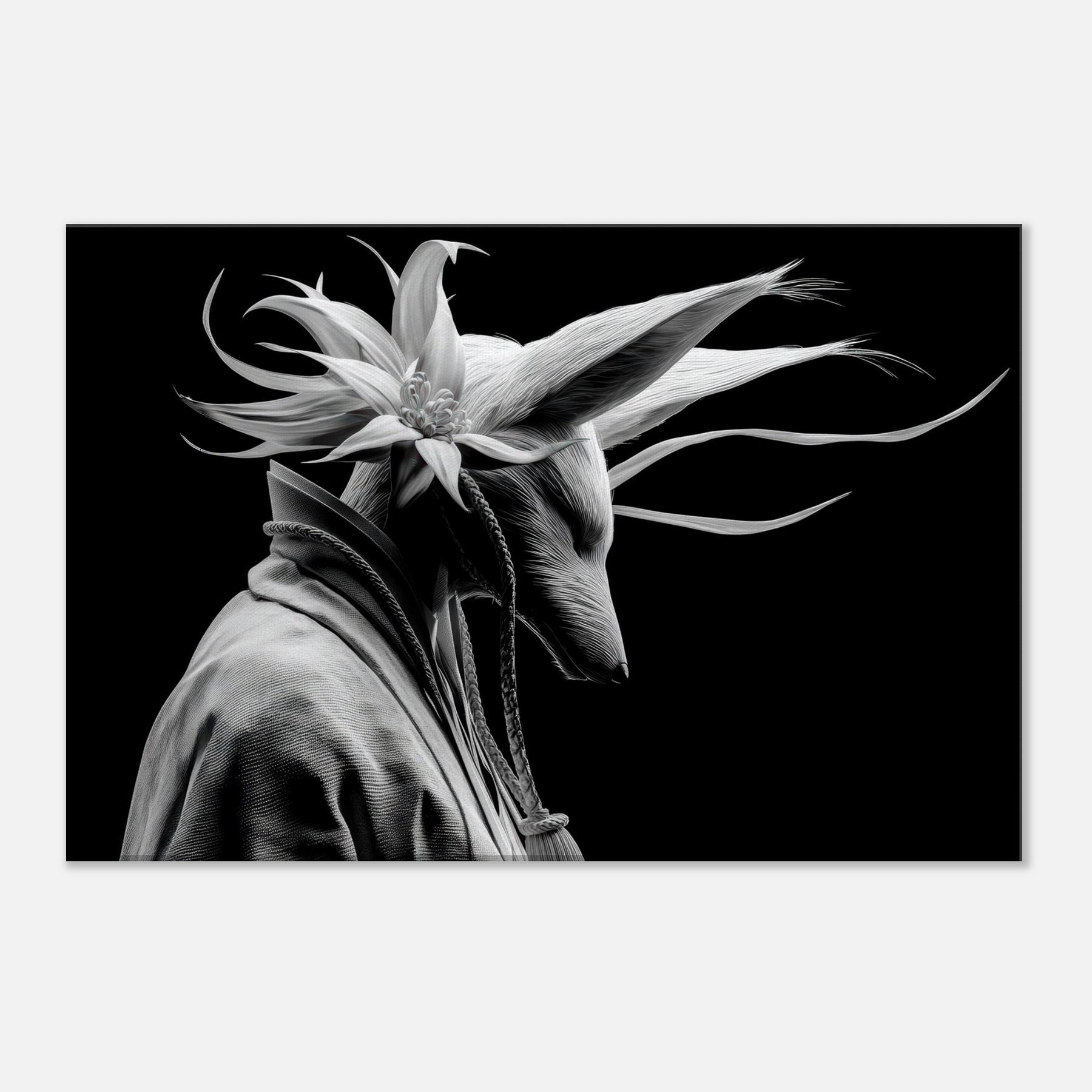 Step into a realm where ink and myth converge: Kitsune, the fox spirit with many tails, stands in a quiet, noble silhouette rendered in stark black and white. The flowing lines and subtle textures carve a mood of midnight serenity, as if wind moved through the image.