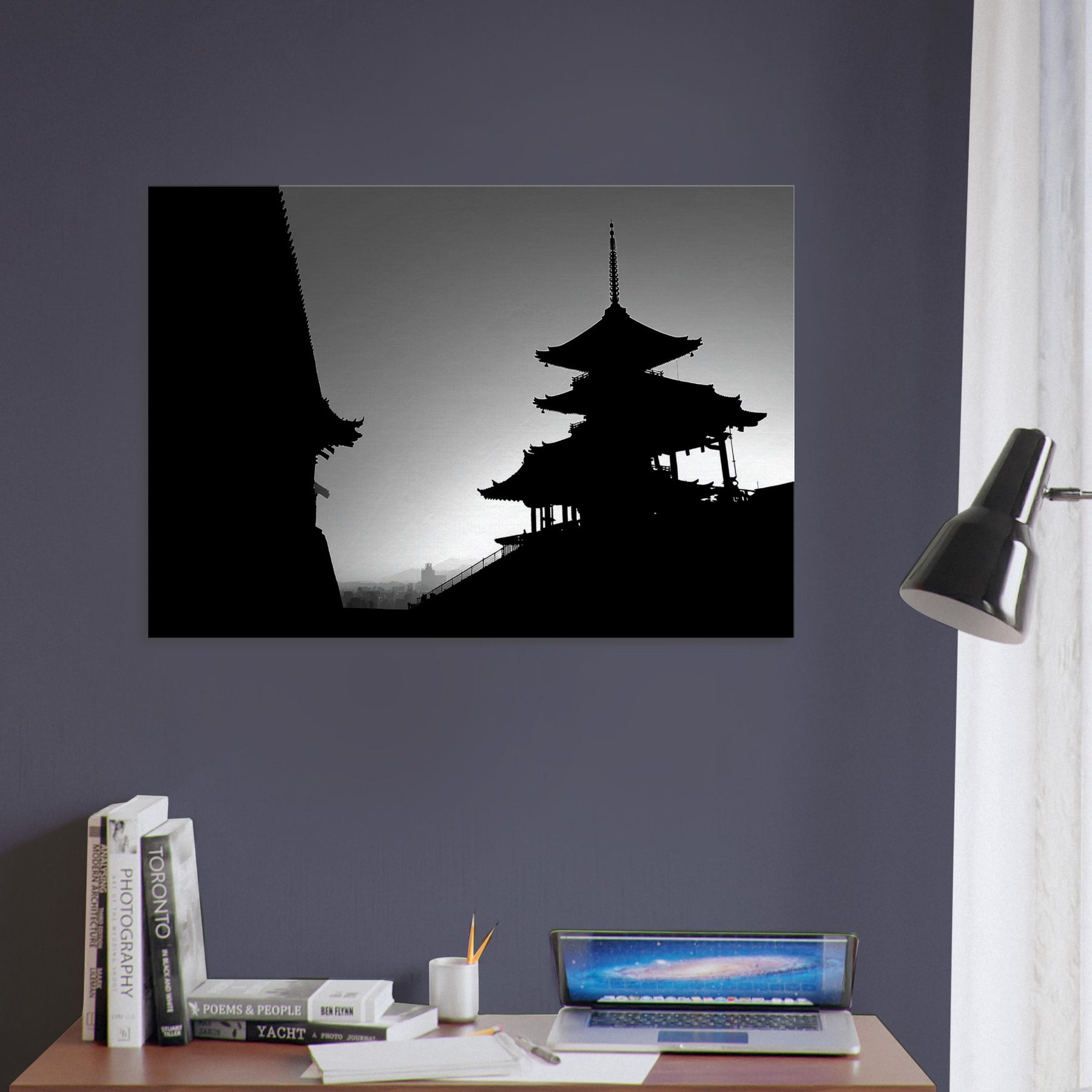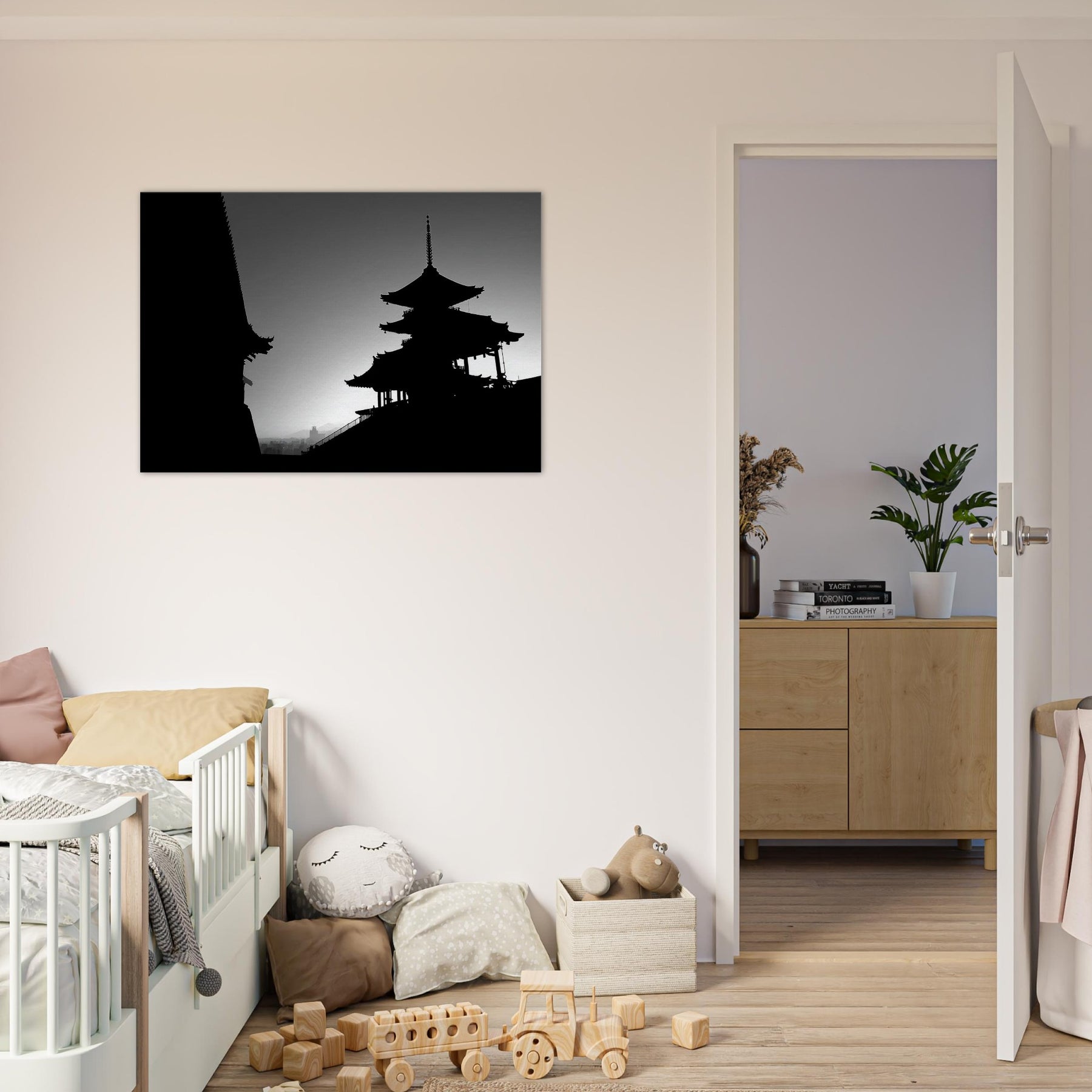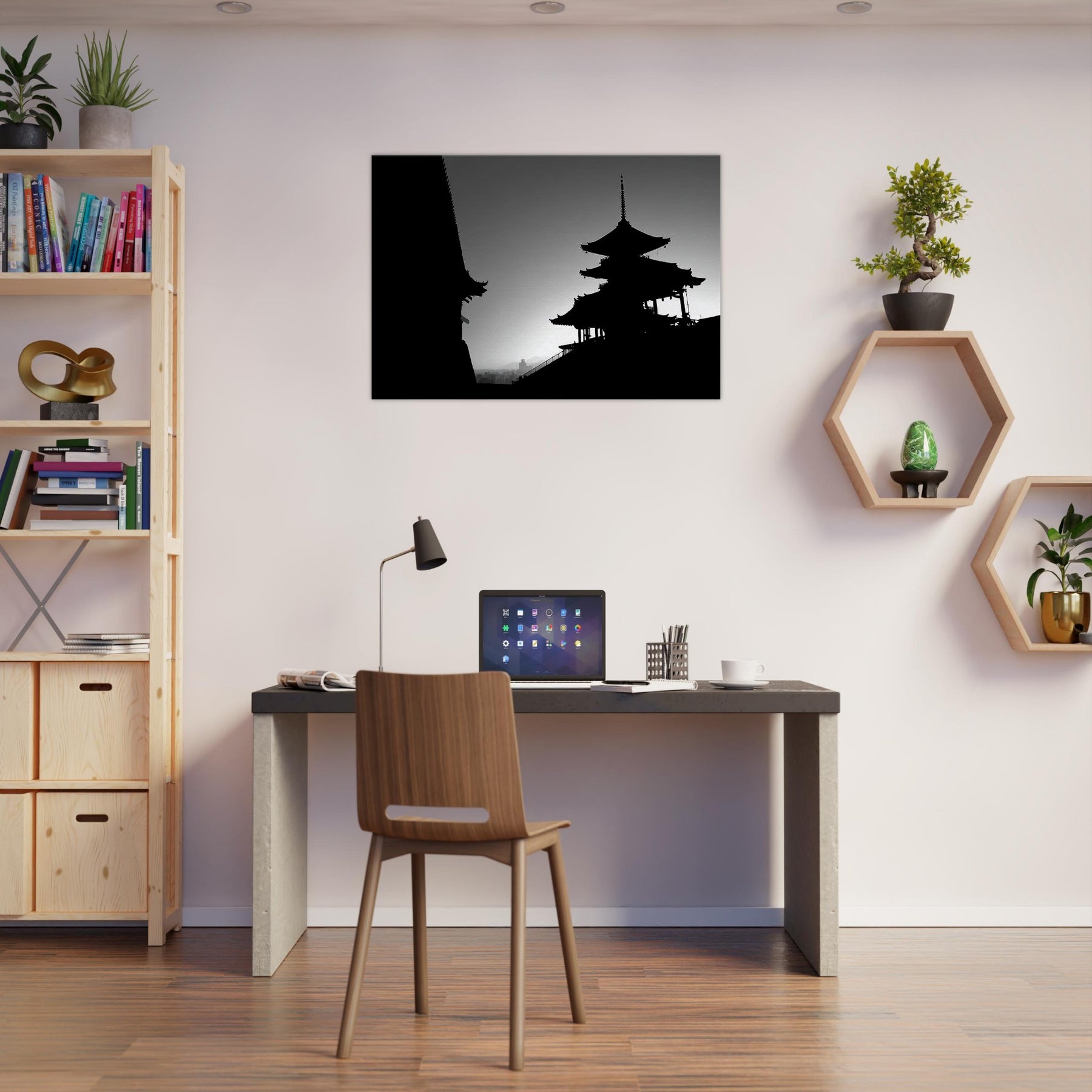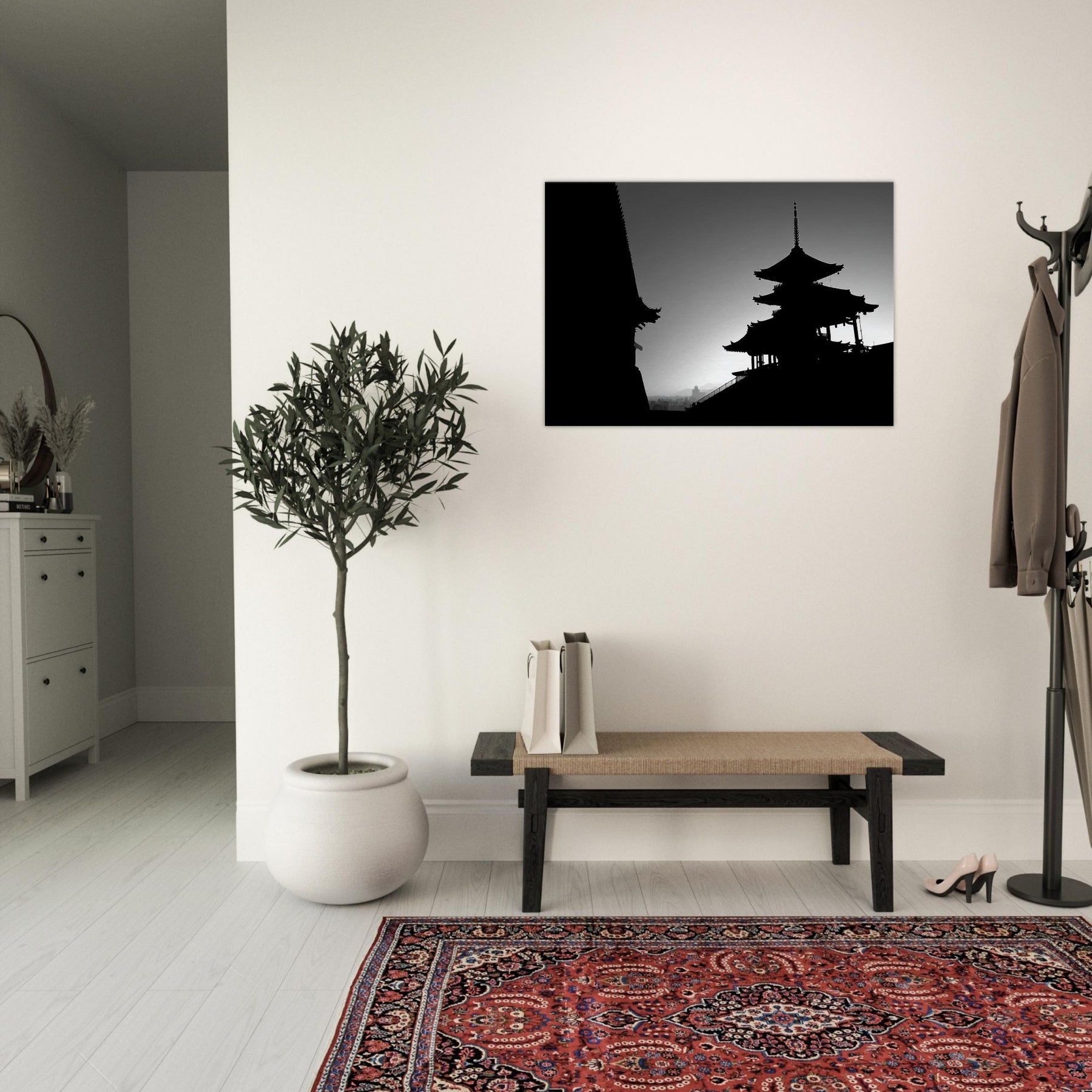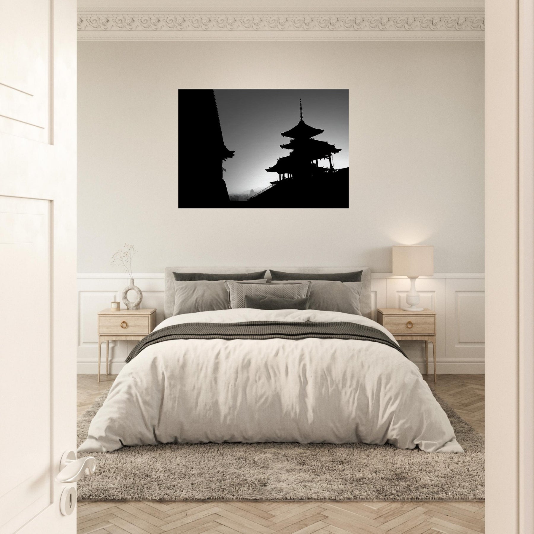 Kyoto Silhouette invites you to experience the quiet drama of a city forged in light and shade. This black and white study of a layered pagoda and temple eaves slows the heart, turning any wall into a window onto Kyoto's timeless architecture.