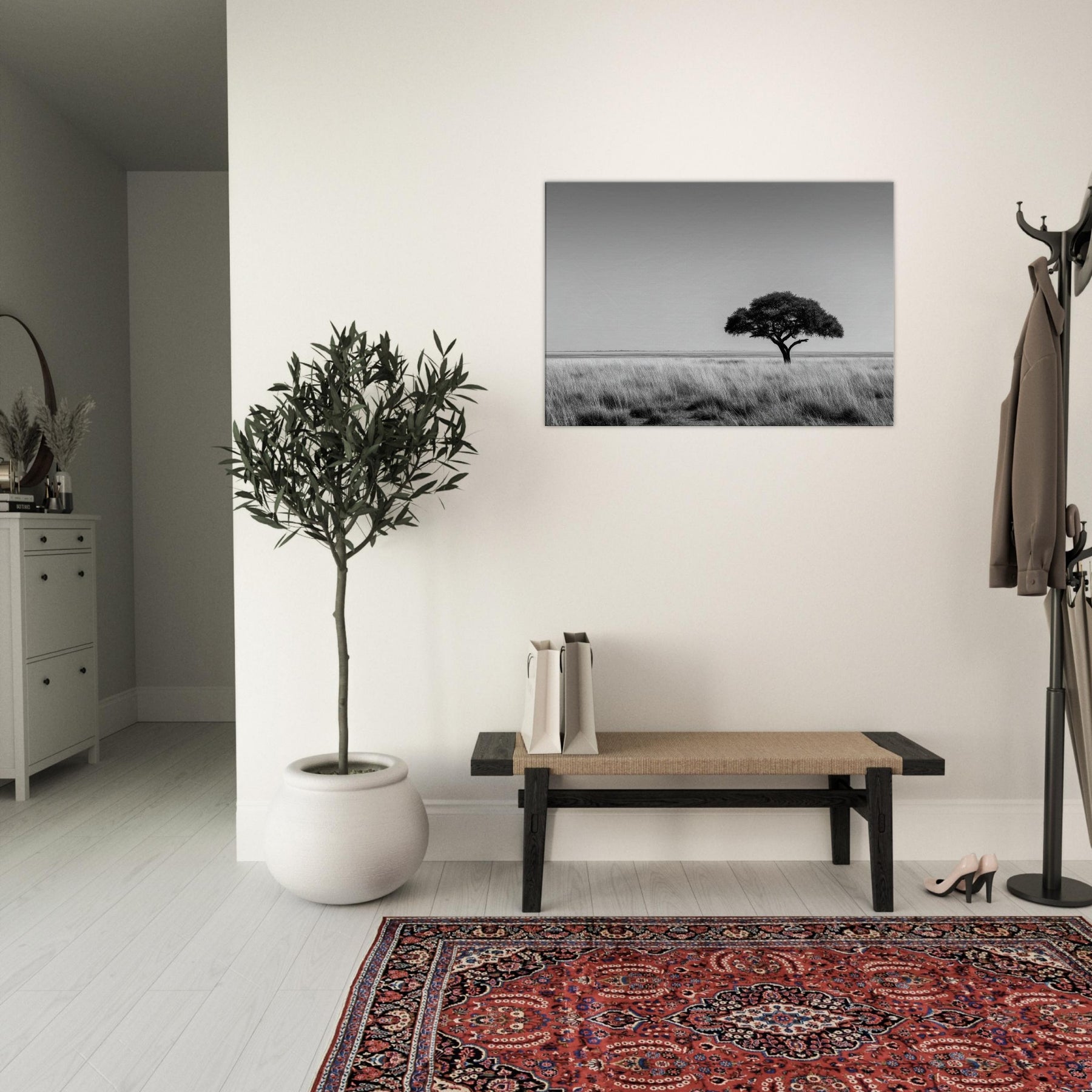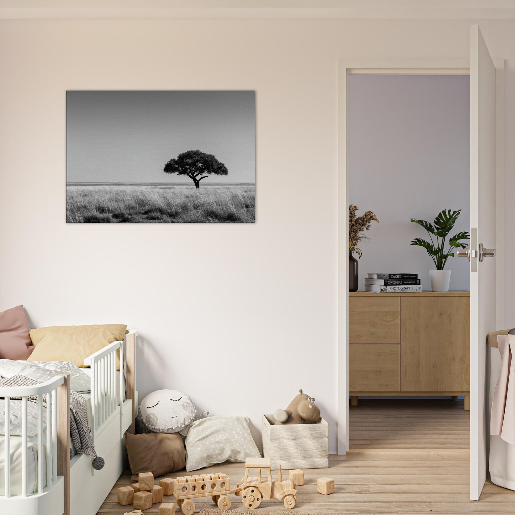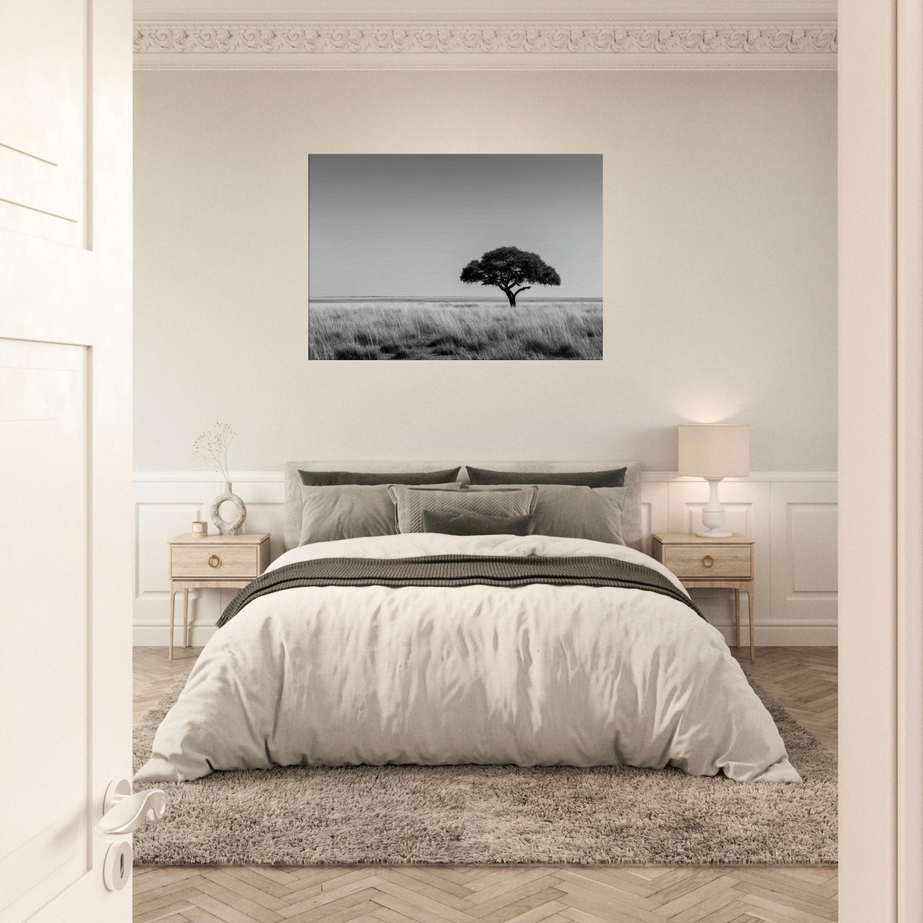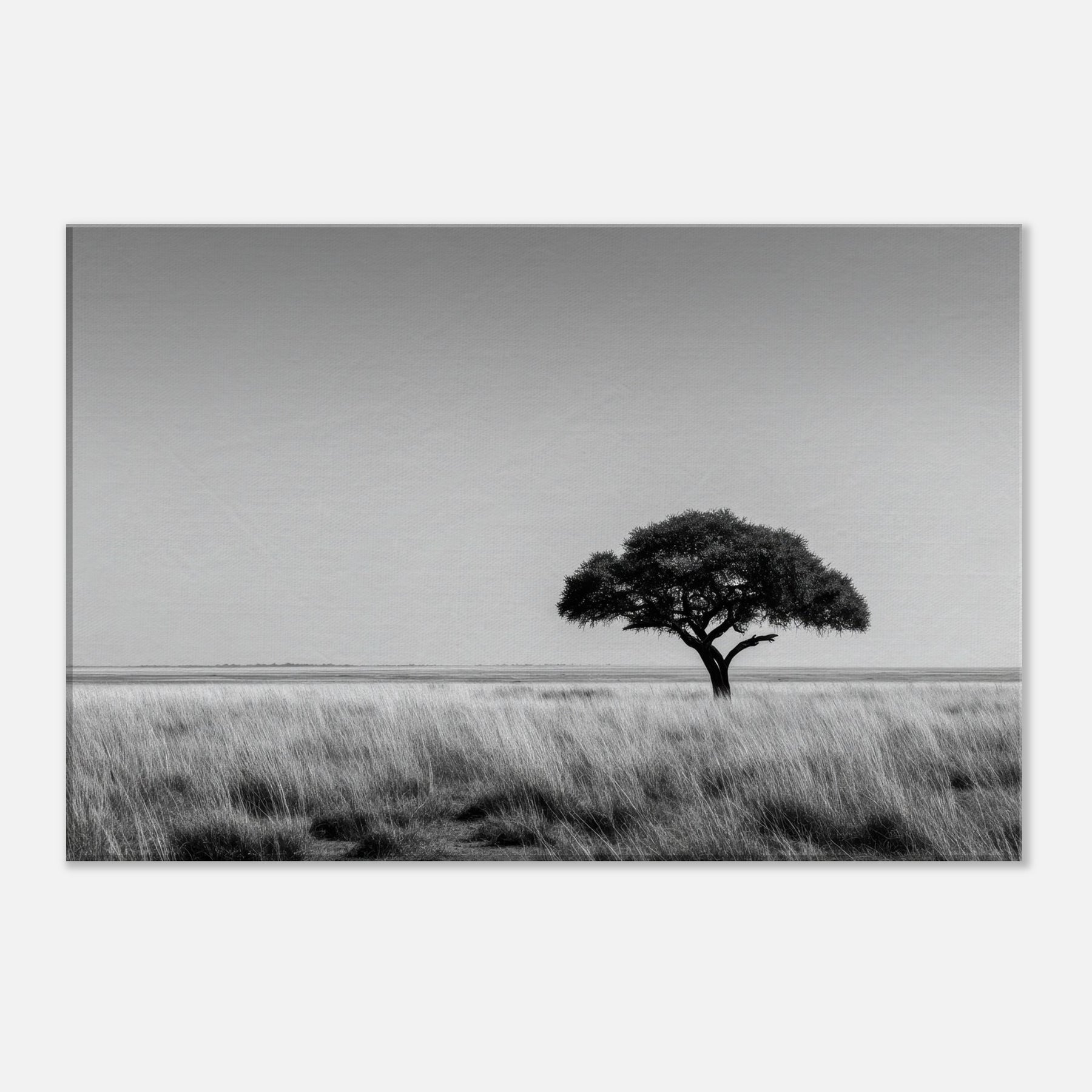 Savannah in black and white unfolds as a quiet anthem of resilience. Against a vast pale horizon, a solitary tree anchors the scene, its silhouette breathing calm into the air.