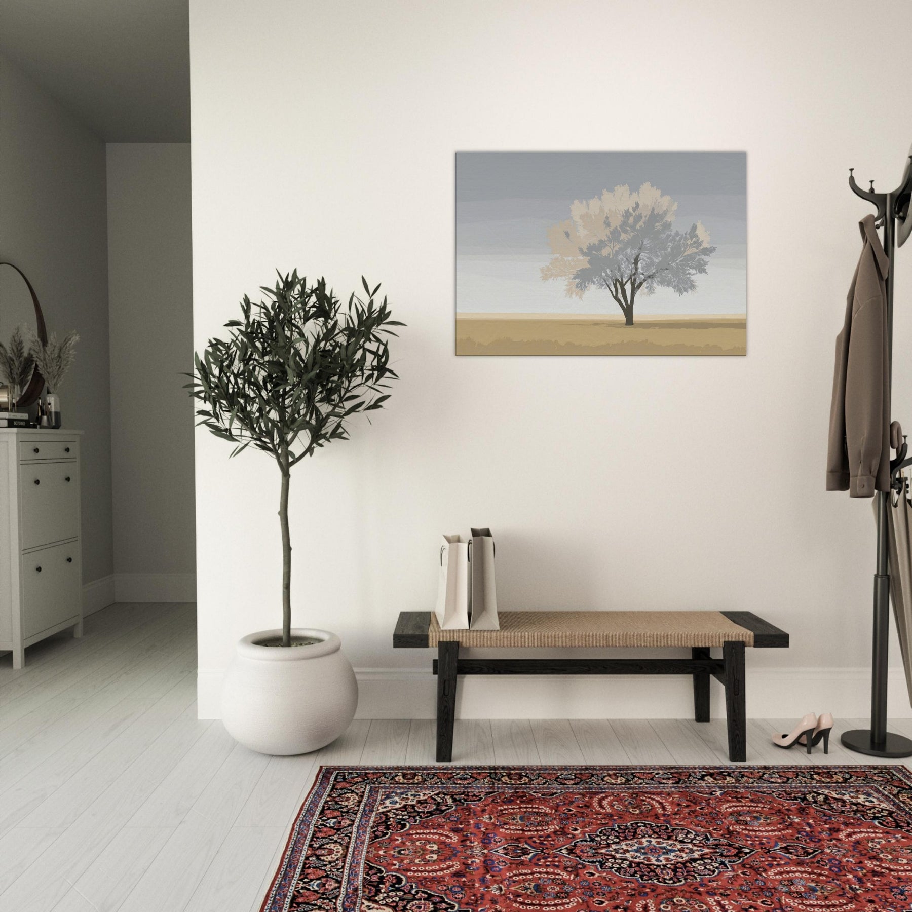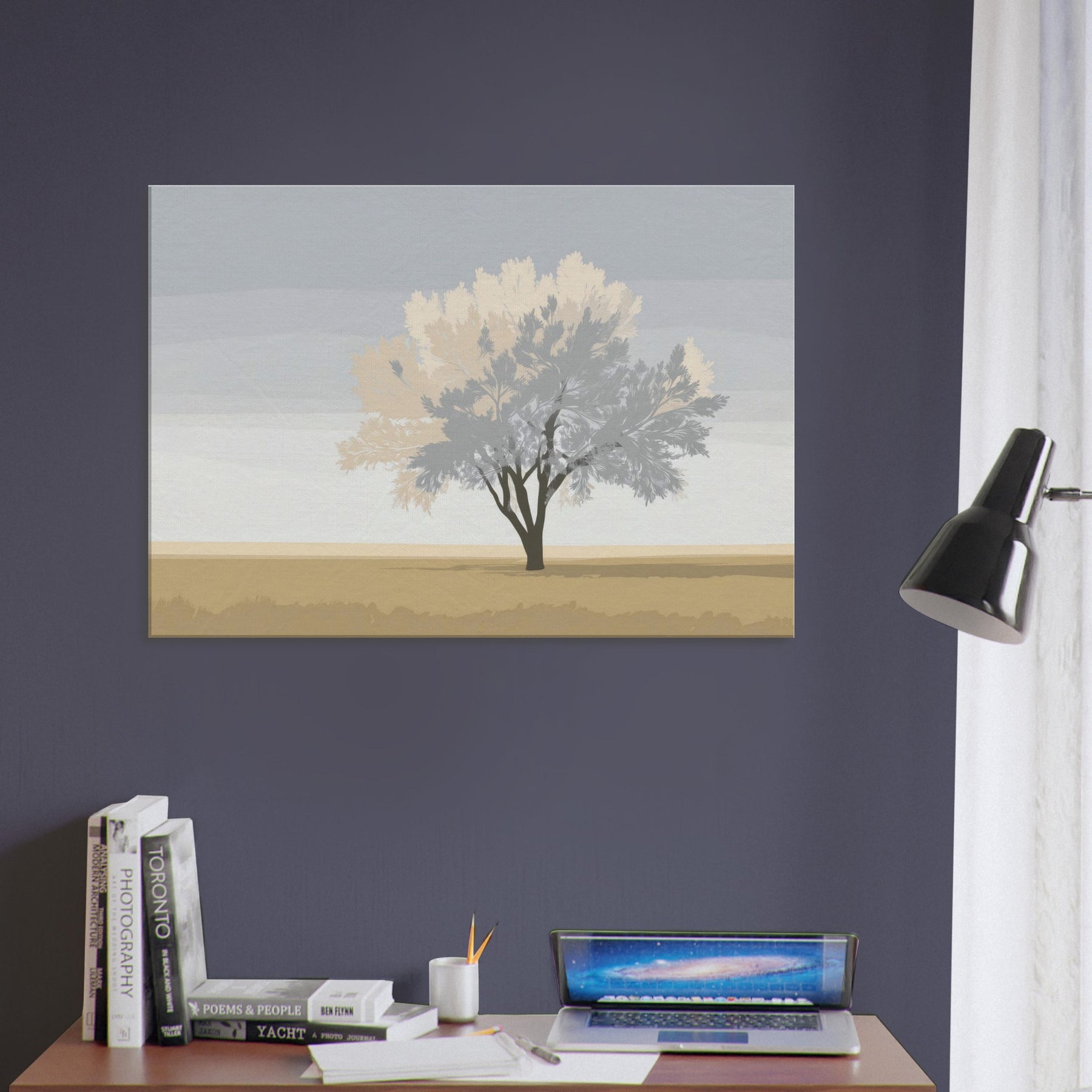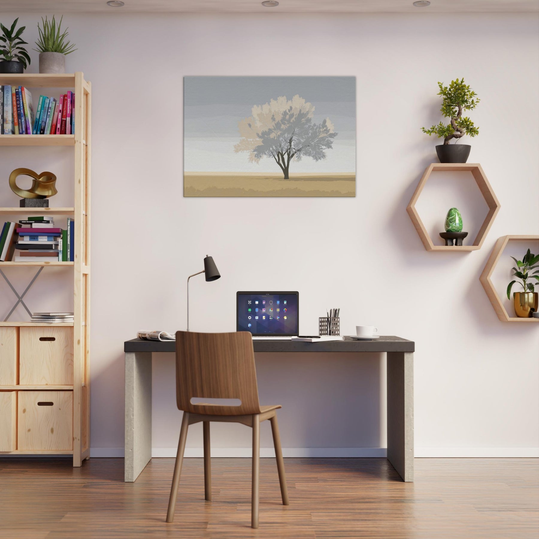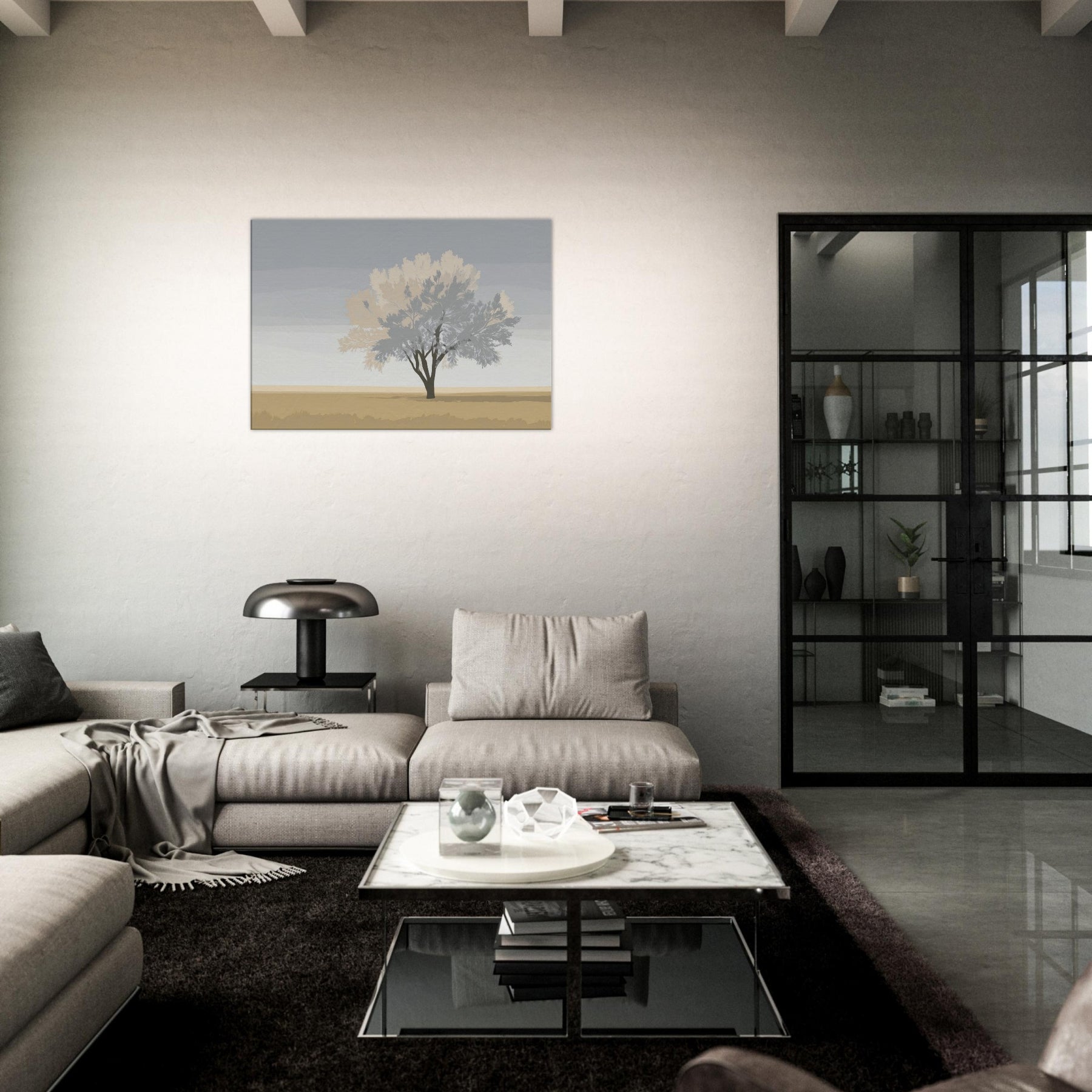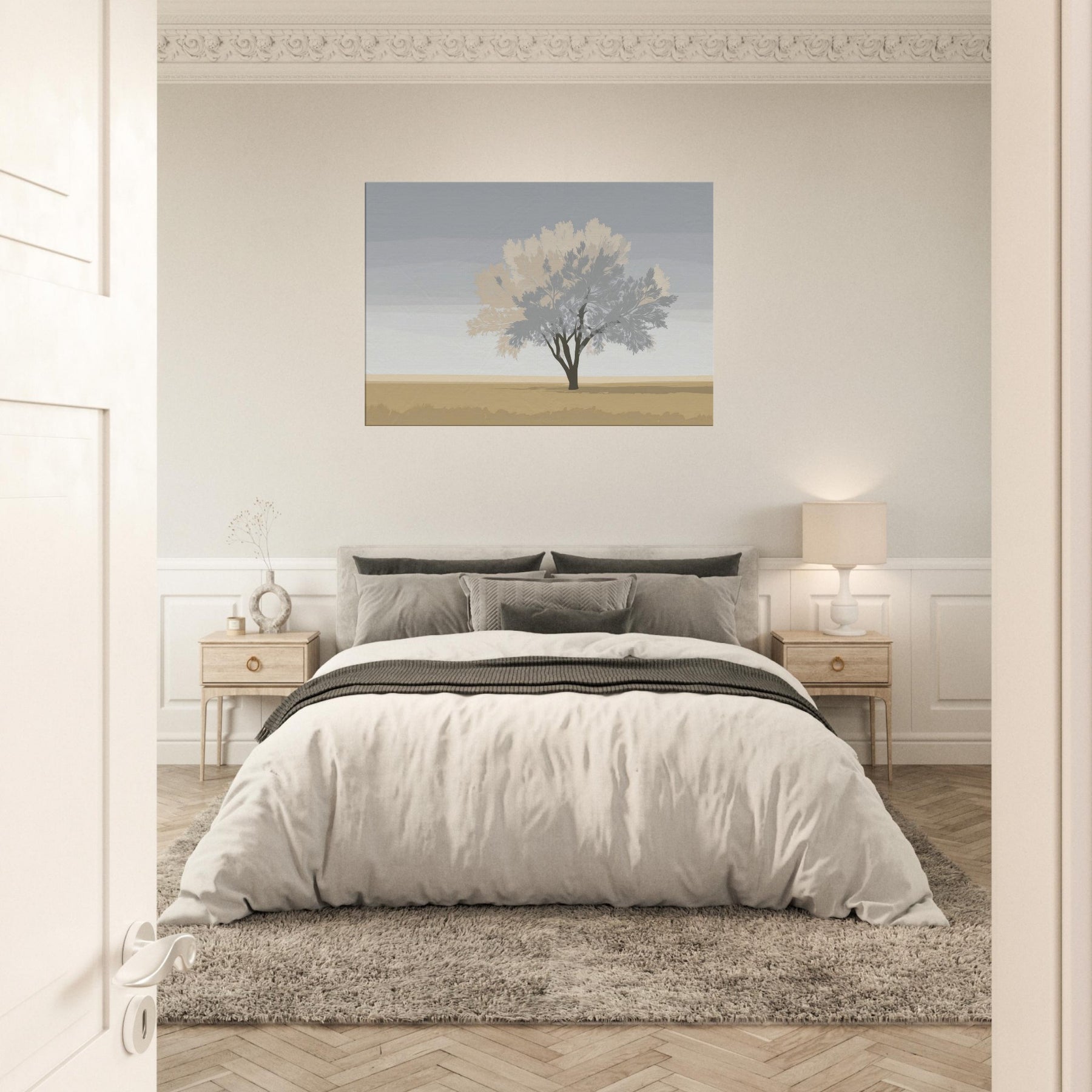 An oasis of calm captured in soft, silvery light. This minimalist composition centers a Lone Tree against a tempered horizon, its branches spreading like delicate lace. The palette, quiet grays, warm taupes, pale blues, evokes morning air and distant fields. Hang it to soften a living room with gentle contrast, inviting quiet reflection and a sense of space. It pairs effortlessly with neutral fabrics and wood accents, transforming walls into a serene where the day's pace slows and the room breathes.