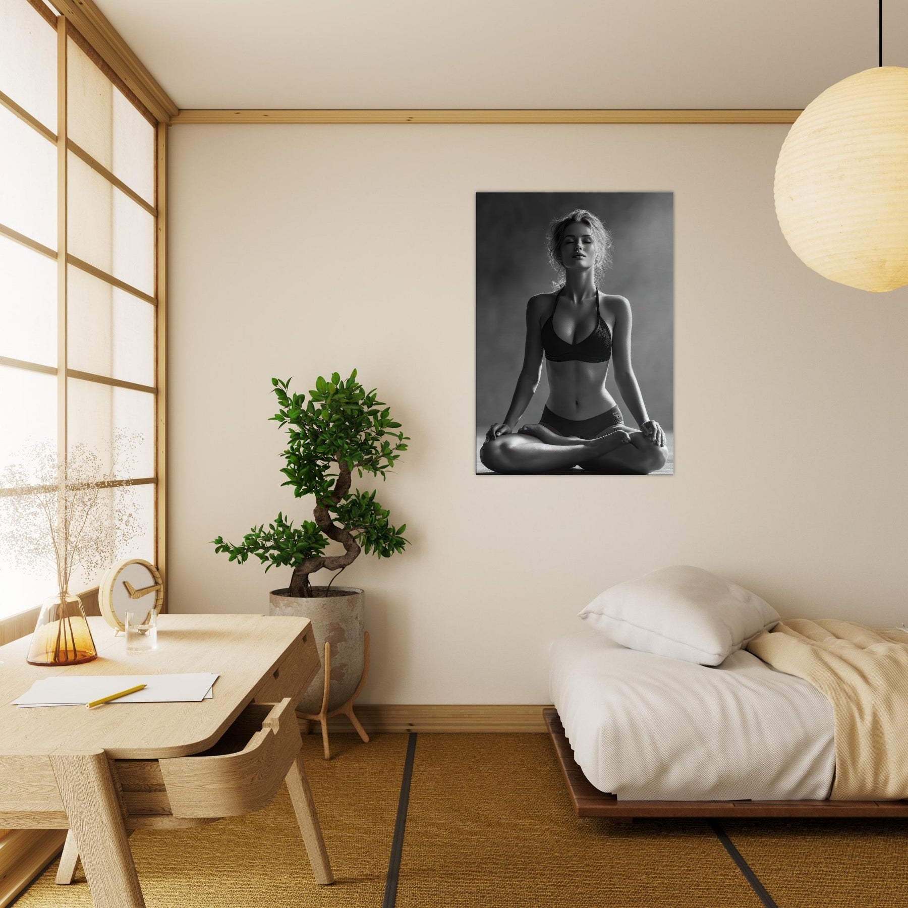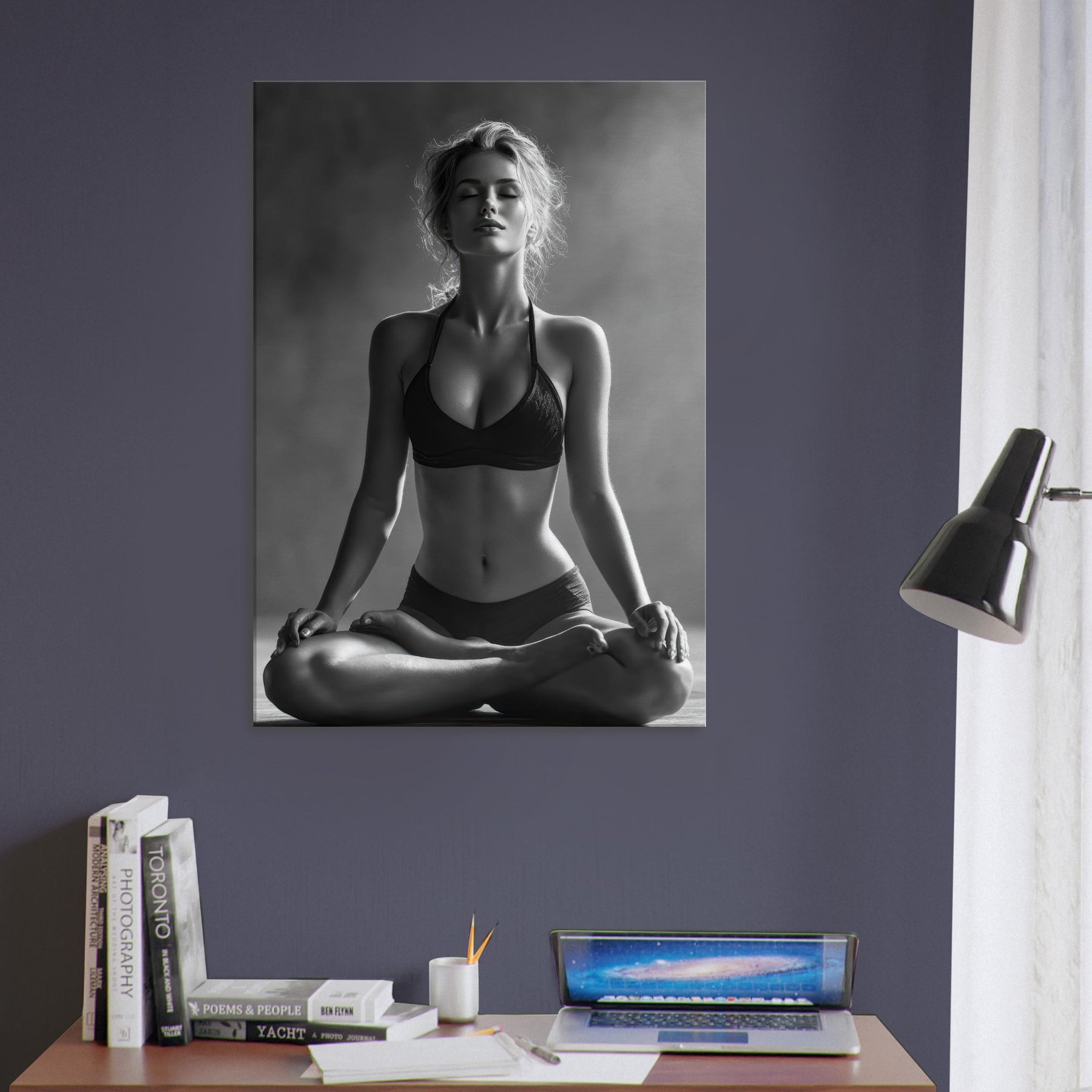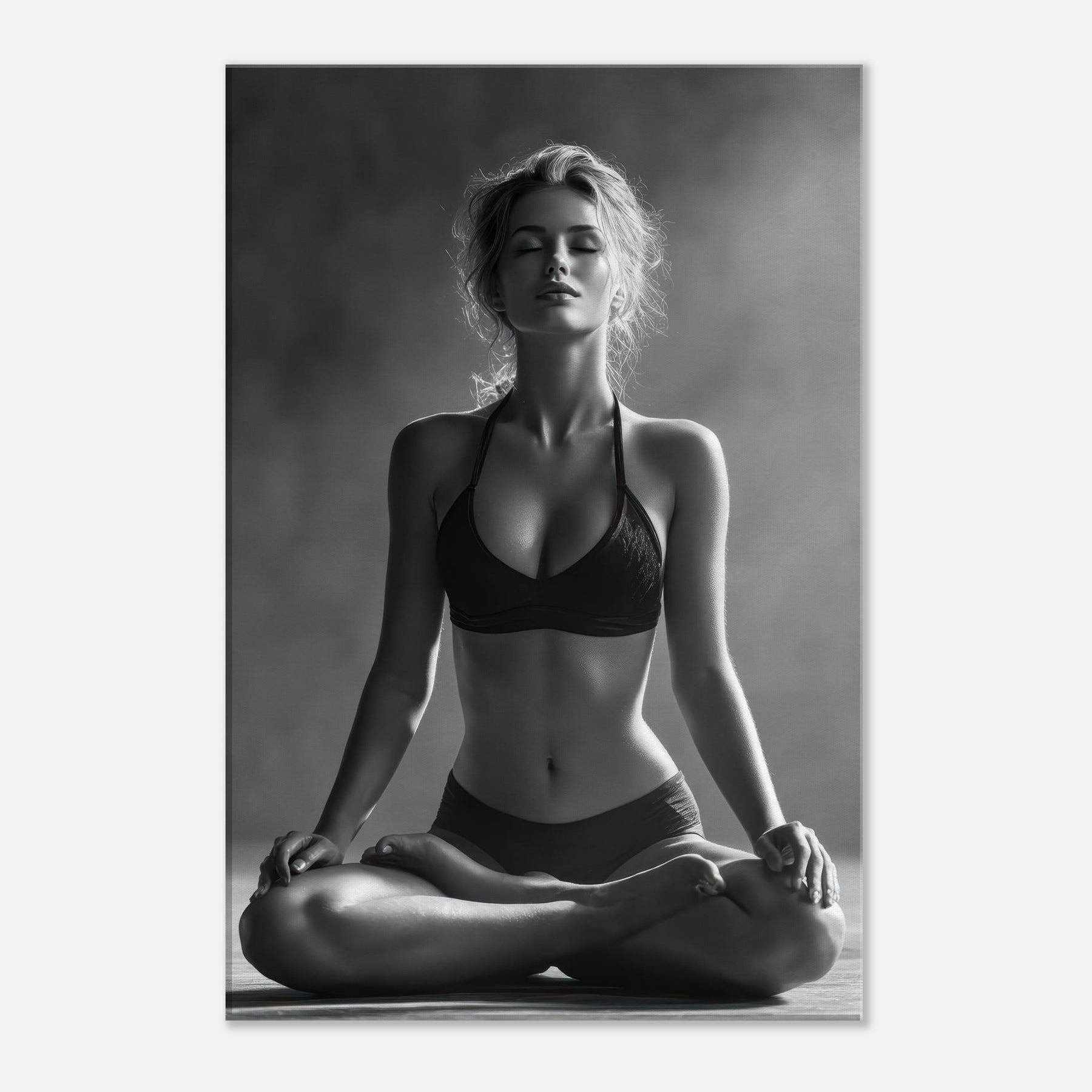 Meditative and austere, this black and white study centers the Yoga Lotus Pose in a hush of light and shadow. The pared back lines trace a radiant calm, while the skin tone and fabric folds become a soft contrast that awakens the senses without shouting.